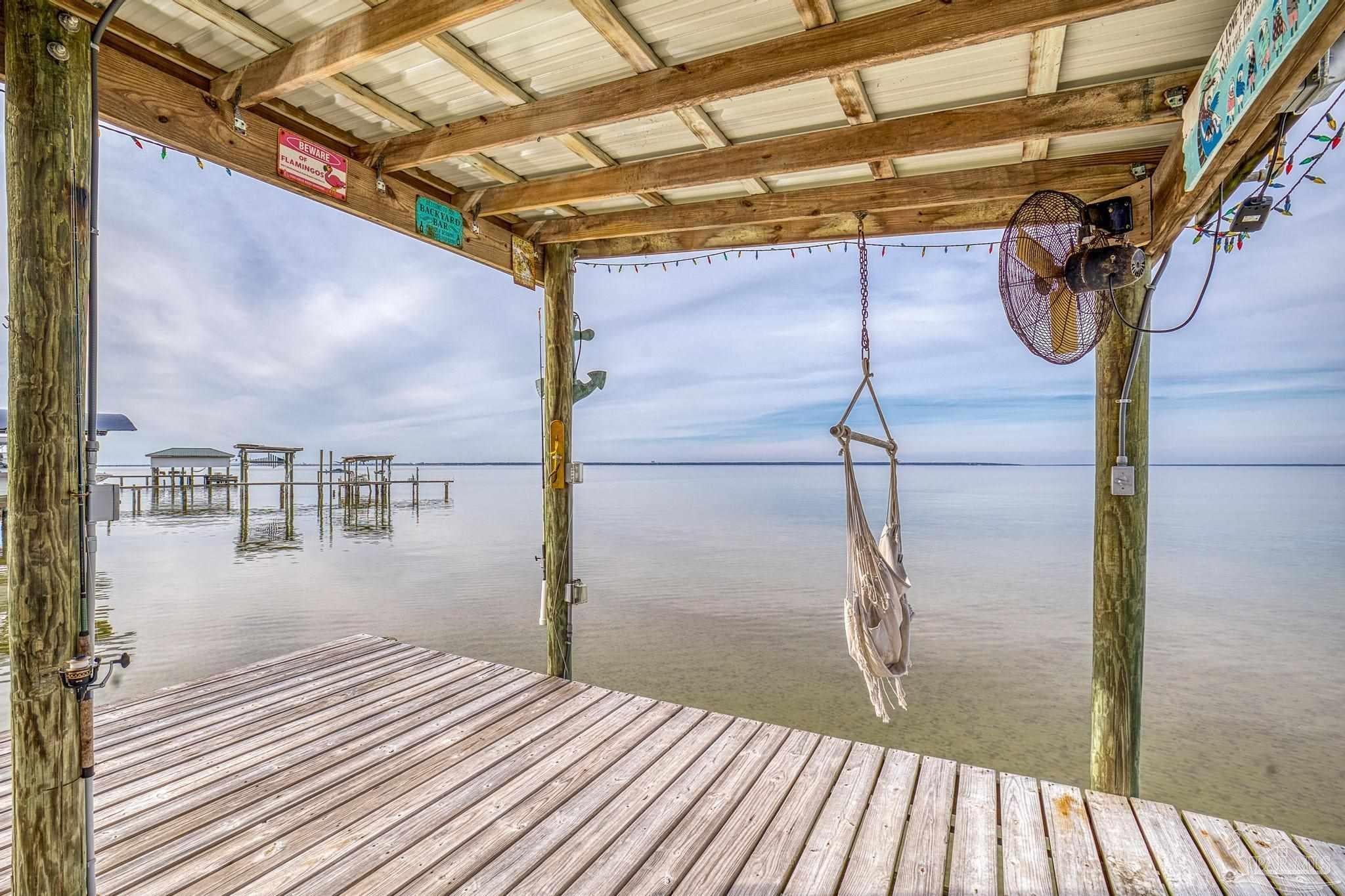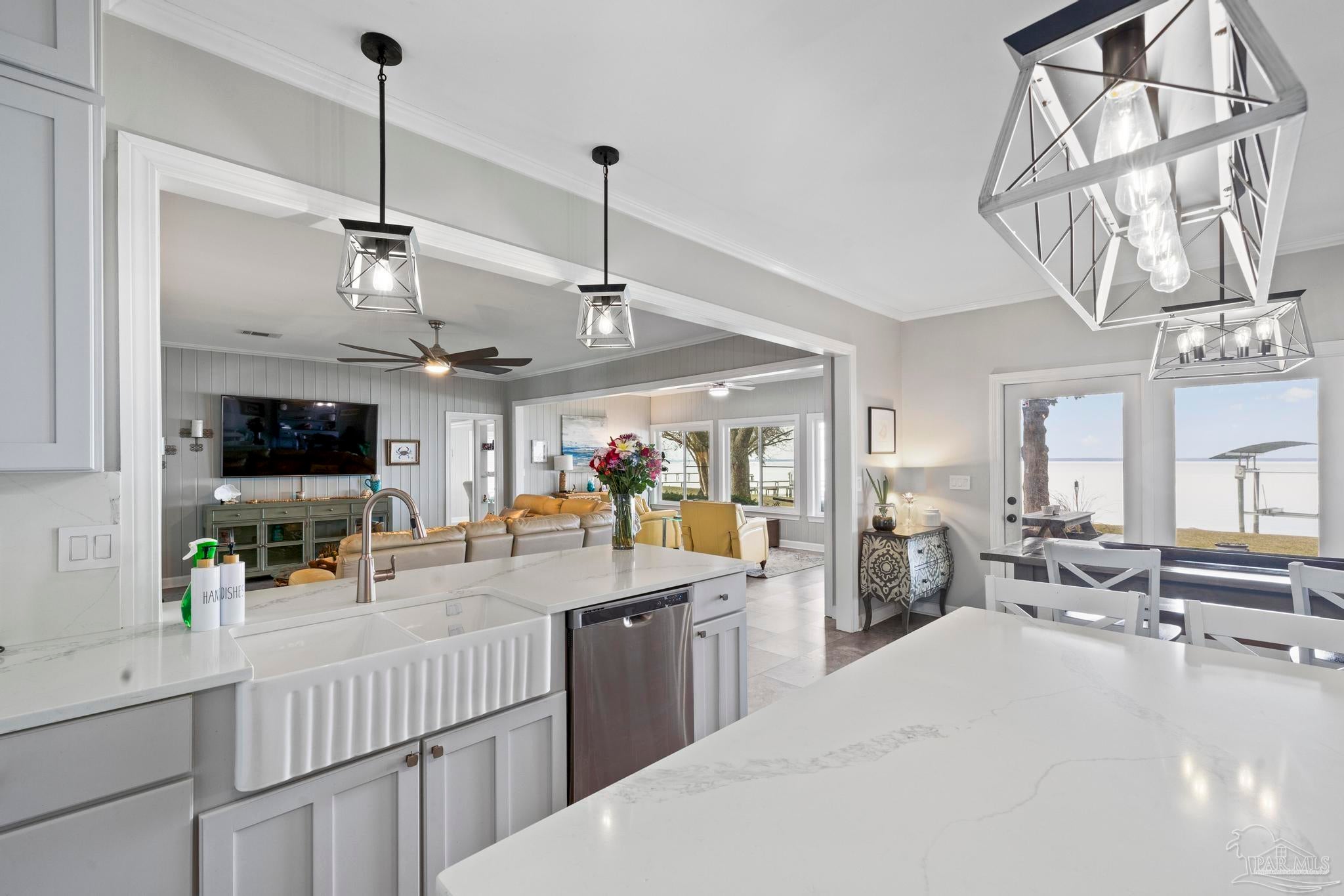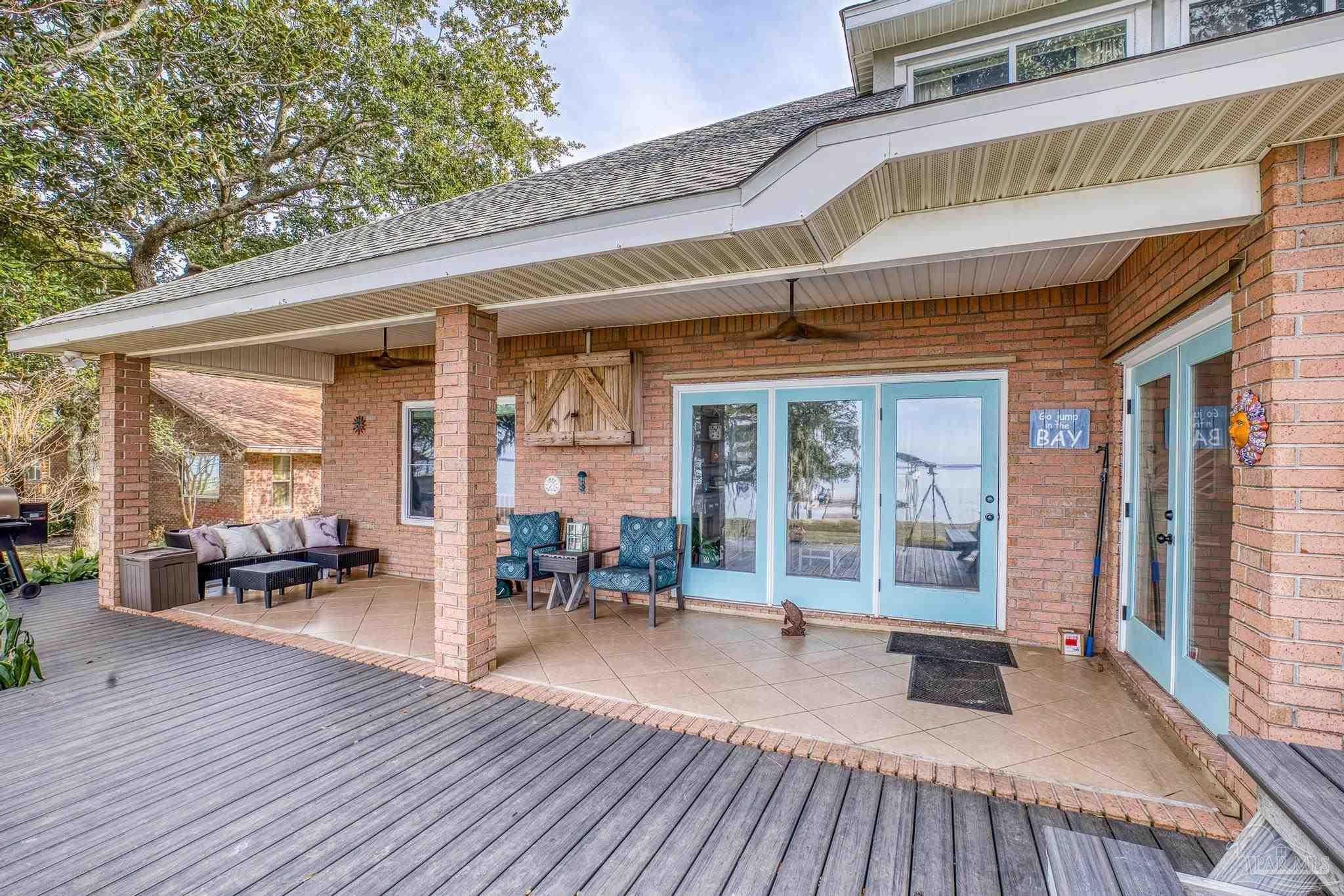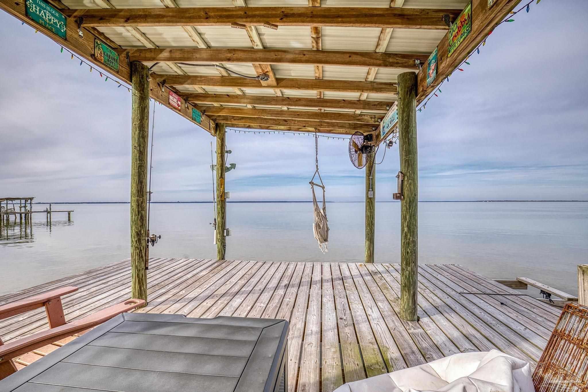 Waterfront living on Pensacola Bay with 90 feet of private shoreline. This exceptional 3-bed, 3.5-bath Gulf Breeze home spans nearly 3,500 sq ft on a .40-acre lot and blends solid construction with relaxed coastal style—brick and Hardie® plank siding, impact-rated windows (2020), assumable flood insurance (never flooded), and homeowners insurance reportedly under $8K/yr—paired with a neutral palette, LVP flooring, and bay views from almost every room. The fully remodeled kitchen is a showpiece with floor-to-ceiling white cabinetry, quartzite countertops, stainless appliances, an eat-in nook, and a breakfast bar. It opens to a spacious family room with a cozy fireplace and picture windows framing the wraparound deck, hot tub, and backyard oasis. Out back, a 100-ft dock with boat and jet-ski lifts sets the stage for everyday sunset cruises and weekend fun. The primary suite is a private retreat with a sitting area overlooking the water, dual vanities, a tiled shower, soaking tub, water closet, and a generous walk-in closet. A split layout places a secondary bedroom and updated bath on the opposite side of the home, along with a large laundry/mud room offering abundant storage. Upstairs, ~800 sq ft adds a bedroom, full bath, and a separate living area with sweeping bay views—perfect for guests or a media space. Additional highlights include a 2-car garage, irrigation system, transferable termite warranty, and no HOA. Ideally located just past the Gulf Islands National Seashore, this is luxury waterfront living in Gulf Breeze at its best. See media for more details, photos, and 3D tour.
