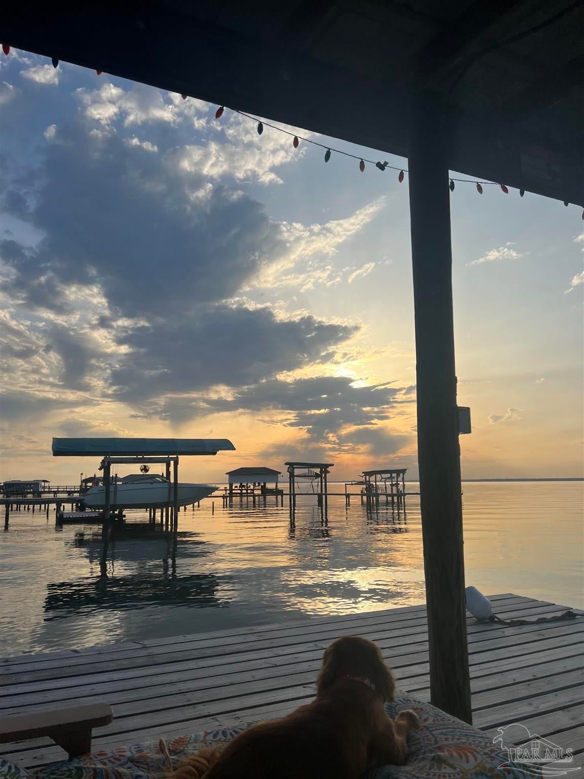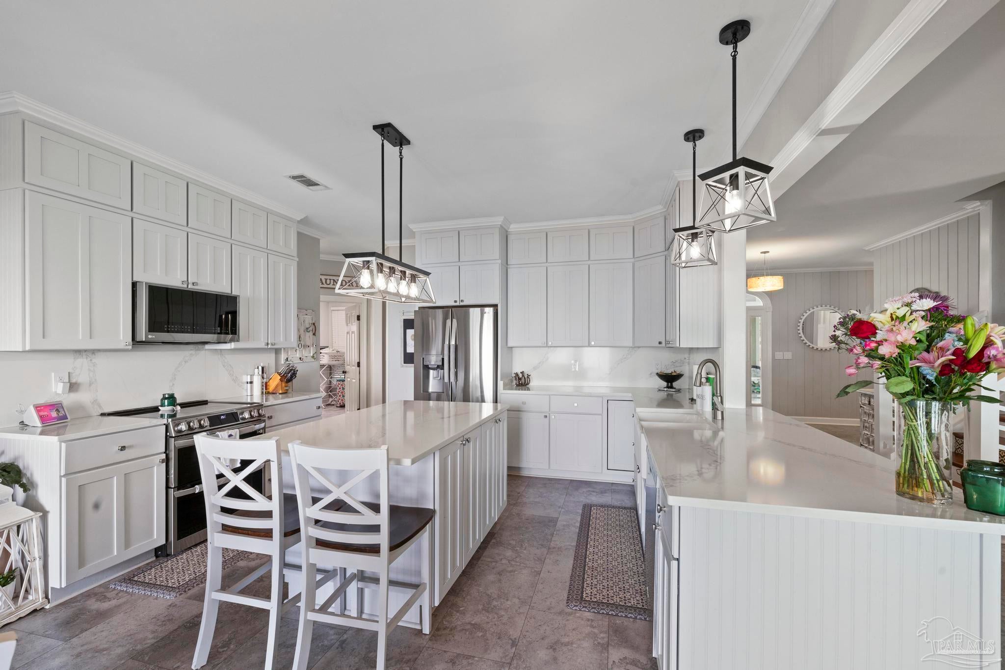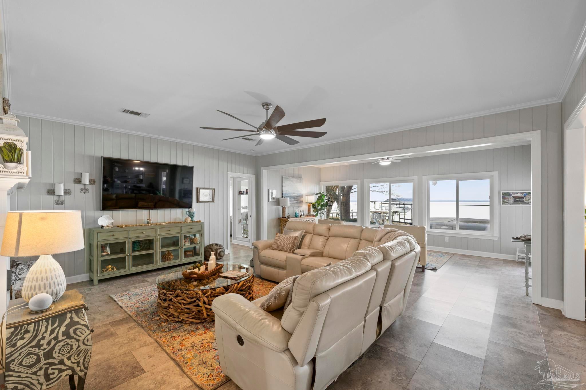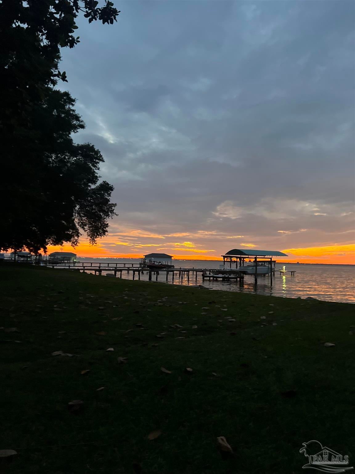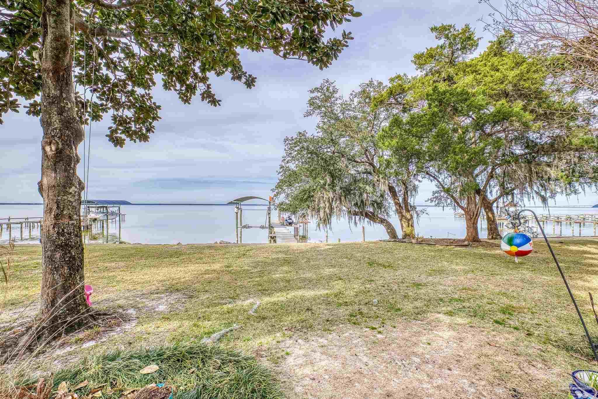 Waterfront living on Pensacola Bay with 90 feet of private shoreline. This exceptional 3-bed, 3.5-bath Gulf Breeze home spans nearly 3,500 sq ft on a .40-acre lot and blends solid construction with relaxed coastal style—brick and Hardie® plank siding, impact-rated windows (2020), assumable flood insurance (never flooded), and homeowners insurance reportedly under $8K/yr—paired with a neutral palette, LVP flooring, and bay views from almost every room. The fully remodeled kitchen is a showpiece with floor-to-ceiling white cabinetry, quartzite countertops, stainless appliances, an eat-in nook, and a breakfast bar. It opens to a spacious family room with a cozy fireplace and picture windows framing the wraparound deck, hot tub, and backyard oasis. Out back, a 100-ft dock with boat and jet-ski lifts sets the stage for everyday sunset cruises and weekend fun. The primary suite is a private retreat with a sitting area overlooking the water, dual vanities, a tiled shower, soaking tub, water closet, and a generous walk-in closet. A split layout places a secondary bedroom and updated bath on the opposite side of the home, along with a large laundry/mud room offering abundant storage. Upstairs, ~800 sq ft adds a bedroom, full bath, and a separate living area with sweeping bay views—perfect for guests or a media space. Additional highlights include a 2-car garage, irrigation system, transferable termite warranty, and no HOA. Ideally located just past the Gulf Islands National Seashore, this is luxury waterfront living in Gulf Breeze at its best. See media for more details, photos, and 3D tour.