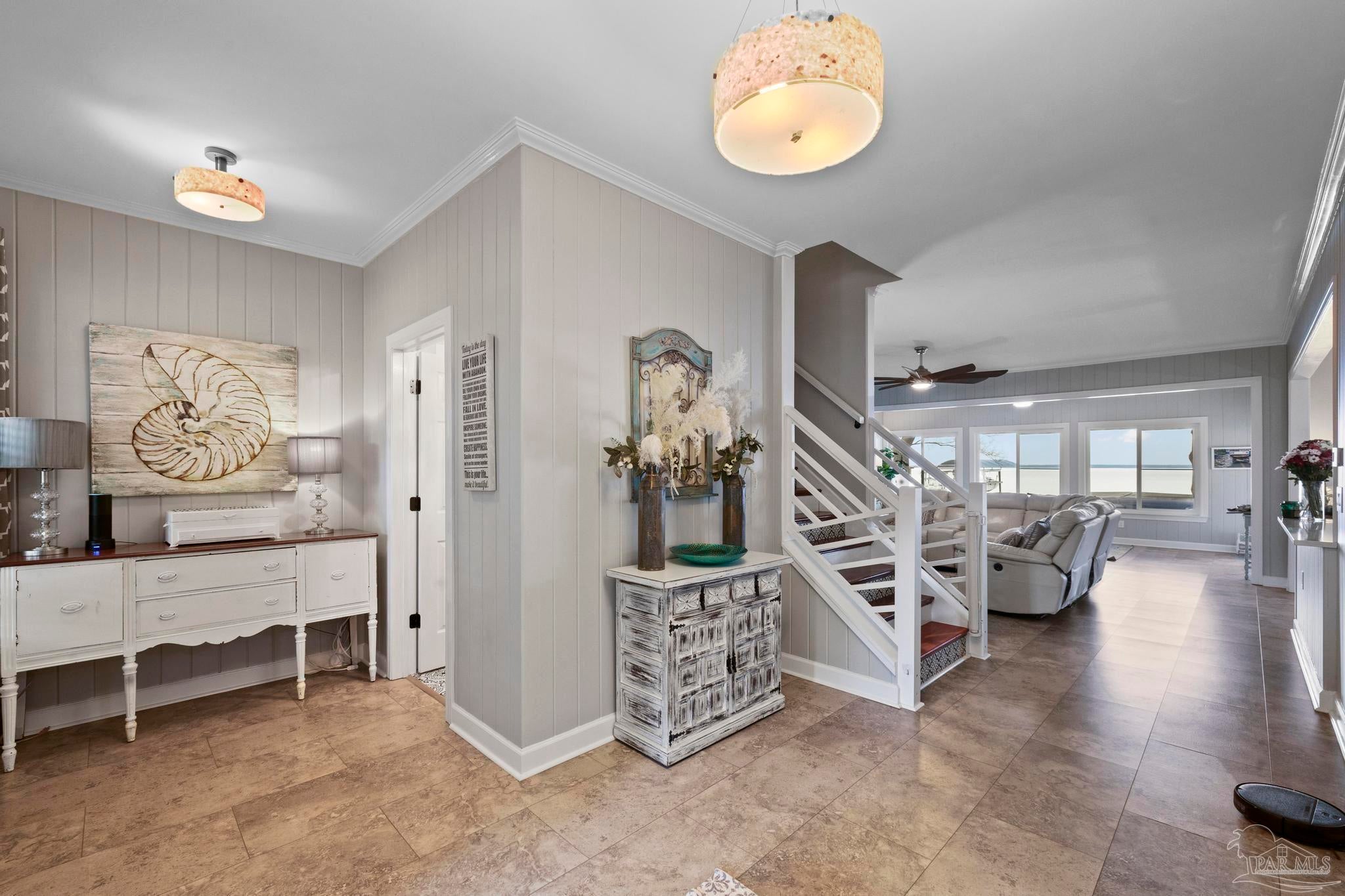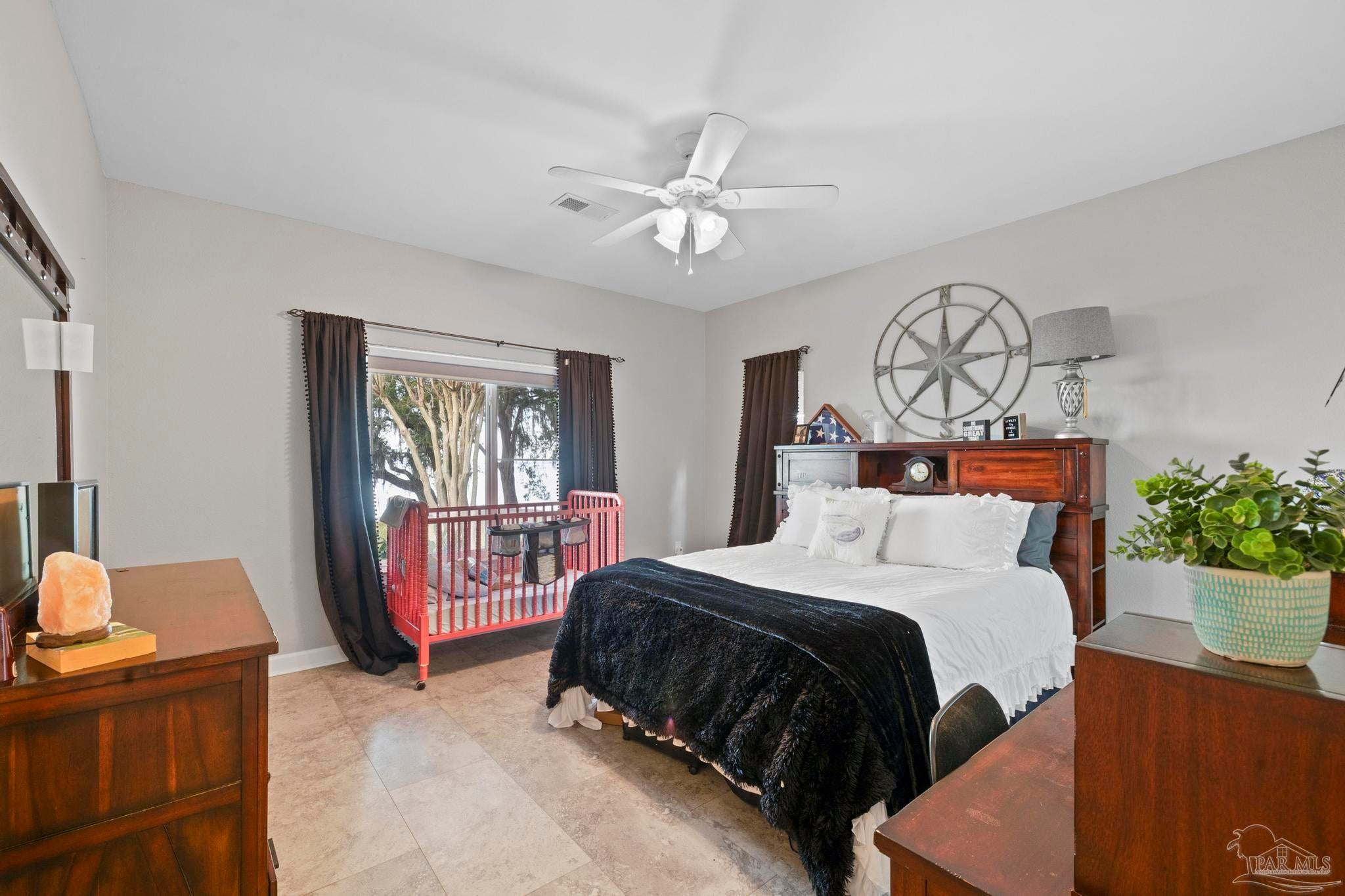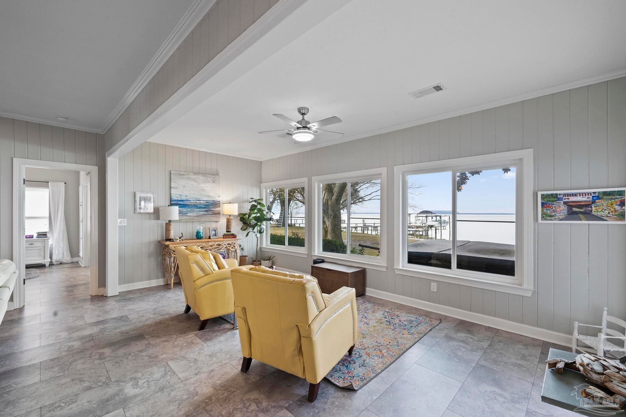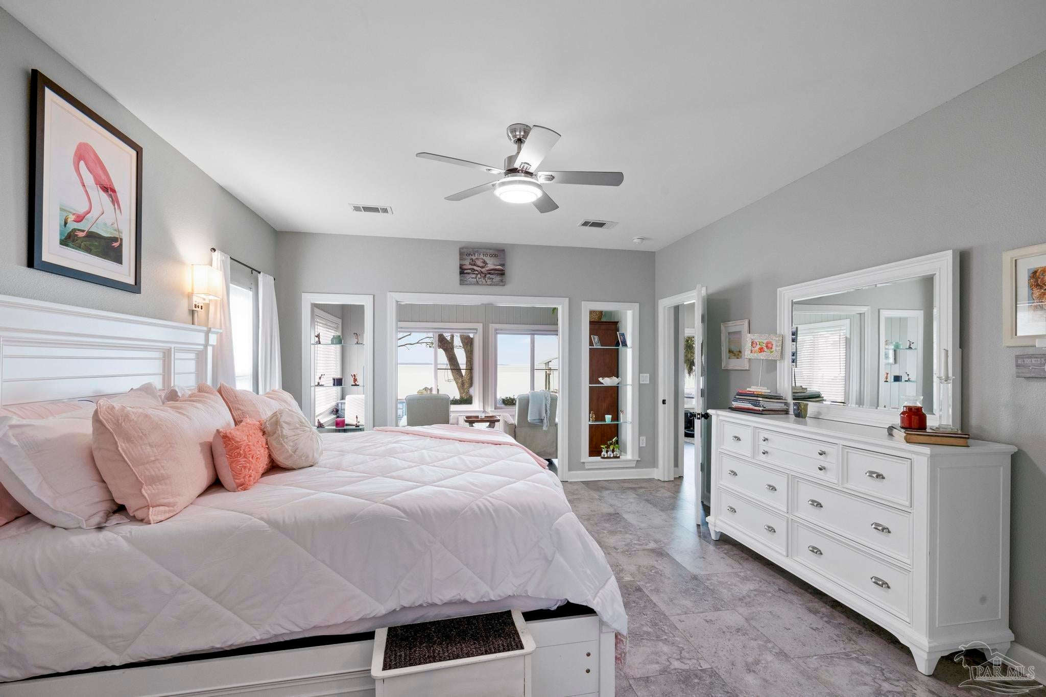Waterfront living on Pensacola Bay with 90 feet of private shoreline. This exceptional 3-bed, 3.5-bath Gulf Breeze home spans nearly 3,500 sq ft on a .40-acre lot and blends solid construction with relaxed coastal style—brick and Hardie® plank siding, impact-rated windows (2020), assumable flood insurance (never flooded), and homeowners insurance reportedly under $8K/yr—paired with a neutral palette, LVP flooring, and bay views from almost every room. The fully remodeled kitchen is a showpiece with floor-to-ceiling white cabinetry, quartzite countertops, stainless appliances, an eat-in nook, and a breakfast bar. It opens to a spacious family room with a cozy fireplace and picture windows framing the wraparound deck, hot tub, and backyard oasis. Out back, a 100-ft dock with boat and jet-ski lifts sets the stage for everyday sunset cruises and weekend fun. The primary suite is a private retreat with a sitting area overlooking the water, dual vanities, a tiled shower, soaking tub, water closet, and a generous walk-in closet. A split layout places a secondary bedroom and updated bath on the opposite side of the home, along with a large laundry/mud room offering abundant storage. Upstairs, ~800 sq ft adds a bedroom, full bath, and a separate living area with sweeping bay views—perfect for guests or a media space. Additional highlights include a 2-car garage, irrigation system, transferable termite warranty, and no HOA. Ideally located just past the Gulf Islands National Seashore, this is luxury waterfront living in Gulf Breeze at its best. See media for more details, photos, and 3D tour.
