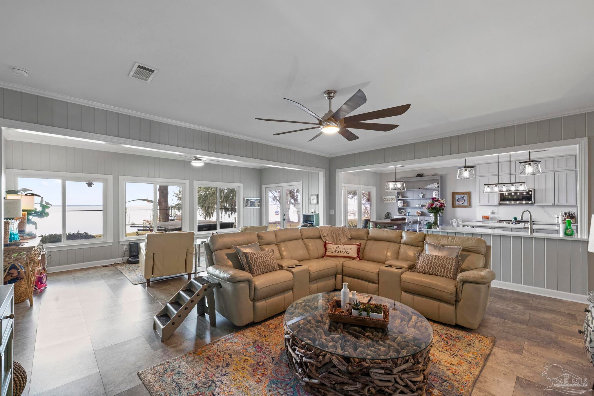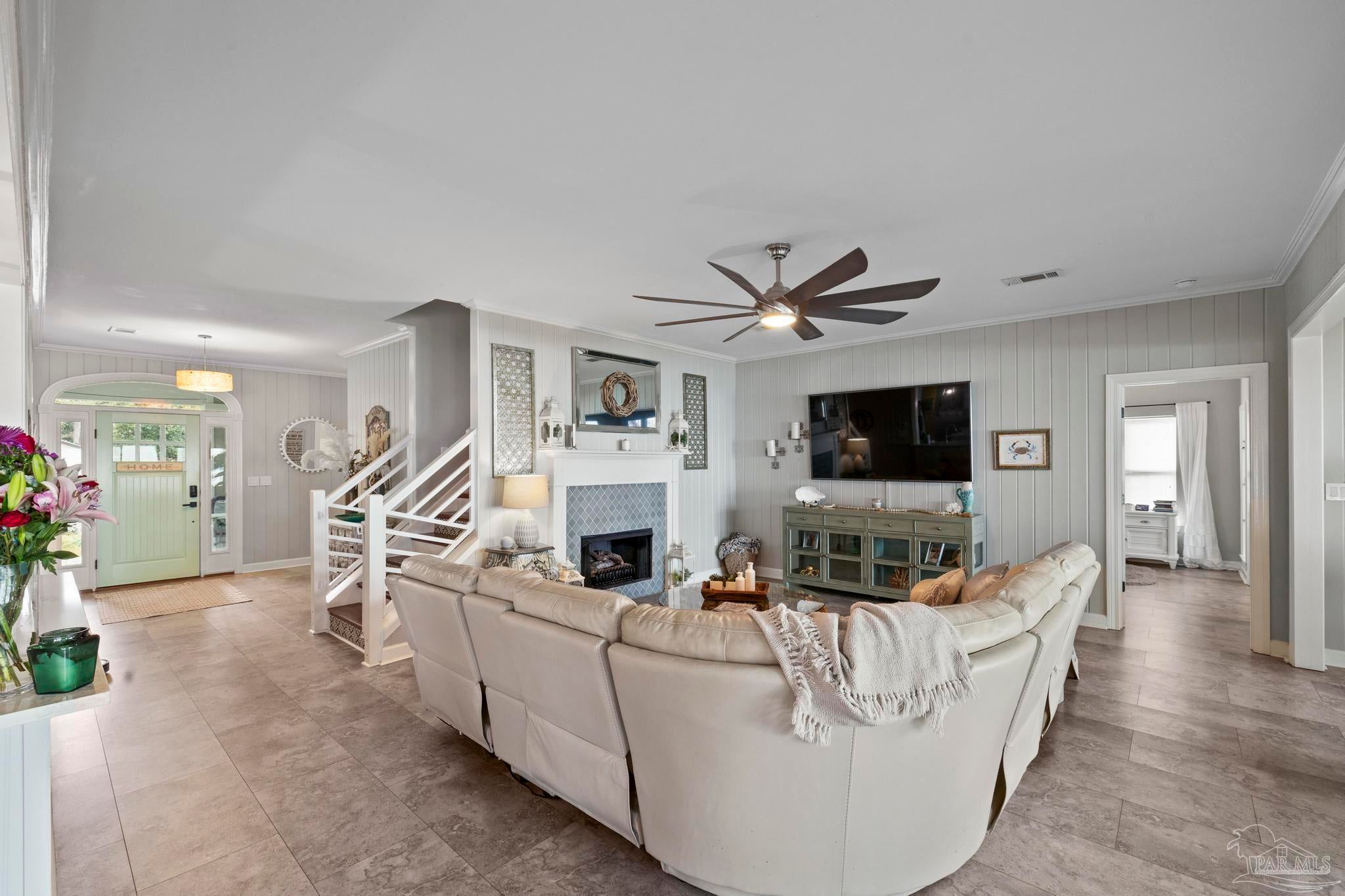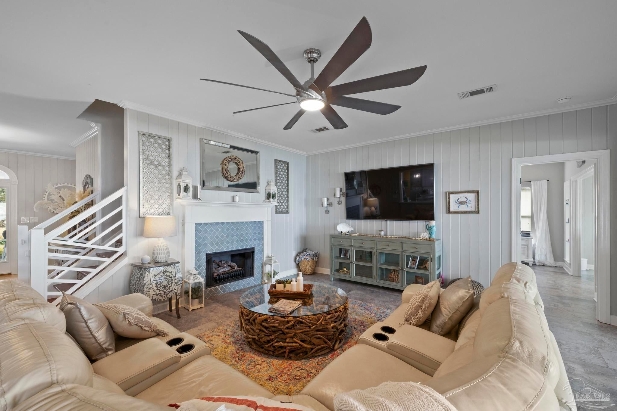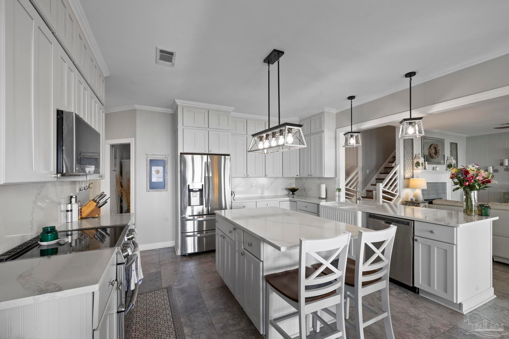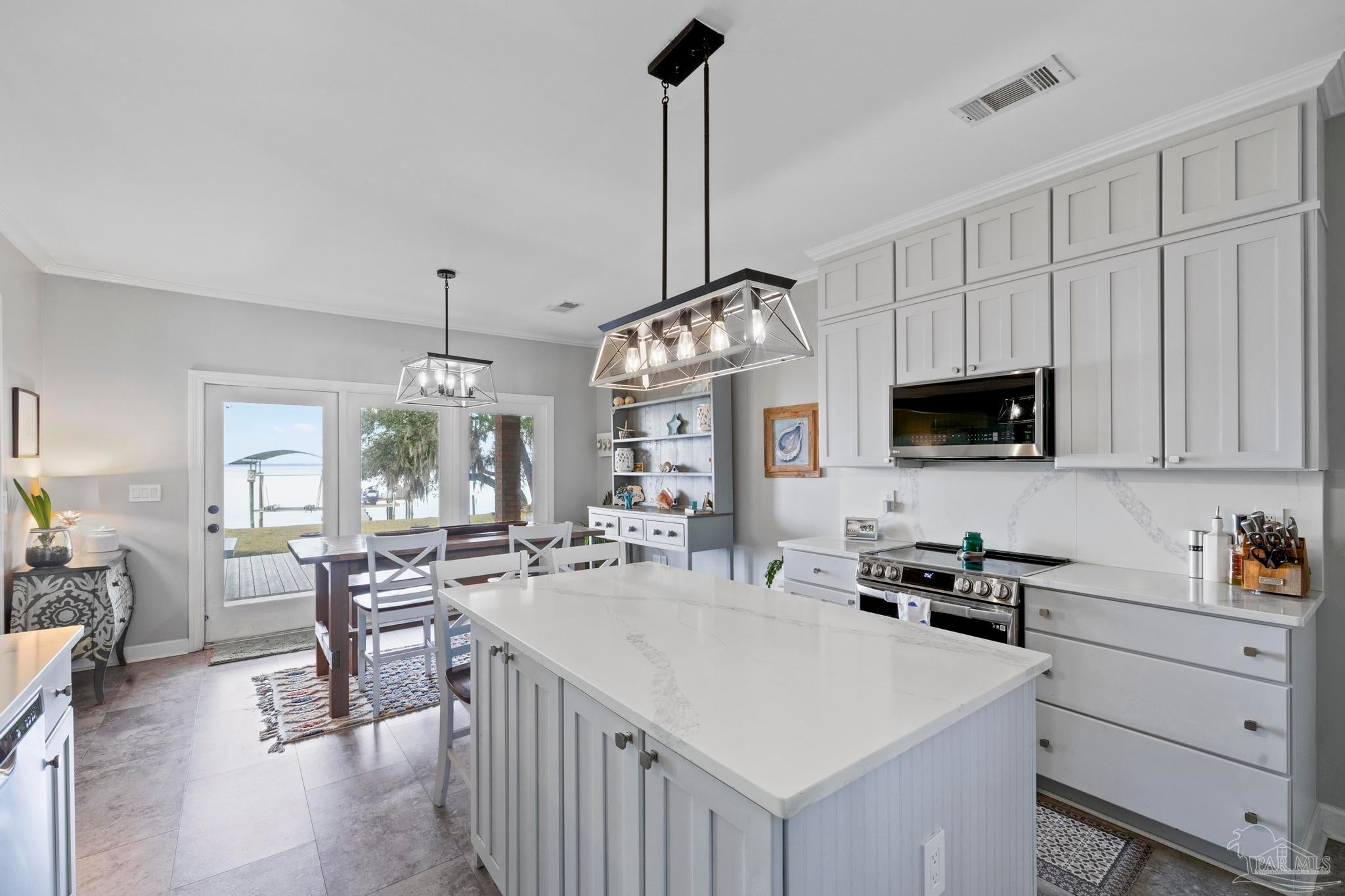 Waterfront living on Pensacola Bay with 90 feet of private shoreline. This exceptional 3-bed, 3.5-bath Gulf Breeze home spans nearly 3,500 sq ft on a .40-acre lot and blends solid construction with relaxed coastal style—brick and Hardie® plank siding, impact-rated windows (2020), assumable flood insurance (never flooded), and homeowners insurance reportedly under $8K/yr—paired with a neutral palette, LVP flooring, and bay views from almost every room. The fully remodeled kitchen is a showpiece with floor-to-ceiling white cabinetry, quartzite countertops, stainless appliances, an eat-in nook, and a breakfast bar. It opens to a spacious family room with a cozy fireplace and picture windows framing the wraparound deck, hot tub, and backyard oasis. Out back, a 100-ft dock with boat and jet-ski lifts sets the stage for everyday sunset cruises and weekend fun. The primary suite is a private retreat with a sitting area overlooking the water, dual vanities, a tiled shower, soaking tub, water closet, and a generous walk-in closet. A split layout places a secondary bedroom and updated bath on the opposite side of the home, along with a large laundry/mud room offering abundant storage. Upstairs, ~800 sq ft adds a bedroom, full bath, and a separate living area with sweeping bay views—perfect for guests or a media space. Additional highlights include a 2-car garage, irrigation system, transferable termite warranty, and no HOA. Ideally located just past the Gulf Islands National Seashore, this is luxury waterfront living in Gulf Breeze at its best. See media for more details, photos, and 3D tour.