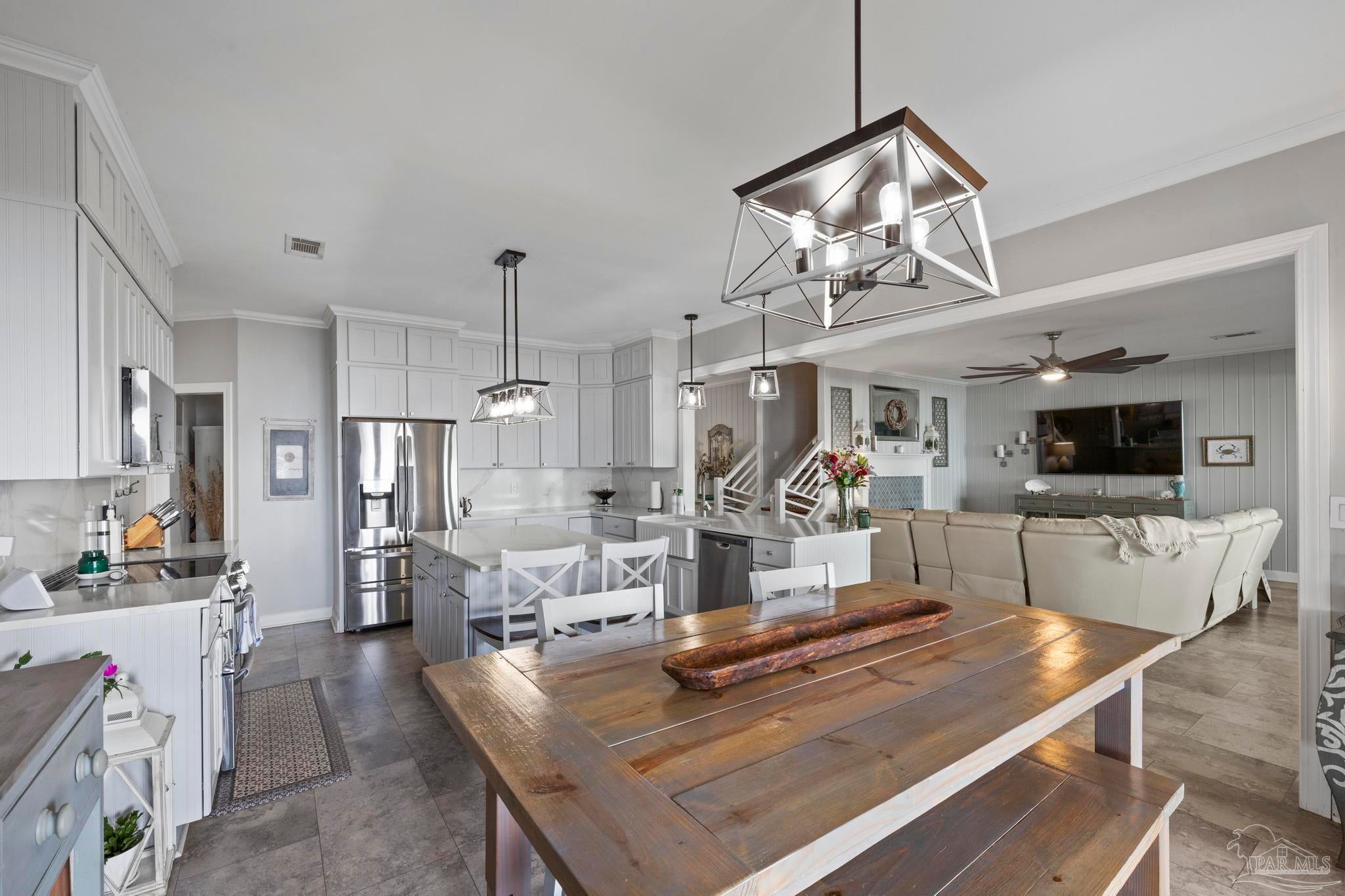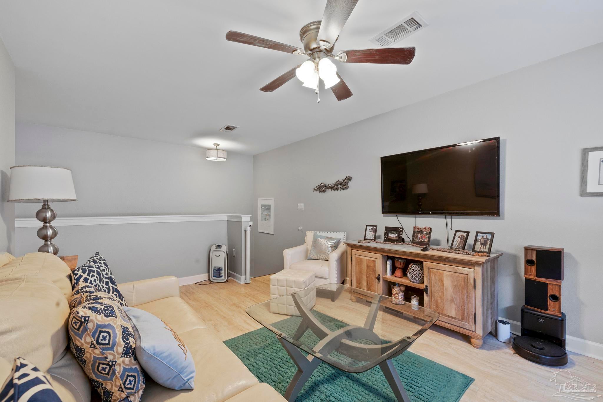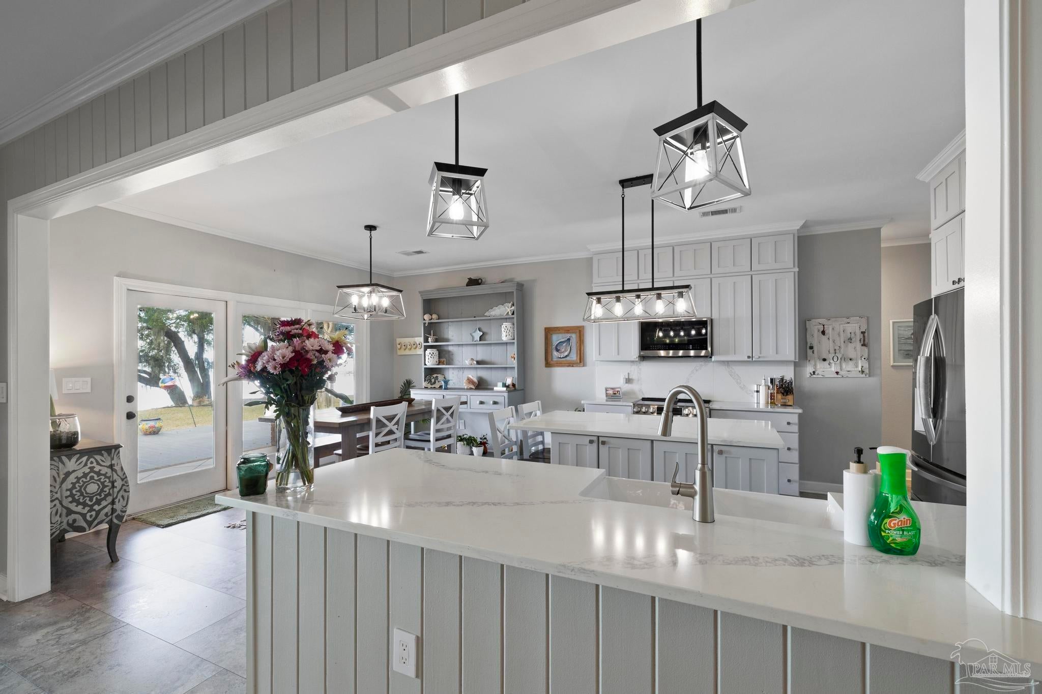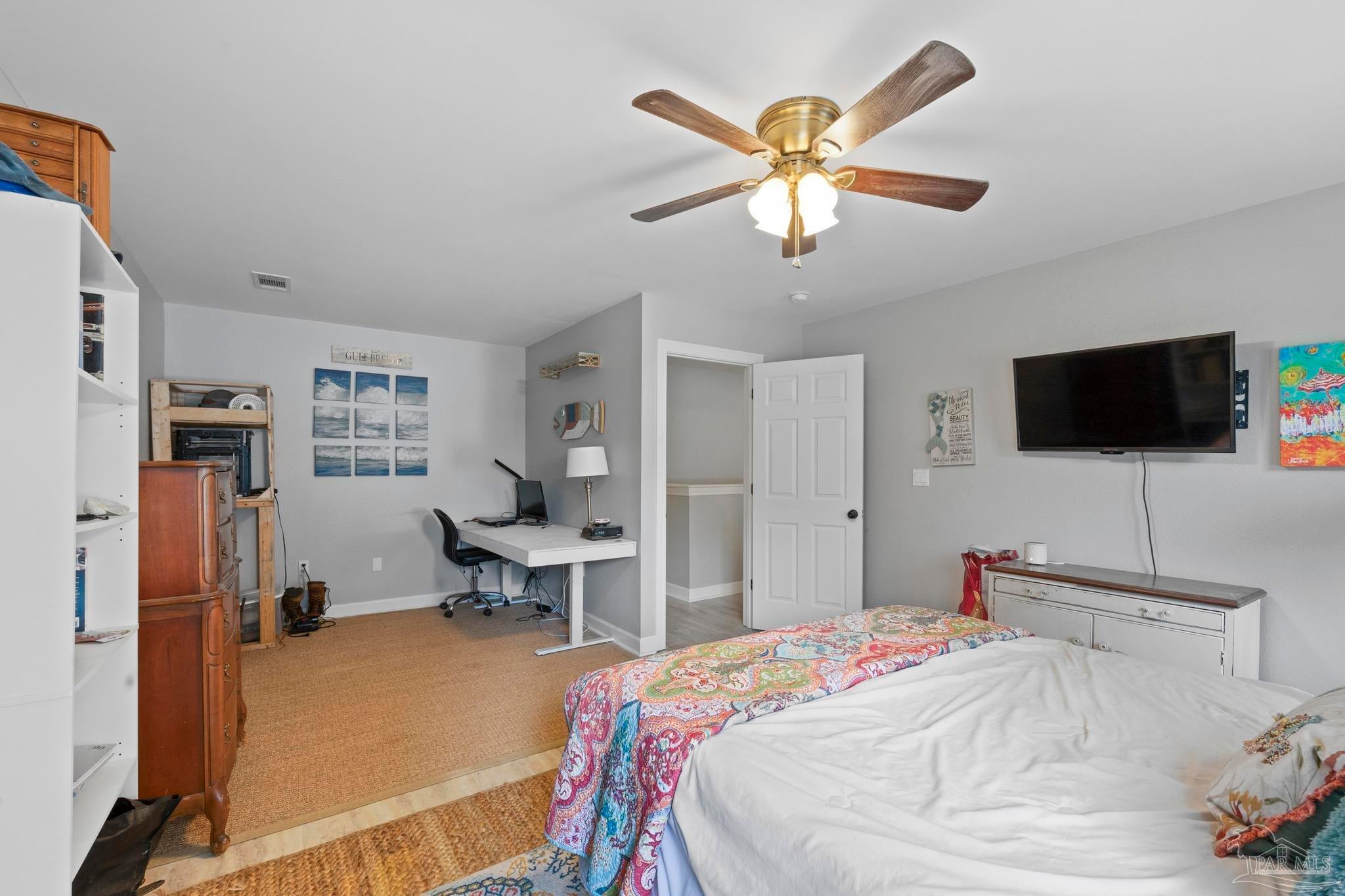 Waterfront living on Pensacola Bay with 90 feet of private shoreline. This exceptional 3-bed, 3.5-bath Gulf Breeze home spans nearly 3,500 sq ft on a .40-acre lot and blends solid construction with relaxed coastal style—brick and Hardie® plank siding, impact-rated windows (2020), assumable flood insurance (never flooded), and homeowners insurance reportedly under $8K/yr—paired with a neutral palette, LVP flooring, and bay views from almost every room. The fully remodeled kitchen is a showpiece with floor-to-ceiling white cabinetry, quartzite countertops, stainless appliances, an eat-in nook, and a breakfast bar. It opens to a spacious family room with a cozy fireplace and picture windows framing the wraparound deck, hot tub, and backyard oasis. Out back, a 100-ft dock with boat and jet-ski lifts sets the stage for everyday sunset cruises and weekend fun. The primary suite is a private retreat with a sitting area overlooking the water, dual vanities, a tiled shower, soaking tub, water closet, and a generous walk-in closet. A split layout places a secondary bedroom and updated bath on the opposite side of the home, along with a large laundry/mud room offering abundant storage. Upstairs, ~800 sq ft adds a bedroom, full bath, and a separate living area with sweeping bay views—perfect for guests or a media space. Additional highlights include a 2-car garage, irrigation system, transferable termite warranty, and no HOA. Ideally located just past the Gulf Islands National Seashore, this is luxury waterfront living in Gulf Breeze at its best. See media for more details, photos, and 3D tour.