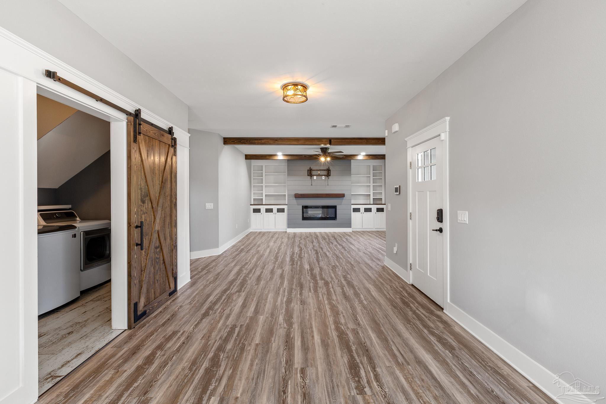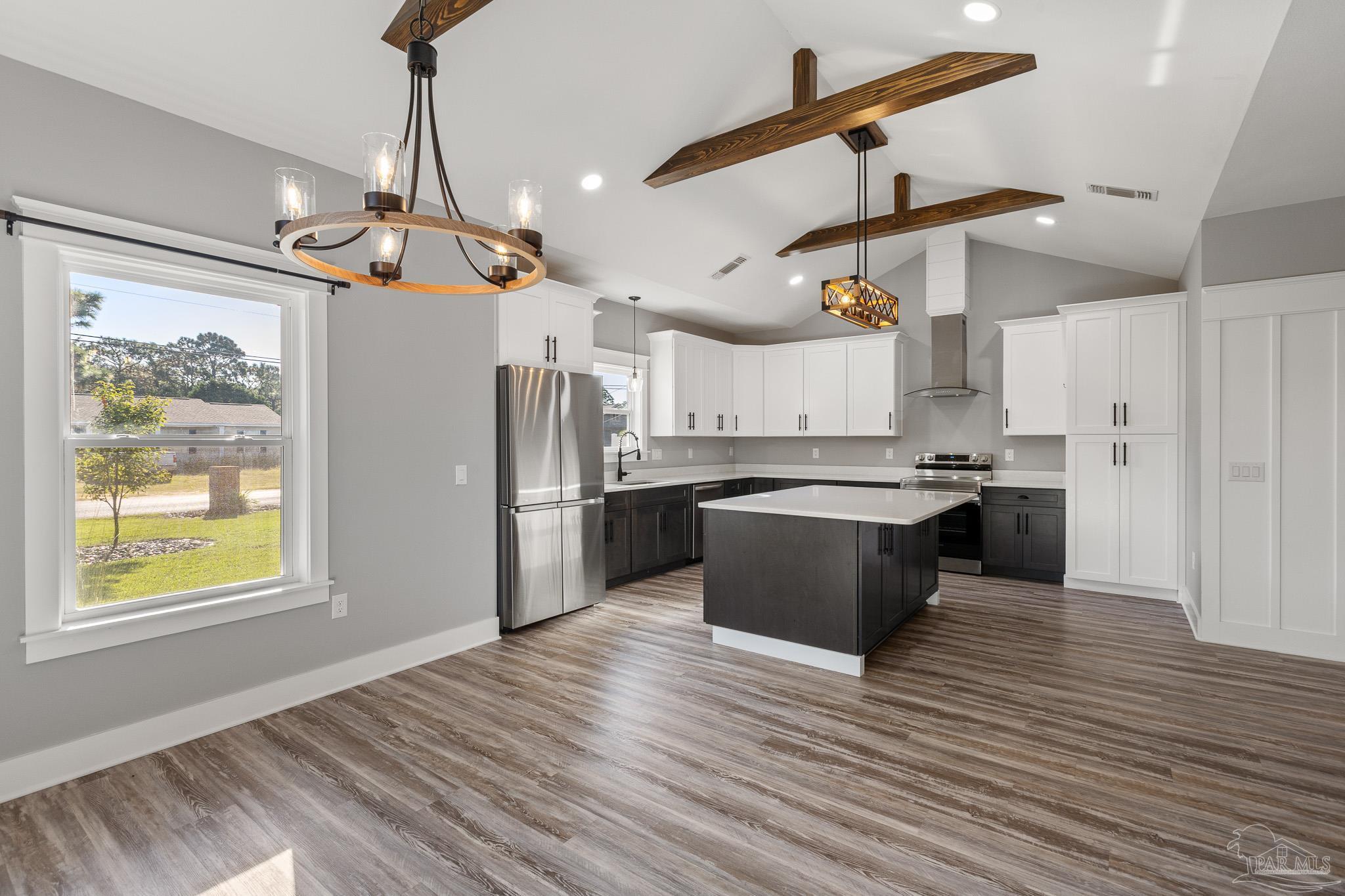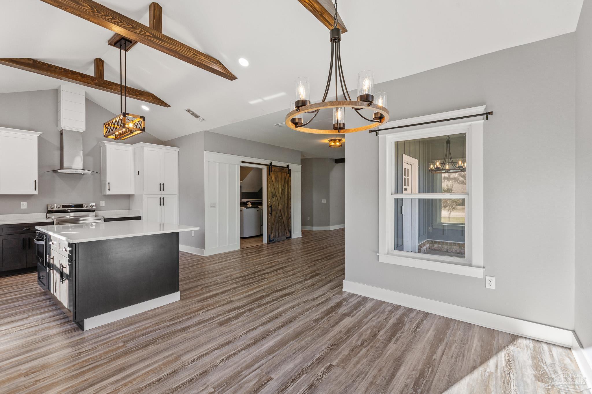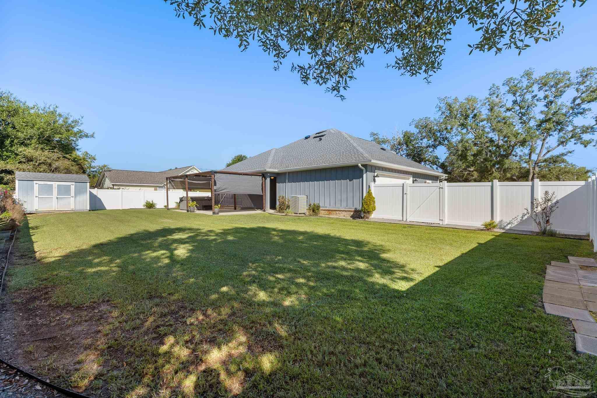 Built in 2022, this gently lived in 2240 sq. ft. custom built modern farmhouse offers the perfect blend of craftsmanship and comfort. Inside, you’ll find 4 bedrooms and 2.5 baths, including a first-floor master retreat with a tiled walk-in shower, soaking tub, dual vanities, and a custom closet. The open layout features 9 ft ceilings downstairs, a vaulted kitchen with truss beams, quartz countertops, gray-and-white cabinetry, and a large island, flowing into a cozy living room with ceiling beams and a shiplap fireplace. Situated on a beautifully landscaped corner lot, the property includes a new white vinyl fence, oversized garage with 8-ft door, spacious outbuilding, Hardie board siding, hurricane shutters, and a covered back patio for entertaining. Added Benefit for Veterans, this home comes with an assumable VA mortgage at a low interest rate—a rare find in today’s market. Move-in ready with timeless details and modern convenience throughout.