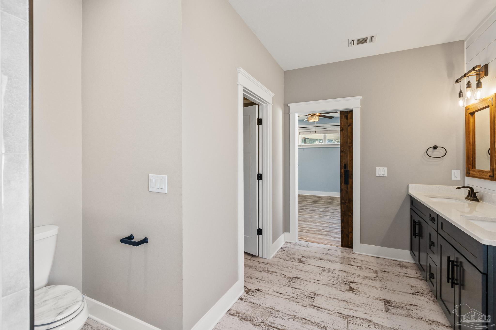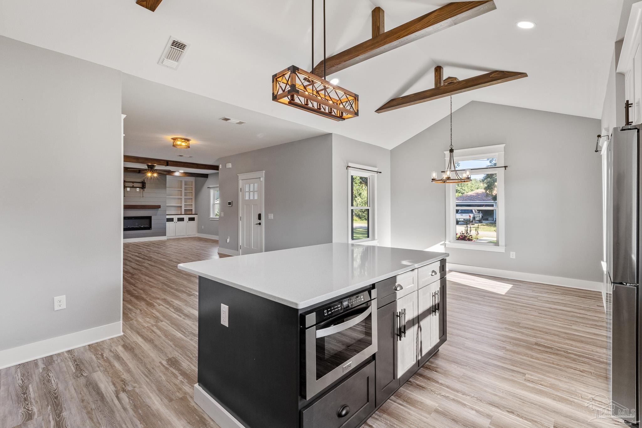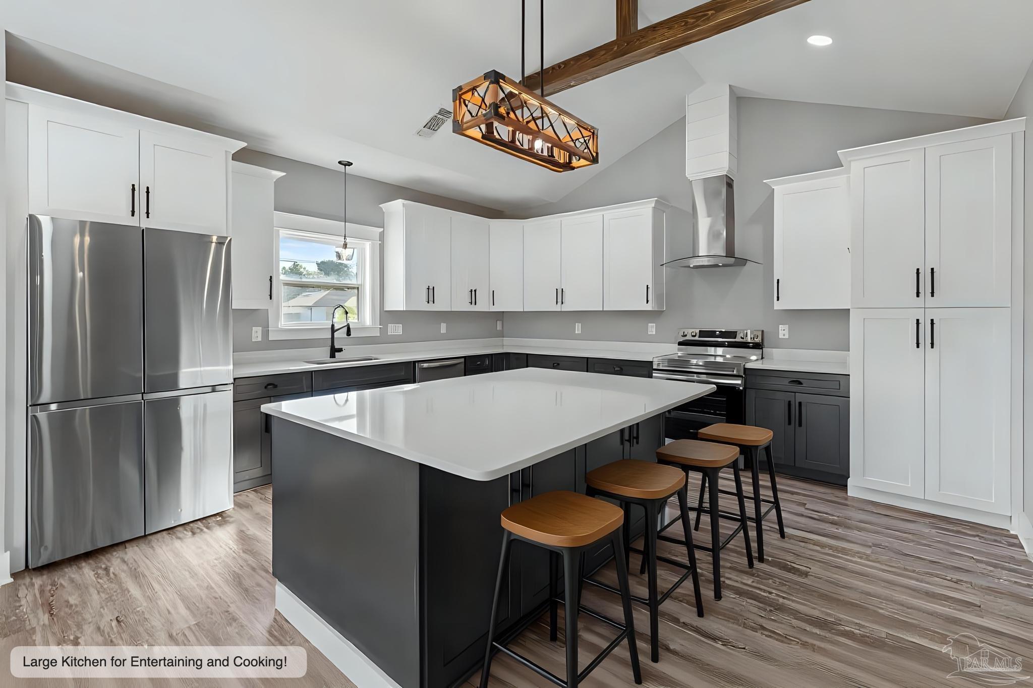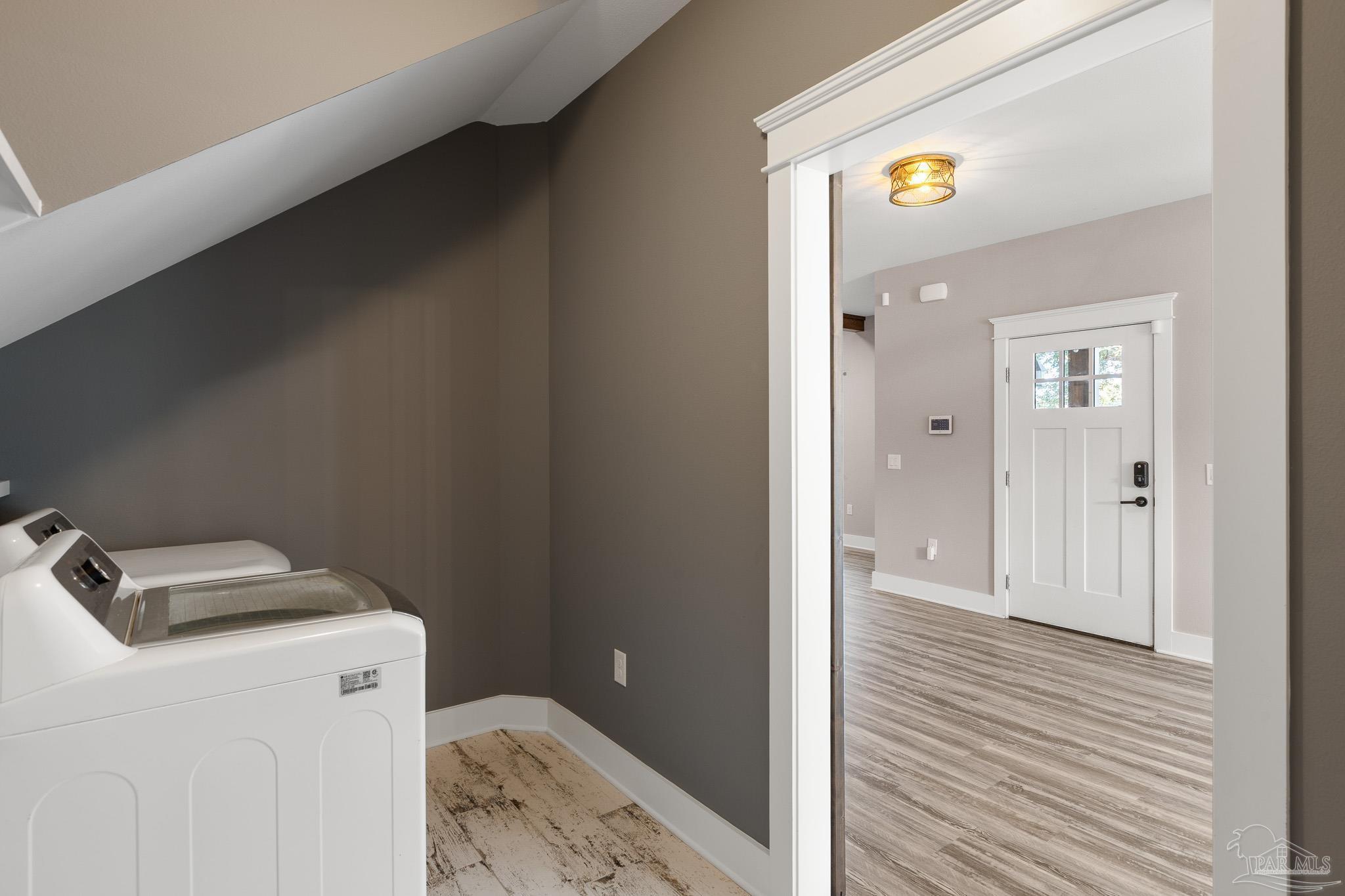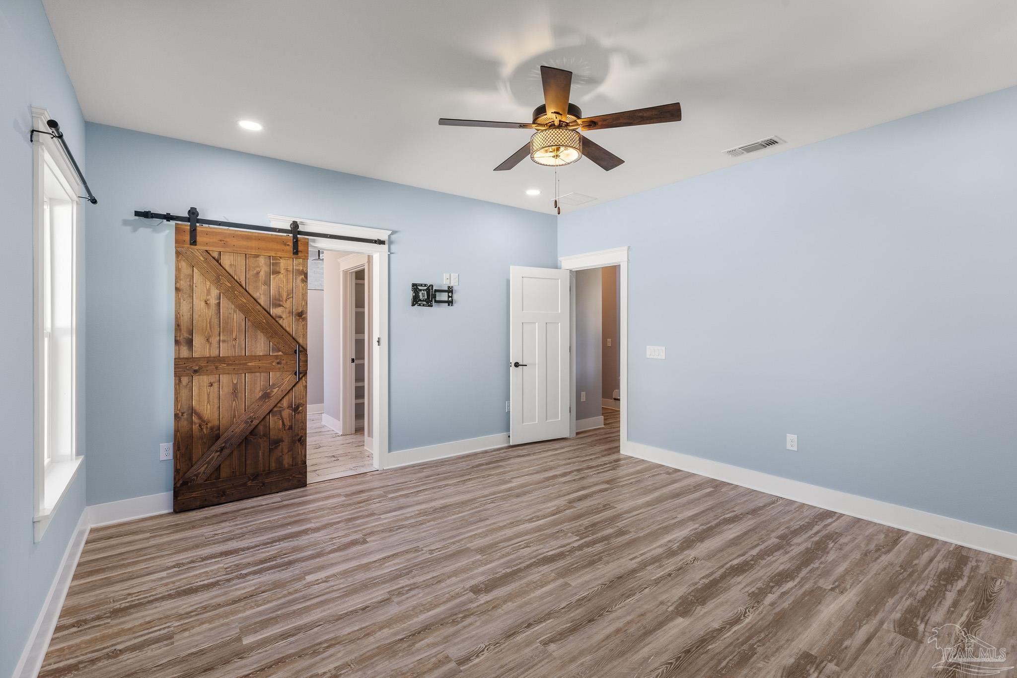 Built in 2022, this gently lived in 2240 sq. ft. custom built modern farmhouse offers the perfect blend of craftsmanship and comfort. Inside, you’ll find 4 bedrooms and 2.5 baths, including a first-floor master retreat with a tiled walk-in shower, soaking tub, dual vanities, and a custom closet. The open layout features 9 ft ceilings downstairs, a vaulted kitchen with truss beams, quartz countertops, gray-and-white cabinetry, and a large island, flowing into a cozy living room with ceiling beams and a shiplap fireplace. Situated on a beautifully landscaped corner lot, the property includes a new white vinyl fence, oversized garage with 8-ft door, spacious outbuilding, Hardie board siding, hurricane shutters, and a covered back patio for entertaining. Added Benefit for Veterans, this home comes with an assumable VA mortgage at a low interest rate—a rare find in today’s market. Move-in ready with timeless details and modern convenience throughout.