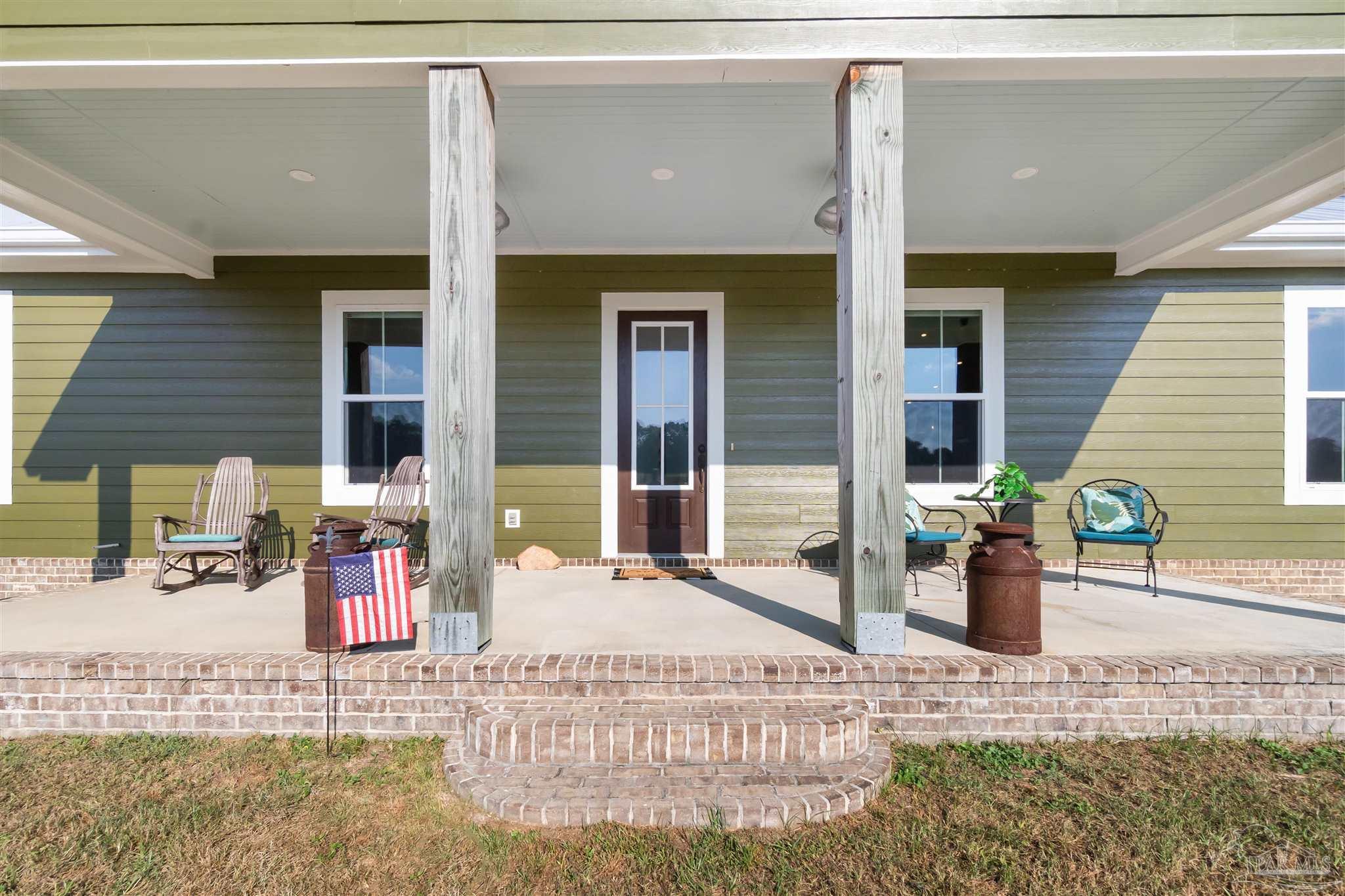 Introducing Dream Acres, a hidden gem located in the tranquil countryside of Molino, embraced by picturesque equestrian estates, the Perdido River WMA, and safeguarded agricultural lands. Access your own secluded retreat via a private road that meanders through the stunning agricultural scenery of Northwest Florida. Built in 2017, this custom-designed farmhouse showcases a thoughtful layout that combines style and functionality. Step onto the inviting front covered porch or the expansive 10 x 60-foot covered back porch, both offering breathtaking views of the surrounding countryside. Inside, the home greets you with soaring vaulted ceilings, charming stone-accented wood-burning fireplace, and elegant rustic luxury vinyl plank flooring throughout. The kitchen is a true culinary delight, boasting a generous 6’ x 7’ island, high-end appliances, Wolf gas cooktop and hood, granite countertops, and custom wood cabinetry crafted by local Mennonites. Down the hallway there’s two spacious bedrooms with ample closet space, and a guest bathroom. The primary suite offers an extra large closet, a luxurious walk-in shower, double vanity. All accented by remarkable high ceilings and custom solid wood slider doors throughout. Additionally, the attic provides extra storage and finished square footage. Equipped with a full-house dehumidifier and high-impact windows enhance comfort and safety. Encompassing just over 20 acres (10 acres of raw land, along with 5 acres dedicated to a lush yard and 5 acres of pasture previously utilized for cattle grazing) with a spacious barn for all your equipment, a covered feed station with the potential for a stable/barn conversion, and a chicken coop. Water is sourced from a deep well. As you stroll to the rear of the property, a serene spring-fed creek flows through, adding to the charm of this unique estate. With limitless possibilities for a hobby ranch or homesteading dreams, this property truly stands out as a one-of-a-kind opportunity.