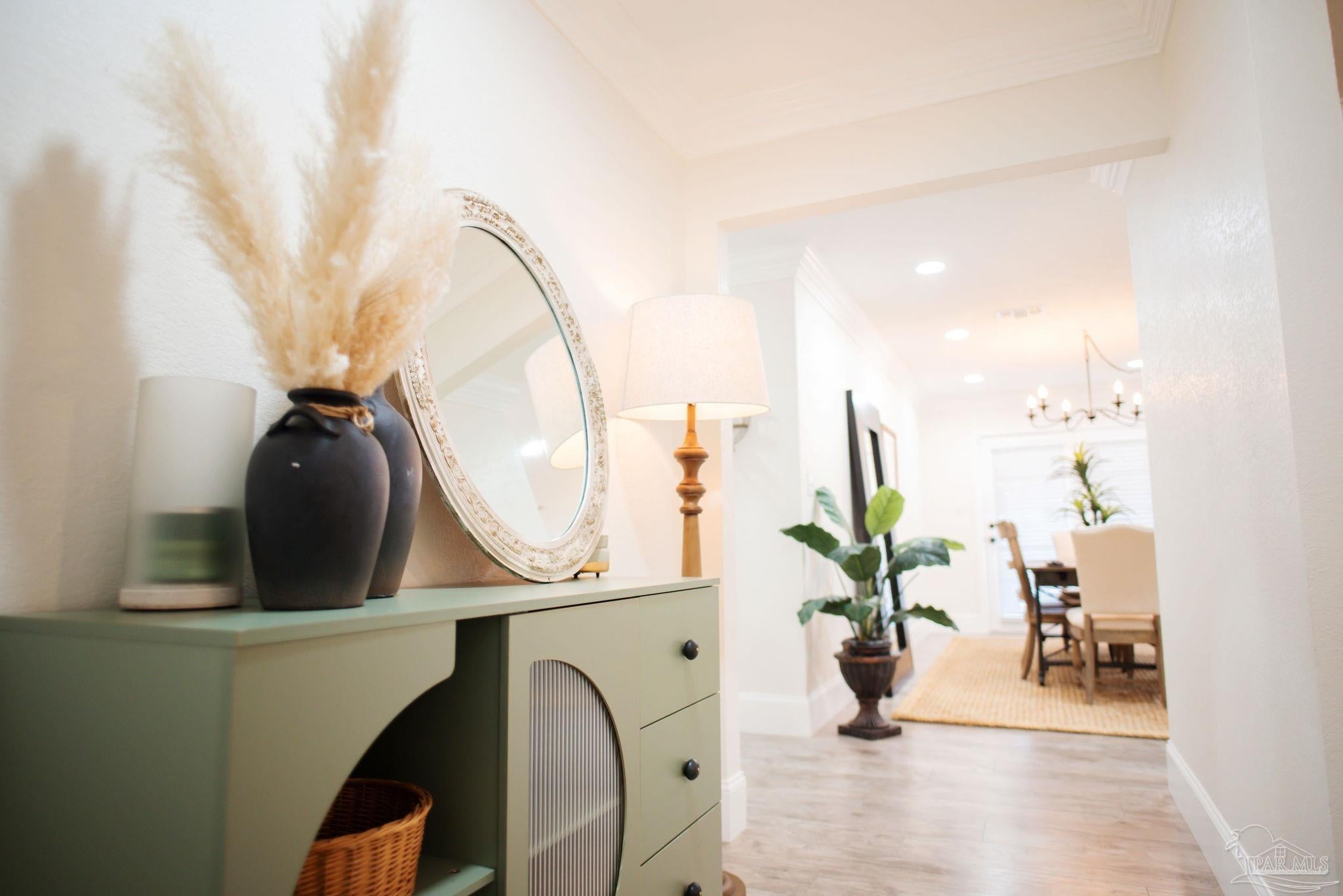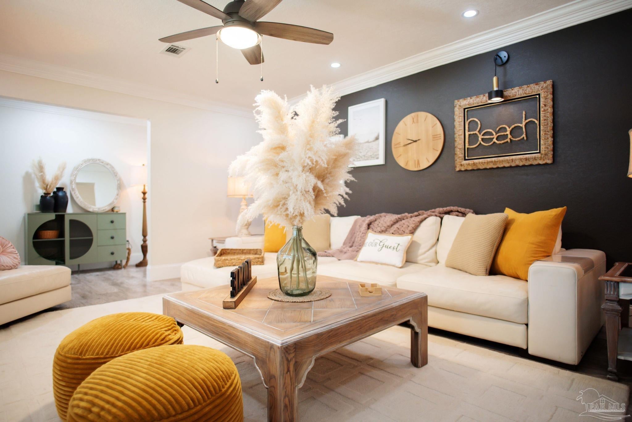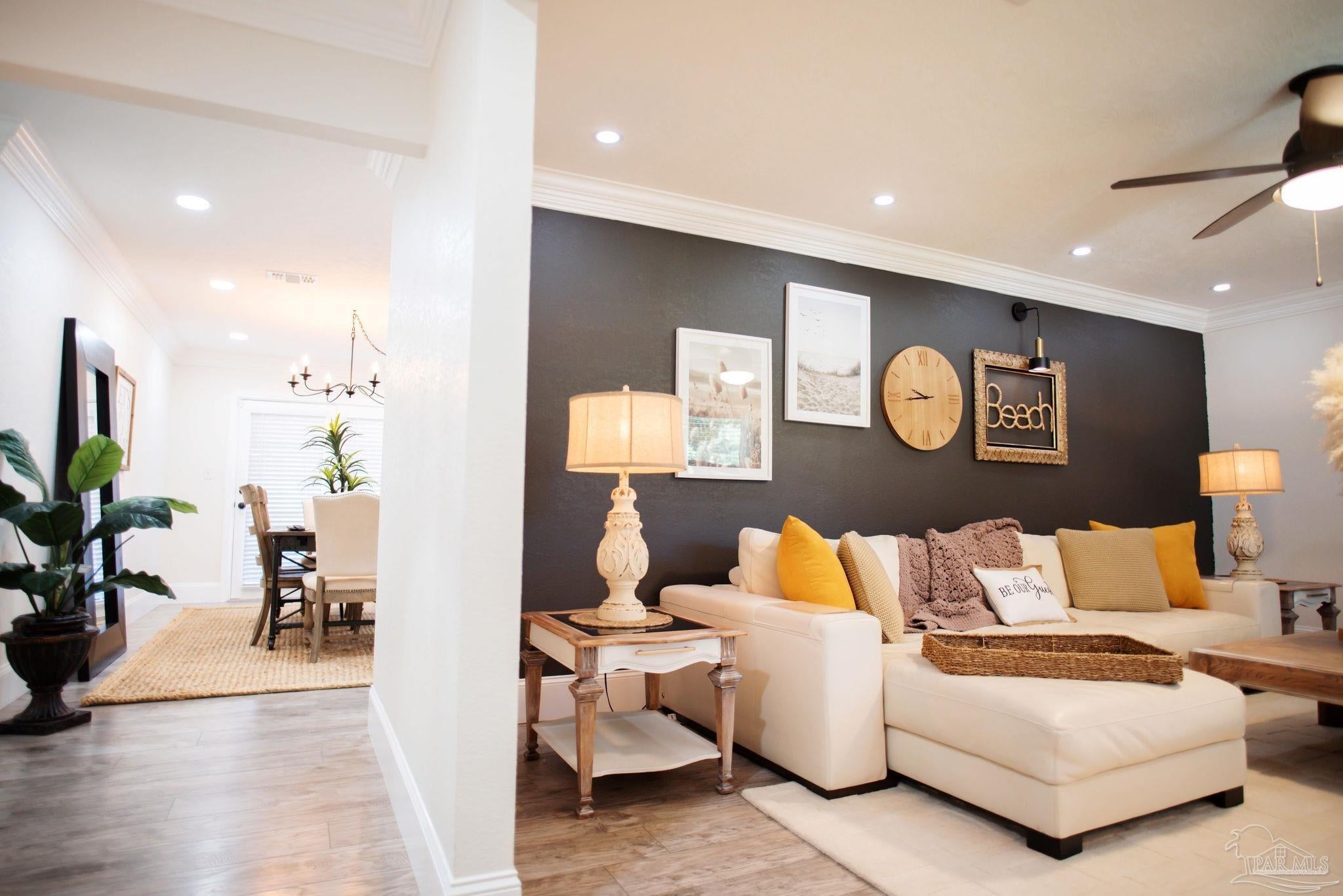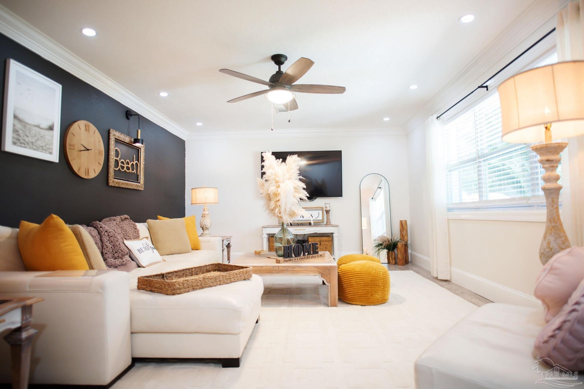 Discover the charm of this absolutely stunning and meticulously maintained home, once you see it, you’ll look no further. Majestic oak trees and beautifully kept landscaping welcome you upon arrival, setting the perfect tone for what’s inside. Step through the door and be captivated by the thoughtful design and attention to detail throughout this fully furnished, move-in-ready home. Elegant touches such as large baseboards, crown molding, and wood-look LVP flooring create a warm and inviting atmosphere. The beautifully decorated, spacious living room offers plenty of natural light and recessed lighting, setting the stage for comfort and style. The open-concept kitchen, dining, and breakfast area make entertaining effortless. You’ll love the custom cabinetry, quartz countertops, stainless steel appliances, recessed and under-cabinet lighting, all blending together in perfect harmony. Down the hall, the master suite offers side-by-side his-and-hers closets and a luxurious en suite bath. Two additional bedrooms and a full guest bath provide ample space for family or visitors. Off the kitchen, an oversized two-car garage offers room for vehicles, toys, and a workshop. Step outside and unwind beneath the fanned pergola with decorative lighting, a perfect spot to relax after a long day. A backyard garden shed provides extra space for tools and seasonal items. Located within walking distance to local schools, just minutes from shopping, and a short drive to downtown Pensacola and the beach, this home offers both comfort and convenience. Whether you’re searching for your forever home or a turnkey investment, this property is fully furnished, beautifully maintained, and move-in ready.