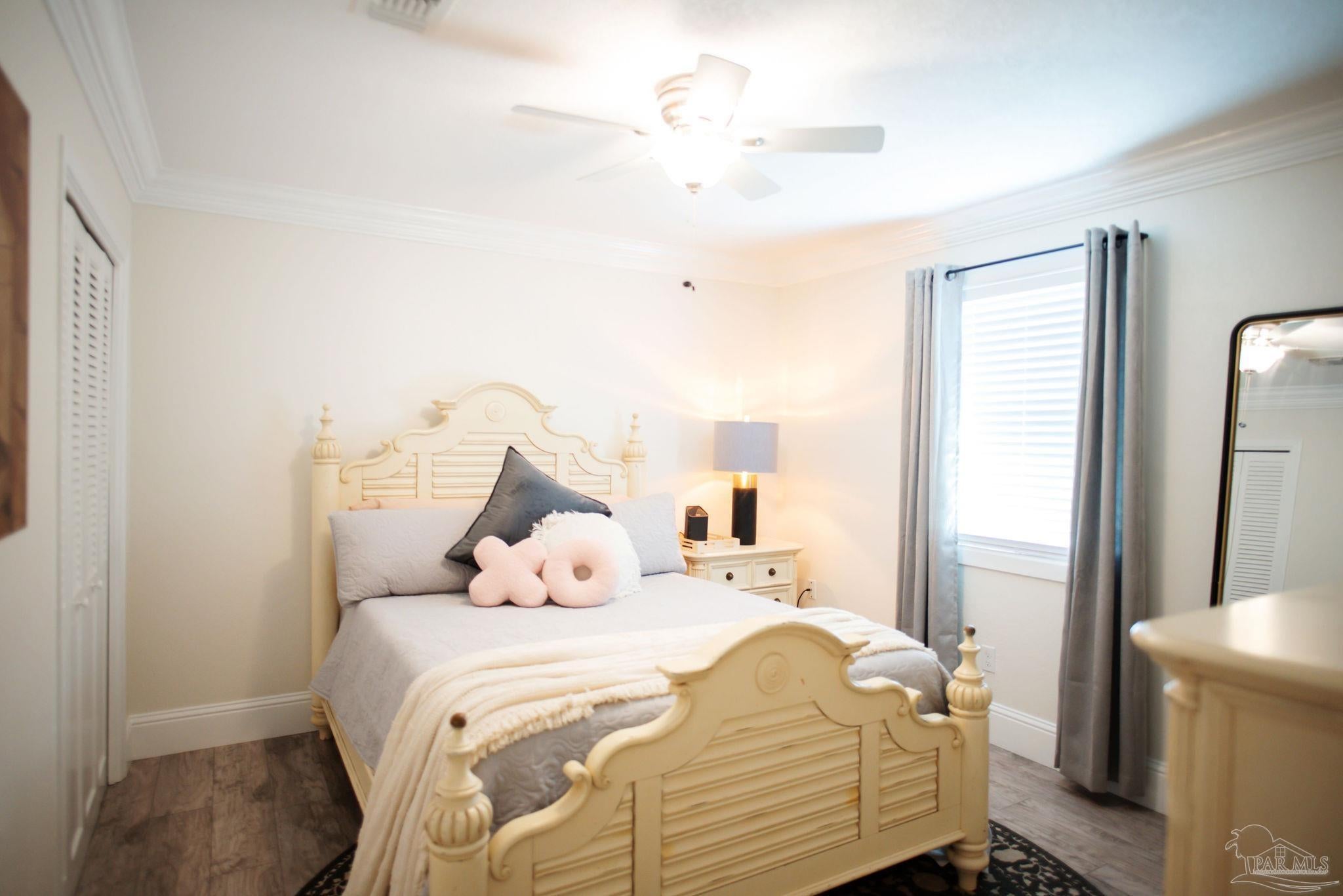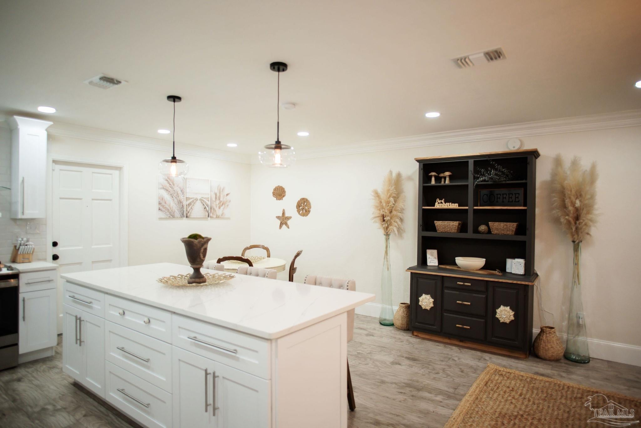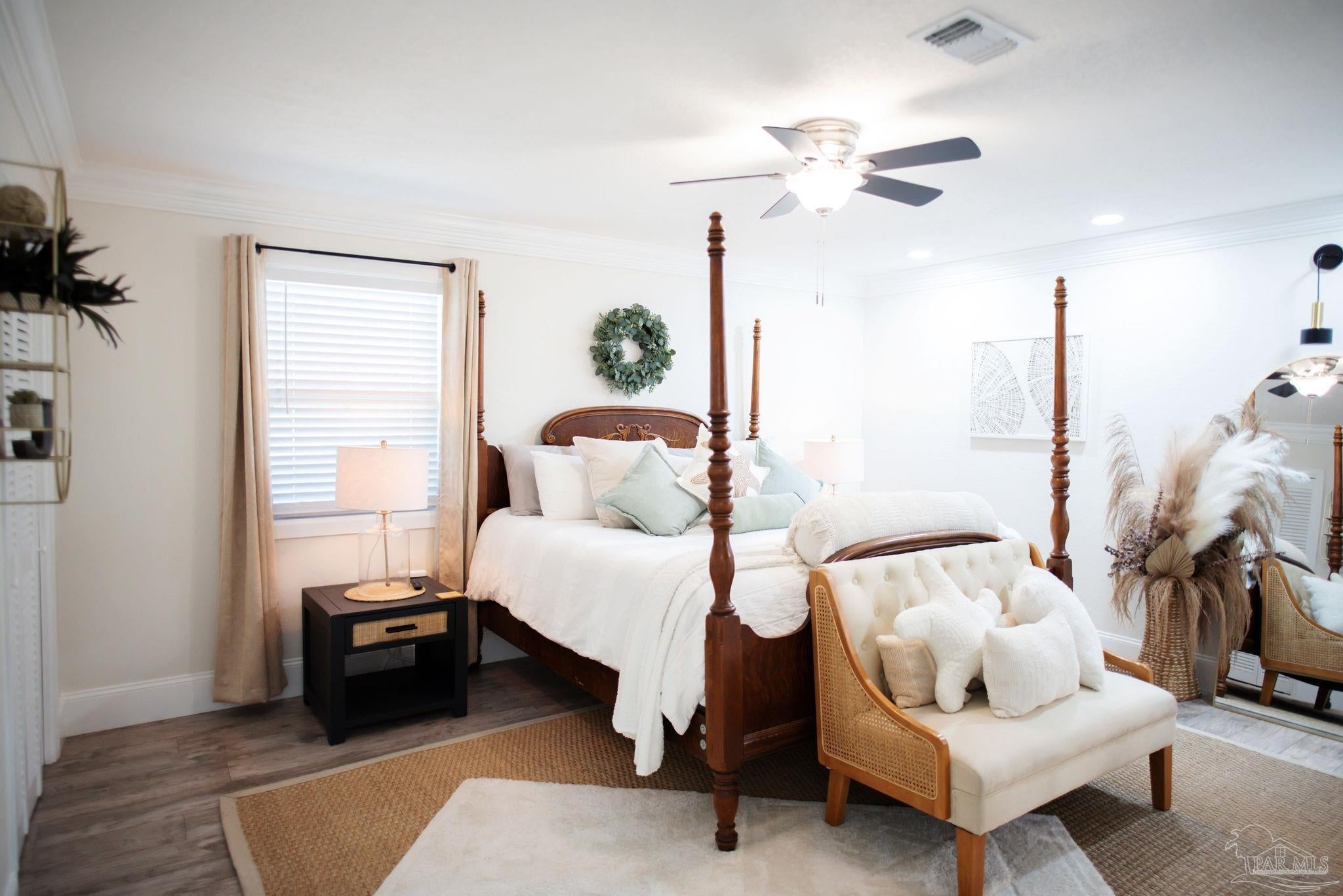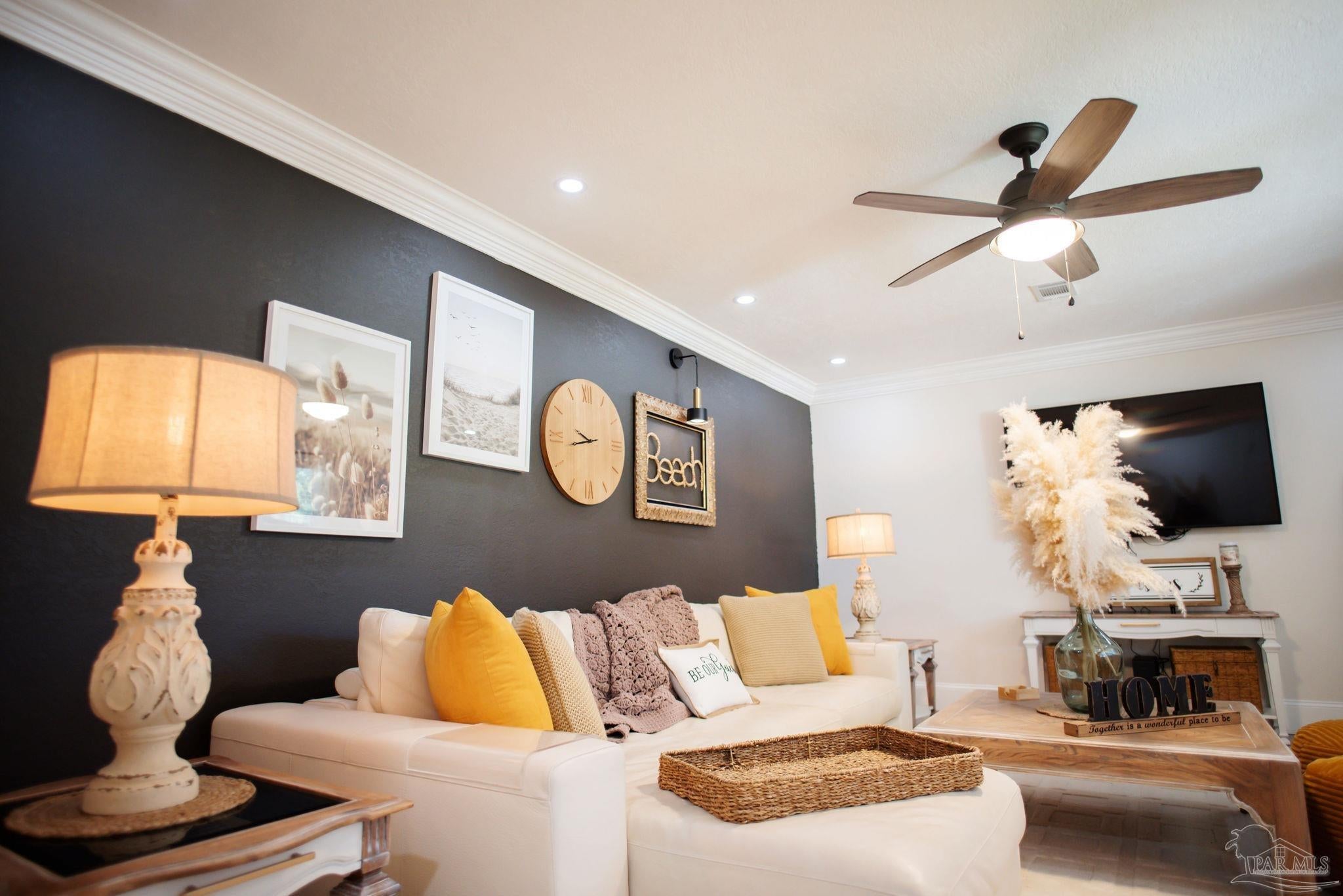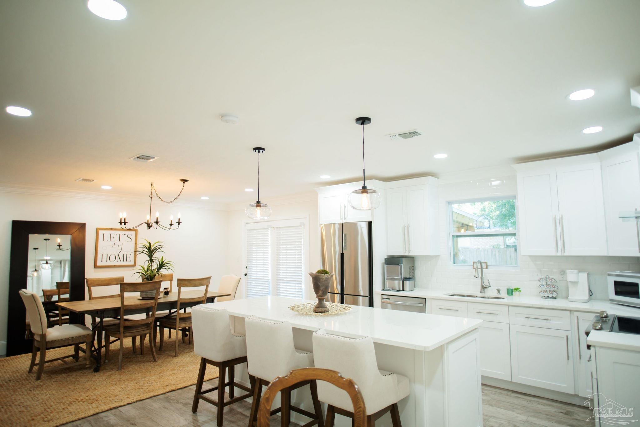 Discover the charm of this absolutely stunning and meticulously maintained home, once you see it, you’ll look no further. Majestic oak trees and beautifully kept landscaping welcome you upon arrival, setting the perfect tone for what’s inside. Step through the door and be captivated by the thoughtful design and attention to detail throughout this fully furnished, move-in-ready home. Elegant touches such as large baseboards, crown molding, and wood-look LVP flooring create a warm and inviting atmosphere. The beautifully decorated, spacious living room offers plenty of natural light and recessed lighting, setting the stage for comfort and style. The open-concept kitchen, dining, and breakfast area make entertaining effortless. You’ll love the custom cabinetry, quartz countertops, stainless steel appliances, recessed and under-cabinet lighting, all blending together in perfect harmony. Down the hall, the master suite offers side-by-side his-and-hers closets and a luxurious en suite bath. Two additional bedrooms and a full guest bath provide ample space for family or visitors. Off the kitchen, an oversized two-car garage offers room for vehicles, toys, and a workshop. Step outside and unwind beneath the fanned pergola with decorative lighting, a perfect spot to relax after a long day. A backyard garden shed provides extra space for tools and seasonal items. Located within walking distance to local schools, just minutes from shopping, and a short drive to downtown Pensacola and the beach, this home offers both comfort and convenience. Whether you’re searching for your forever home or a turnkey investment, this property is fully furnished, beautifully maintained, and move-in ready.
