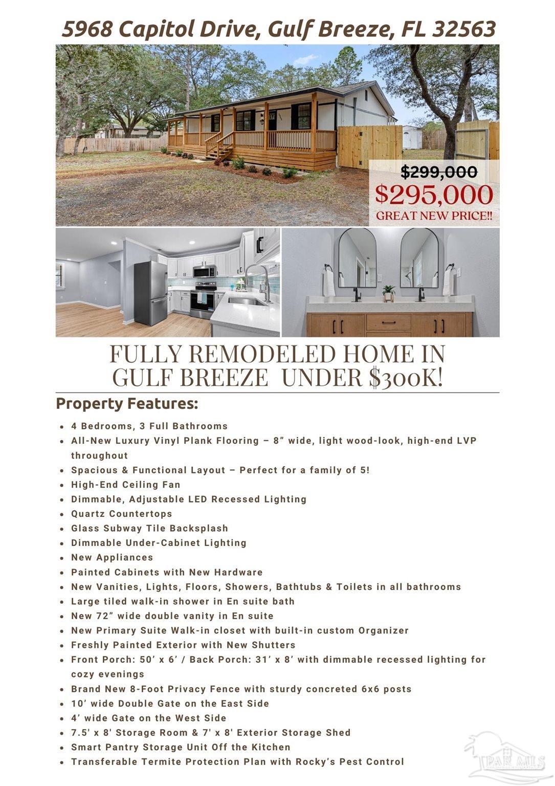 Welcome to the most updated 4 bed/3 full bath in Gulf Breeze under $300k! This home has been over updated, so the buyer will be the beneficiary. All new, same high-end, 8" wide, light, wood-look, Luxury Vinyl Plank flooring throughout entire home. The living room has a high-end fan and dimmable recessed, adjustable, LED lights. Completely remodeled kitchen, with quartz, glass subway tile backsplash, dimmable undercabinet lighting, new appliances, painted cabinets with new hardware. All bathrooms have new vanities, showers, baths, & toilets. The new remodeled primary suite features a walk-in closet with organizer, & the new ensuite bathroom features an AMAZING large tiled shower, 72" wide double vanity, new toilet, recessed lighting, and fan. Outside you will see all fresh paint & new shutters. You will LOVE the porches on this house. There is a freshly updated 50'x6' front porch and 31'x8' back porch. The recessed lights on the back porch are dimmable for nice quite evenings. Transferable termite protection plan in place with Rocky's. The smart storage in this home includes, the 7.5x 8' storage room, 7x8' storage shed, linen closet, walk-in closet in the primary, and the super efficient pantry piece in the kitchen. The layout of this home makes it very functional for a family of 5 easily. There is a new 8 foot privacy fence around the back yard supported with all 6x6 posts for extra sturdiness. There is a 10ft wide double gate on the east and a 4ft wide gate on the west sides of the home. You will love how quite yet convenient location. 1 minute from the new Soundside High School and just across Hwy 98 from the Zoo. 15 minutes to Navarre Beach and 20 minutes to Pensacola Beach. If you have champagne taste on a beer budget this home is for you! Seller Financing available.