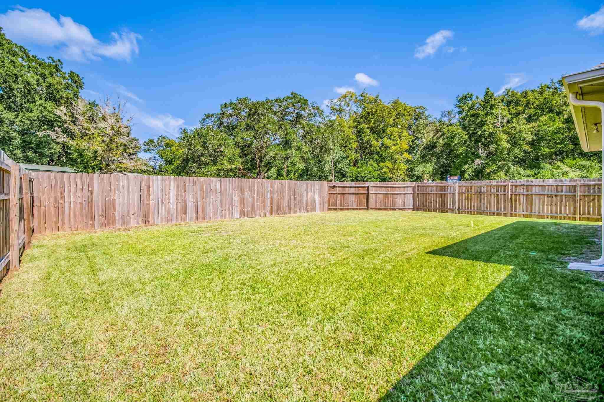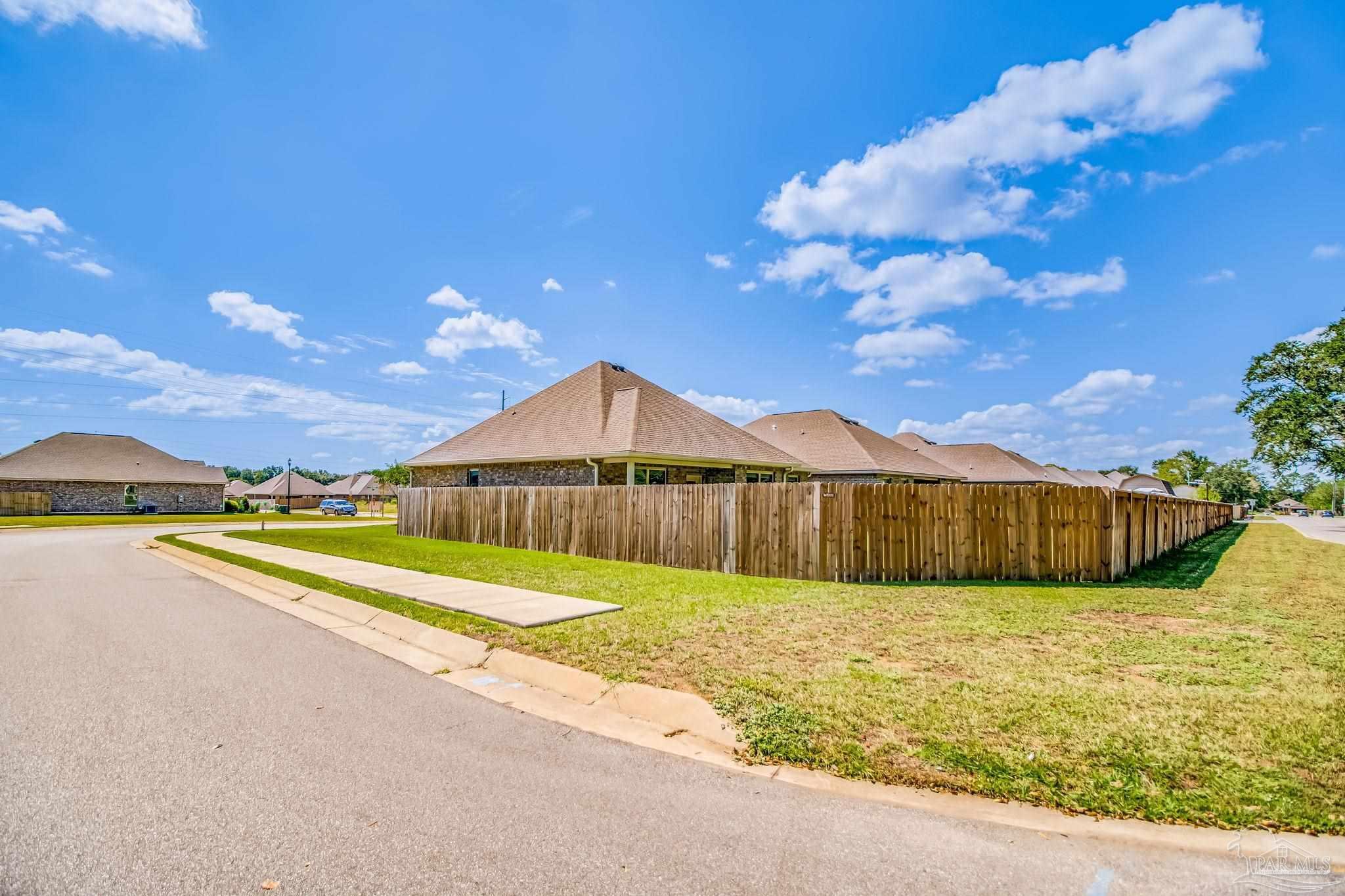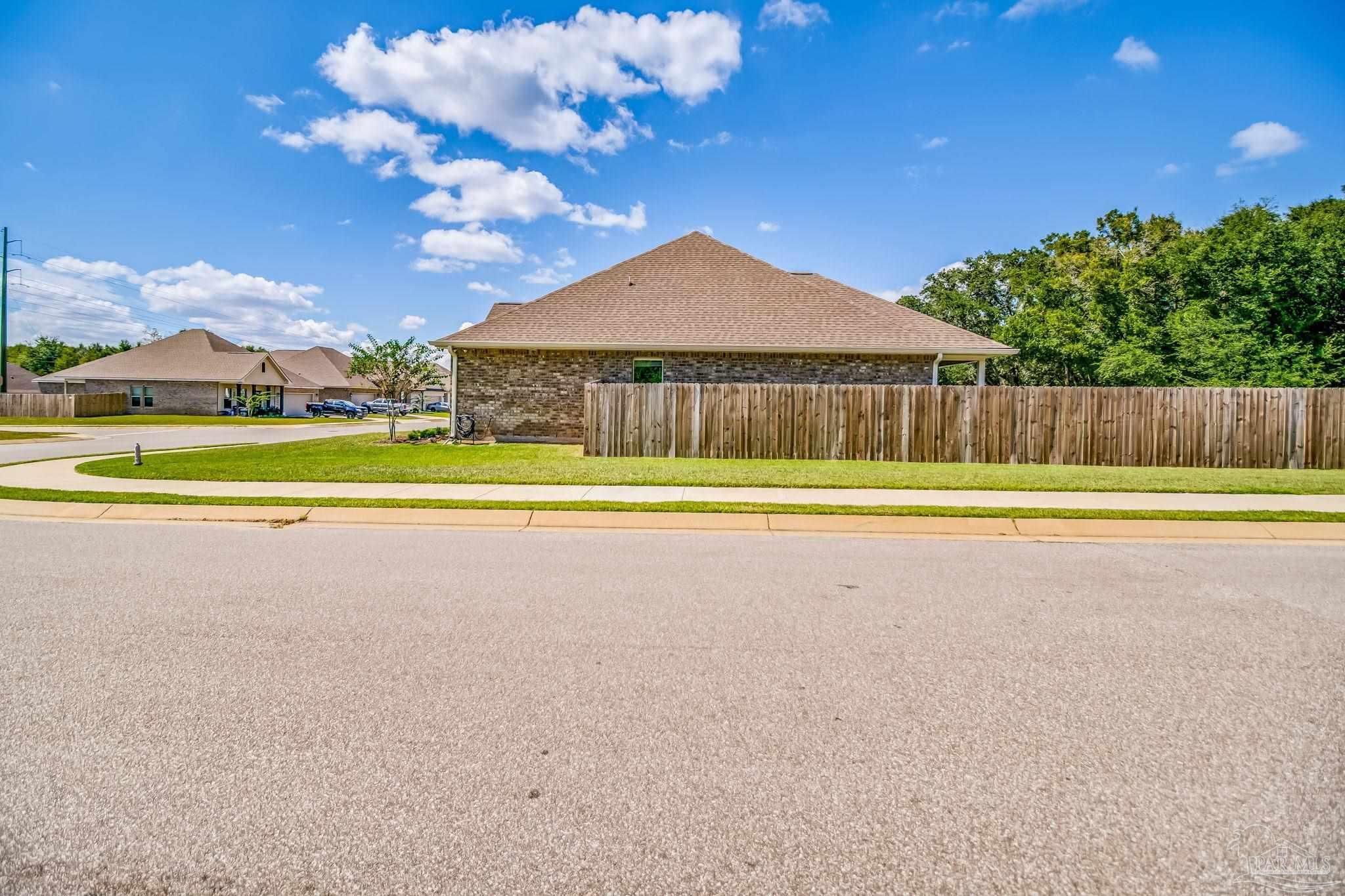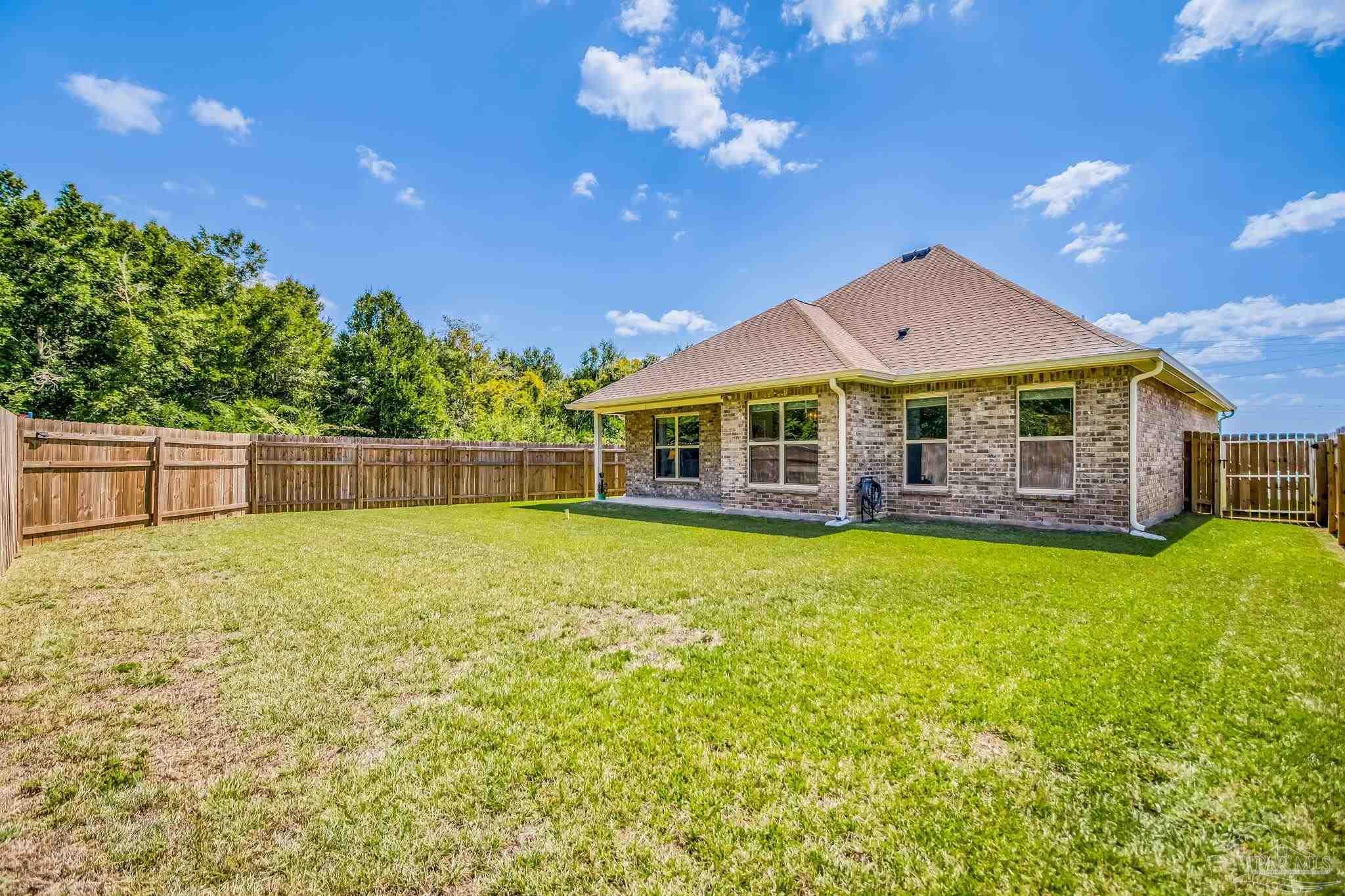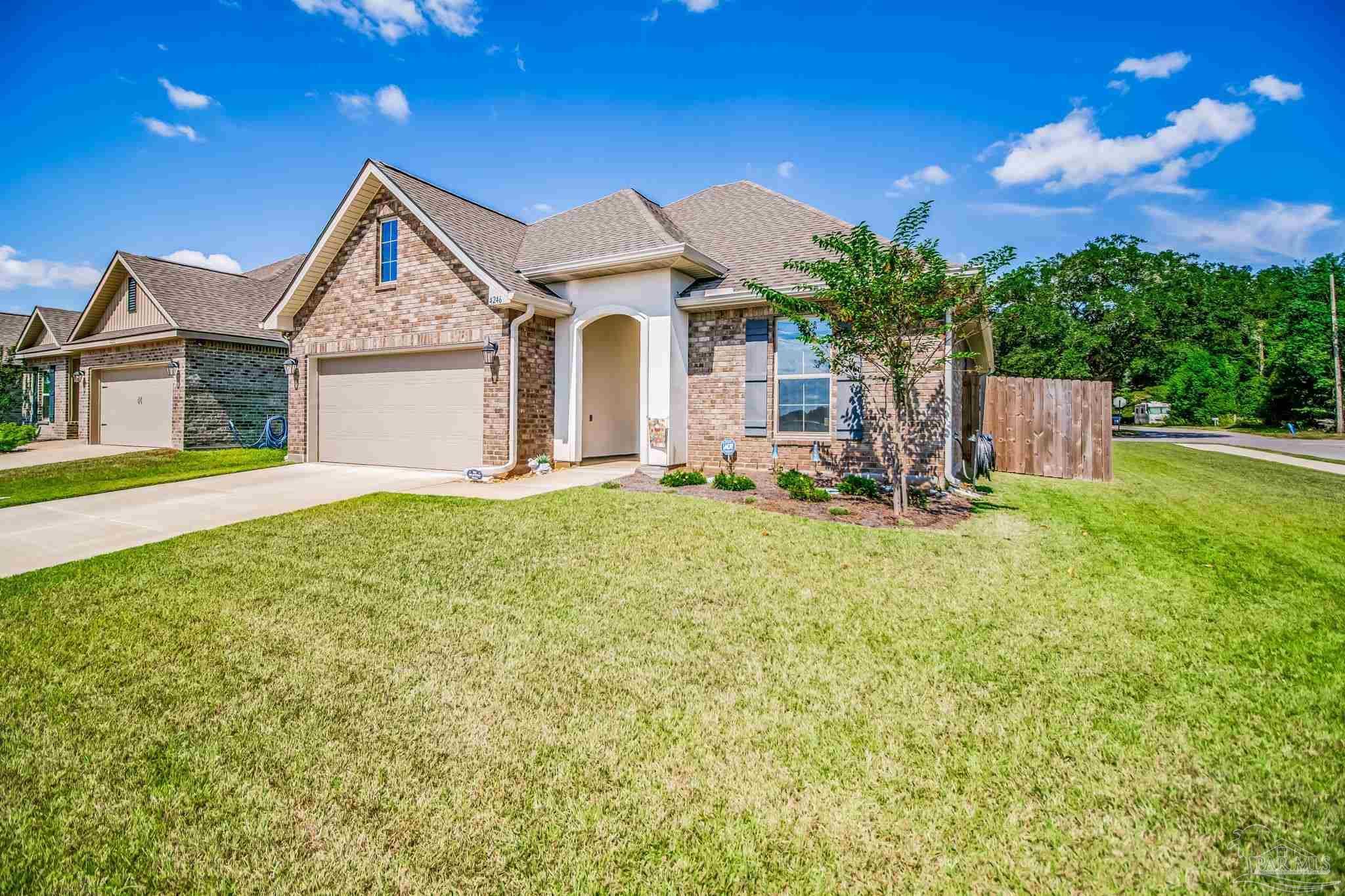 Come see this better-than-new 3 bedroom, 2 bathroom home located on a corner lot in the sought-after Southern Palms community in Pace! As soon as you step inside, you will fall in love with the upgrades and finishes this home has to offer. You’ll be greeted by a spacious foyer that opens into an open-concept living, dining, and kitchen area - complete with luxury vinyl floors, quartz countertops, upgraded cabinetry, and so much more. The corner pantry is another great feature of this home. The bedrooms are spacious, with the master bedroom offering plenty of room for all your furniture. The master bathroom features a double vanity with quartz countertops, framed mirrors, a garden tub/shower combo, a walk-in closet, and more. Don’t forget the large fenced-in backyard with a covered back porch-perfect for cool evening cookouts and game day celebrations! You will love living here, and with all major components (roof, HVAC, etc.) still less than 2 years old, as well as recently installed gutters, you can move in with peace of mind. Schedule your tour today before this one is gone!