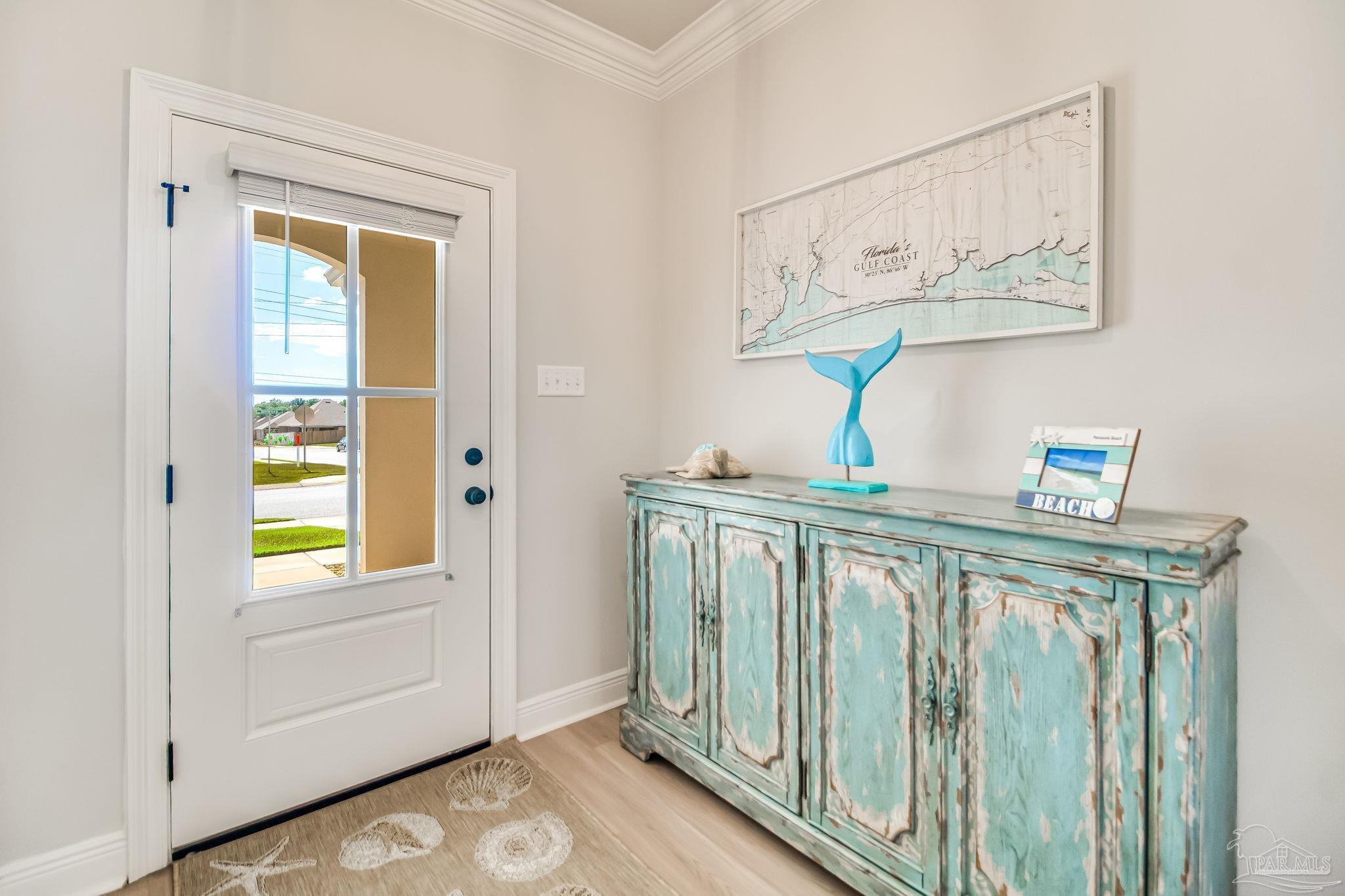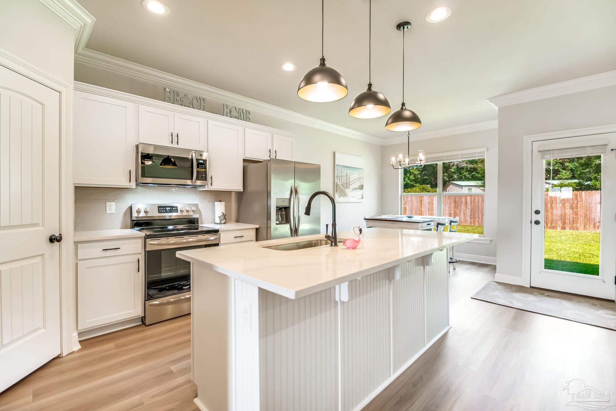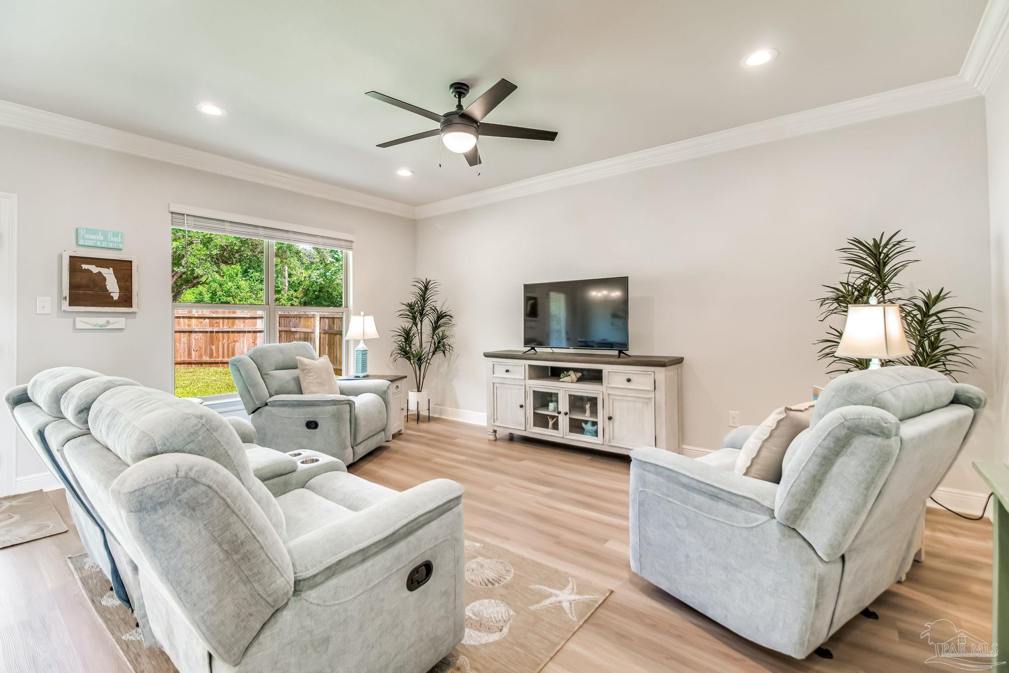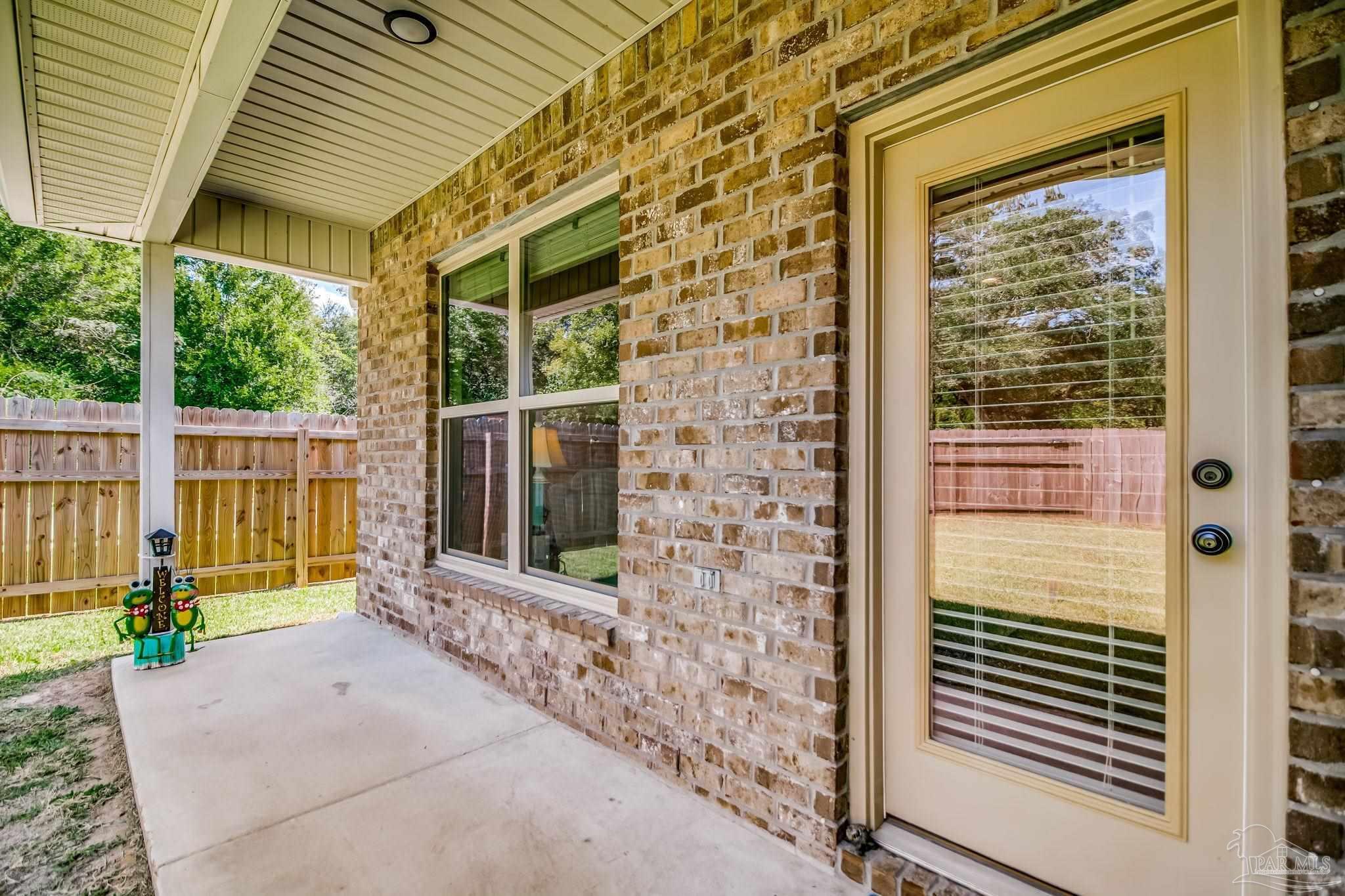 Come see this better-than-new 3 bedroom, 2 bathroom home located on a corner lot in the sought-after Southern Palms community in Pace! As soon as you step inside, you will fall in love with the upgrades and finishes this home has to offer. You’ll be greeted by a spacious foyer that opens into an open-concept living, dining, and kitchen area - complete with luxury vinyl floors, quartz countertops, upgraded cabinetry, and so much more. The corner pantry is another great feature of this home. The bedrooms are spacious, with the master bedroom offering plenty of room for all your furniture. The master bathroom features a double vanity with quartz countertops, framed mirrors, a garden tub/shower combo, a walk-in closet, and more. Don’t forget the large fenced-in backyard with a covered back porch-perfect for cool evening cookouts and game day celebrations! You will love living here, and with all major components (roof, HVAC, etc.) still less than 2 years old, as well as recently installed gutters, you can move in with peace of mind. Schedule your tour today before this one is gone!