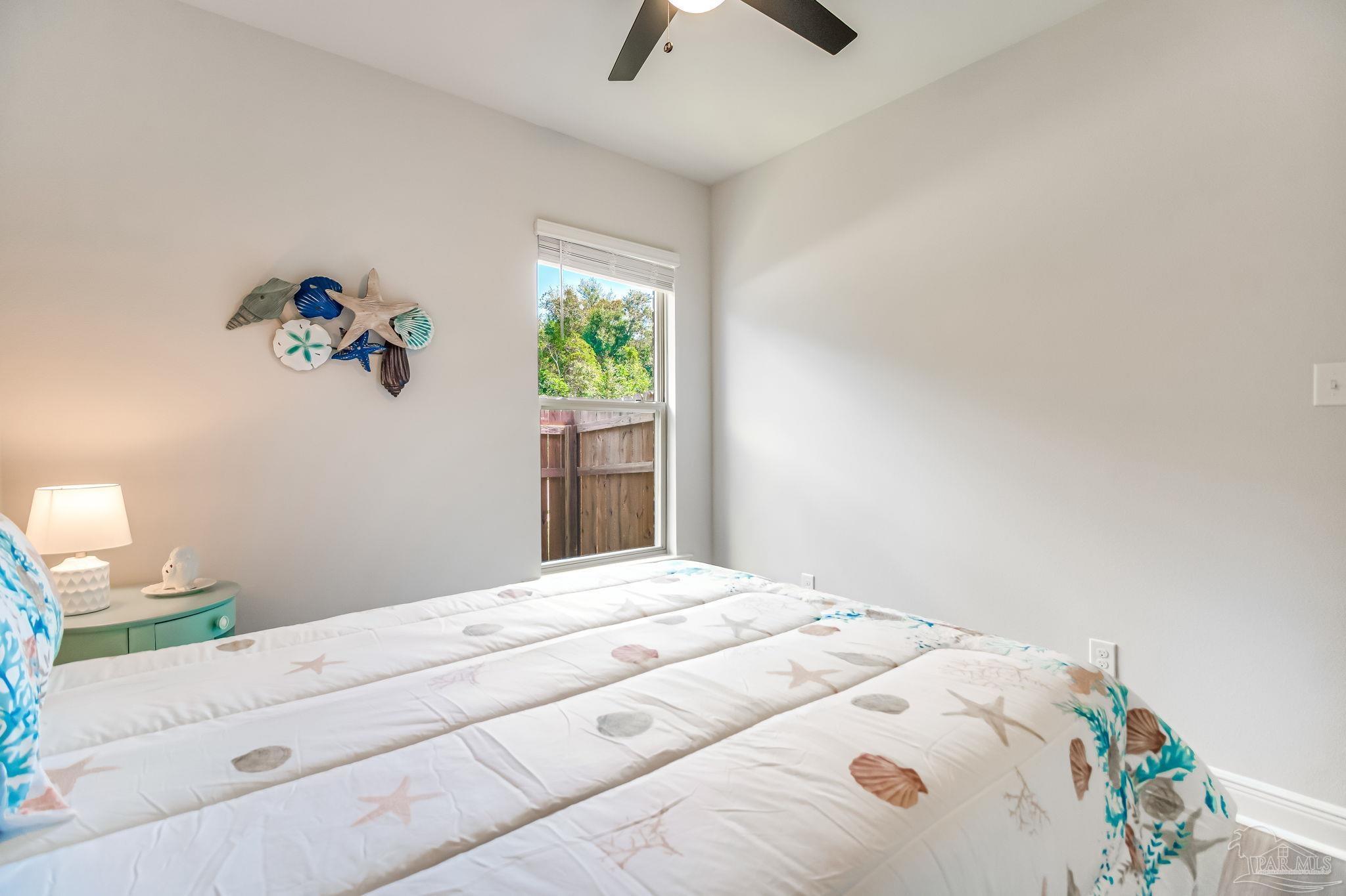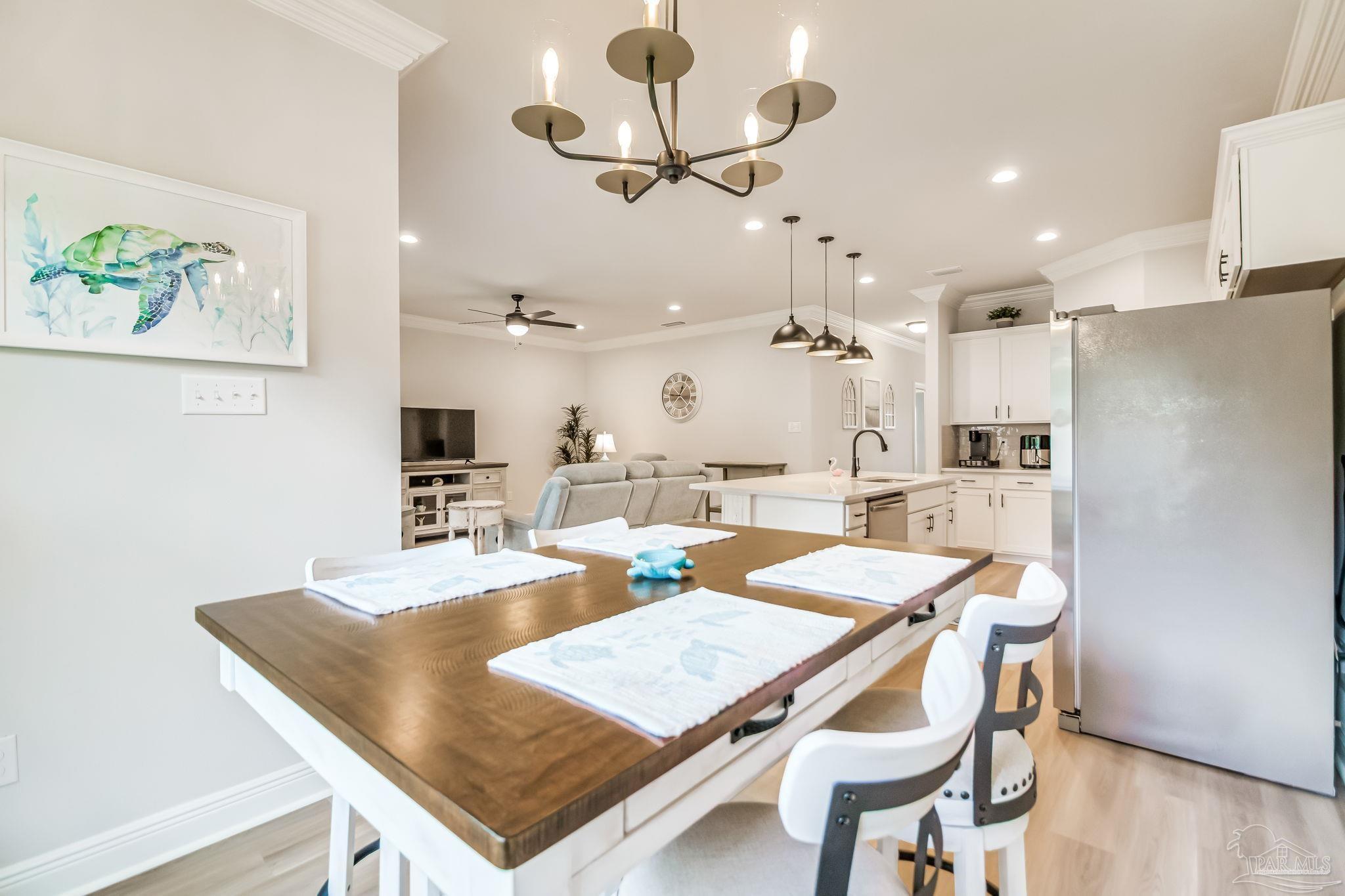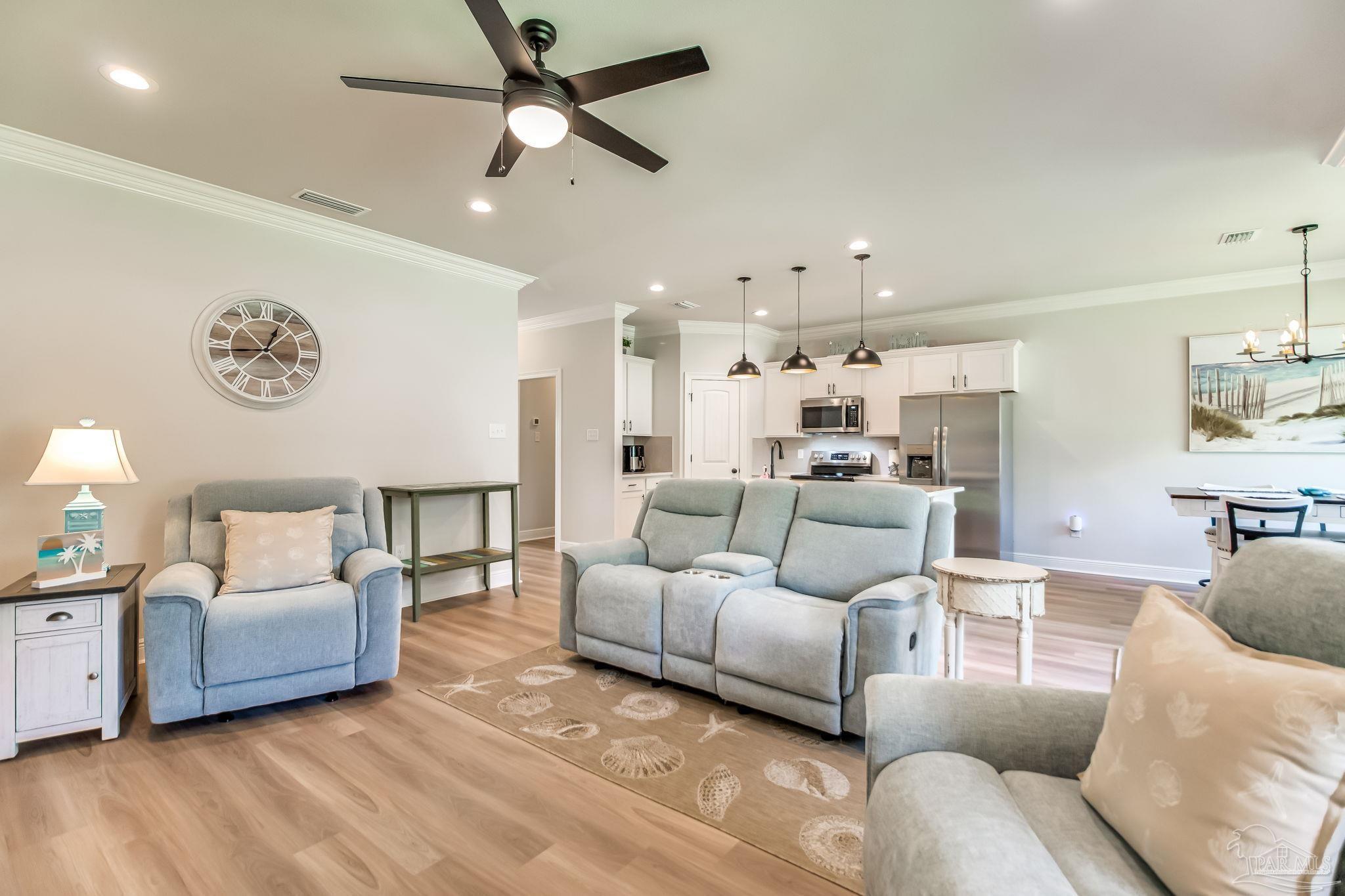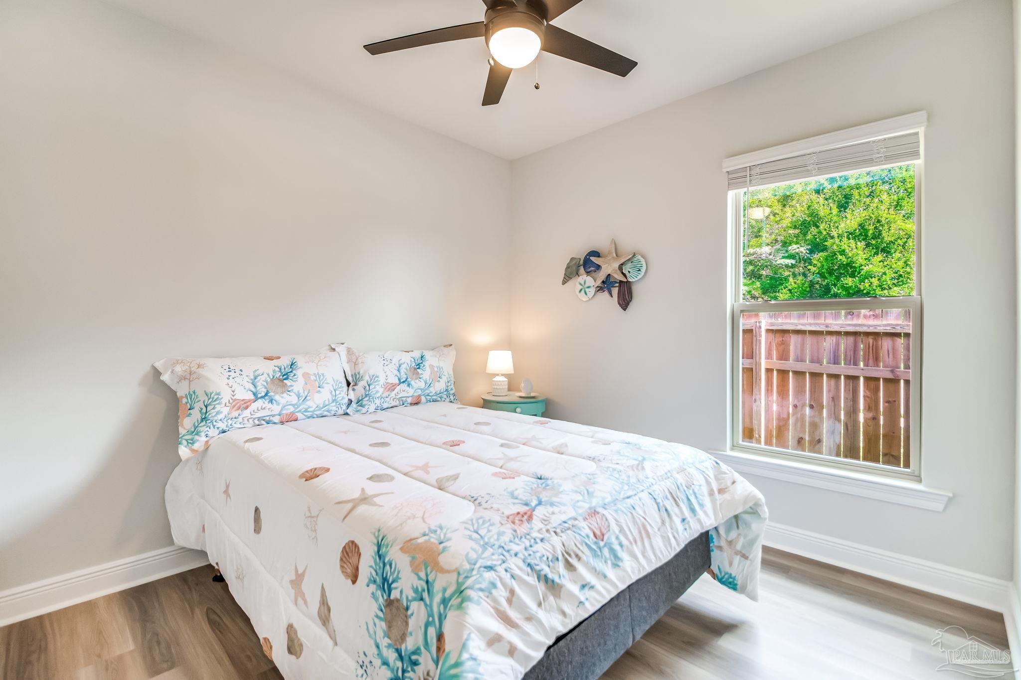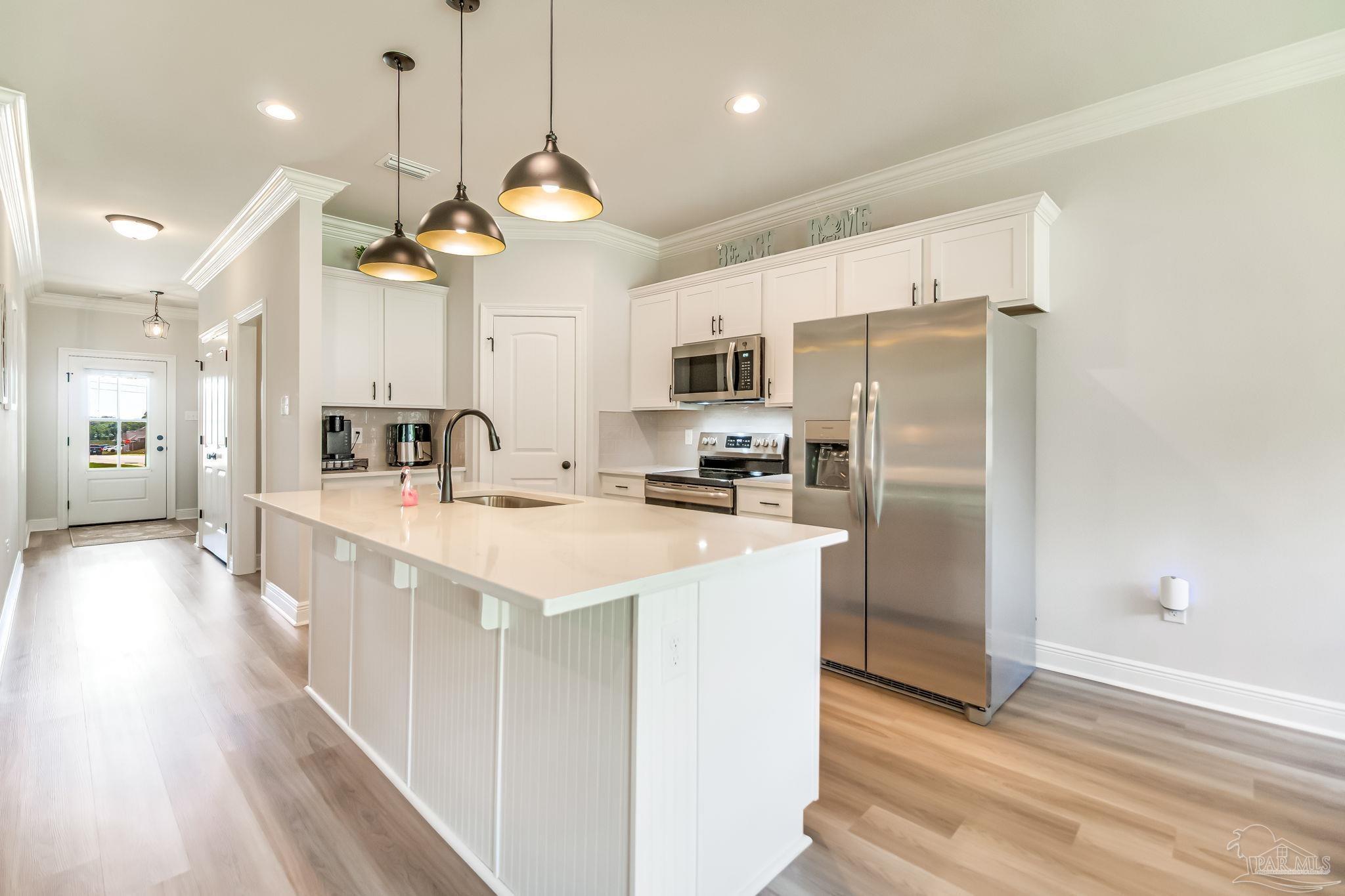 Come see this better-than-new 3 bedroom, 2 bathroom home located on a corner lot in the sought-after Southern Palms community in Pace! As soon as you step inside, you will fall in love with the upgrades and finishes this home has to offer. You’ll be greeted by a spacious foyer that opens into an open-concept living, dining, and kitchen area - complete with luxury vinyl floors, quartz countertops, upgraded cabinetry, and so much more. The corner pantry is another great feature of this home. The bedrooms are spacious, with the master bedroom offering plenty of room for all your furniture. The master bathroom features a double vanity with quartz countertops, framed mirrors, a garden tub/shower combo, a walk-in closet, and more. Don’t forget the large fenced-in backyard with a covered back porch-perfect for cool evening cookouts and game day celebrations! You will love living here, and with all major components (roof, HVAC, etc.) still less than 2 years old, as well as recently installed gutters, you can move in with peace of mind. Schedule your tour today before this one is gone!