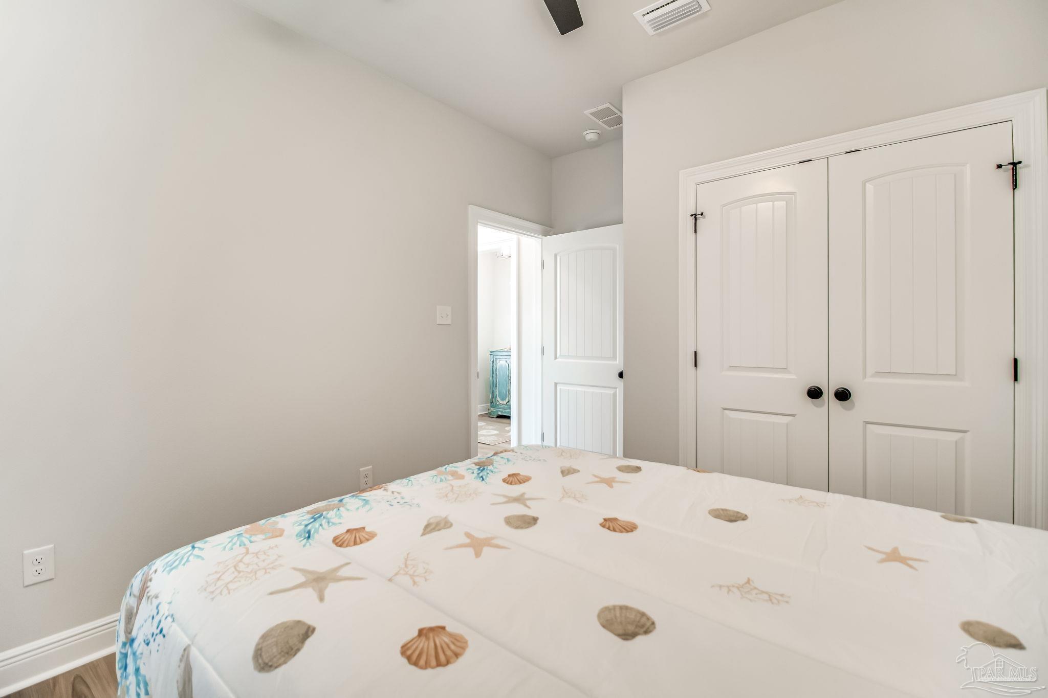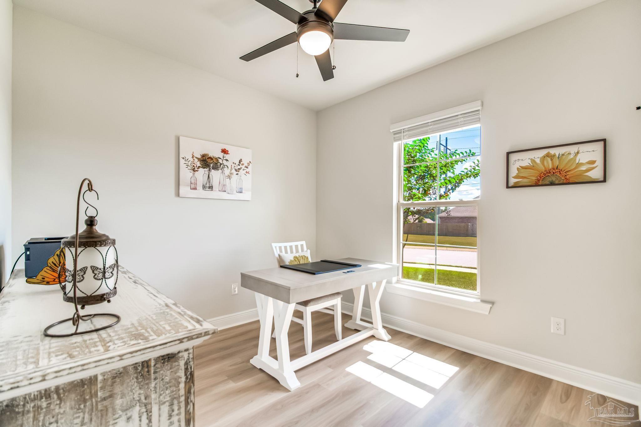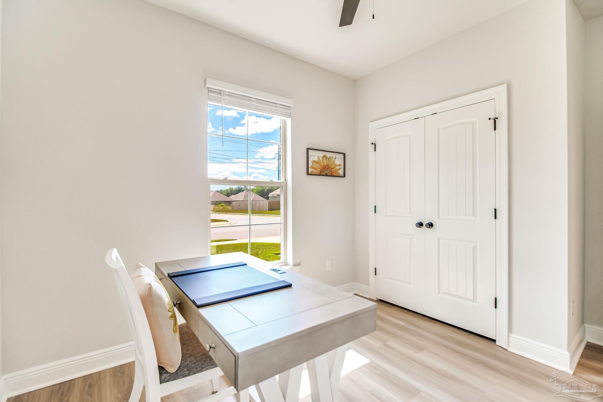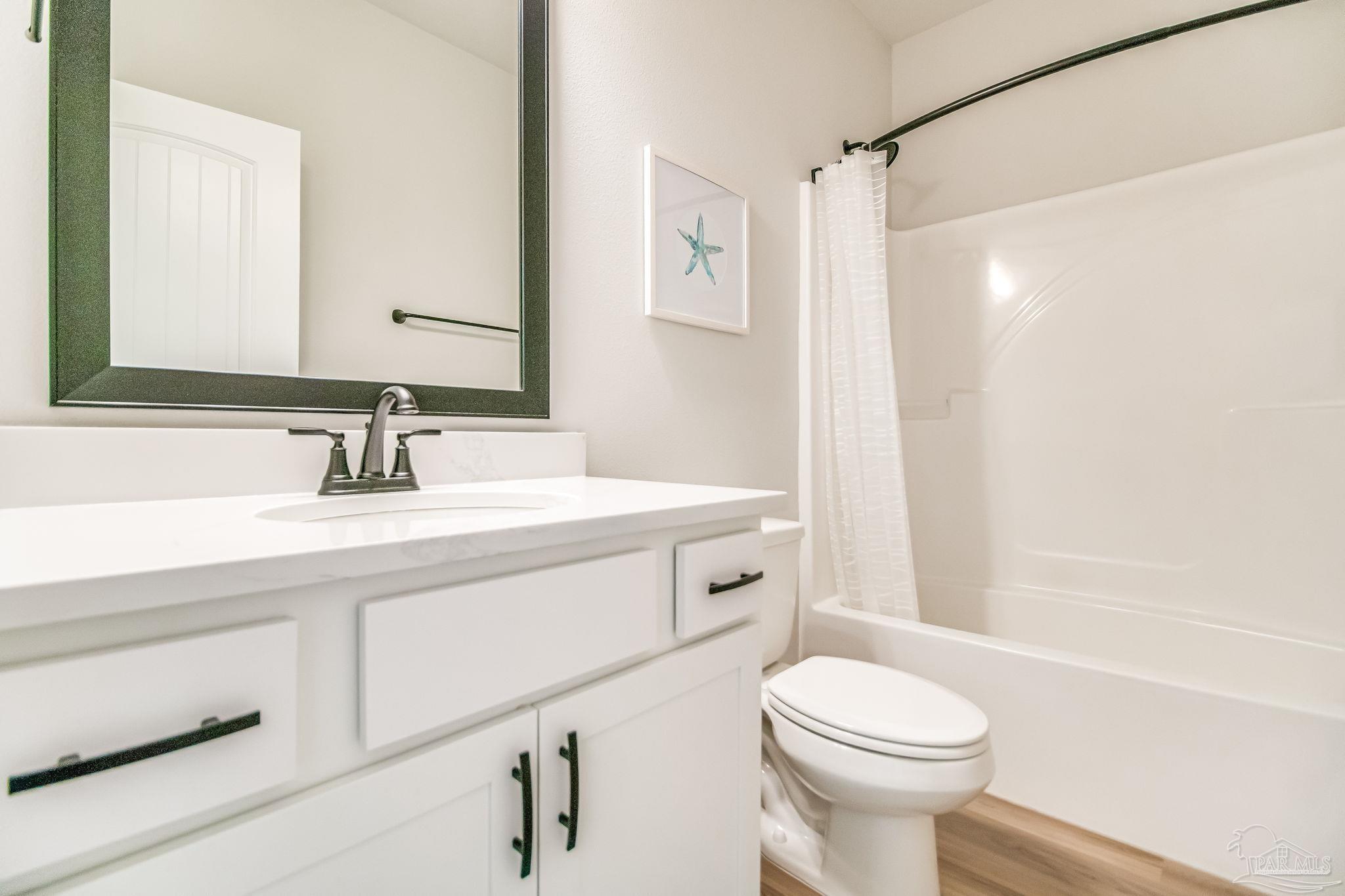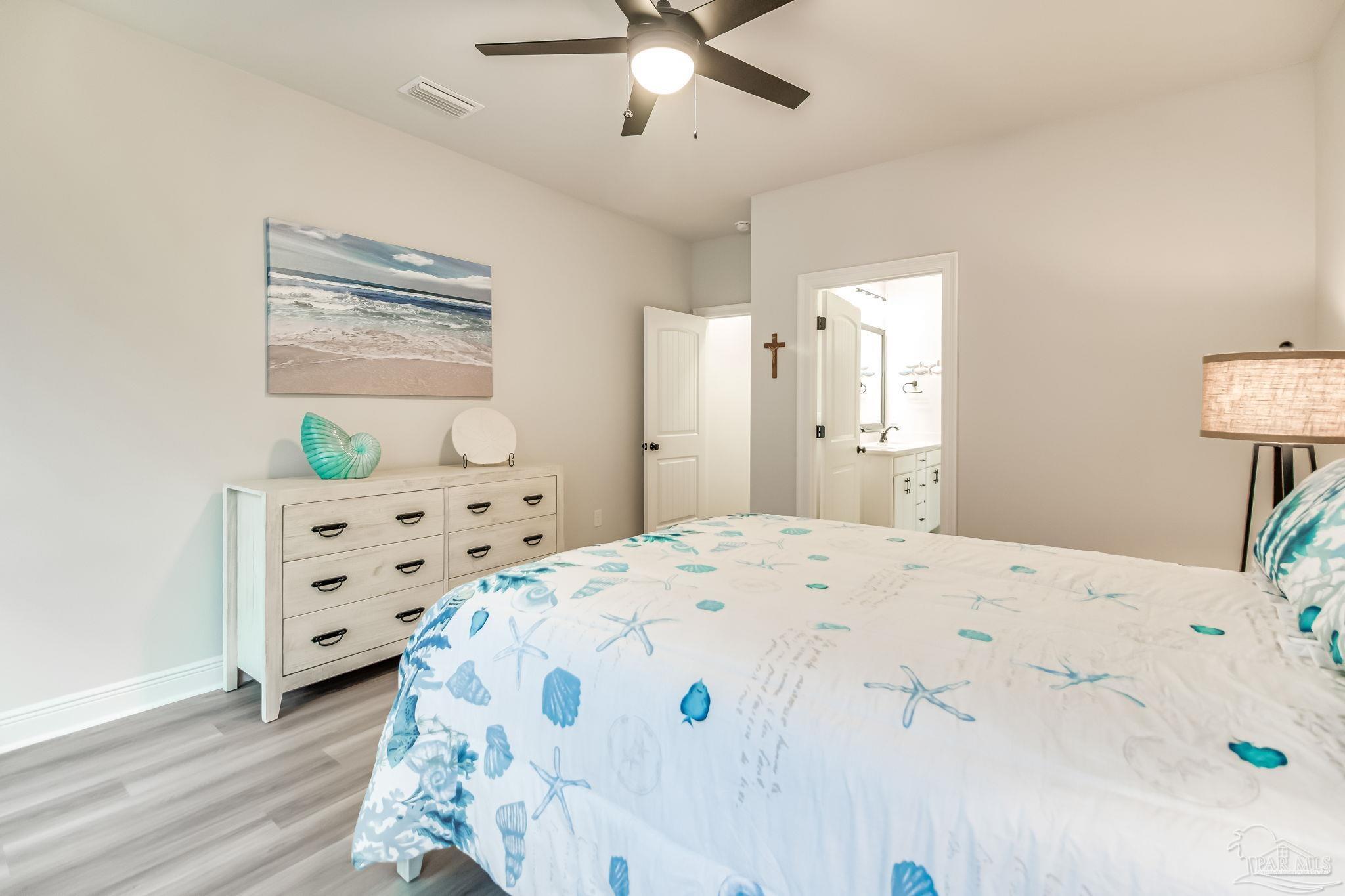 Come see this better-than-new 3 bedroom, 2 bathroom home located on a corner lot in the sought-after Southern Palms community in Pace! As soon as you step inside, you will fall in love with the upgrades and finishes this home has to offer. You’ll be greeted by a spacious foyer that opens into an open-concept living, dining, and kitchen area - complete with luxury vinyl floors, quartz countertops, upgraded cabinetry, and so much more. The corner pantry is another great feature of this home. The bedrooms are spacious, with the master bedroom offering plenty of room for all your furniture. The master bathroom features a double vanity with quartz countertops, framed mirrors, a garden tub/shower combo, a walk-in closet, and more. Don’t forget the large fenced-in backyard with a covered back porch-perfect for cool evening cookouts and game day celebrations! You will love living here, and with all major components (roof, HVAC, etc.) still less than 2 years old, as well as recently installed gutters, you can move in with peace of mind. Schedule your tour today before this one is gone!