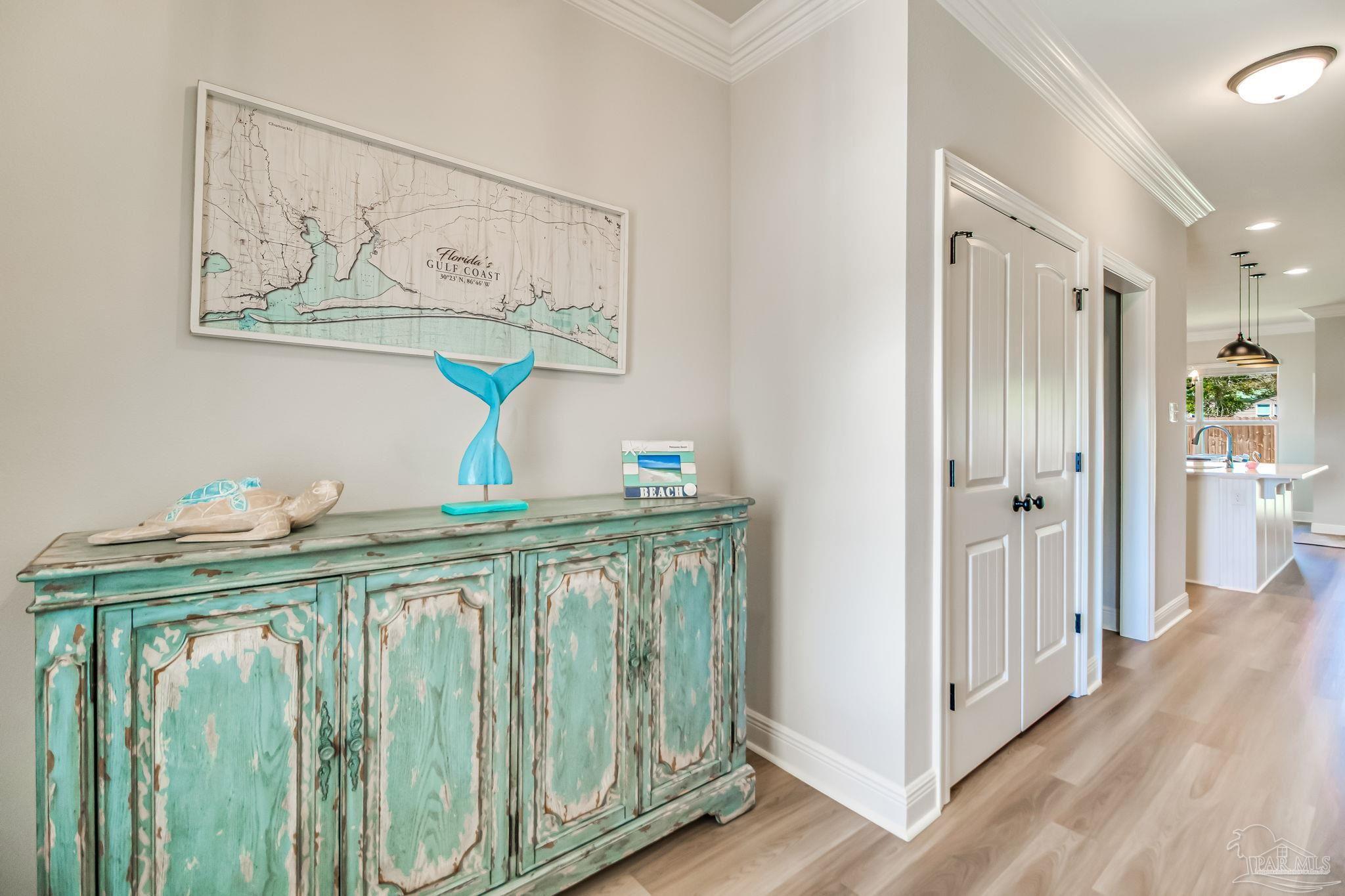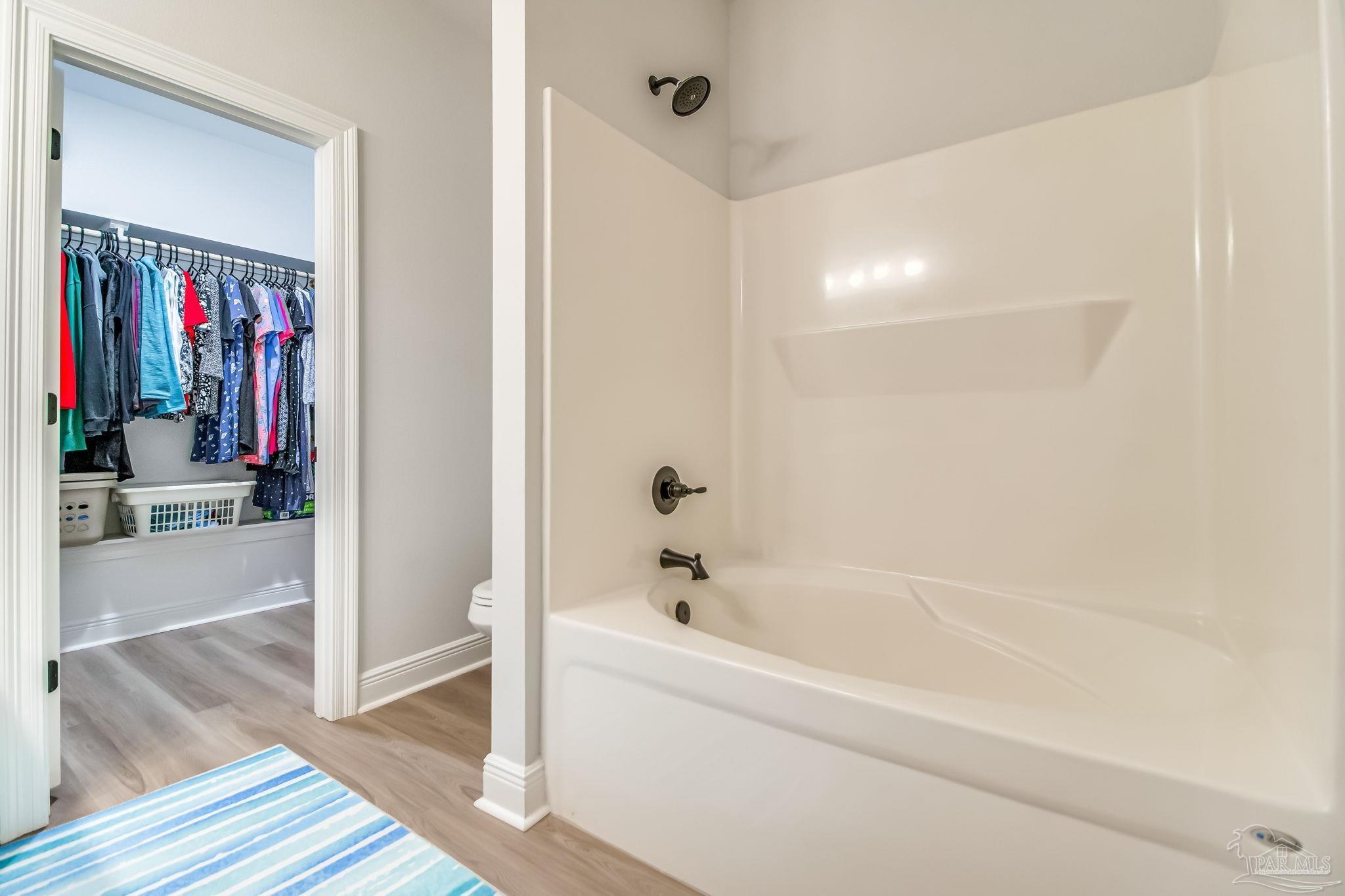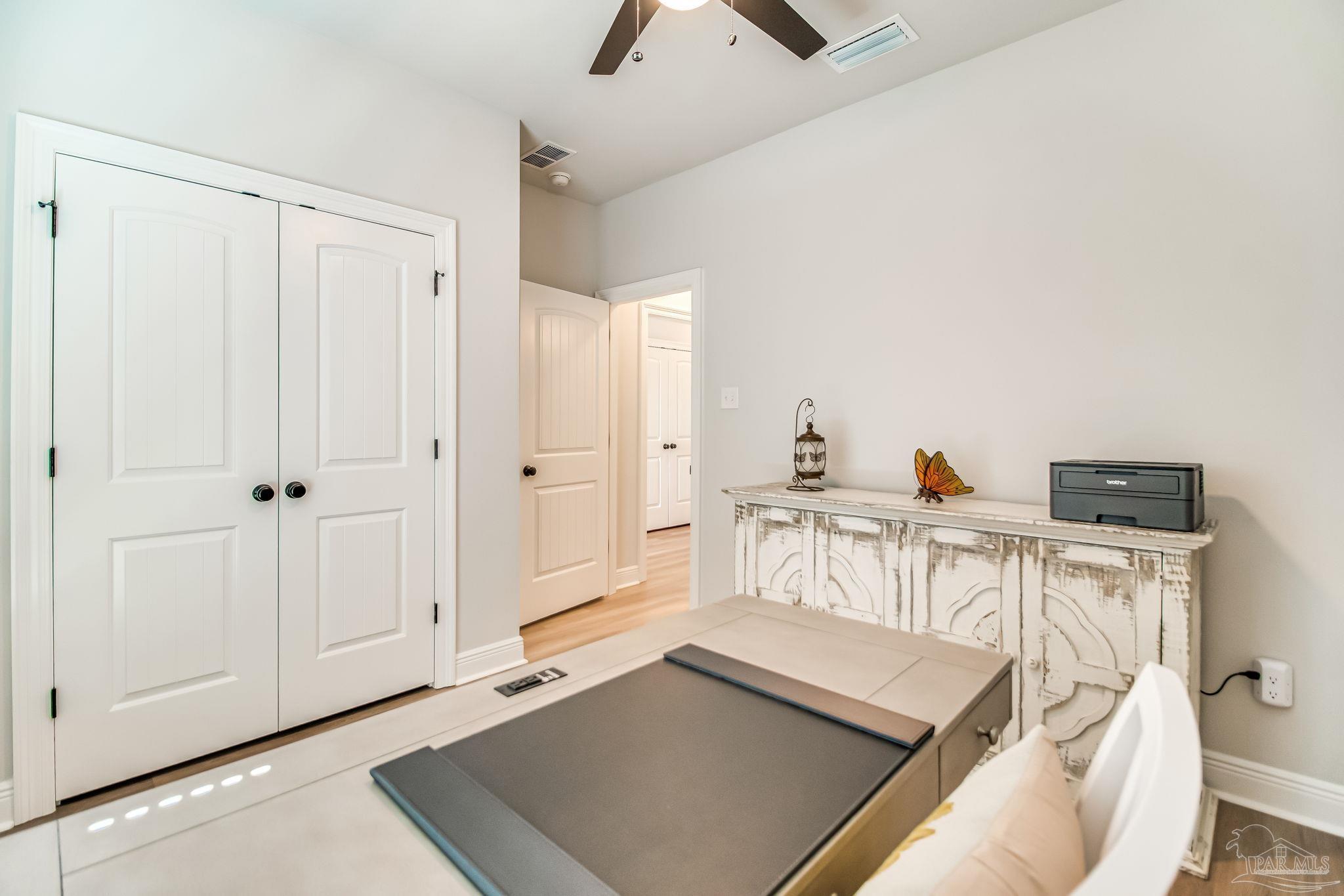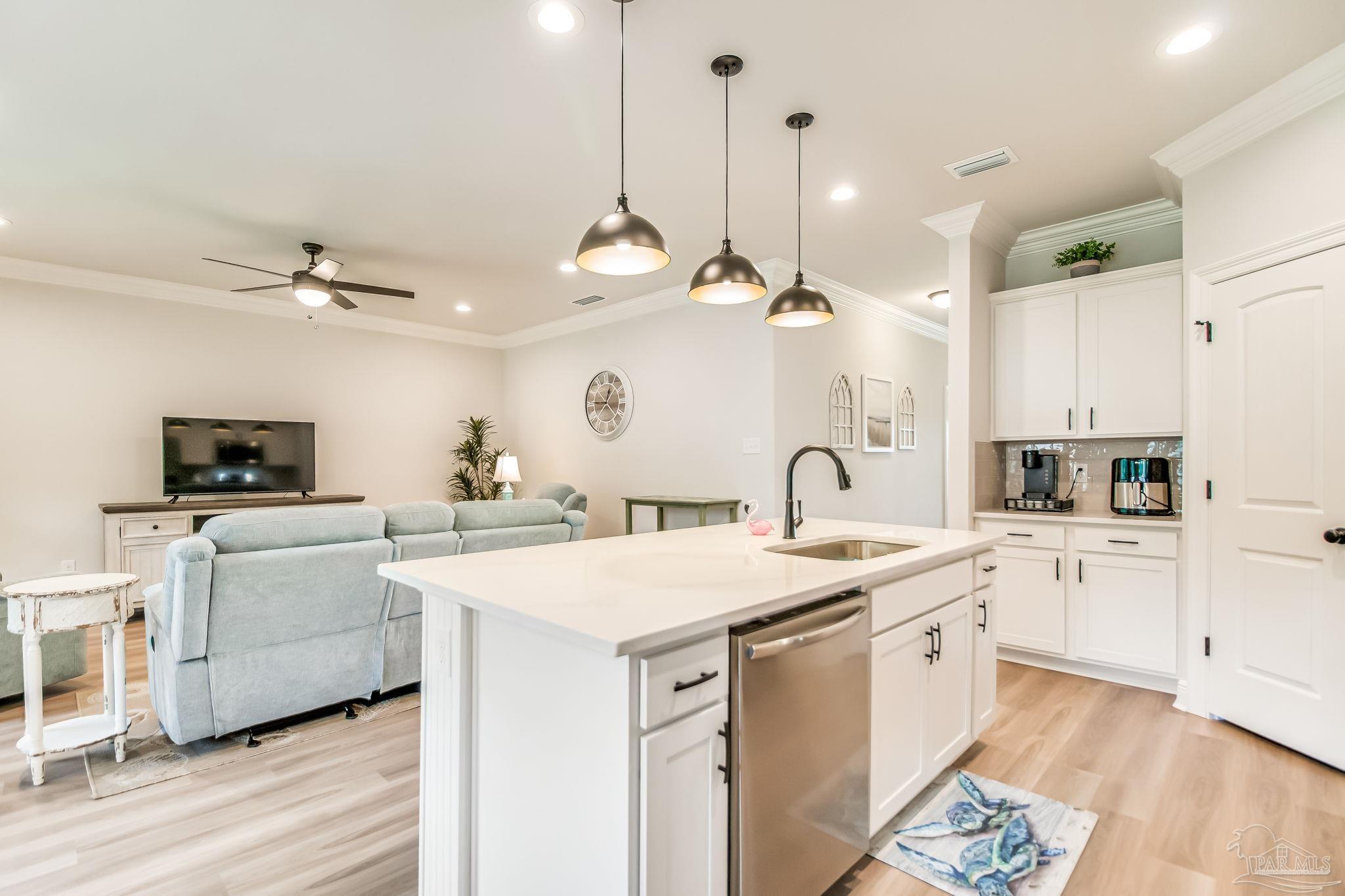 Come see this better-than-new 3 bedroom, 2 bathroom home located on a corner lot in the sought-after Southern Palms community in Pace! As soon as you step inside, you will fall in love with the upgrades and finishes this home has to offer. You’ll be greeted by a spacious foyer that opens into an open-concept living, dining, and kitchen area - complete with luxury vinyl floors, quartz countertops, upgraded cabinetry, and so much more. The corner pantry is another great feature of this home. The bedrooms are spacious, with the master bedroom offering plenty of room for all your furniture. The master bathroom features a double vanity with quartz countertops, framed mirrors, a garden tub/shower combo, a walk-in closet, and more. Don’t forget the large fenced-in backyard with a covered back porch-perfect for cool evening cookouts and game day celebrations! You will love living here, and with all major components (roof, HVAC, etc.) still less than 2 years old, as well as recently installed gutters, you can move in with peace of mind. Schedule your tour today before this one is gone!
