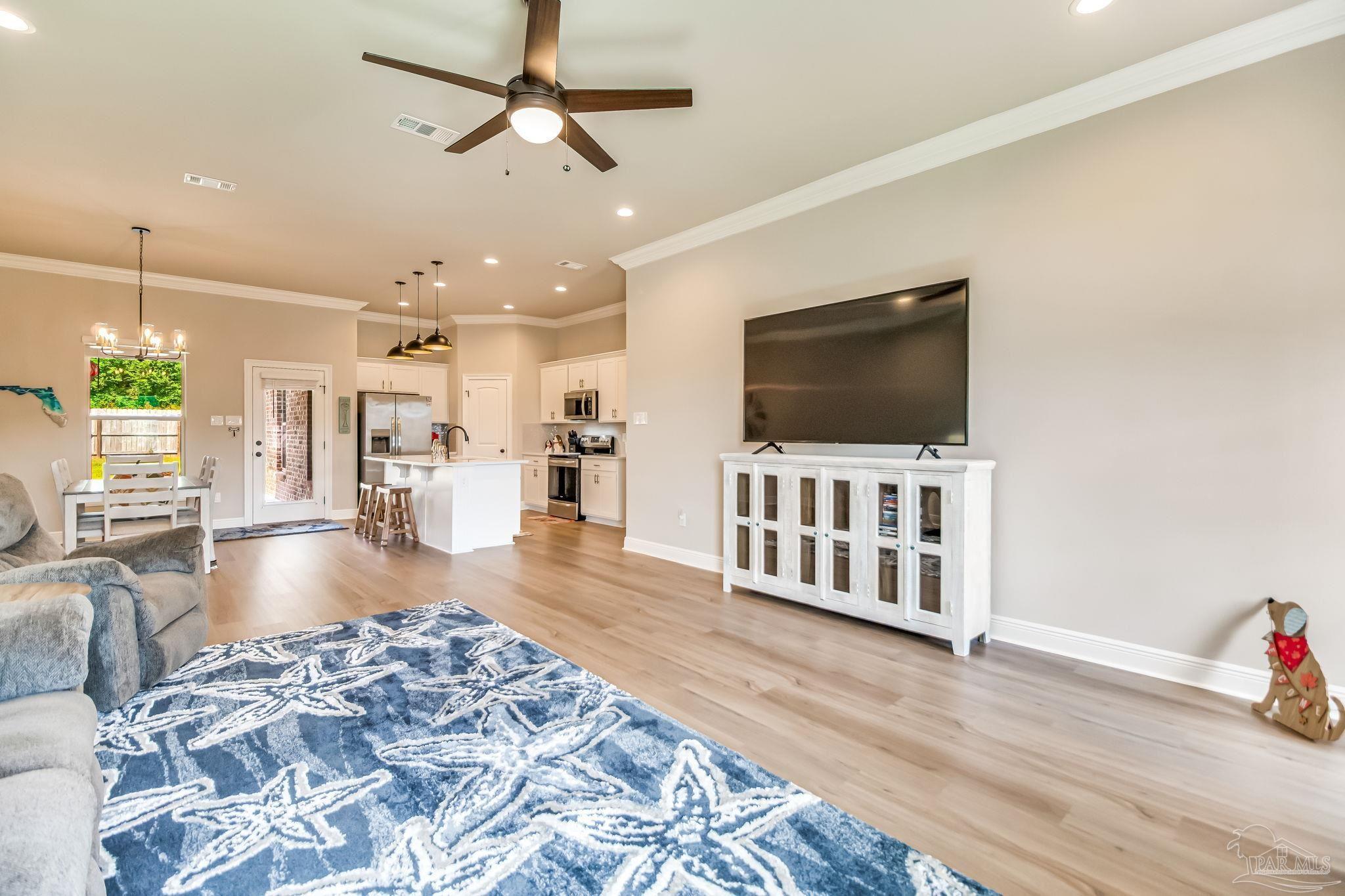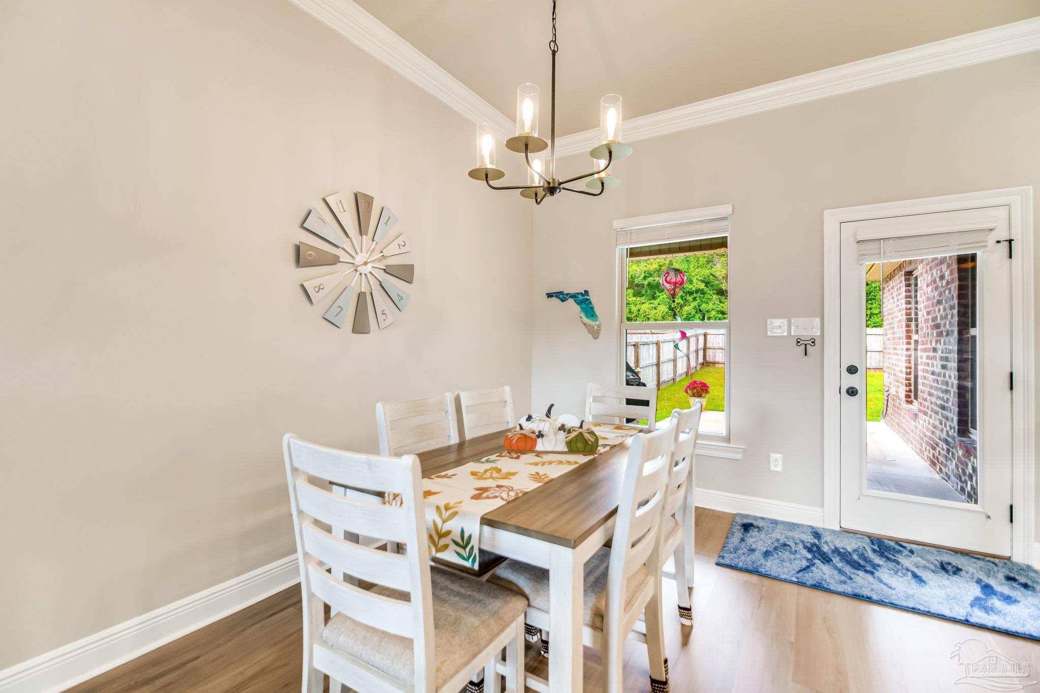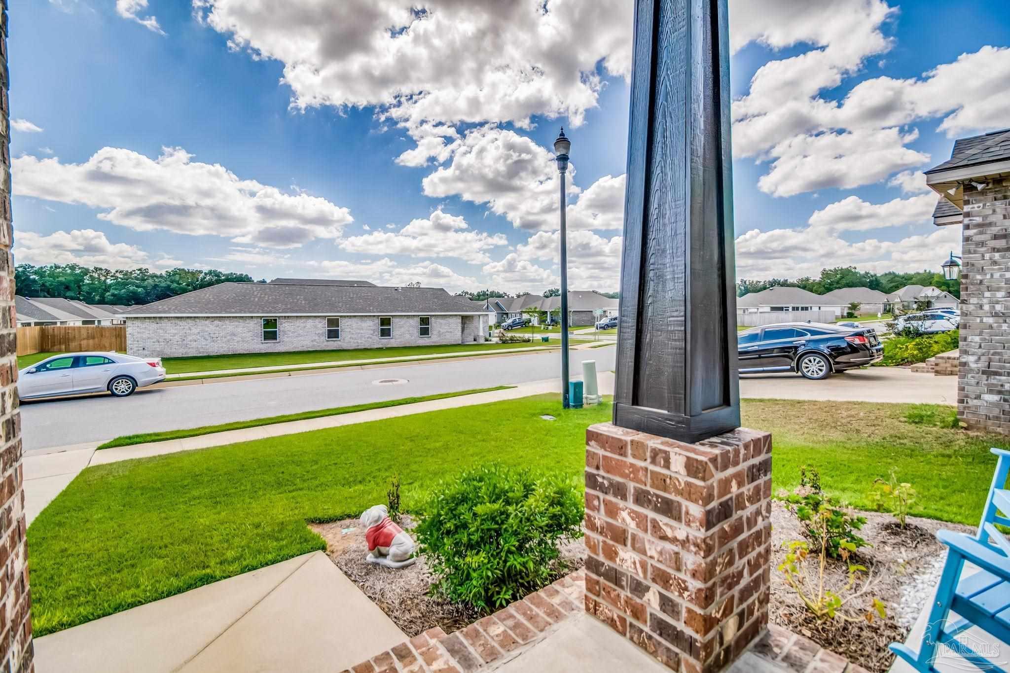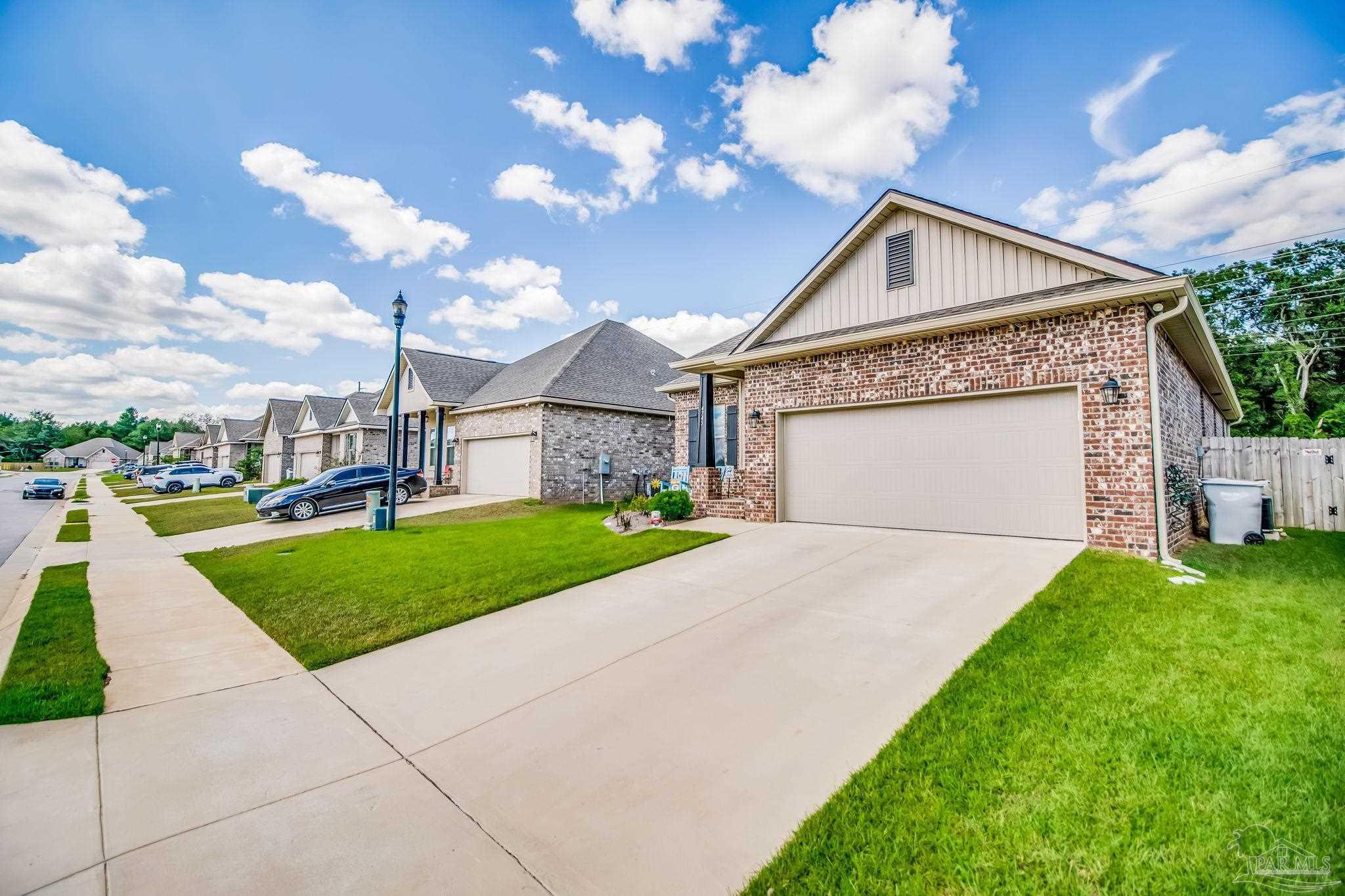 Come see this practically brand new 3 bedroom, 2 bath home located in the sought-after Southern Palms community of Pace! This home features an open design, plenty of upgrades and beautiful finishes. When you step inside you will love the open concept and upgrades throughout! The living room and eat in kitchen are open and feature luxury vinyl plank flooring, upgraded quartz countertops, designer cabinetry and more! The bedrooms are very spacious. The master bedroom features plenty of room for your furniture as well as a large walk in closet that you will love! The master bathroom features a double vanity, a large garden tub and a separate enclosed shower. The backyard is spacious, completely fenced in and features a covered back porch which is perfect for those cool evening cookouts. You will enjoy living in this immaculate home! All major components such as roof, HVAC etc are still less than 2 years old, as well as recently installed gutters. Washer and dryer do convey. Schedule your tour today to make this your new home!