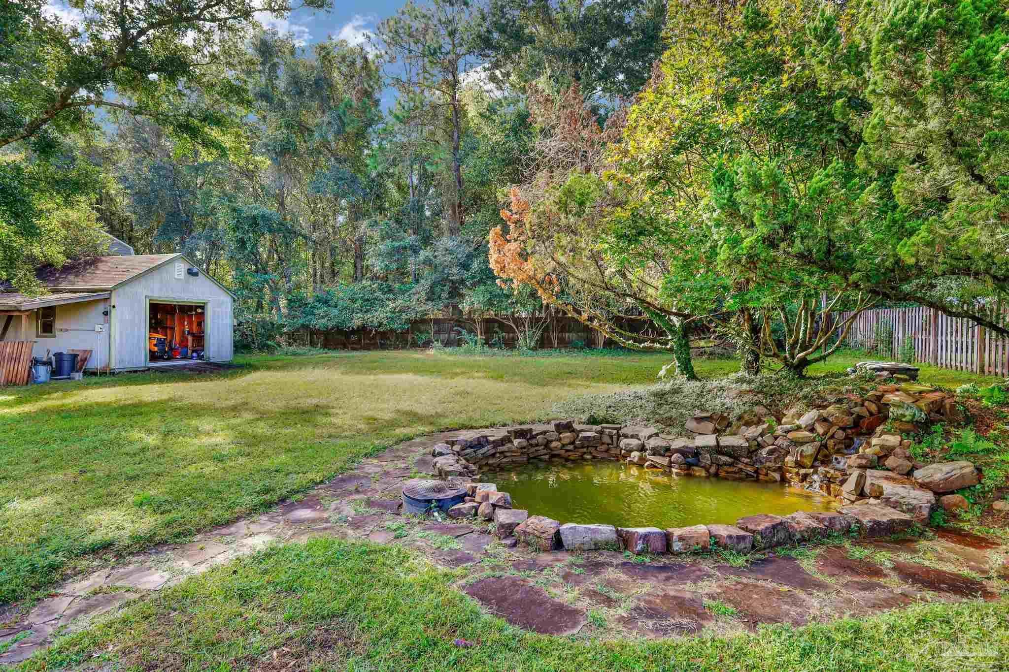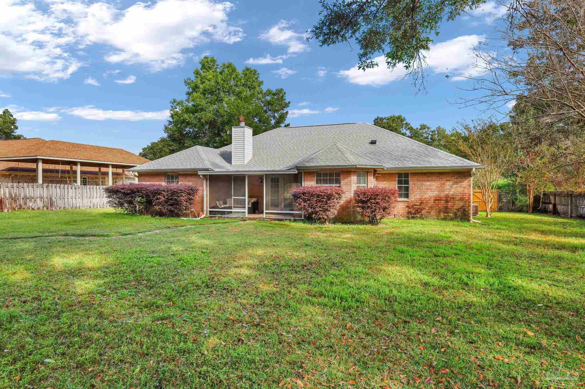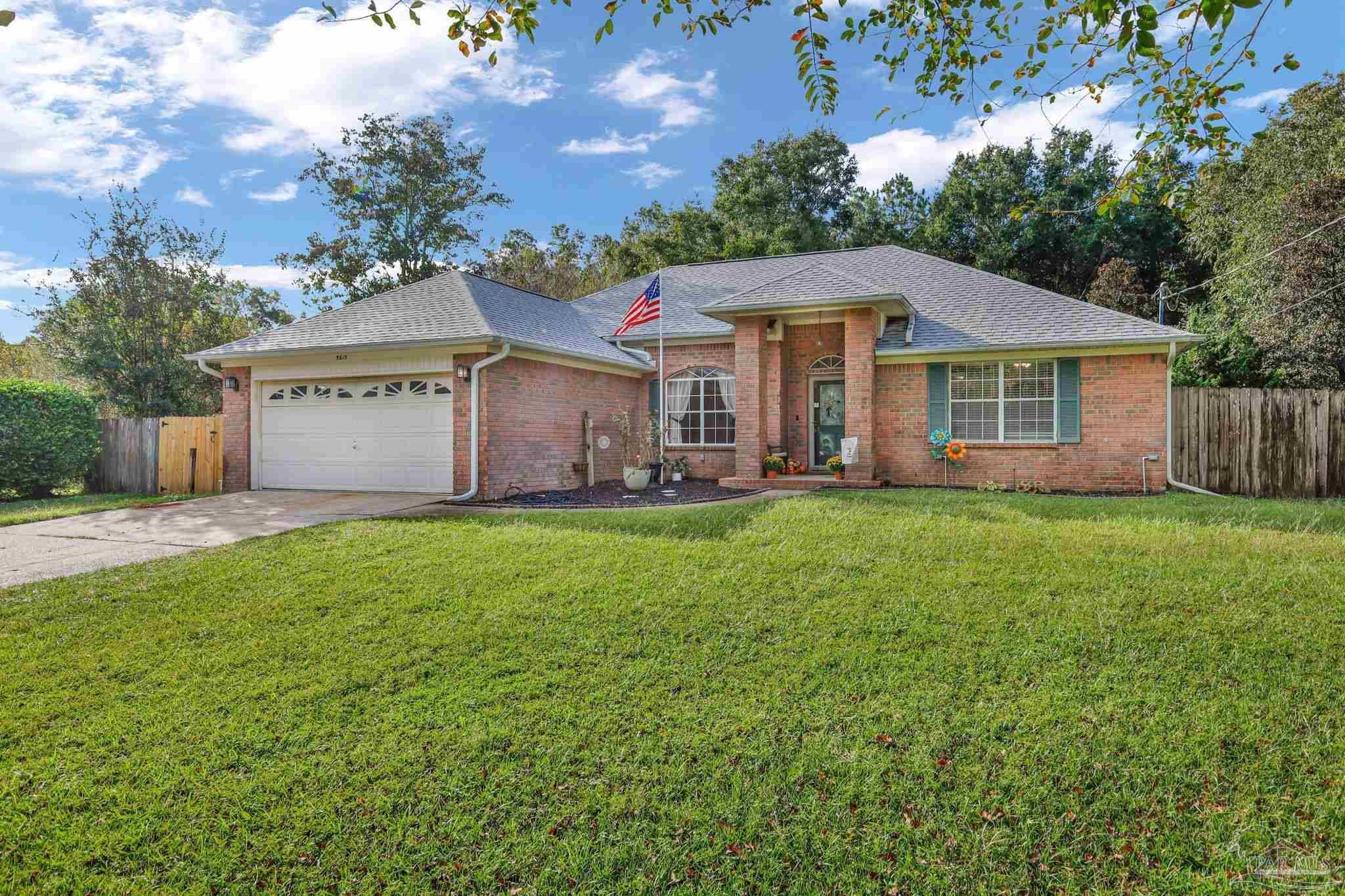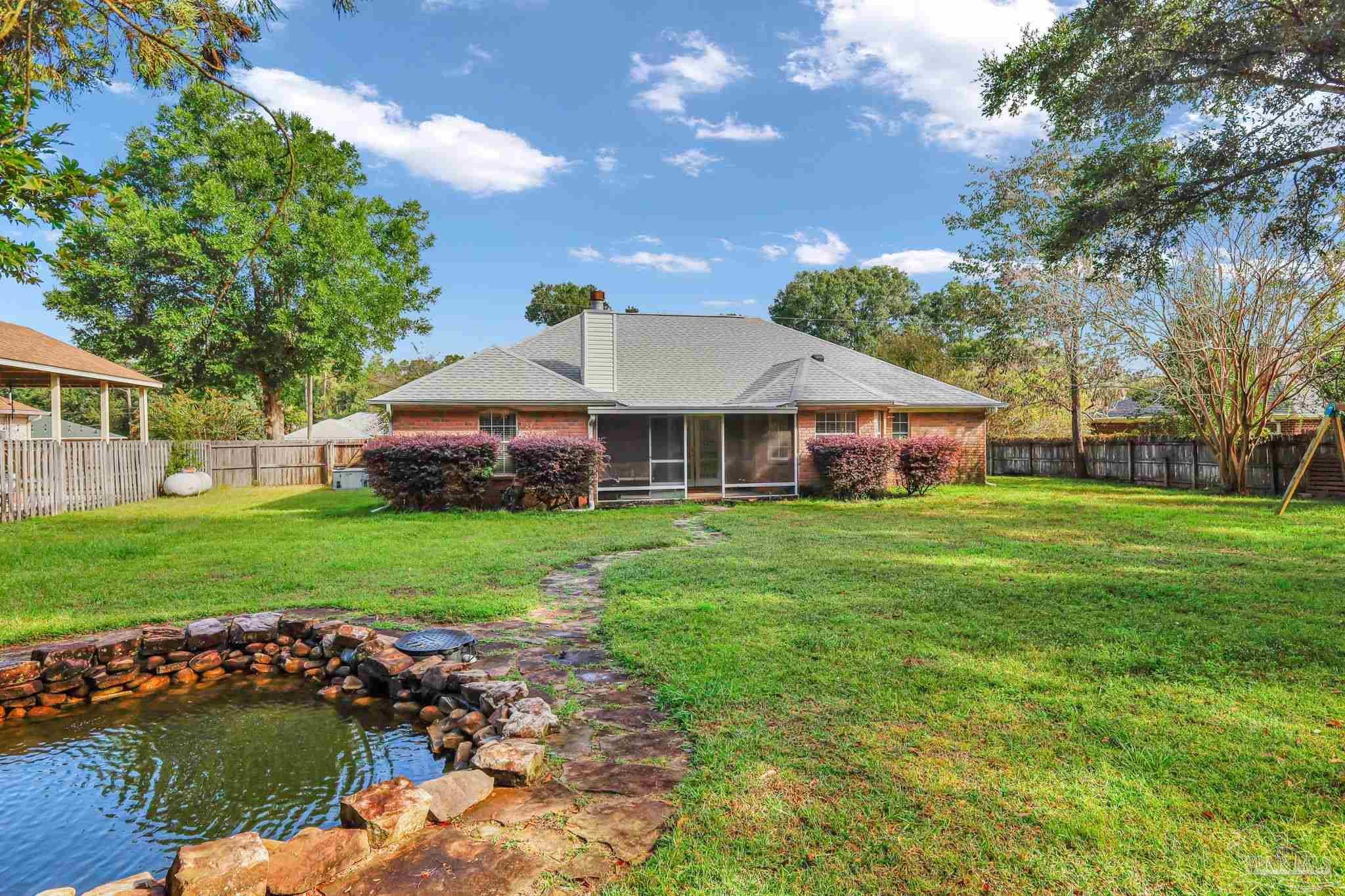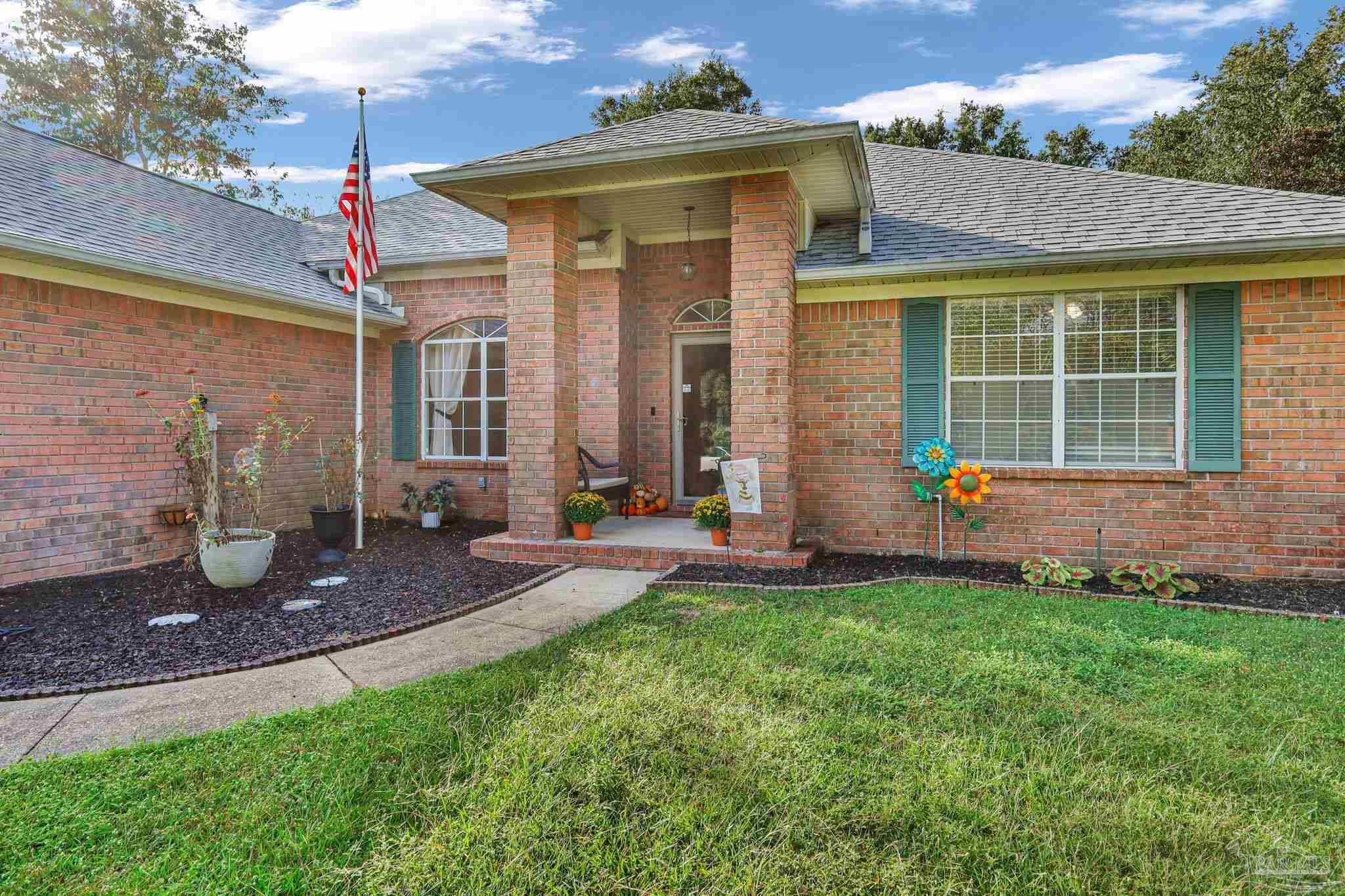 OPEN HOUSE! This Sunday, November 9 from 1:00-3:00 pm. Welcome Home to Pace where you’ll find space, comfort, and style! Set on a generous half-acre lot, this full-brick 4-bedroom, 2-bathroom home blends timeless craftsmanship with modern convenience. From the moment you arrive, the grand covered porch invites you to come in. The storm door adds another element of surprise and a lasting first impression as you enter in to a tiled foyer. Step inside to an inviting open-concept split floor plan with tiled foyer, cathedral ceilings, and a cozy fireplace with electric insert—perfect for relaxing evenings. The kitchen is the heart of the home, featuring a bay window breakfast nook, hop-up bar for extra seating, and stainless steel appliances including the refrigerator, stove, dishwasher, and microwave. Additional flex space could be an office, sitting area, playroom or even a formal dining space. The large main suite offers a true retreat with a tray ceiling, two windows and ceiling fan. Great setup for this en-suite bathroom includes two walk in closets, double sinks, a separate shower, private water closet, and a jetted garden tub for ultimate relaxation. 3 more bedrooms and guest bath with shower/tub combo, single sink and linen closet are split on the opposite side. Step through the French doors to your screened patio, overlooking a deep backyard oasis complete with a koi pond and waterfall—a peaceful place to unwind or entertain. The 16x16 powered workshop with roll-up door and lean-to adds versatility for hobbies, storage, or projects. Additional highlights include a 2-car garage with opener, whole-house gutters, and a new roof (July 2022) for peace of mind. Sprinkler system conveys as is. This home has been lovingly maintained and thoughtfully designed for everyday comfort and entertaining. Schedule your showing today to take advantage of this fantastic property! You’re going to love the neighborhood of Whispering Woods!