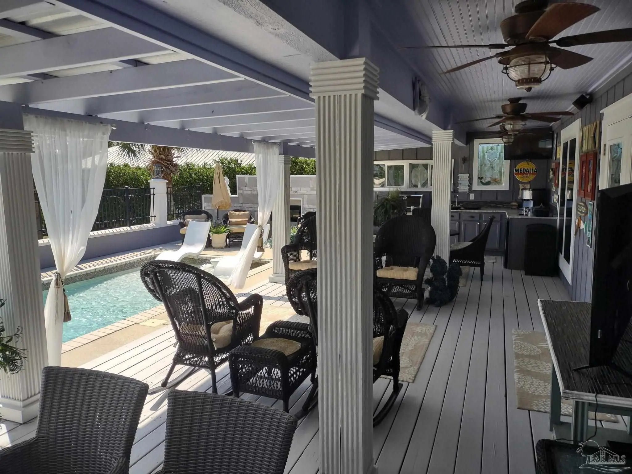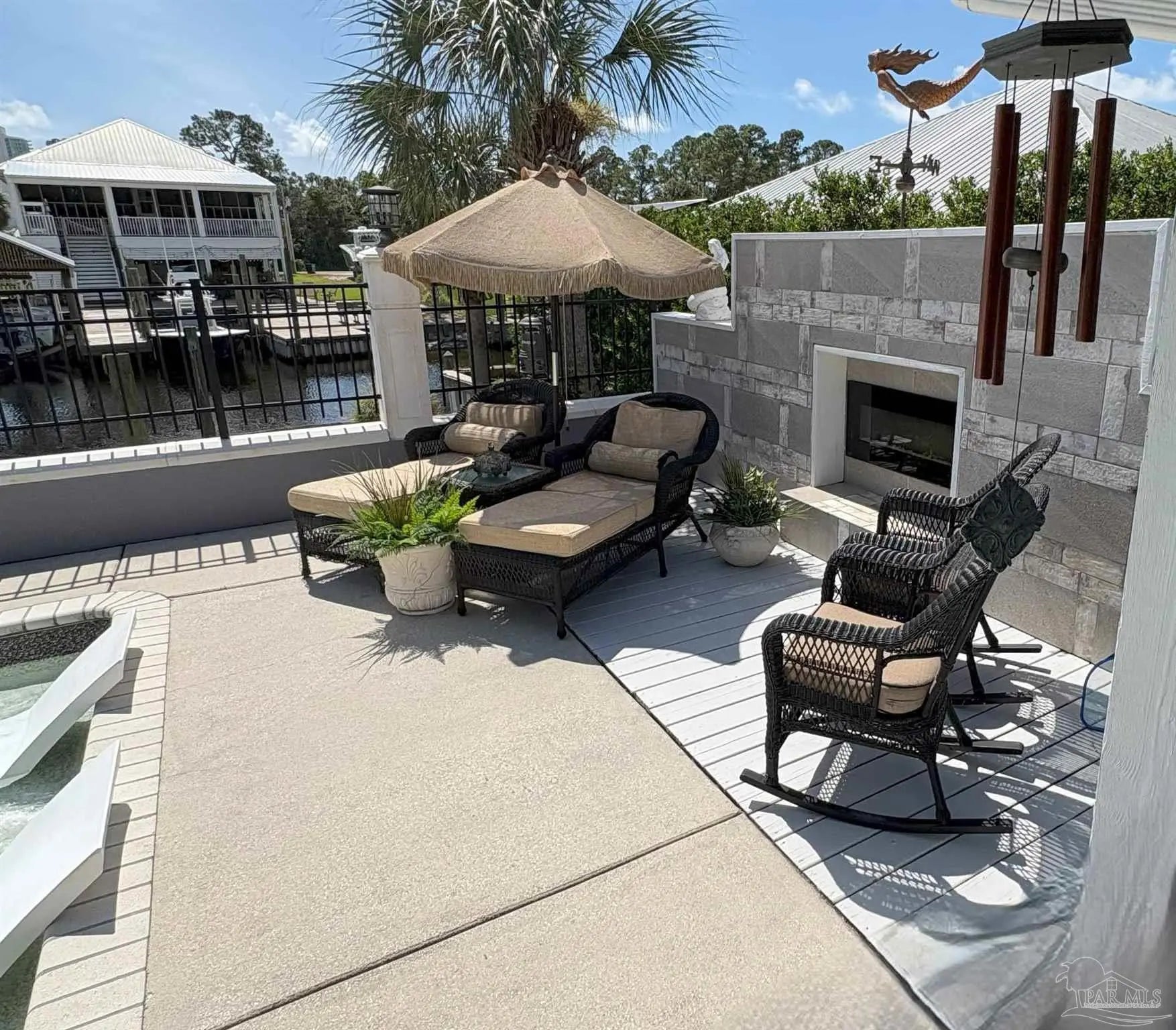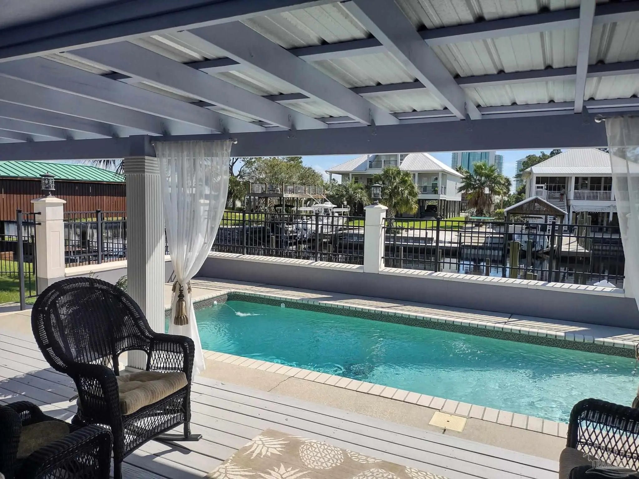 Boat Slip + Pool Home | No Flooding History | 80’ Protected Canal | Turnkey Furnished *Enjoy effortless waterfront living on sought-after Marina Road. This beautifully remodeled and expanded home offers 80 feet of protected canal frontage with a private boat slip—perfect for coastal living. *Designed for comfort and peace of mind, the home has remained high and dry through major storms including Opal, Ivan, and Sally. No pilings, steps, or stairs, provides true single-level living with easy access throughout. *An impressive 8-foot entry door opens to a welcoming foyer and dedicated dining area with porcelain tile flooring. The home features 5 spacious bedrooms, 2 full baths, 10-foot ceilings, crown molding, and abundant natural light & Southern Exposure The expansive 37’ x 16’ great room is ideal for entertaining, complete with a custom bar, ice maker, refrigerator, wet bar, and extensive cabinetry. The chef’s kitchen includes GE Monogram and Café appliances, double-drawer dishwasher and refrigerator, built-in oven, microwave, and cooktop. *The primary suite offers a large walk-in closet with custom built-ins and a spa-like bath with double vanity and clawfoot tub. A flexible bonus room (10’ x 12’) can serve as an office, media room, or 6th bedroom. *Outdoor living shines with a 41’ x 15’ covered porch, full outdoor kitchen, multiple dining areas, saltwater pool with tanning ledge, fireplace, and conversation pit. Fenced backyard includes an irrigation well system. *1,400 sq ft climate-controlled Garage fits 3+ vehicles, golf cart storage, built-ins, and a floored attic. *Additional features include Hurricane-rated windows and doors, generator transfer switch, and upgrades throughout. Offered turnkey furnished (with exceptions). Buyer to verify all information during due diligence.