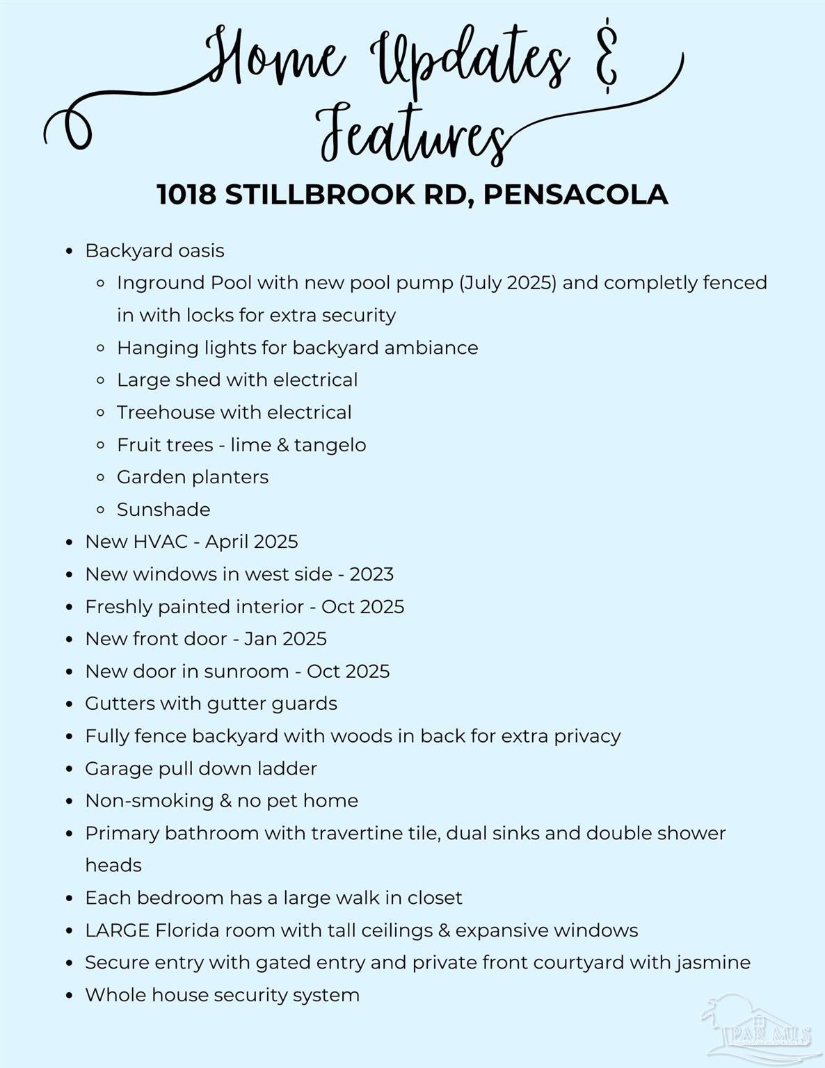 OPEN HOUSE Sat 12/6 from 1-3pm - Still time to close before the end of the year! $10,000 SELLER CONCESSION plus a NEW ROOF with acceptable offer closing in 2025. This 3BR / 2BA, 2,200 sq. ft. home in Carrollwood features a gated inground POOL, large Florida room, and a fenced backyard with fruit trees, patio shade, shed, and treehouse — all backing to woods for privacy. The kitchen offers granite countertops and ample storage, while the primary suite includes dual sinks, dual shower heads, and a walk-in closet. Recent updates: new HVAC (2025), new pool pump (2025), and fresh interior paint. Convenient to Gulf Breeze, Pensacola Beach, hospitals, I-10, UWF, and local dining.