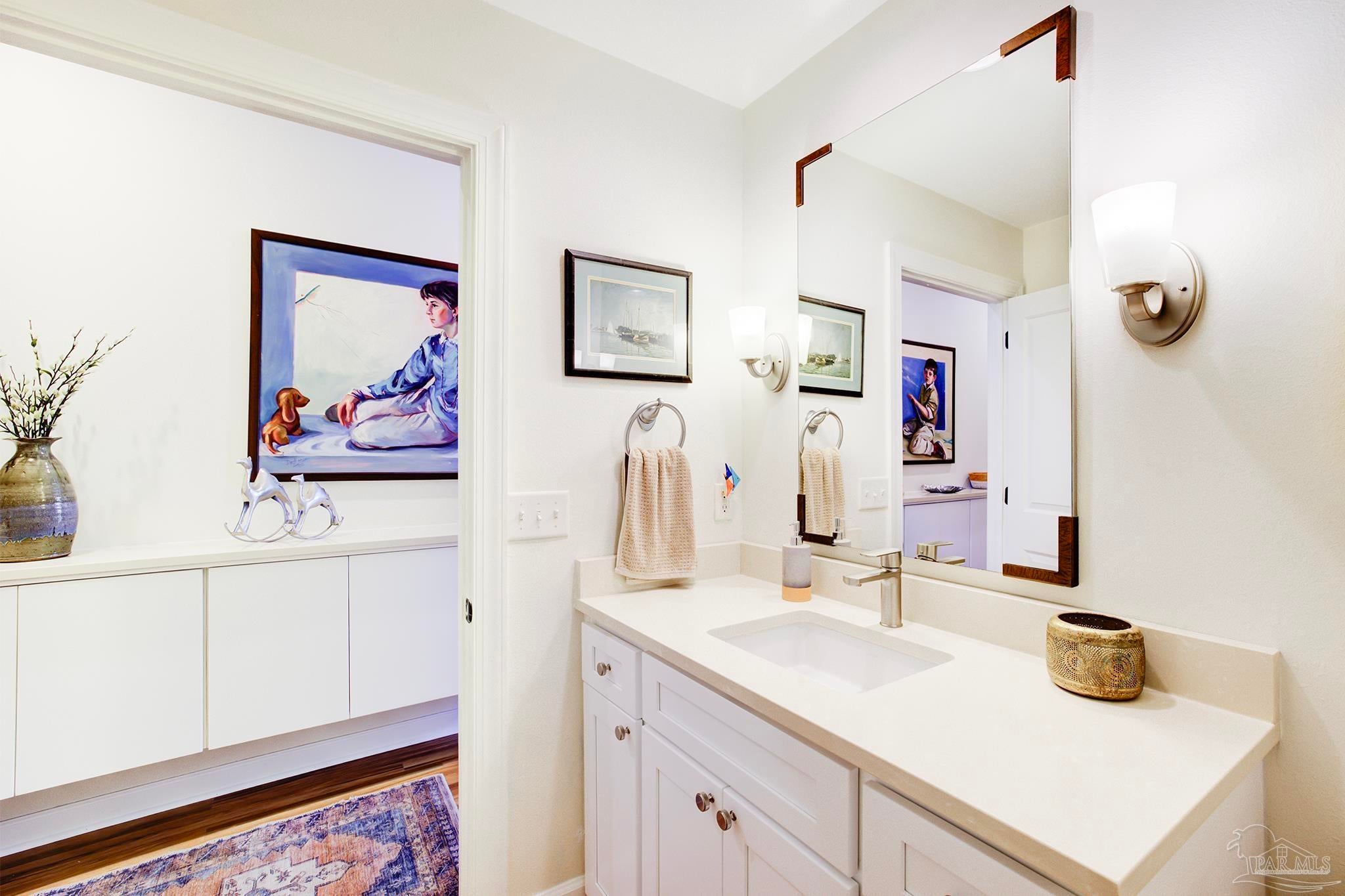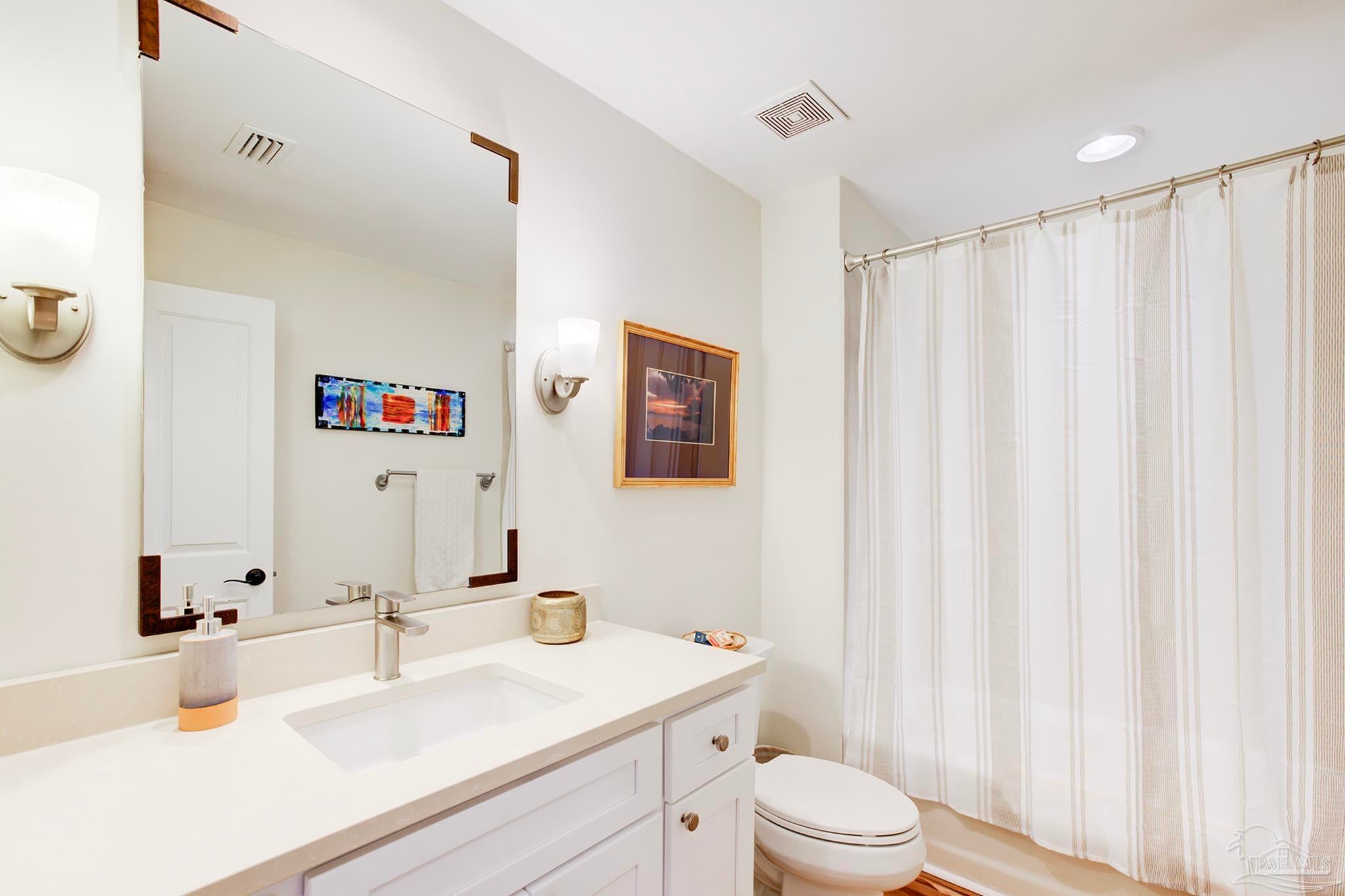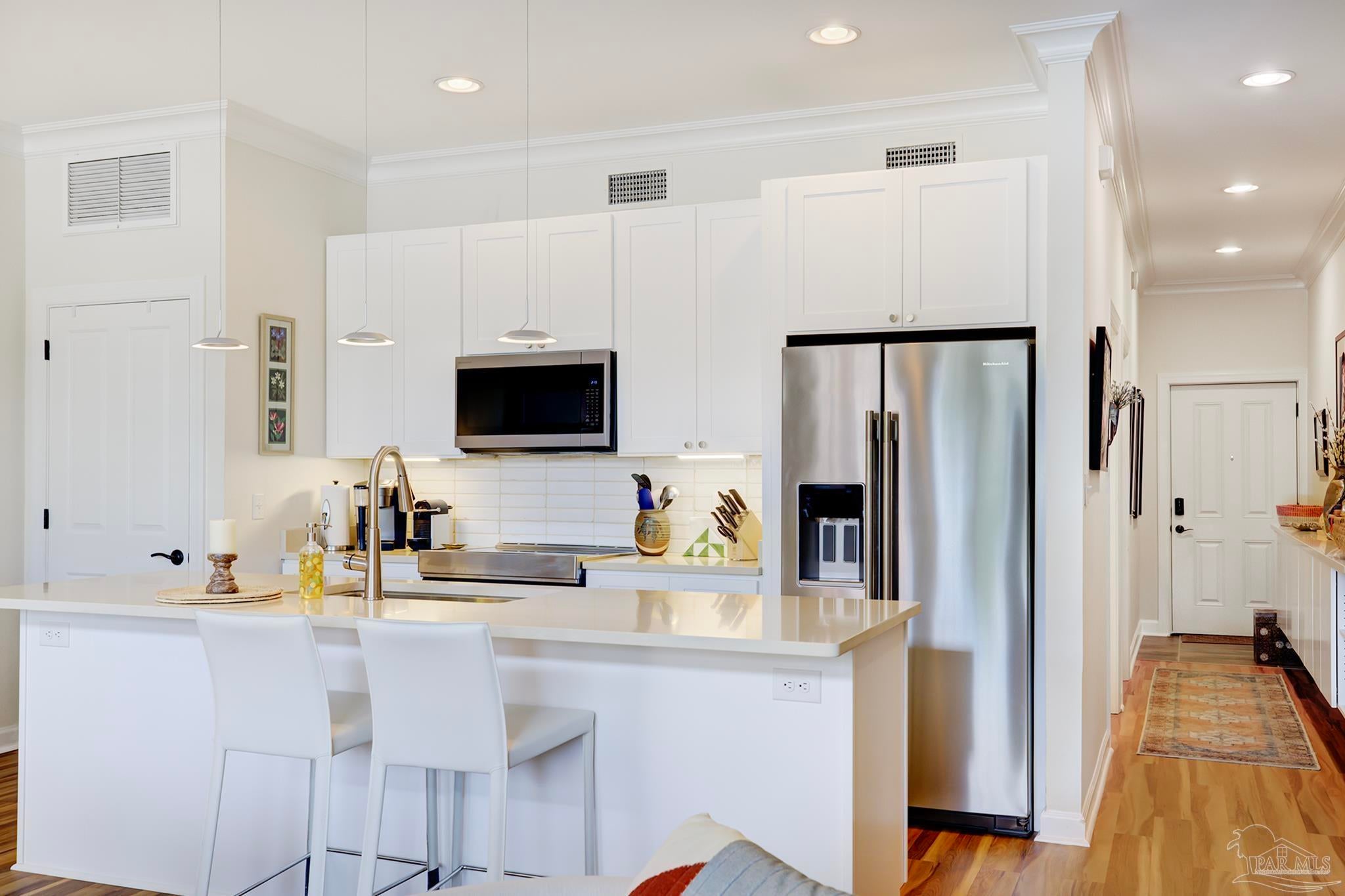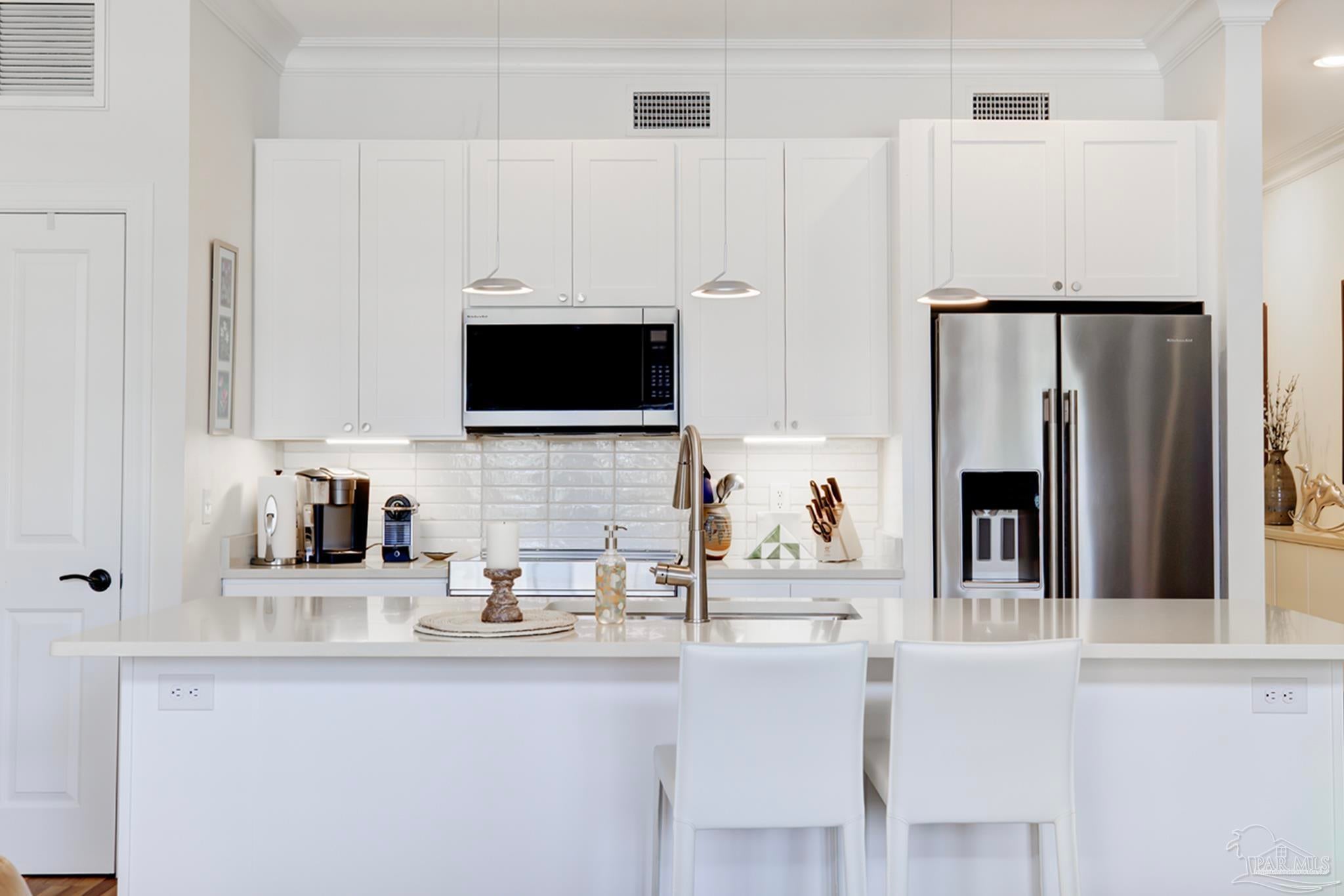 Discover this fully updated residence at Romana Lofts, perfectly situated in the heart of Downtown Pensacola within the Seville Historic District. This stylish first-floor, one-bedroom unit blends modern upgrades with timeless character, offering a turnkey opportunity for city living. The open-concept kitchen is designed for entertaining, showcasing brand-new stainless steel appliances, brand new cabinets, a stackable washer and dryer, an upgraded island with quartz countertops, contemporary pendant lighting, a subway tile backsplash, and plenty of bar seating. New luxury vinyl flooring throughout the unit enhances the space with durability and elegance. Double French doors with plantation shutters open to a private covered balcony—an ideal spot for unwinding with a drink or simply enjoying the outdoors. The bedroom features the same wood LVP, ample space for a king-sized bed, additional plantation shutters, and a walk-in closet with a custom system for maximum organization. A built-in hallway cabinet adds even more storage. The HVAC system was also recently replaced, offering peace of mind. Constructed with concrete, brick, and stucco, Romana Lofts are built to last. From this prime location, you can stroll to Gallery Night, Hub Stacey’s, Palafox Street, the YMCA, Blue Wahoos Stadium, Juans, numerous events, and all the vibrant dining, shopping, and entertainment Downtown Pensacola has to offer. Live the lifestyle you’ve been waiting for at Romana Lofts!