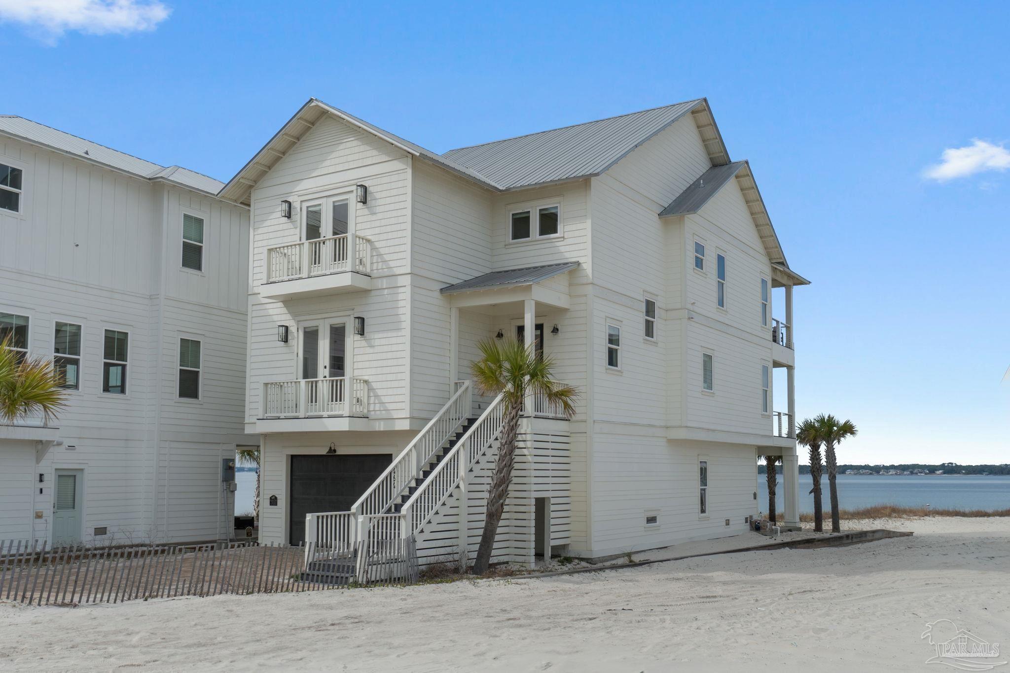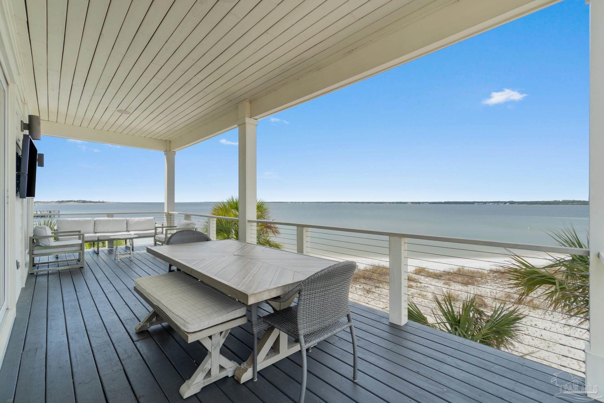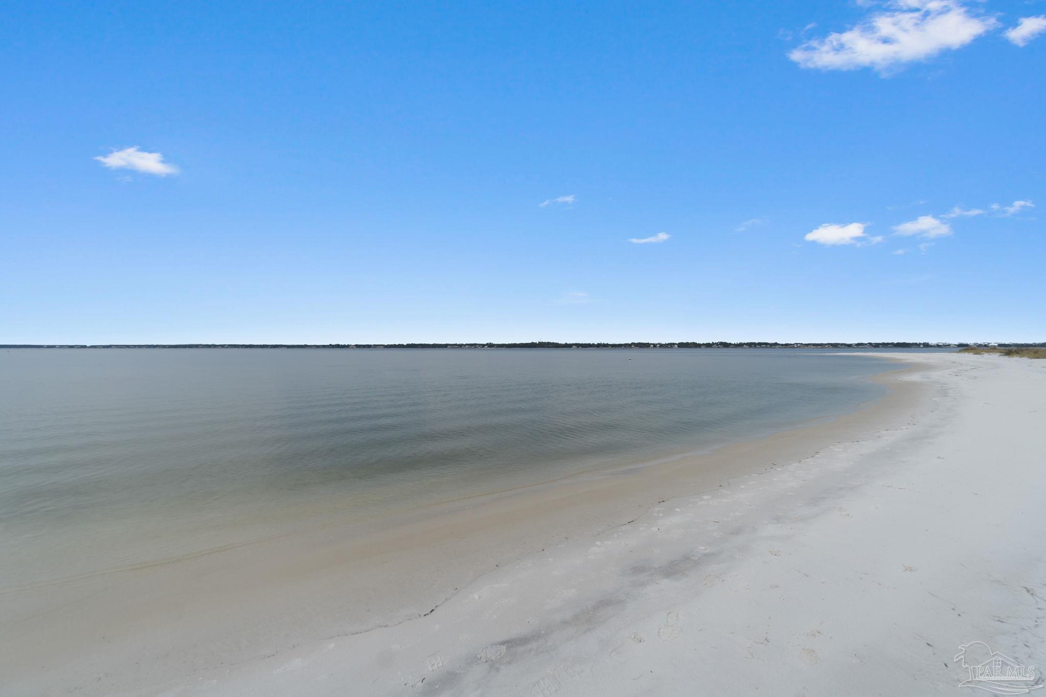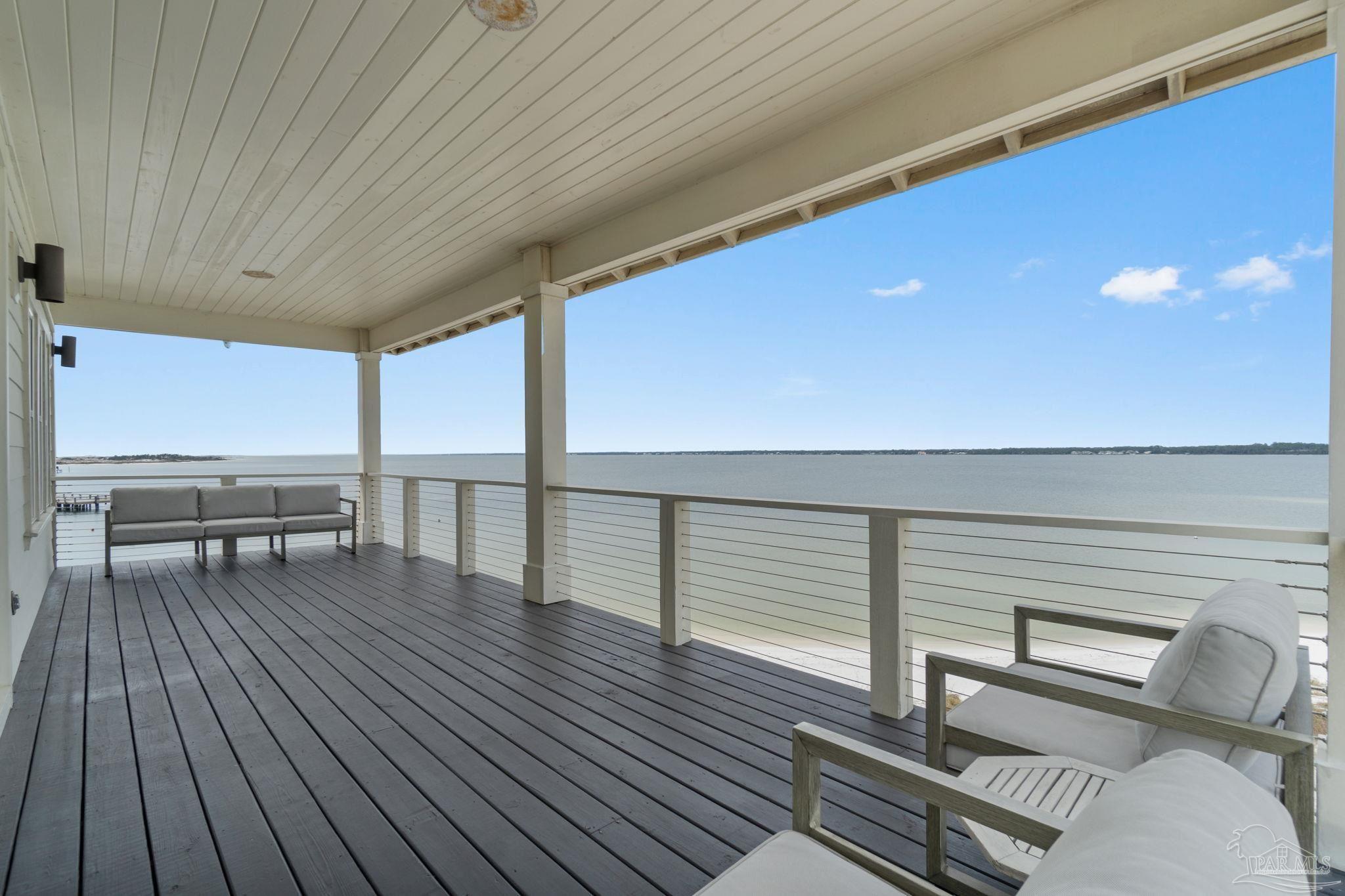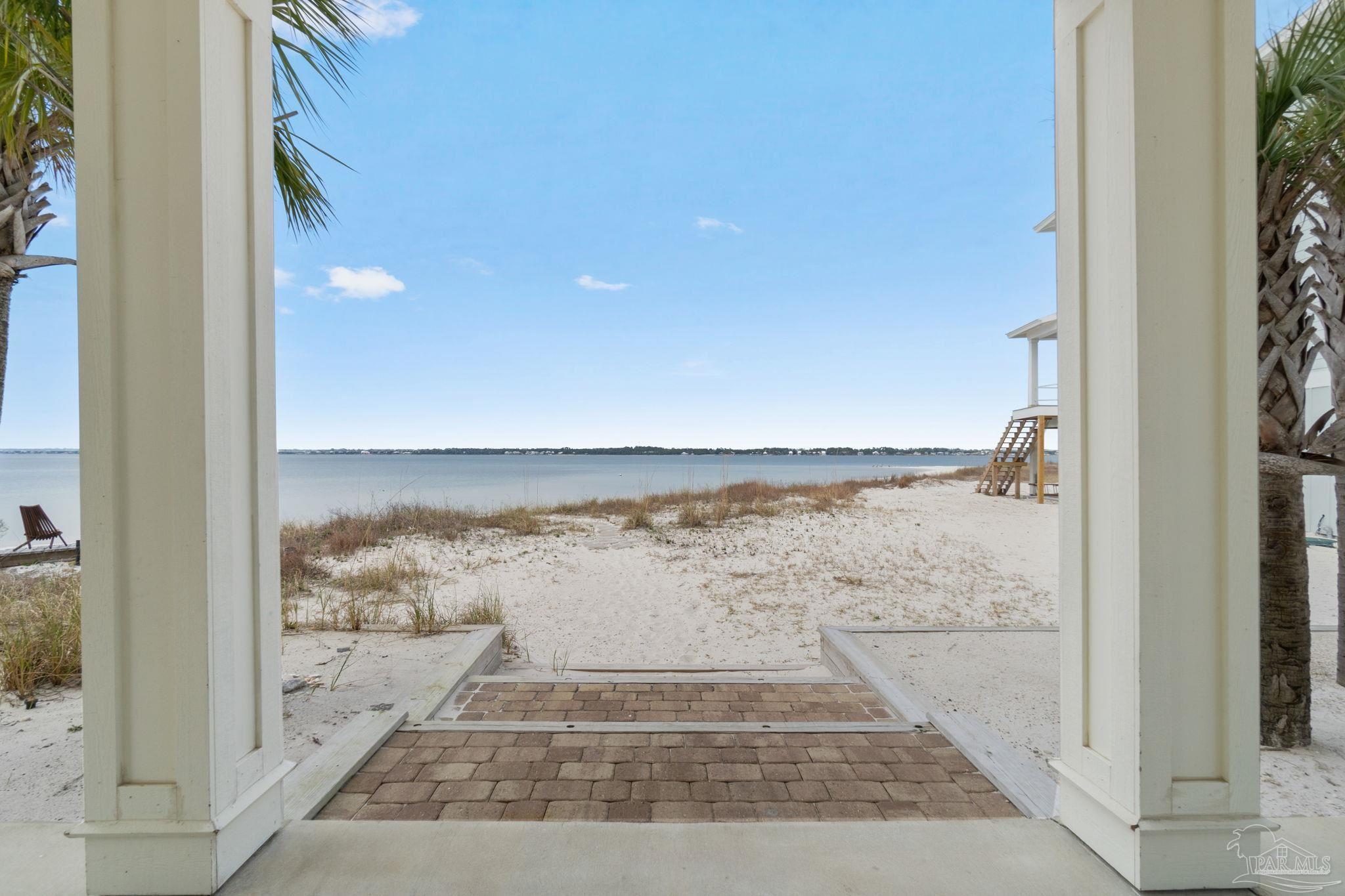 Experience the beauty of Sound-front living in this exceptional Navarre Beach retreat. Perfectly positioned within the private gated community of By the Sea, this custom-built home captures the best of coastal life with over 110 feet of direct waterfront, serene views across the Santa Rosa Sound, and effortless access to the Gulf—just a short stroll or golf cart ride away. Inside, soaring ceilings and wide-plank distressed pine floors create a warm, open feel that complements the coastal surroundings. The home features five bedrooms, each with its own ensuite bath, plus an additional half bath. Two spacious primary suites—one on the main floor and another upstairs—offer peaceful water views, soaking tubs, seamless glass showers, and double vanities. Large windows and glass doors flood the living spaces with natural light and open to covered balconies overlooking the Sound, creating a seamless flow between indoor and outdoor living. The kitchen and main living area are designed for gathering, featuring quartz and marble countertops, soft-close cabinetry, whitewashed cedar accents, and shiplap details. Enjoy the convenience of whole-home audio and video with WiFi control, custom window treatments, and refined lighting throughout. On the top floor, a flexible bonus room with a trundle bed adds extra sleeping space for guests, while a half bath in the garage provides added convenience for beach days. Sold fully furnished with high-end décor (with limited exclusions), the home is ready to enjoy from day one. Outside, flagstone pathways lead to your private stretch of Sound-front beach—perfect for kayaking, paddleboarding, or simply unwinding as the sun sets over the water. The By the Sea community also offers a pool and hot tub for owners and guests. Thoughtfully designed and impeccably maintained, 1464 Seaside Circle is more than a home—it’s a rare opportunity to experience the laid-back luxury and natural beauty that define life on Navarre Beach.