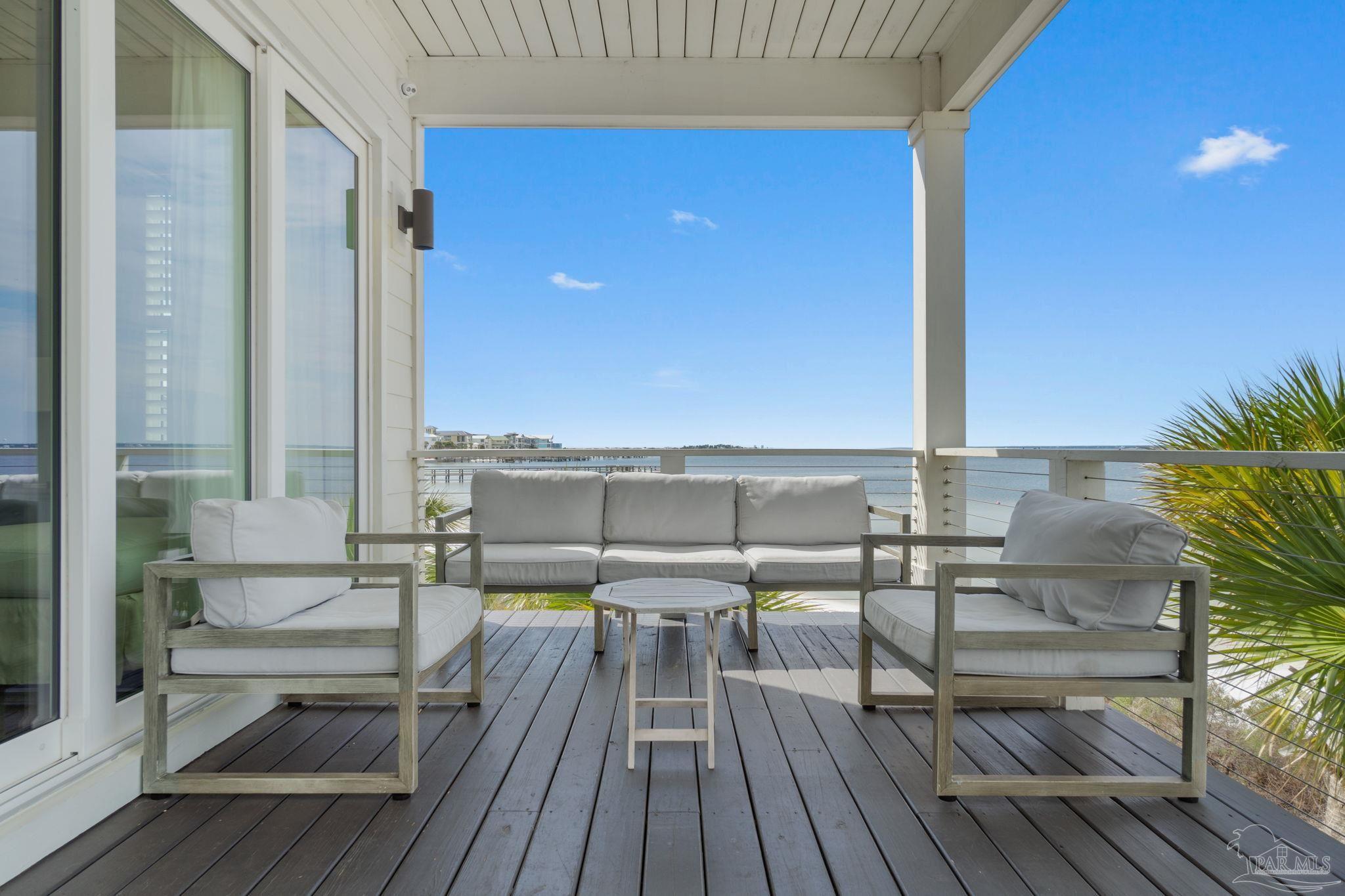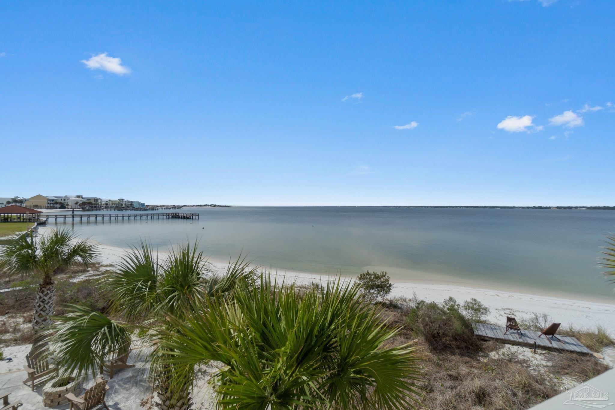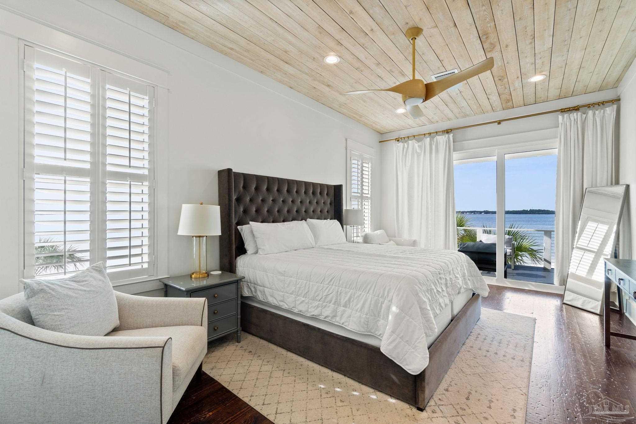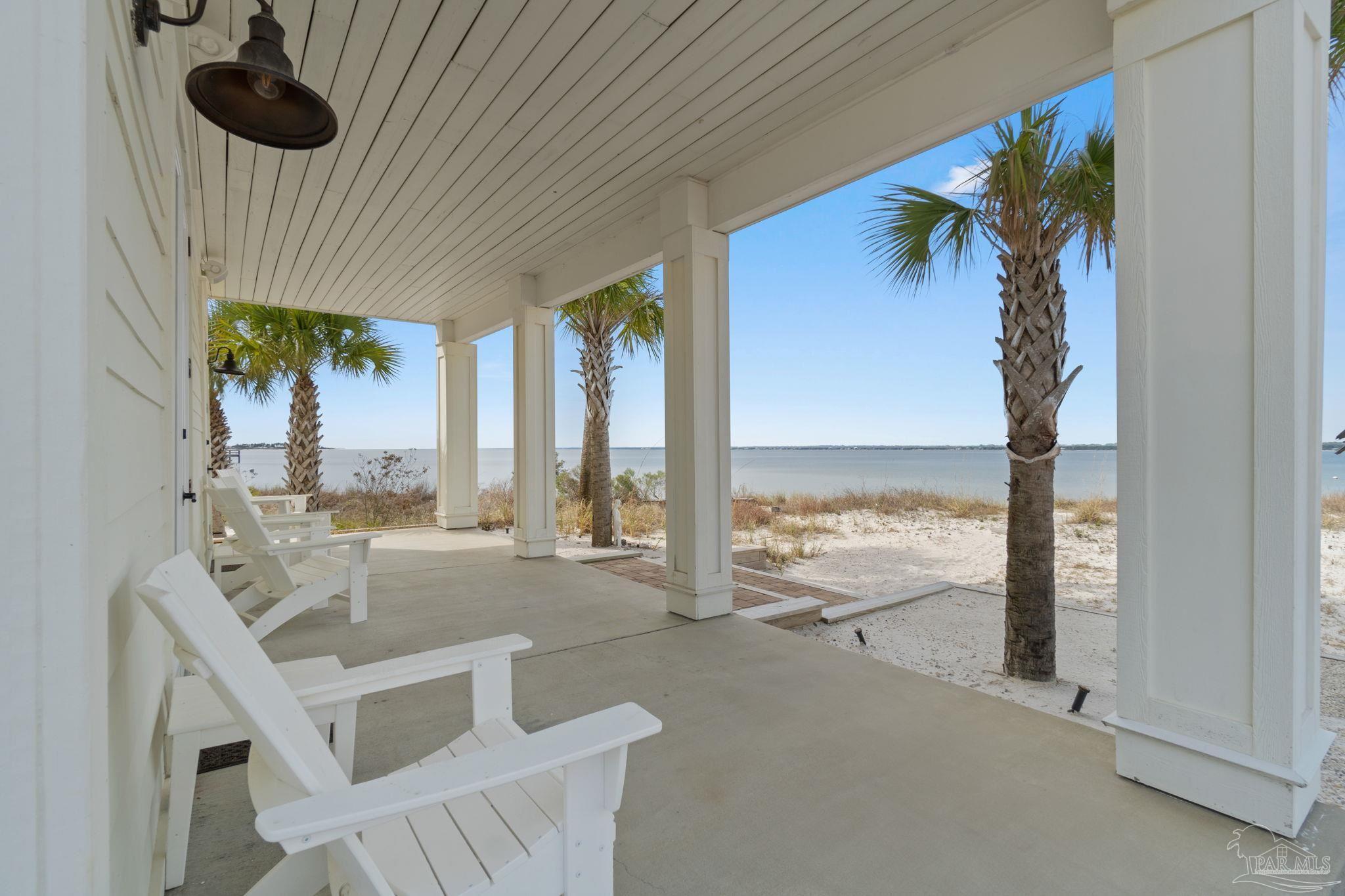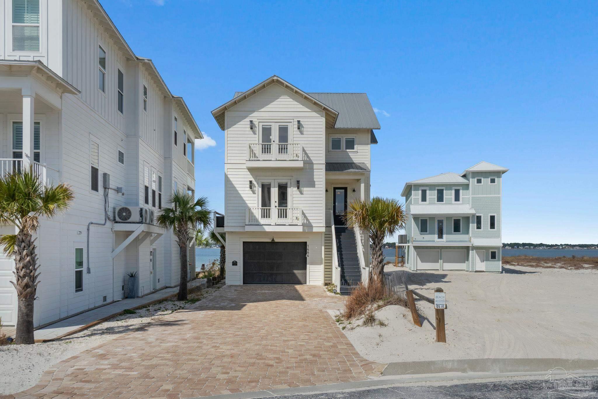 Experience the beauty of Sound-front living in this exceptional Navarre Beach retreat. Perfectly positioned within the private gated community of By the Sea, this custom-built home captures the best of coastal life with over 110 feet of direct waterfront, serene views across the Santa Rosa Sound, and effortless access to the Gulf—just a short stroll or golf cart ride away. Inside, soaring ceilings and wide-plank distressed pine floors create a warm, open feel that complements the coastal surroundings. The home features five bedrooms, each with its own ensuite bath, plus an additional half bath. Two spacious primary suites—one on the main floor and another upstairs—offer peaceful water views, soaking tubs, seamless glass showers, and double vanities. Large windows and glass doors flood the living spaces with natural light and open to covered balconies overlooking the Sound, creating a seamless flow between indoor and outdoor living. The kitchen and main living area are designed for gathering, featuring quartz and marble countertops, soft-close cabinetry, whitewashed cedar accents, and shiplap details. Enjoy the convenience of whole-home audio and video with WiFi control, custom window treatments, and refined lighting throughout. On the top floor, a flexible bonus room with a trundle bed adds extra sleeping space for guests, while a half bath in the garage provides added convenience for beach days. Sold fully furnished with high-end décor (with limited exclusions), the home is ready to enjoy from day one. Outside, flagstone pathways lead to your private stretch of Sound-front beach—perfect for kayaking, paddleboarding, or simply unwinding as the sun sets over the water. The By the Sea community also offers a pool and hot tub for owners and guests. Thoughtfully designed and impeccably maintained, 1464 Seaside Circle is more than a home—it’s a rare opportunity to experience the laid-back luxury and natural beauty that define life on Navarre Beach.