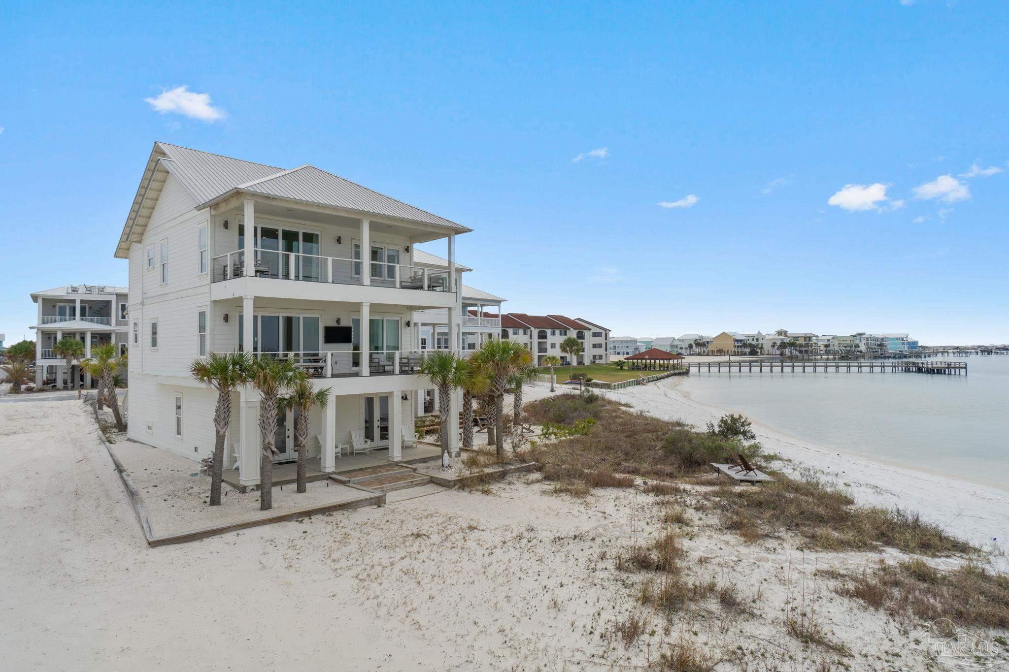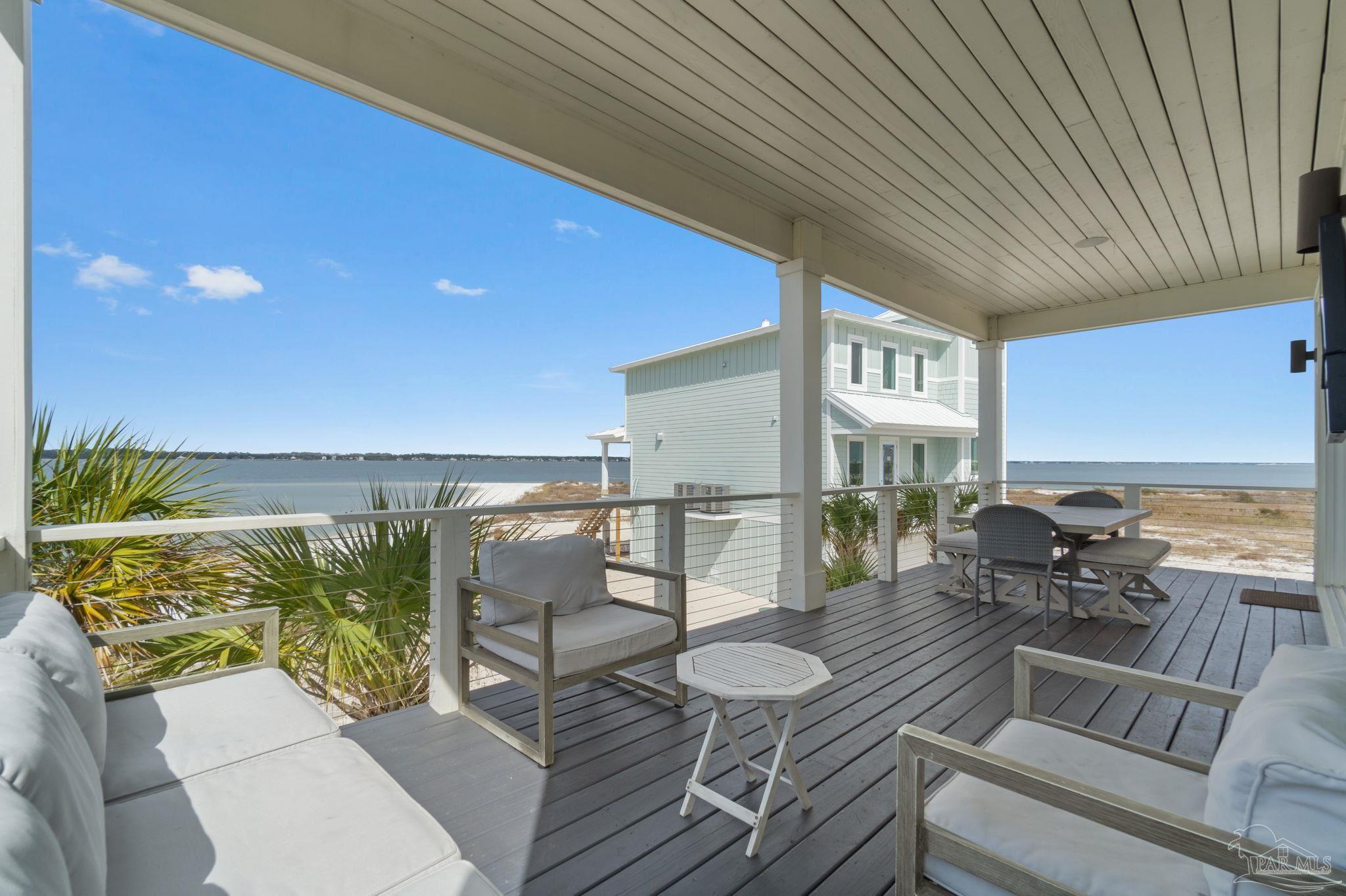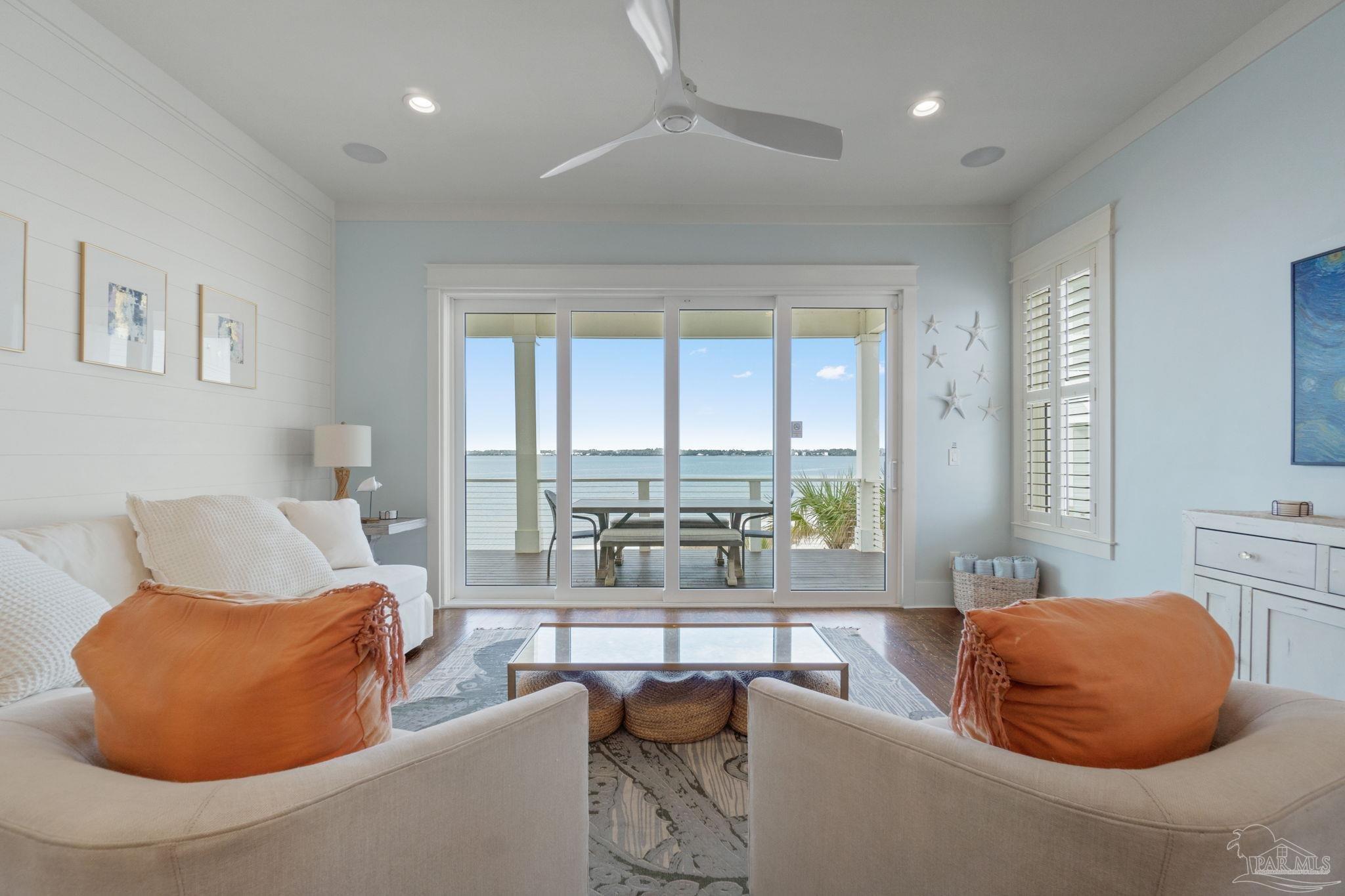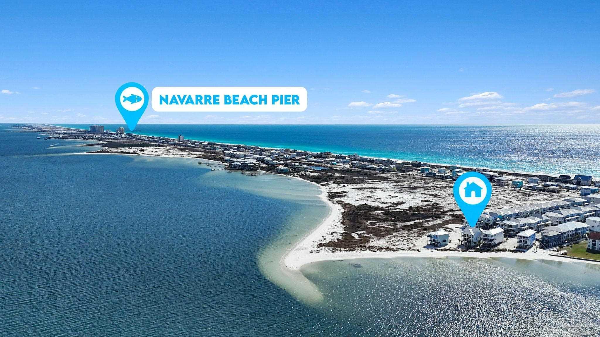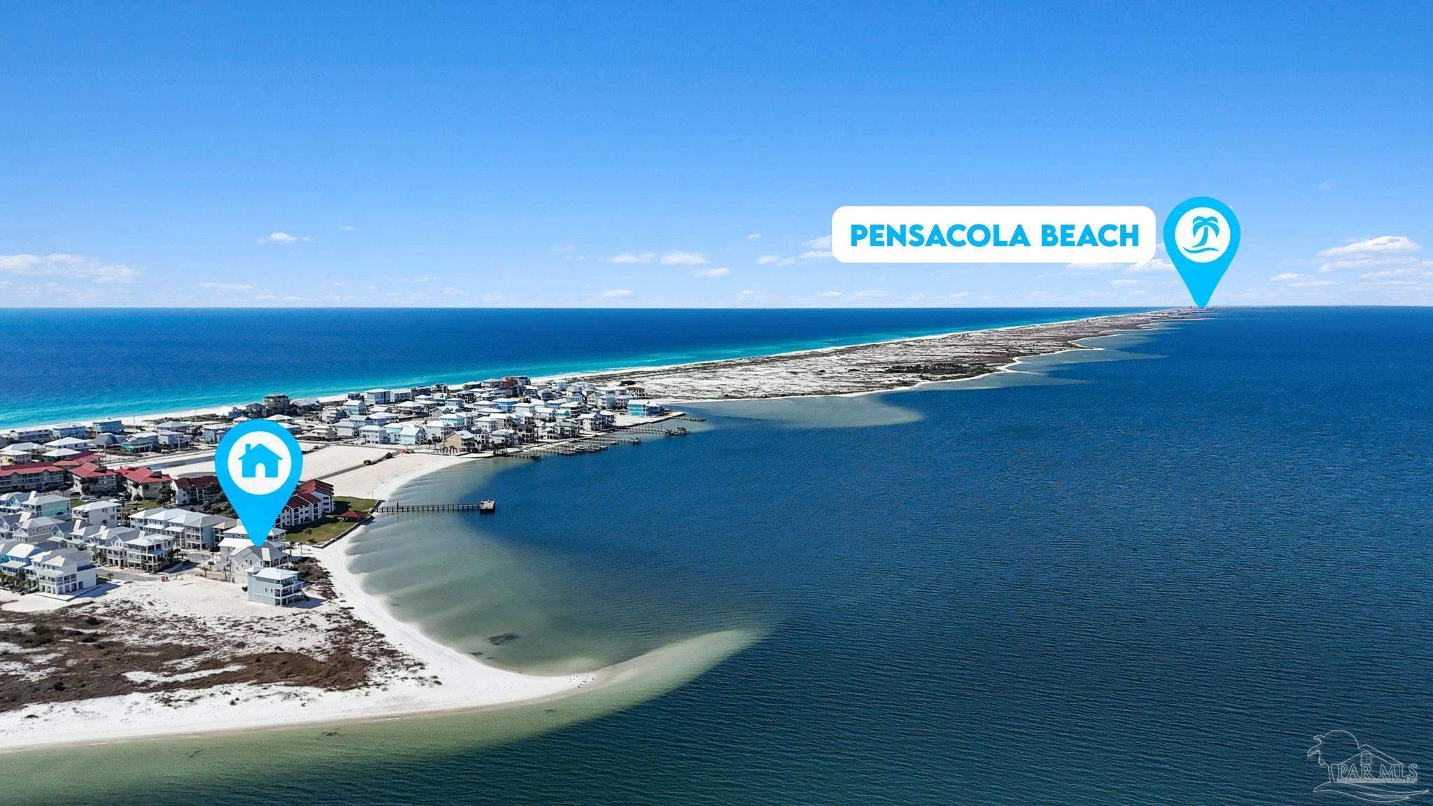 Experience the beauty of Sound-front living in this exceptional Navarre Beach retreat. Perfectly positioned within the private gated community of By the Sea, this custom-built home captures the best of coastal life with over 110 feet of direct waterfront, serene views across the Santa Rosa Sound, and effortless access to the Gulf—just a short stroll or golf cart ride away. Inside, soaring ceilings and wide-plank distressed pine floors create a warm, open feel that complements the coastal surroundings. The home features five bedrooms, each with its own ensuite bath, plus an additional half bath. Two spacious primary suites—one on the main floor and another upstairs—offer peaceful water views, soaking tubs, seamless glass showers, and double vanities. Large windows and glass doors flood the living spaces with natural light and open to covered balconies overlooking the Sound, creating a seamless flow between indoor and outdoor living. The kitchen and main living area are designed for gathering, featuring quartz and marble countertops, soft-close cabinetry, whitewashed cedar accents, and shiplap details. Enjoy the convenience of whole-home audio and video with WiFi control, custom window treatments, and refined lighting throughout. On the top floor, a flexible bonus room with a trundle bed adds extra sleeping space for guests, while a half bath in the garage provides added convenience for beach days. Sold fully furnished with high-end décor (with limited exclusions), the home is ready to enjoy from day one. Outside, flagstone pathways lead to your private stretch of Sound-front beach—perfect for kayaking, paddleboarding, or simply unwinding as the sun sets over the water. The By the Sea community also offers a pool and hot tub for owners and guests. Thoughtfully designed and impeccably maintained, 1464 Seaside Circle is more than a home—it’s a rare opportunity to experience the laid-back luxury and natural beauty that define life on Navarre Beach.