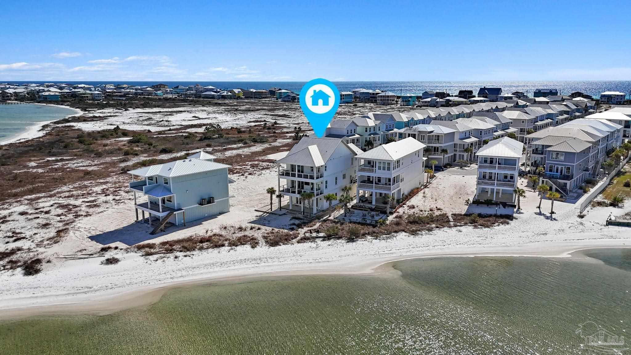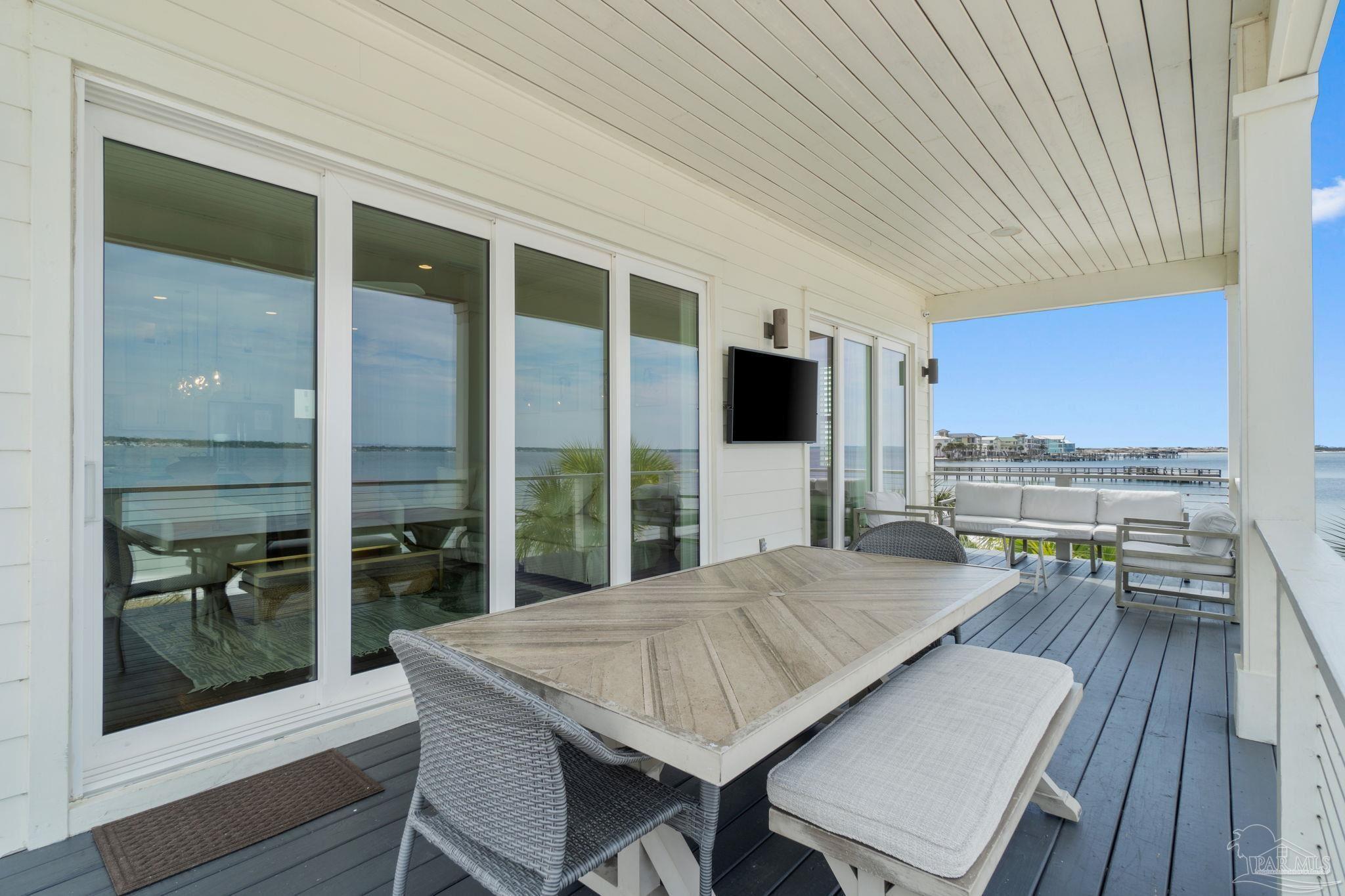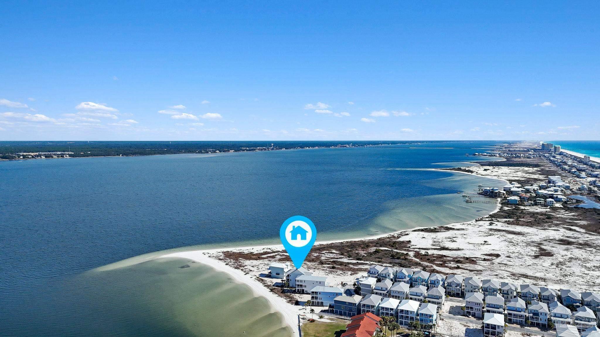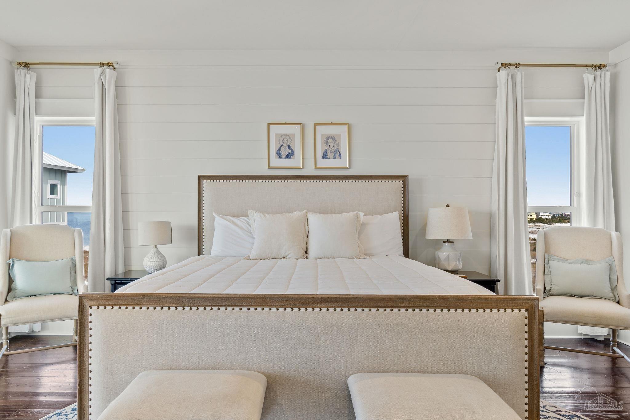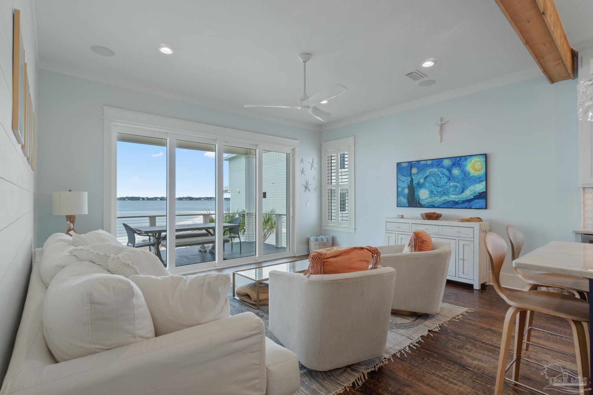 Experience the beauty of Sound-front living in this exceptional Navarre Beach retreat. Perfectly positioned within the private gated community of By the Sea, this custom-built home captures the best of coastal life with over 110 feet of direct waterfront, serene views across the Santa Rosa Sound, and effortless access to the Gulf—just a short stroll or golf cart ride away. Inside, soaring ceilings and wide-plank distressed pine floors create a warm, open feel that complements the coastal surroundings. The home features five bedrooms, each with its own ensuite bath, plus an additional half bath. Two spacious primary suites—one on the main floor and another upstairs—offer peaceful water views, soaking tubs, seamless glass showers, and double vanities. Large windows and glass doors flood the living spaces with natural light and open to covered balconies overlooking the Sound, creating a seamless flow between indoor and outdoor living. The kitchen and main living area are designed for gathering, featuring quartz and marble countertops, soft-close cabinetry, whitewashed cedar accents, and shiplap details. Enjoy the convenience of whole-home audio and video with WiFi control, custom window treatments, and refined lighting throughout. On the top floor, a flexible bonus room with a trundle bed adds extra sleeping space for guests, while a half bath in the garage provides added convenience for beach days. Sold fully furnished with high-end décor (with limited exclusions), the home is ready to enjoy from day one. Outside, flagstone pathways lead to your private stretch of Sound-front beach—perfect for kayaking, paddleboarding, or simply unwinding as the sun sets over the water. The By the Sea community also offers a pool and hot tub for owners and guests. Thoughtfully designed and impeccably maintained, 1464 Seaside Circle is more than a home—it’s a rare opportunity to experience the laid-back luxury and natural beauty that define life on Navarre Beach.