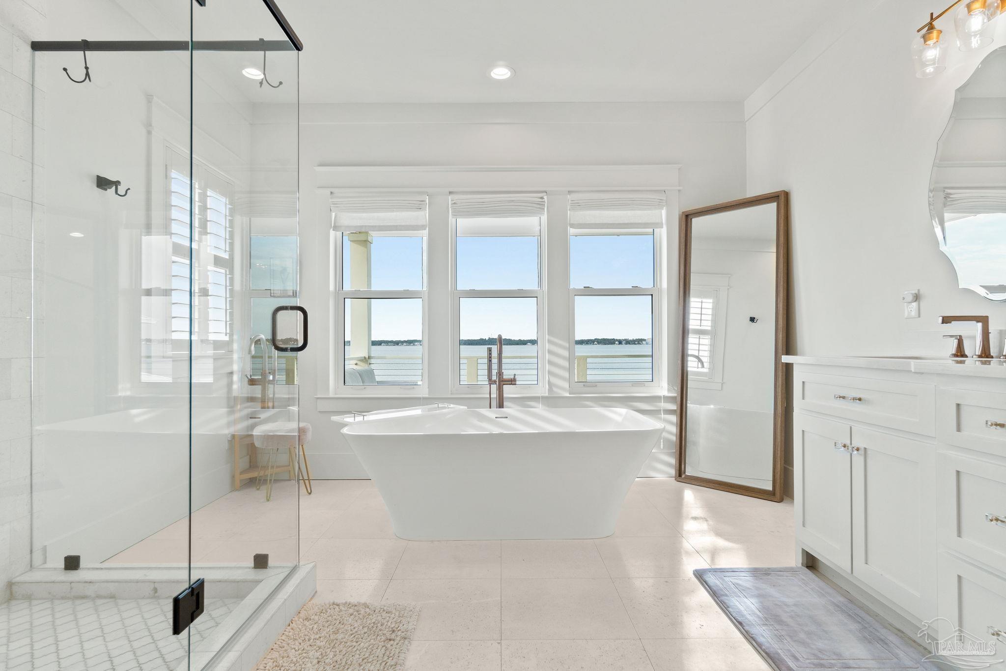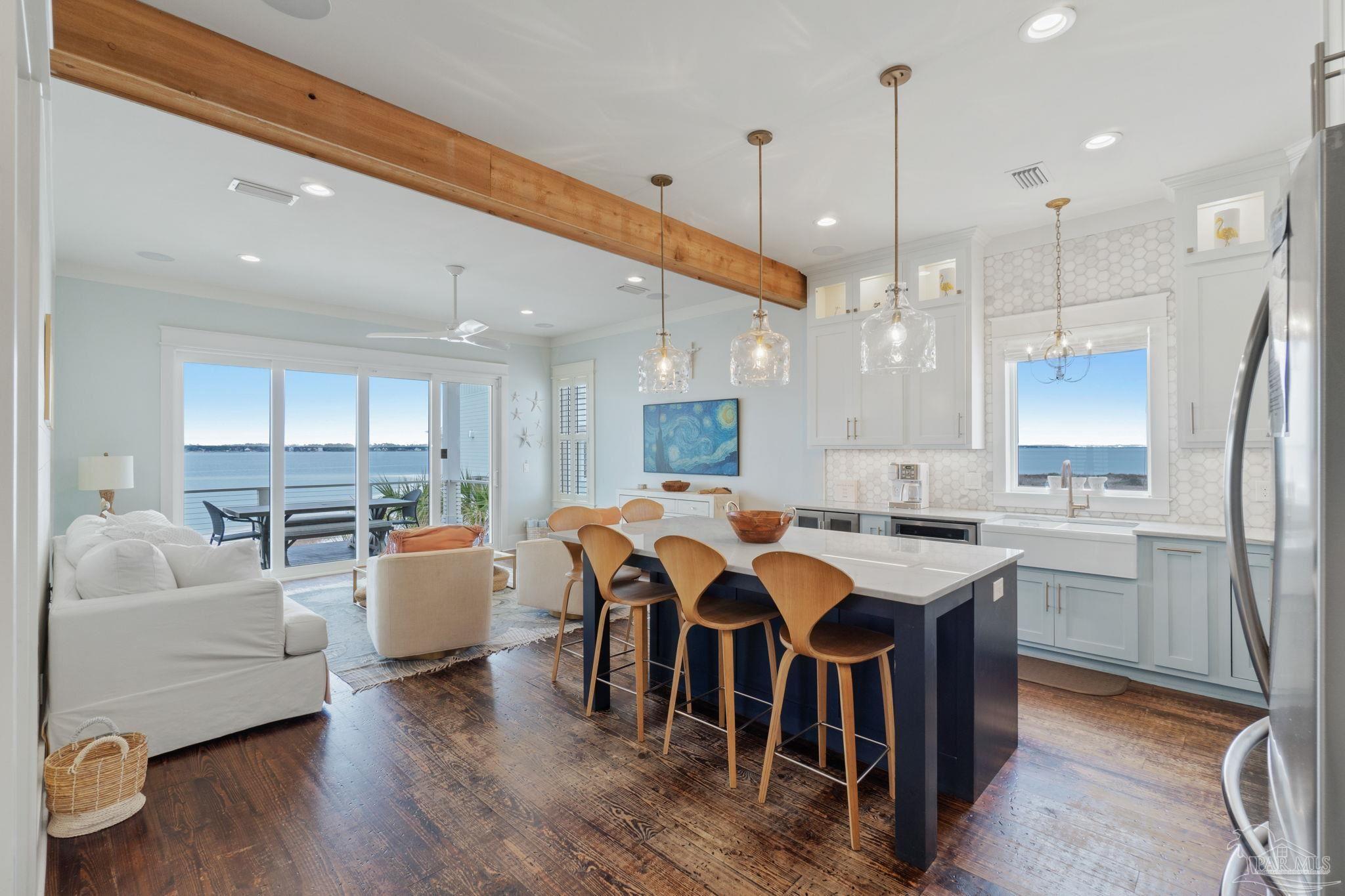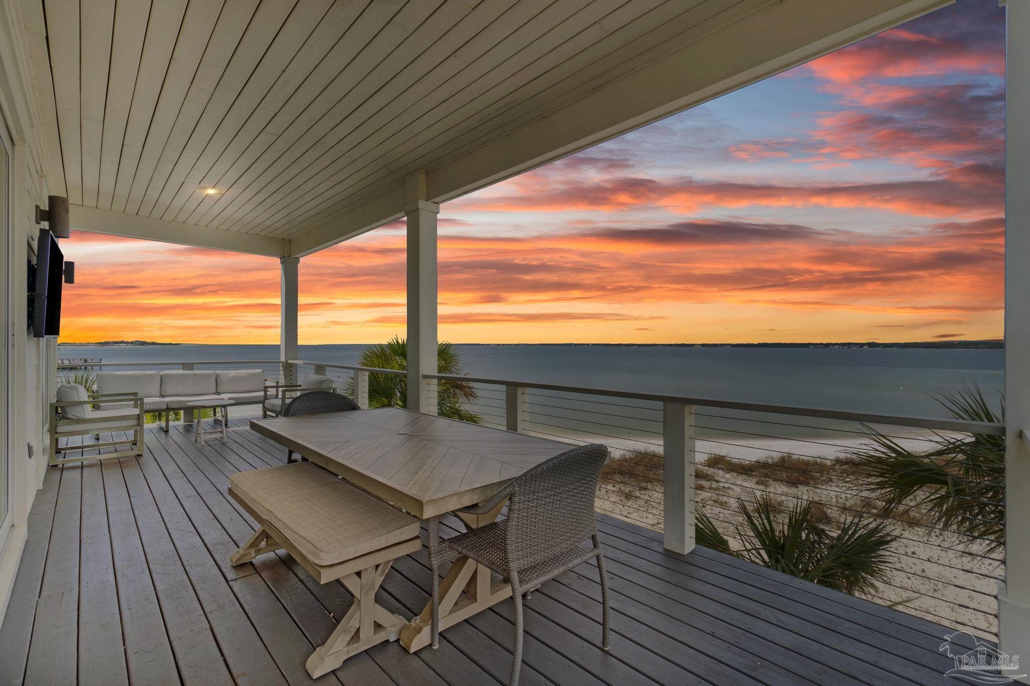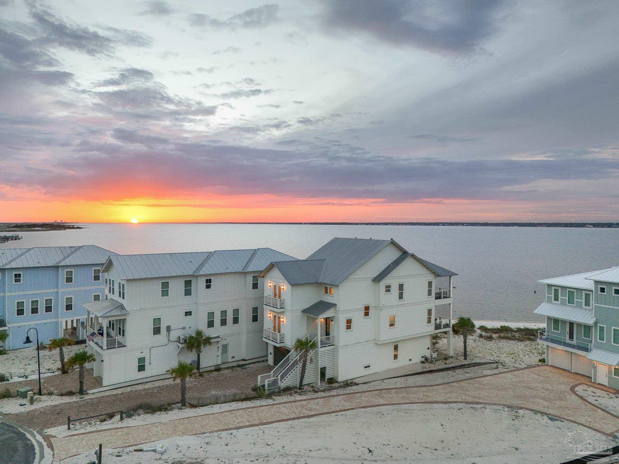 Experience the beauty of Sound-front living in this exceptional Navarre Beach retreat. Perfectly positioned within the private gated community of By the Sea, this custom-built home captures the best of coastal life with over 110 feet of direct waterfront, serene views across the Santa Rosa Sound, and effortless access to the Gulf—just a short stroll or golf cart ride away. Inside, soaring ceilings and wide-plank distressed pine floors create a warm, open feel that complements the coastal surroundings. The home features five bedrooms, each with its own ensuite bath, plus an additional half bath. Two spacious primary suites—one on the main floor and another upstairs—offer peaceful water views, soaking tubs, seamless glass showers, and double vanities. Large windows and glass doors flood the living spaces with natural light and open to covered balconies overlooking the Sound, creating a seamless flow between indoor and outdoor living. The kitchen and main living area are designed for gathering, featuring quartz and marble countertops, soft-close cabinetry, whitewashed cedar accents, and shiplap details. Enjoy the convenience of whole-home audio and video with WiFi control, custom window treatments, and refined lighting throughout. On the top floor, a flexible bonus room with a trundle bed adds extra sleeping space for guests, while a half bath in the garage provides added convenience for beach days. Sold fully furnished with high-end décor (with limited exclusions), the home is ready to enjoy from day one. Outside, flagstone pathways lead to your private stretch of Sound-front beach—perfect for kayaking, paddleboarding, or simply unwinding as the sun sets over the water. The By the Sea community also offers a pool and hot tub for owners and guests. Thoughtfully designed and impeccably maintained, 1464 Seaside Circle is more than a home—it’s a rare opportunity to experience the laid-back luxury and natural beauty that define life on Navarre Beach.