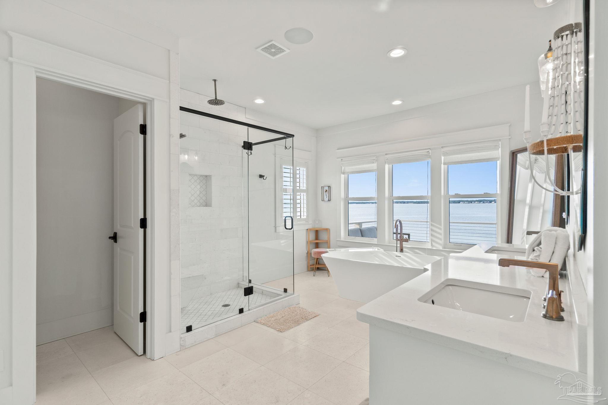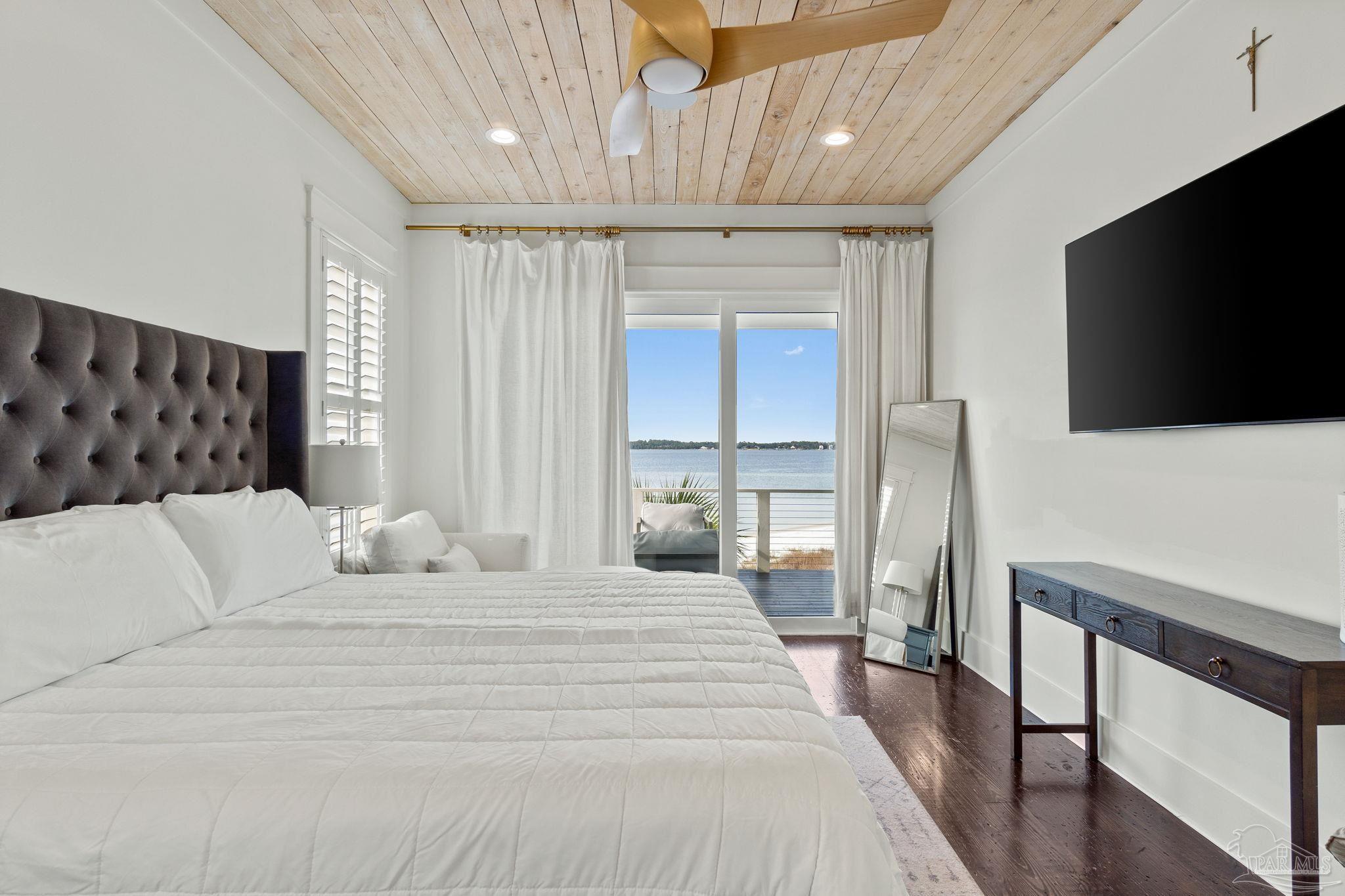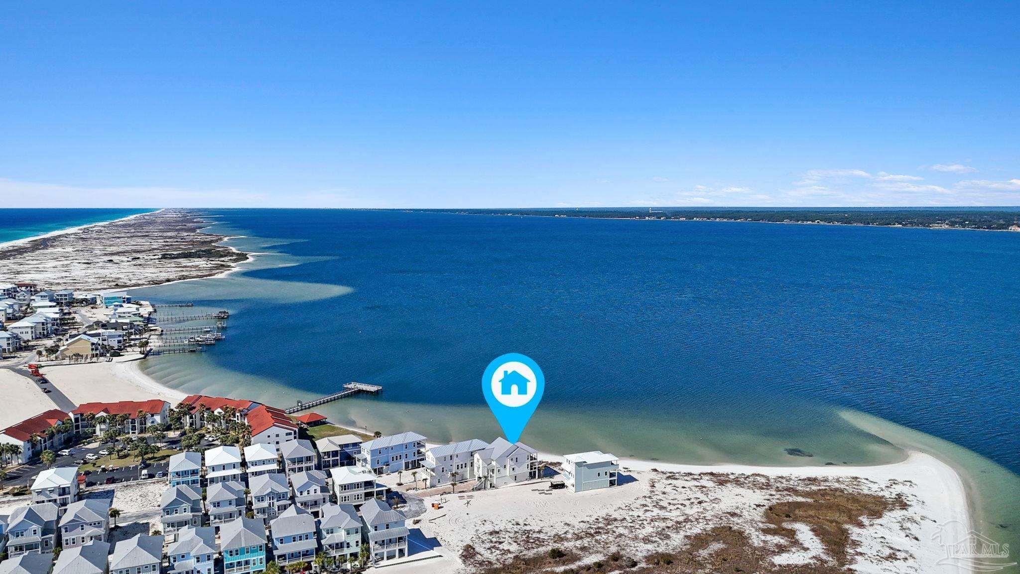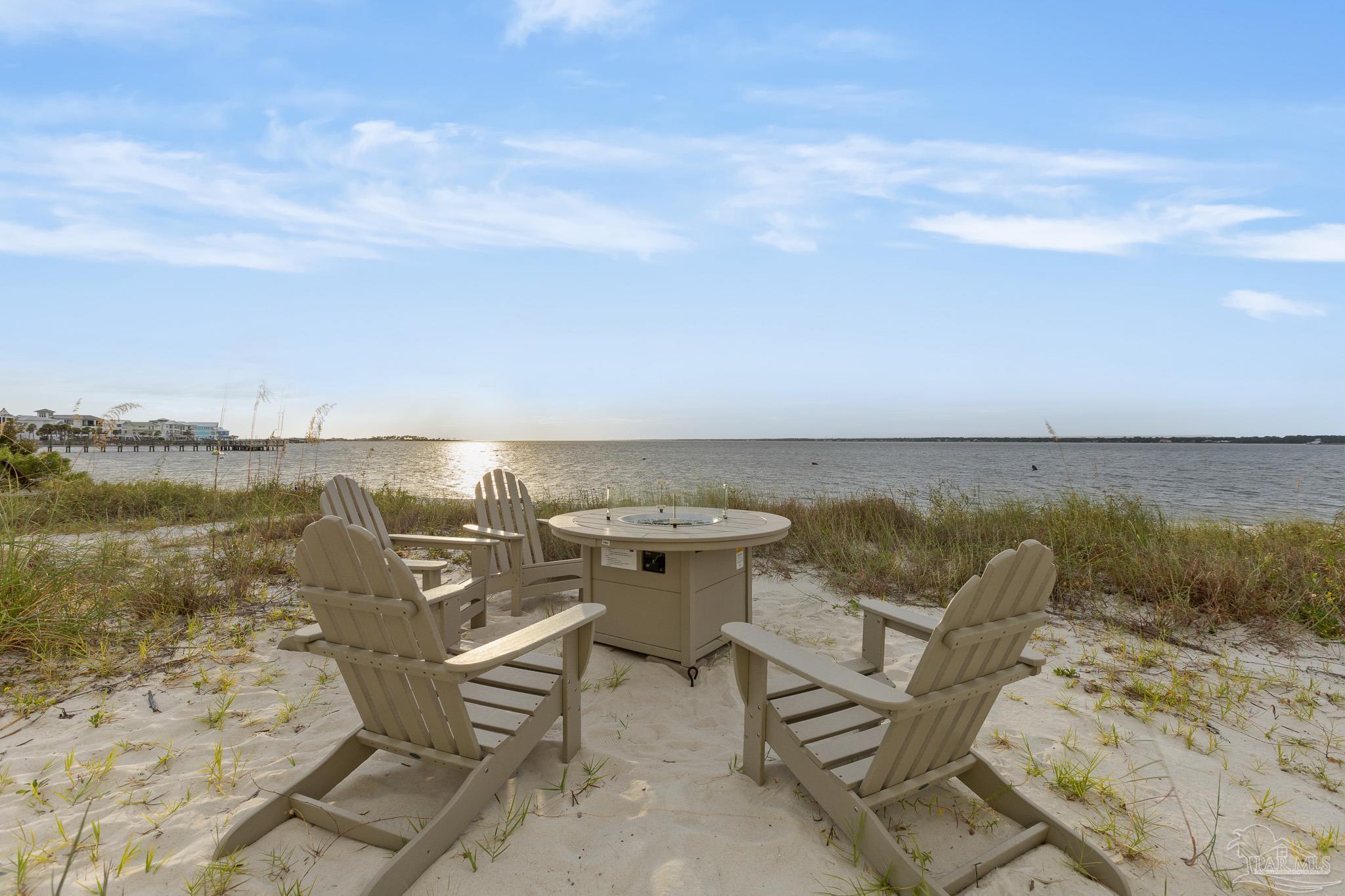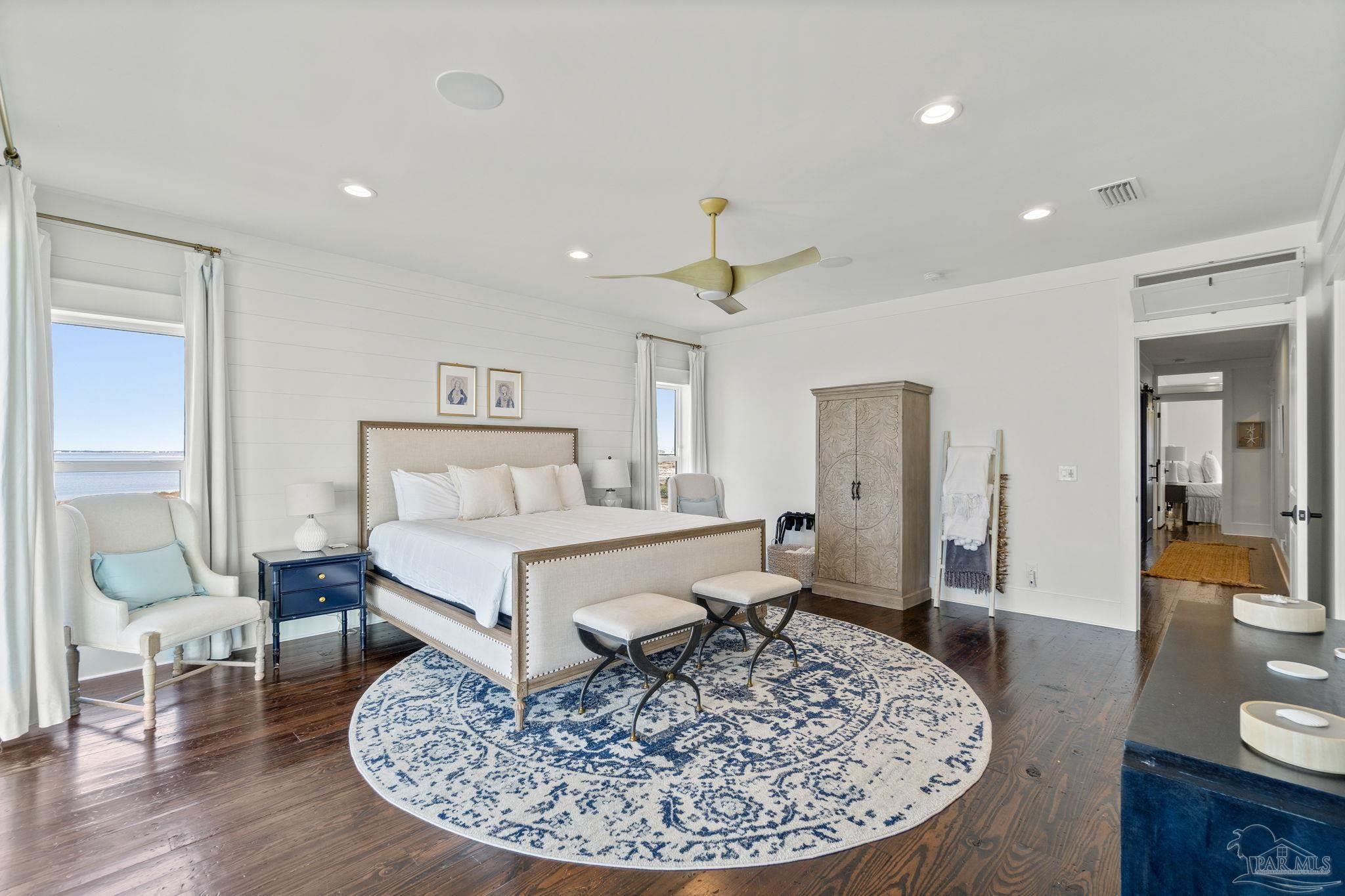 Experience the beauty of Sound-front living in this exceptional Navarre Beach retreat. Perfectly positioned within the private gated community of By the Sea, this custom-built home captures the best of coastal life with over 110 feet of direct waterfront, serene views across the Santa Rosa Sound, and effortless access to the Gulf—just a short stroll or golf cart ride away. Inside, soaring ceilings and wide-plank distressed pine floors create a warm, open feel that complements the coastal surroundings. The home features five bedrooms, each with its own ensuite bath, plus an additional half bath. Two spacious primary suites—one on the main floor and another upstairs—offer peaceful water views, soaking tubs, seamless glass showers, and double vanities. Large windows and glass doors flood the living spaces with natural light and open to covered balconies overlooking the Sound, creating a seamless flow between indoor and outdoor living. The kitchen and main living area are designed for gathering, featuring quartz and marble countertops, soft-close cabinetry, whitewashed cedar accents, and shiplap details. Enjoy the convenience of whole-home audio and video with WiFi control, custom window treatments, and refined lighting throughout. On the top floor, a flexible bonus room with a trundle bed adds extra sleeping space for guests, while a half bath in the garage provides added convenience for beach days. Sold fully furnished with high-end décor (with limited exclusions), the home is ready to enjoy from day one. Outside, flagstone pathways lead to your private stretch of Sound-front beach—perfect for kayaking, paddleboarding, or simply unwinding as the sun sets over the water. The By the Sea community also offers a pool and hot tub for owners and guests. Thoughtfully designed and impeccably maintained, 1464 Seaside Circle is more than a home—it’s a rare opportunity to experience the laid-back luxury and natural beauty that define life on Navarre Beach.