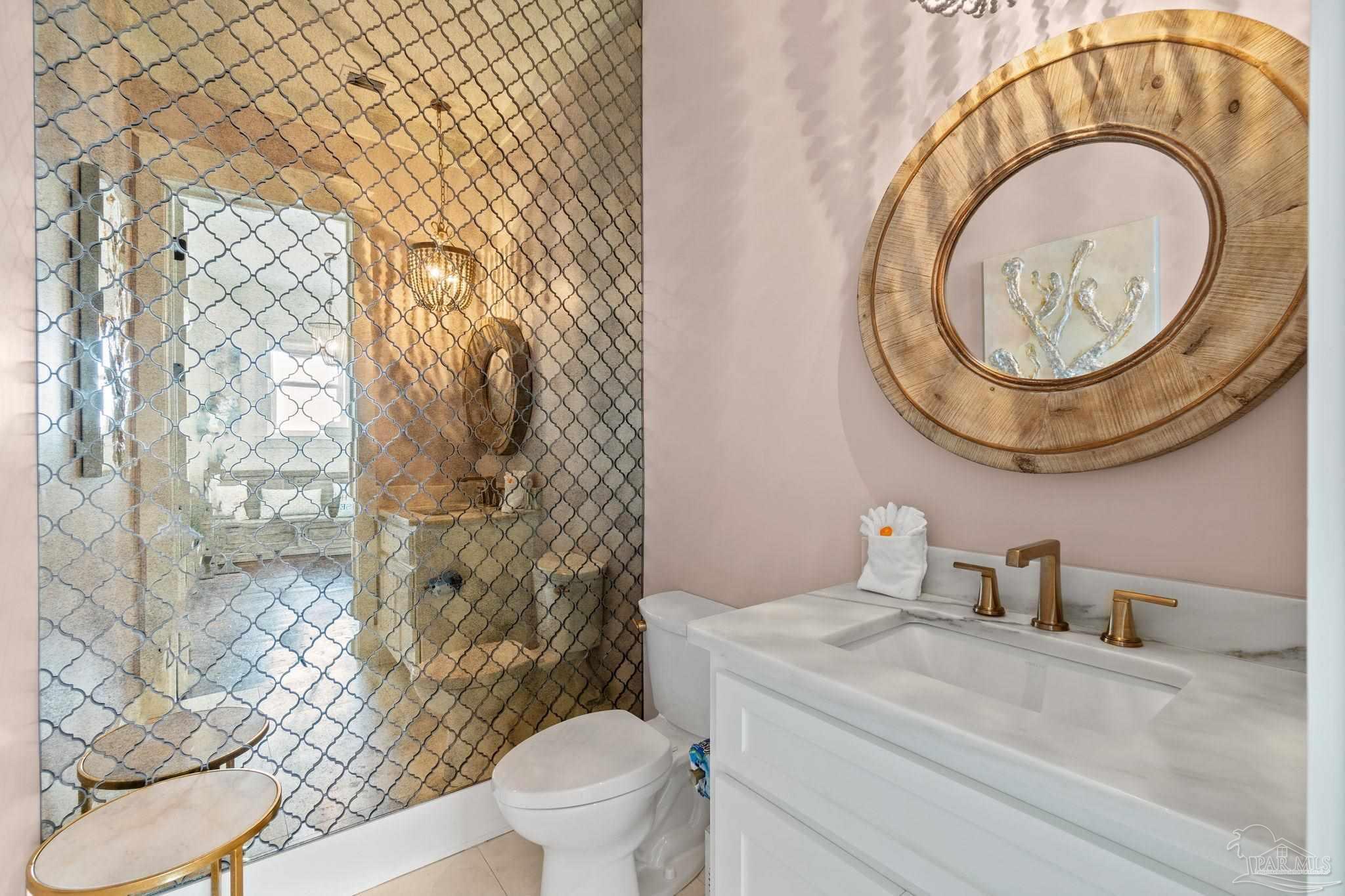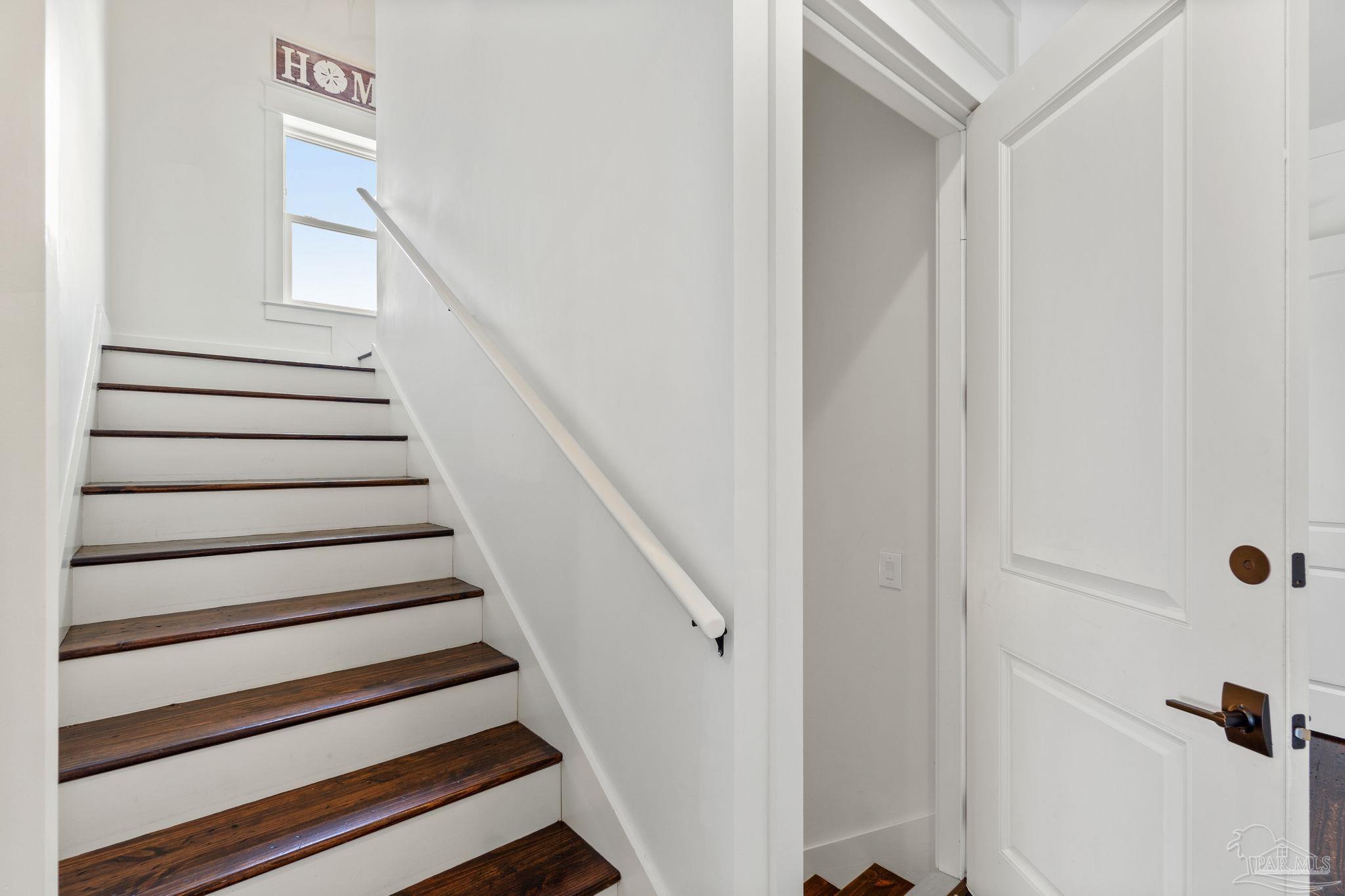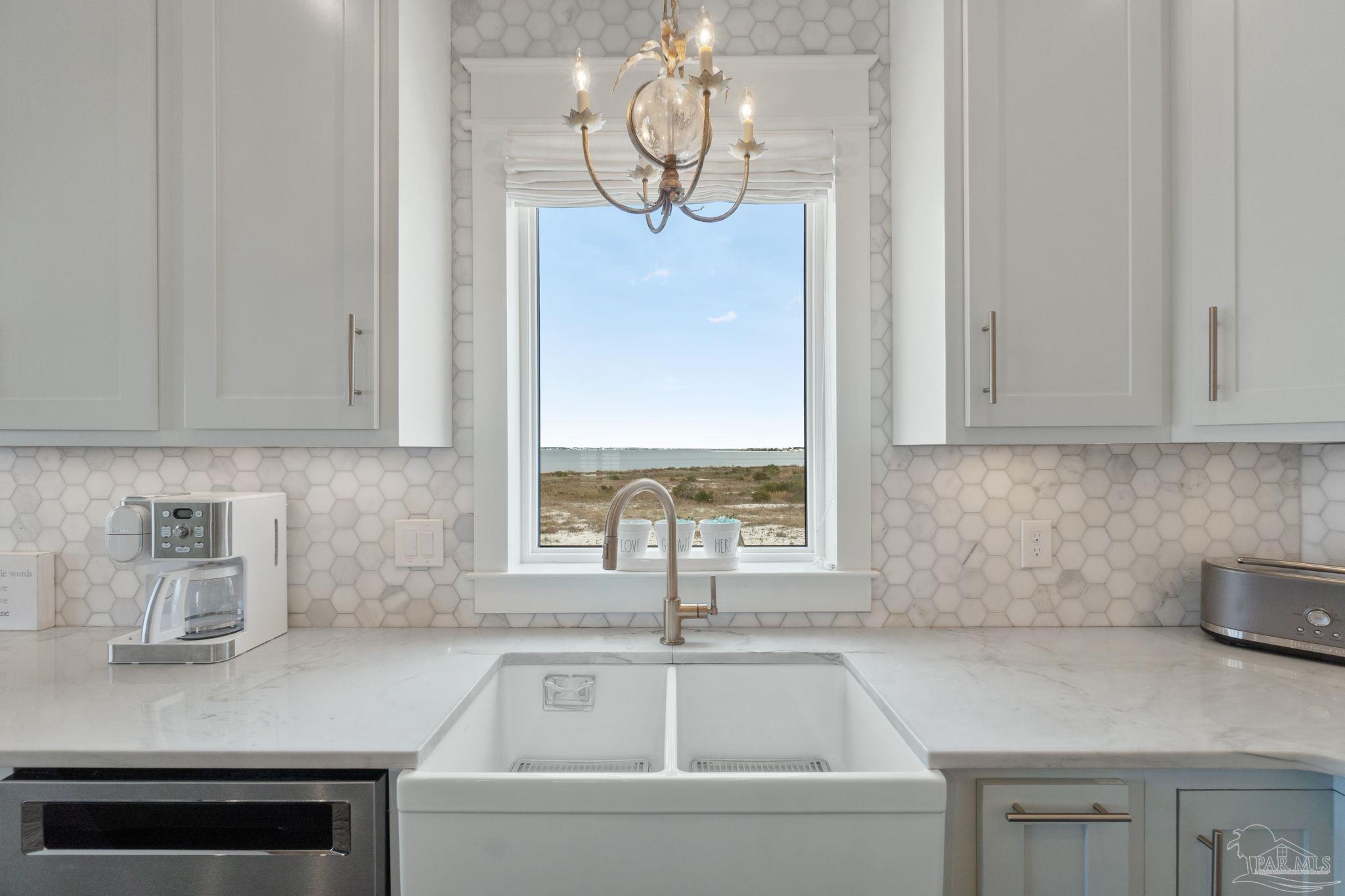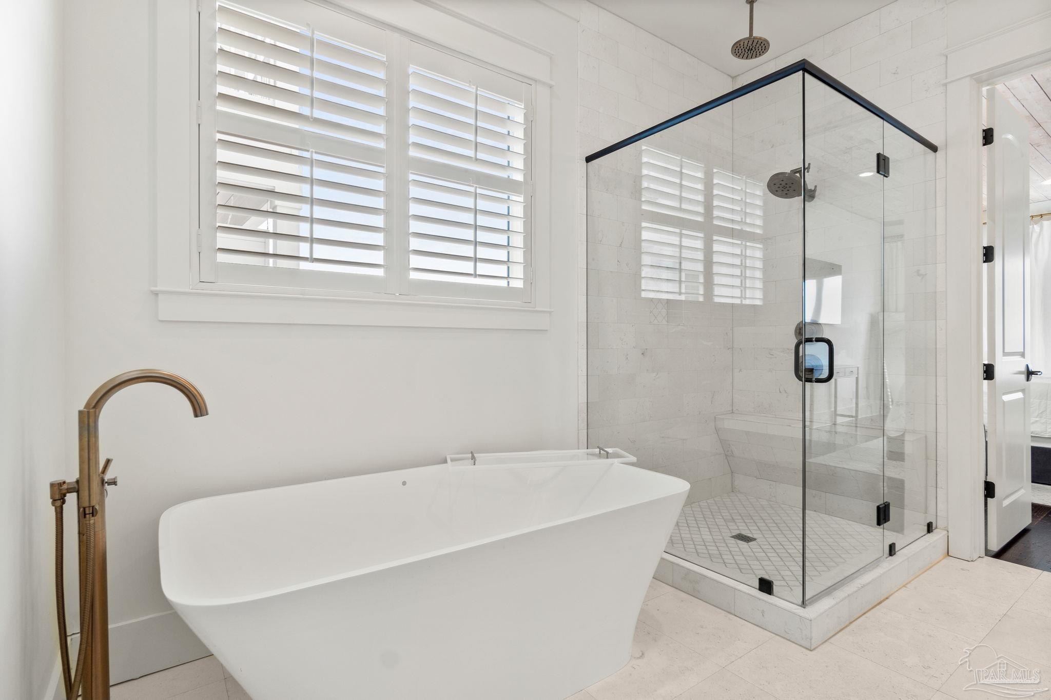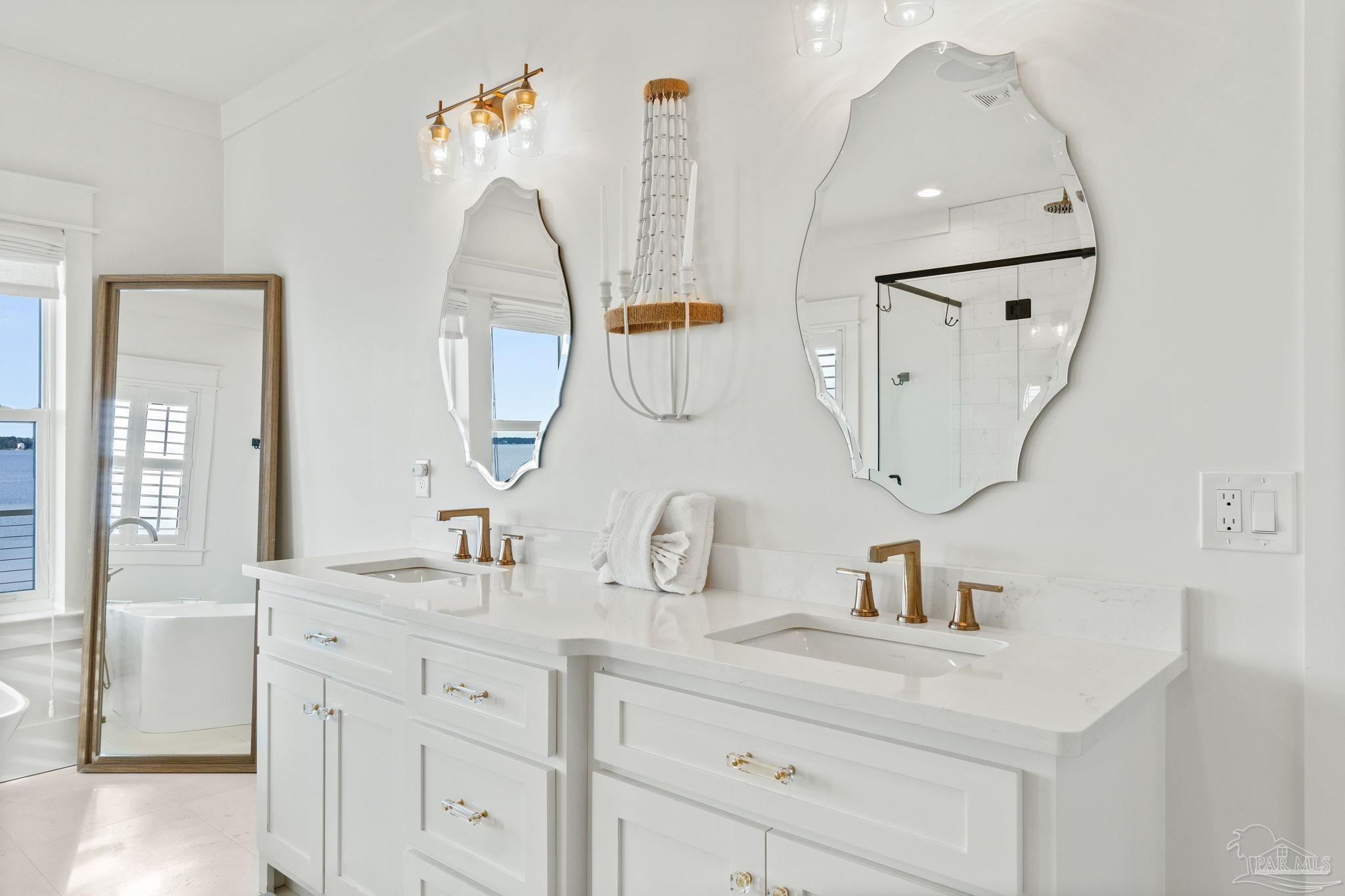 Experience the beauty of Sound-front living in this exceptional Navarre Beach retreat. Perfectly positioned within the private gated community of By the Sea, this custom-built home captures the best of coastal life with over 110 feet of direct waterfront, serene views across the Santa Rosa Sound, and effortless access to the Gulf—just a short stroll or golf cart ride away. Inside, soaring ceilings and wide-plank distressed pine floors create a warm, open feel that complements the coastal surroundings. The home features five bedrooms, each with its own ensuite bath, plus an additional half bath. Two spacious primary suites—one on the main floor and another upstairs—offer peaceful water views, soaking tubs, seamless glass showers, and double vanities. Large windows and glass doors flood the living spaces with natural light and open to covered balconies overlooking the Sound, creating a seamless flow between indoor and outdoor living. The kitchen and main living area are designed for gathering, featuring quartz and marble countertops, soft-close cabinetry, whitewashed cedar accents, and shiplap details. Enjoy the convenience of whole-home audio and video with WiFi control, custom window treatments, and refined lighting throughout. On the top floor, a flexible bonus room with a trundle bed adds extra sleeping space for guests, while a half bath in the garage provides added convenience for beach days. Sold fully furnished with high-end décor (with limited exclusions), the home is ready to enjoy from day one. Outside, flagstone pathways lead to your private stretch of Sound-front beach—perfect for kayaking, paddleboarding, or simply unwinding as the sun sets over the water. The By the Sea community also offers a pool and hot tub for owners and guests. Thoughtfully designed and impeccably maintained, 1464 Seaside Circle is more than a home—it’s a rare opportunity to experience the laid-back luxury and natural beauty that define life on Navarre Beach.