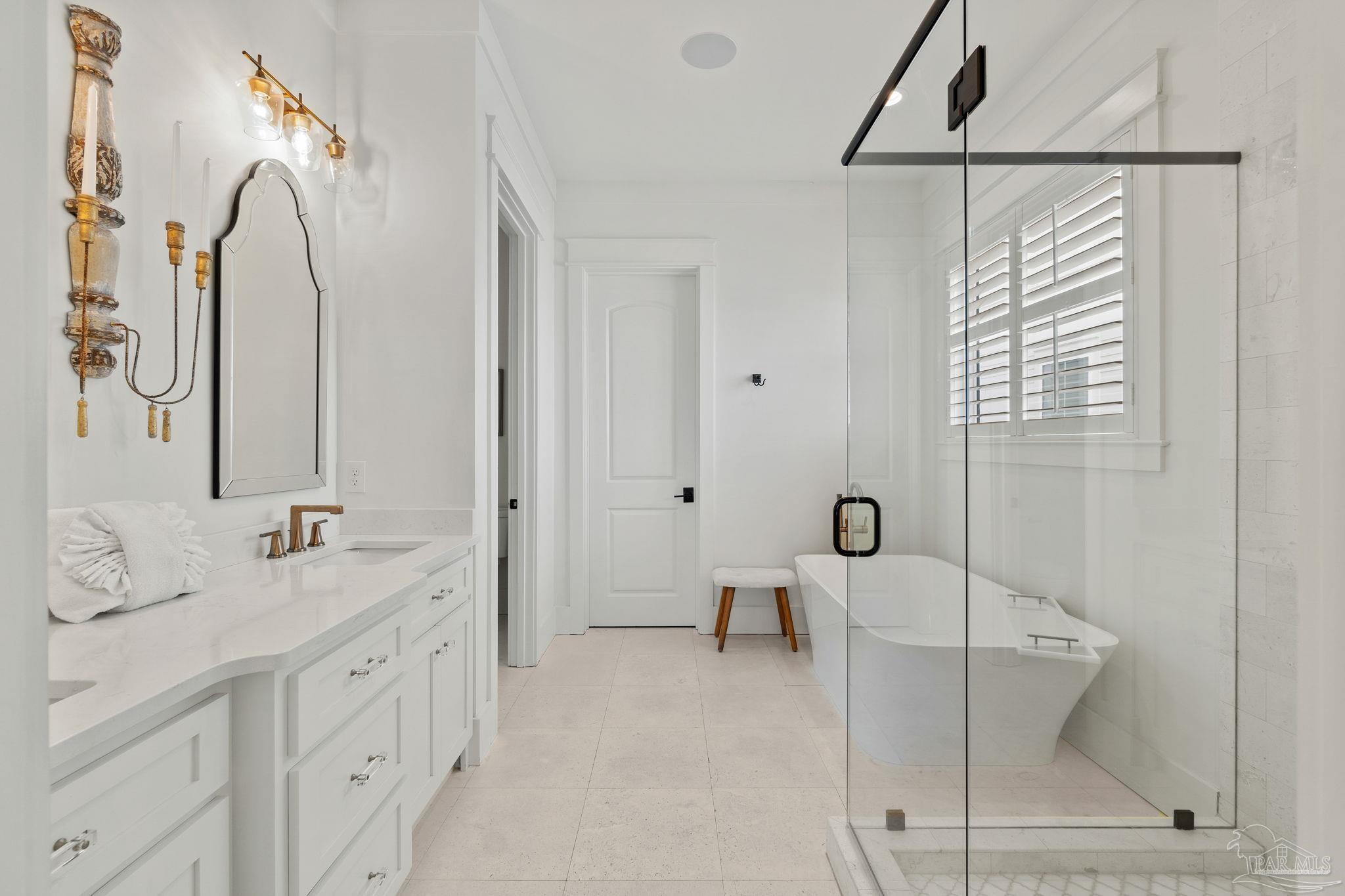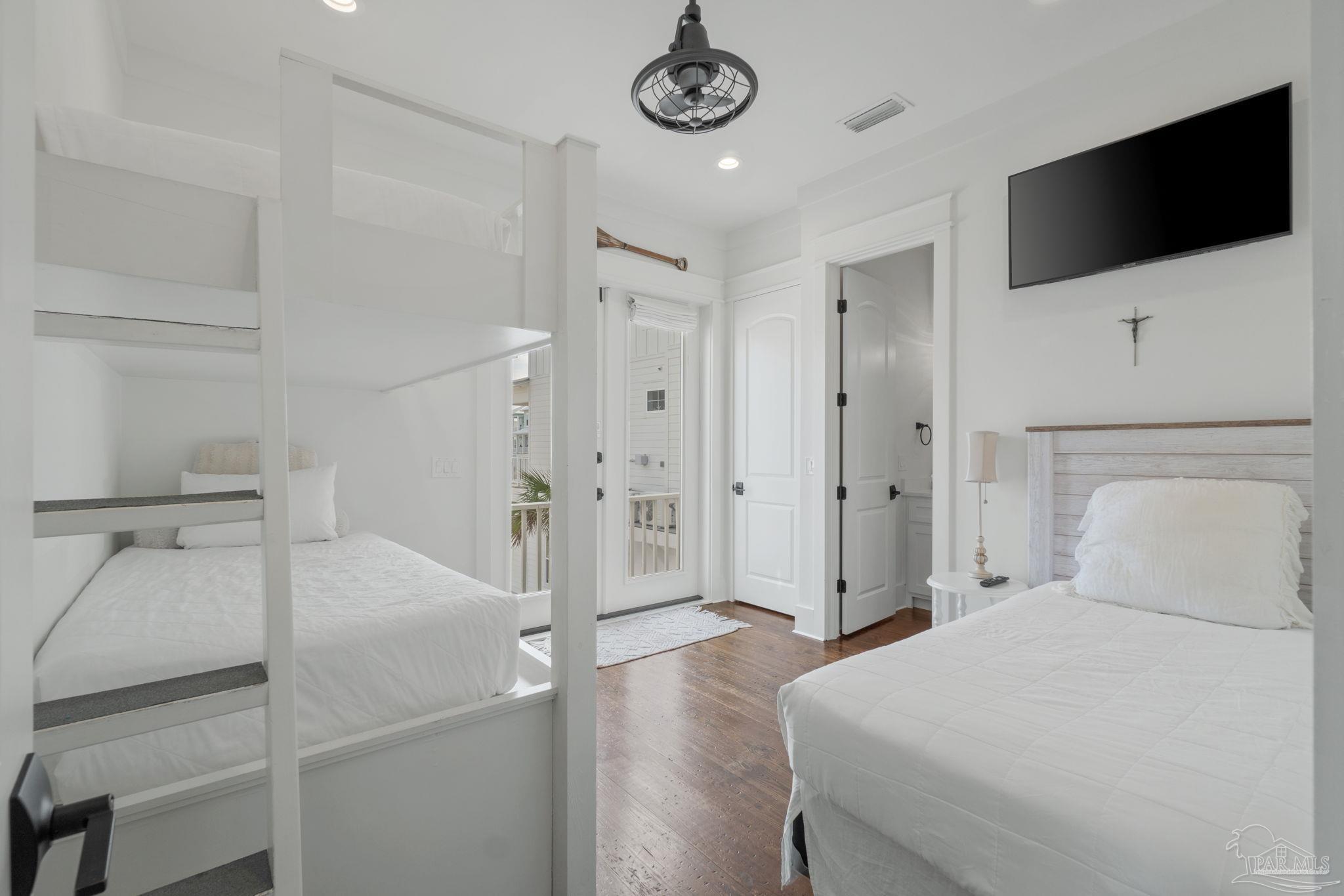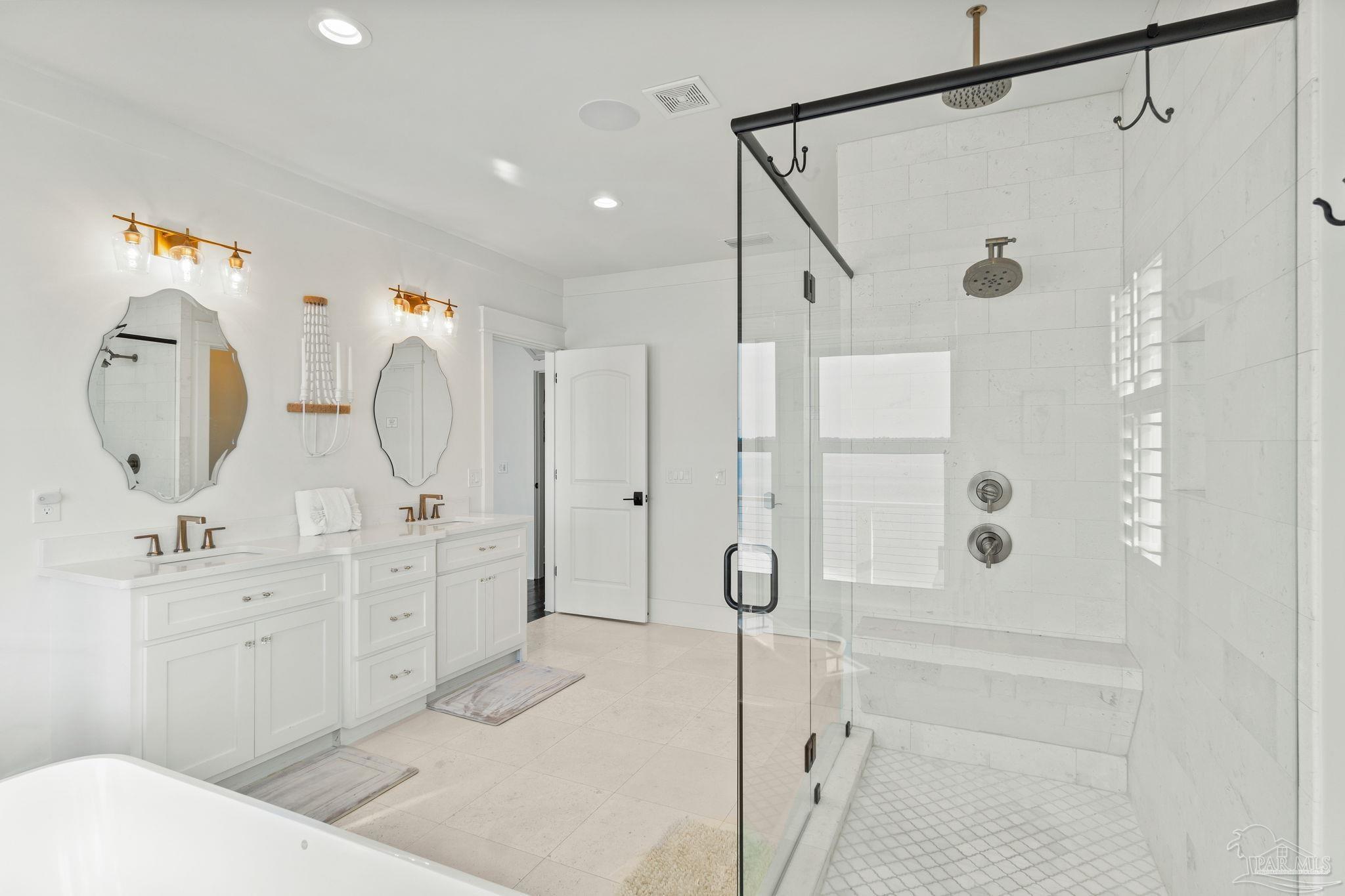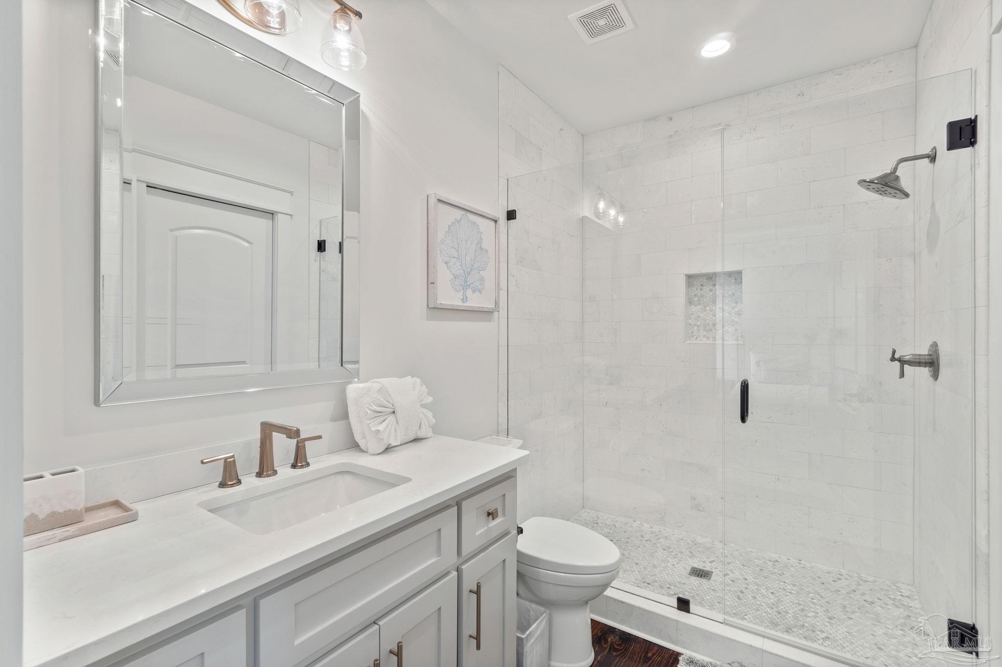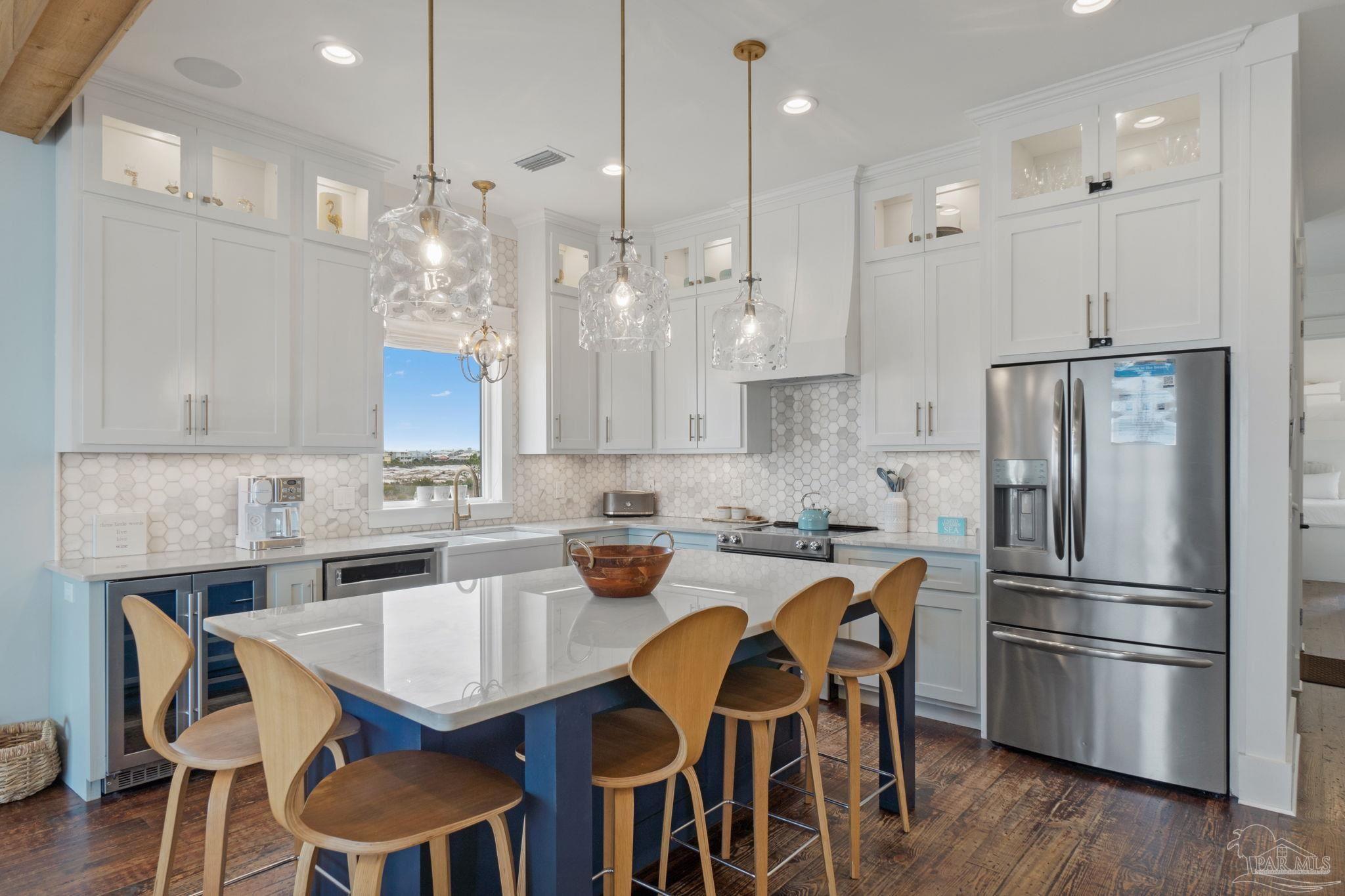 Experience the beauty of Sound-front living in this exceptional Navarre Beach retreat. Perfectly positioned within the private gated community of By the Sea, this custom-built home captures the best of coastal life with over 110 feet of direct waterfront, serene views across the Santa Rosa Sound, and effortless access to the Gulf—just a short stroll or golf cart ride away. Inside, soaring ceilings and wide-plank distressed pine floors create a warm, open feel that complements the coastal surroundings. The home features five bedrooms, each with its own ensuite bath, plus an additional half bath. Two spacious primary suites—one on the main floor and another upstairs—offer peaceful water views, soaking tubs, seamless glass showers, and double vanities. Large windows and glass doors flood the living spaces with natural light and open to covered balconies overlooking the Sound, creating a seamless flow between indoor and outdoor living. The kitchen and main living area are designed for gathering, featuring quartz and marble countertops, soft-close cabinetry, whitewashed cedar accents, and shiplap details. Enjoy the convenience of whole-home audio and video with WiFi control, custom window treatments, and refined lighting throughout. On the top floor, a flexible bonus room with a trundle bed adds extra sleeping space for guests, while a half bath in the garage provides added convenience for beach days. Sold fully furnished with high-end décor (with limited exclusions), the home is ready to enjoy from day one. Outside, flagstone pathways lead to your private stretch of Sound-front beach—perfect for kayaking, paddleboarding, or simply unwinding as the sun sets over the water. The By the Sea community also offers a pool and hot tub for owners and guests. Thoughtfully designed and impeccably maintained, 1464 Seaside Circle is more than a home—it’s a rare opportunity to experience the laid-back luxury and natural beauty that define life on Navarre Beach.