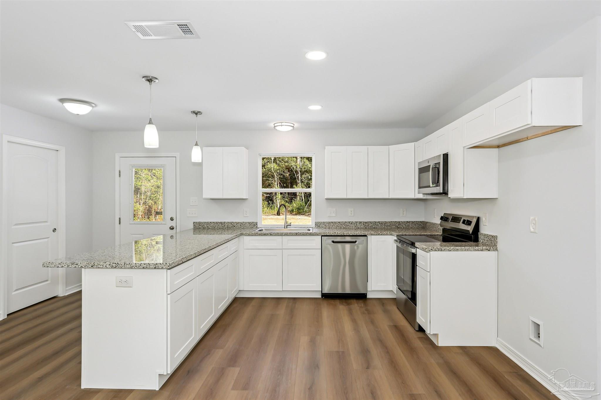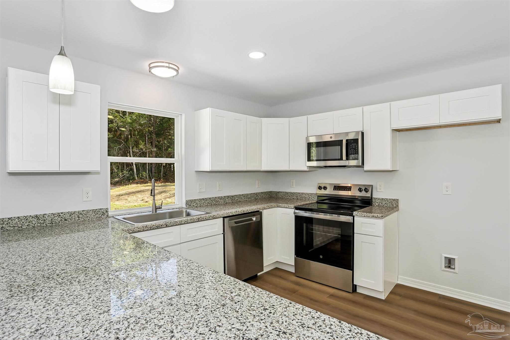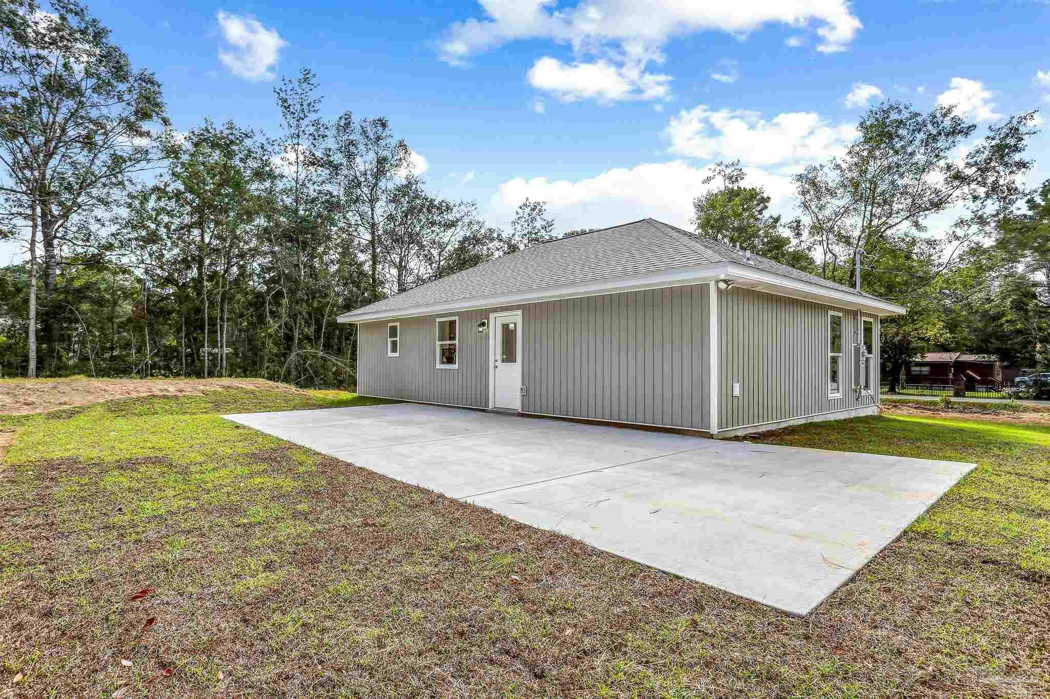 Beautiful New Construction Home on .53 Acres!!!! Come see this brand new home centrally located with easy access to schools, I-10, shopping and restaurants. This wonderful open floor plan is bright and spacious. The Kitchen has White Shaker Style, soft close cabinets, large stainless steel sink with window that over looks the backyard and stainless steel appliances. The counter tops are Granite and there is a bar that will easily accommodate seating for 4 with accent pendant lights. The Laundry room is located off the Kitchen and has shelving for Pantry items. The large Master Bedroom has a walk-in closet and private bath with nice sized shower and linen nook. The additional bedroom is on the other side of the home with a full bath to service it. The home has easy to maintain LVP throughout. The extremely large patio on the back of the home offers a view of the partially wooded lot. The large lot has limitless potential!! There is room to put it a large workshop, pad for RV parking, plant a garden, install a pool or make a large kids play area. Let your imagination run wild here!!! Hurry though! This one won't last long!!!!