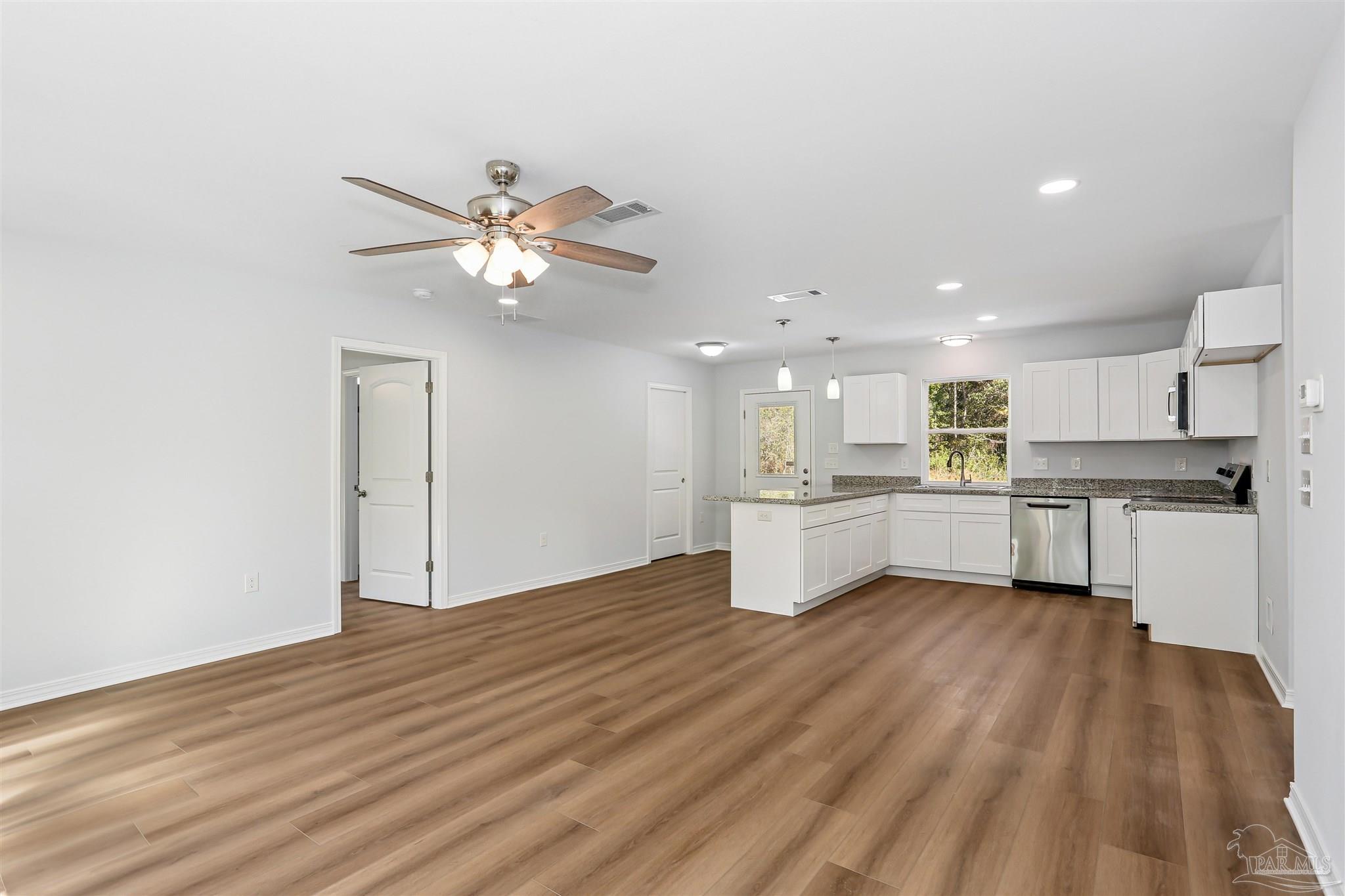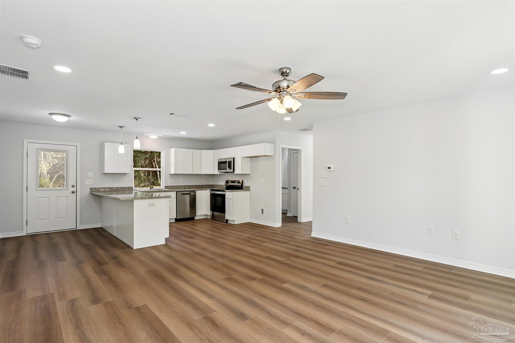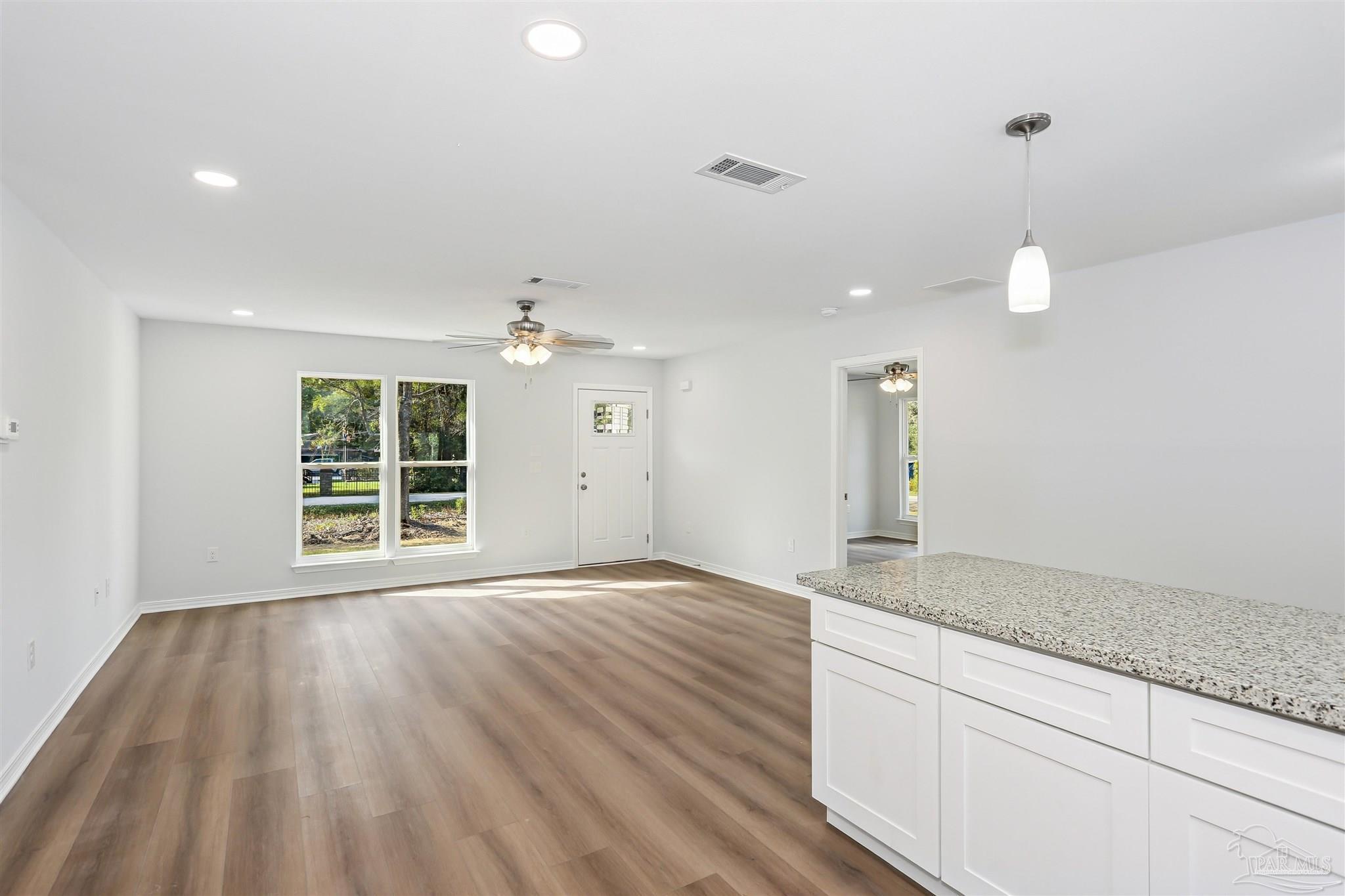 Beautiful New Construction Home on .53 Acres!!!! Come see this brand new home centrally located with easy access to schools, I-10, shopping and restaurants. This wonderful open floor plan is bright and spacious. The Kitchen has White Shaker Style, soft close cabinets, large stainless steel sink with window that over looks the backyard and stainless steel appliances. The counter tops are Granite and there is a bar that will easily accommodate seating for 4 with accent pendant lights. The Laundry room is located off the Kitchen and has shelving for Pantry items. The large Master Bedroom has a walk-in closet and private bath with nice sized shower and linen nook. The additional bedroom is on the other side of the home with a full bath to service it. The home has easy to maintain LVP throughout. The extremely large patio on the back of the home offers a view of the partially wooded lot. The large lot has limitless potential!! There is room to put it a large workshop, pad for RV parking, plant a garden, install a pool or make a large kids play area. Let your imagination run wild here!!! Hurry though! This one won't last long!!!!