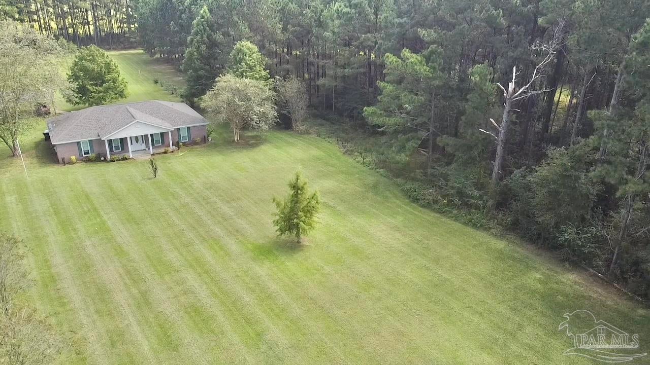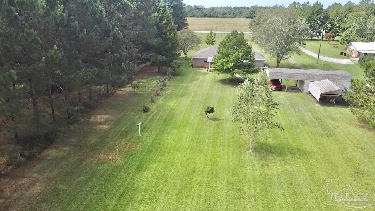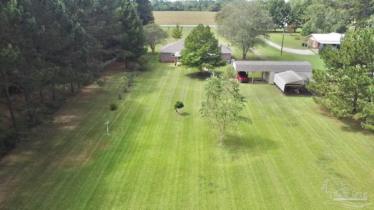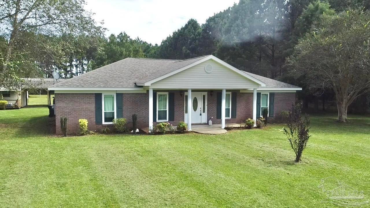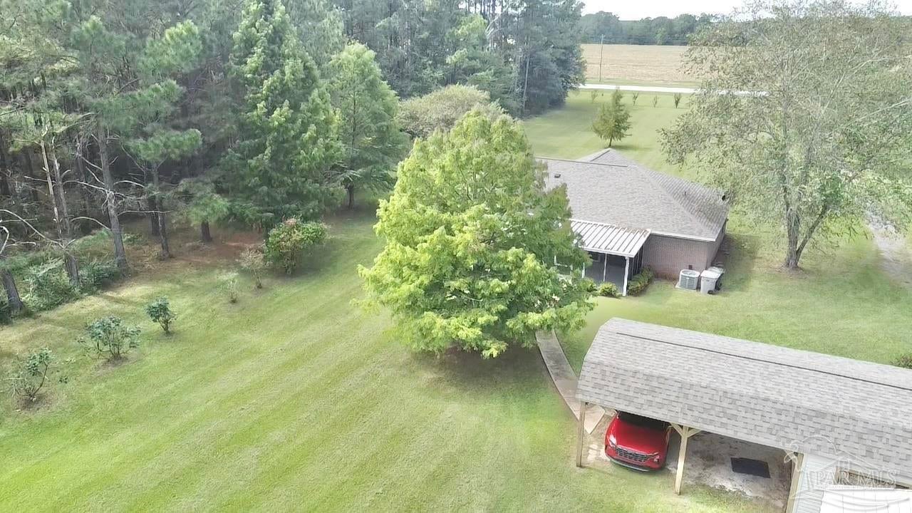 Discover the perfect blend of peaceful rural living and convenient access in this charming brick home situated on over 2 acres just 15 minutes from downtown Atmore, AL, and 30 minutes from Pensacola, FL. Enjoy breathtaking views of lush woodlands and well-maintained crop land from the spacious screened back porch, featuring a dedicated cookout nook perfect for outdoor gatherings. The open-concept floor plan thoughtfully separates the primary ensuite bedroom and private bath from two additional guest bedrooms and a full bathroom, offering privacy and comfort. Each bedroom boasts walk-in closets for ample storage, while the oversized laundry room and walk-in pantry complement the fully equipped kitchen. Additional highlights include a detached 24' x 16' storage building with an attached double carport and a rear yard equipment shed—ideal for all your storage needs. Don’t miss this exceptional opportunity to own a meticulously maintained home in a serene setting! ALL SQ. FOOTAGE AND DIMENSIONS ARE APPROXIMATE AND IS THE BUYER'S RESPONSIBILITY TO VERIFY.