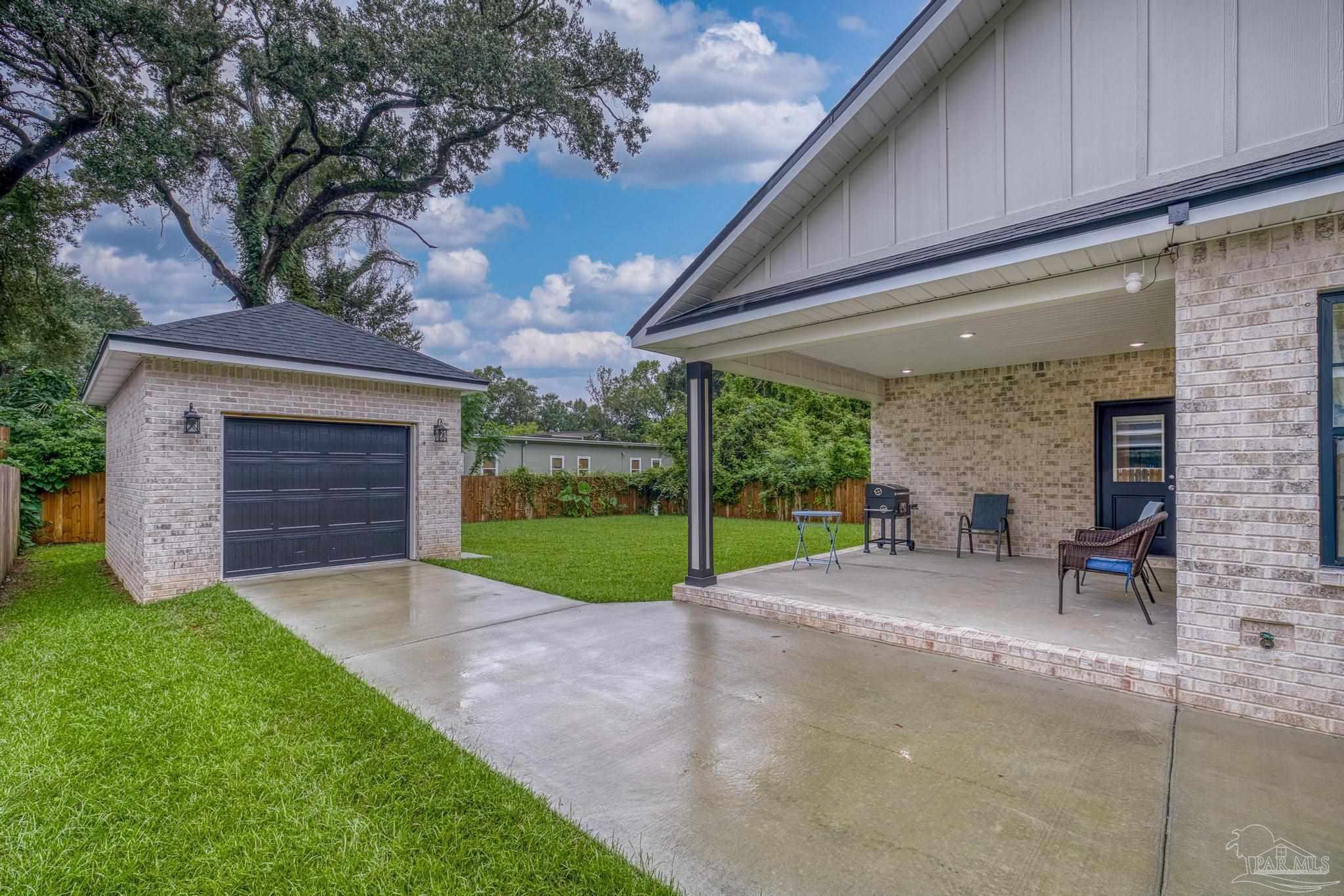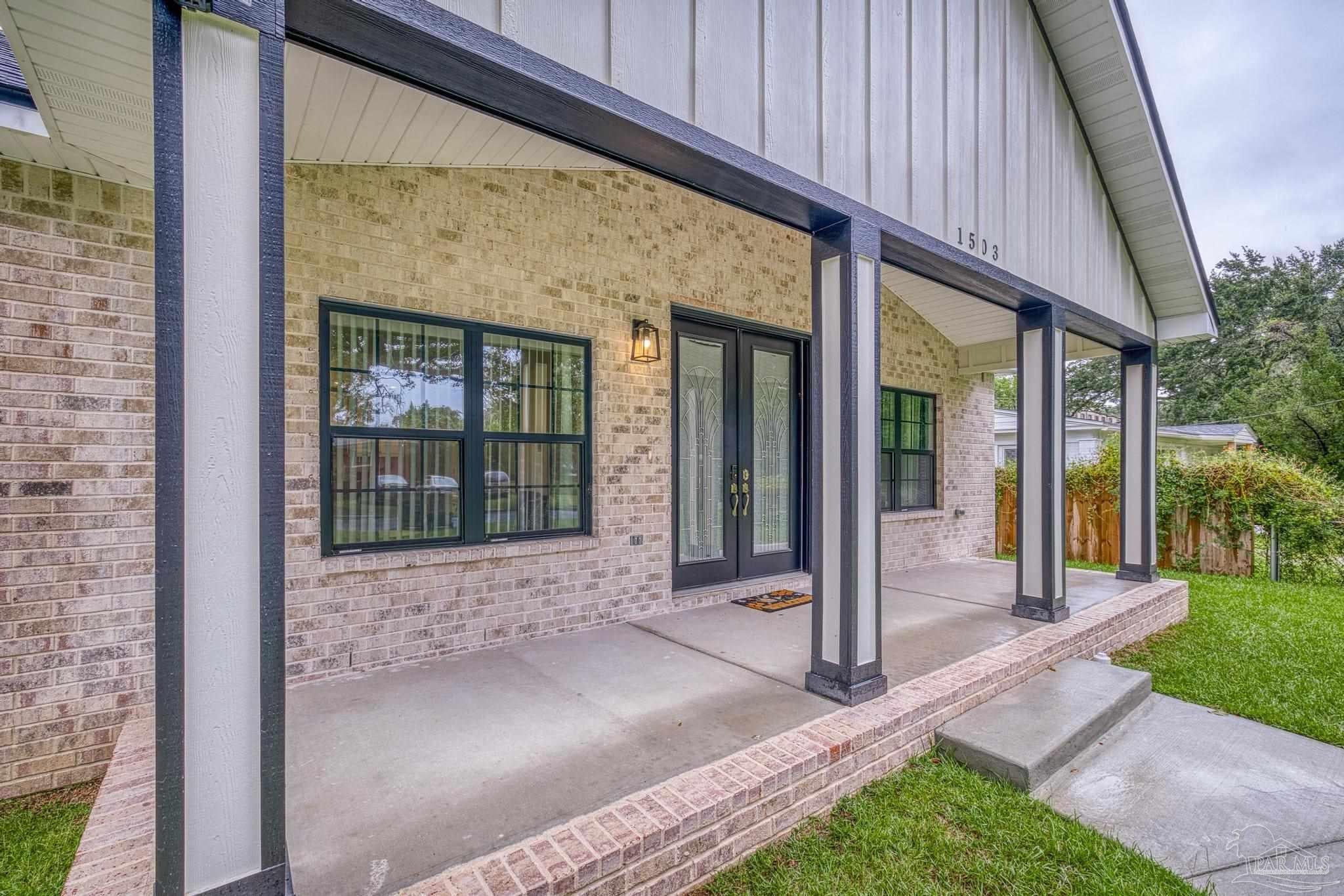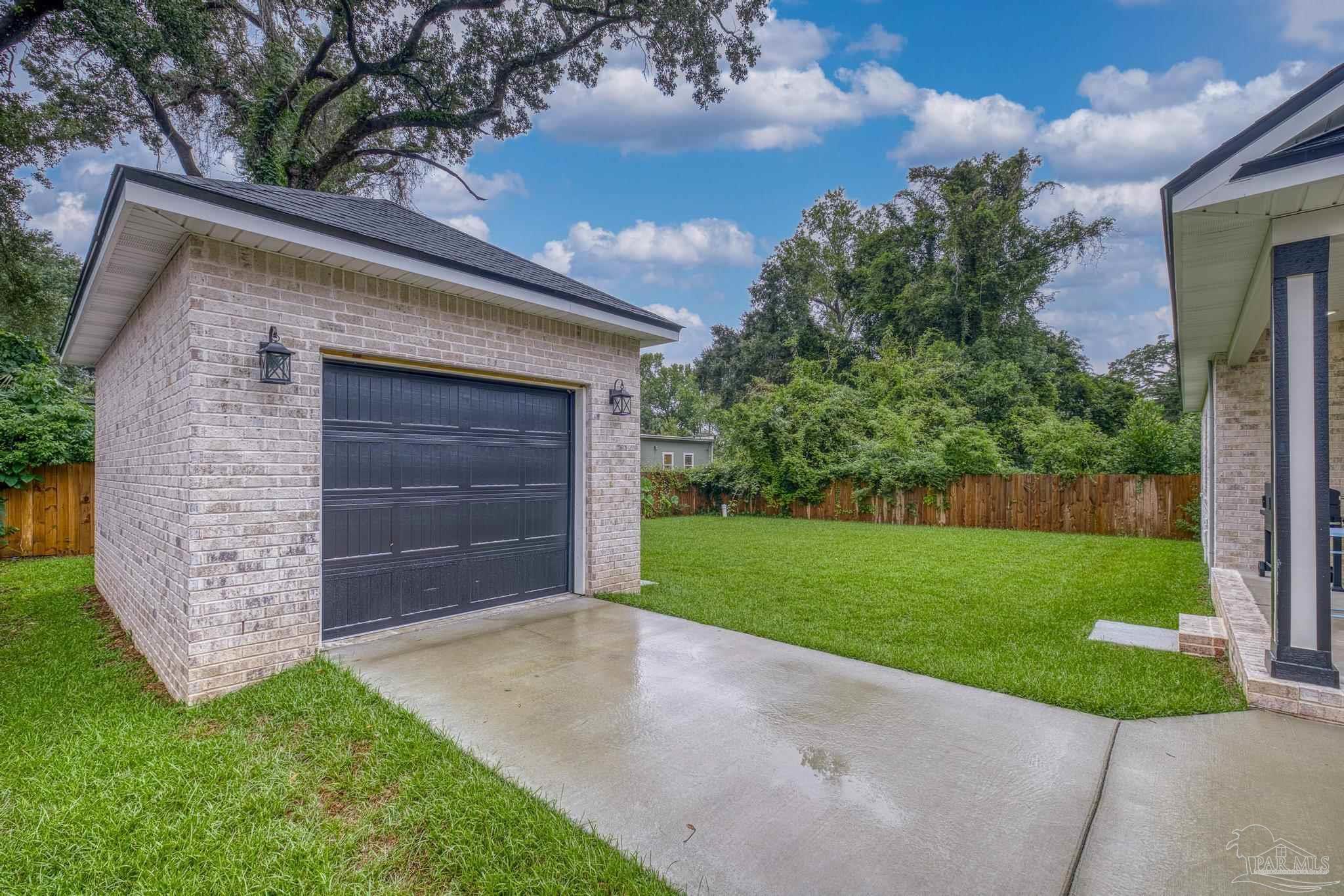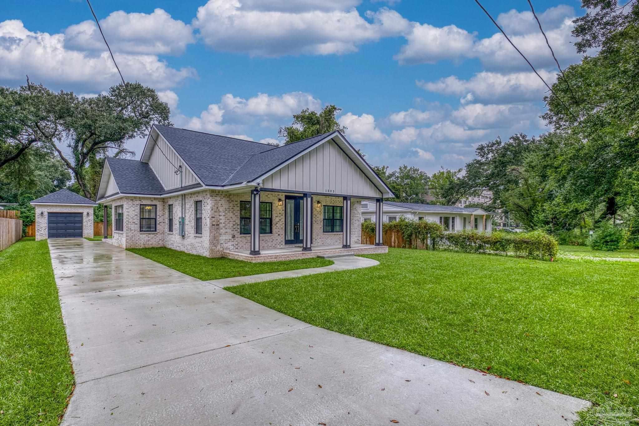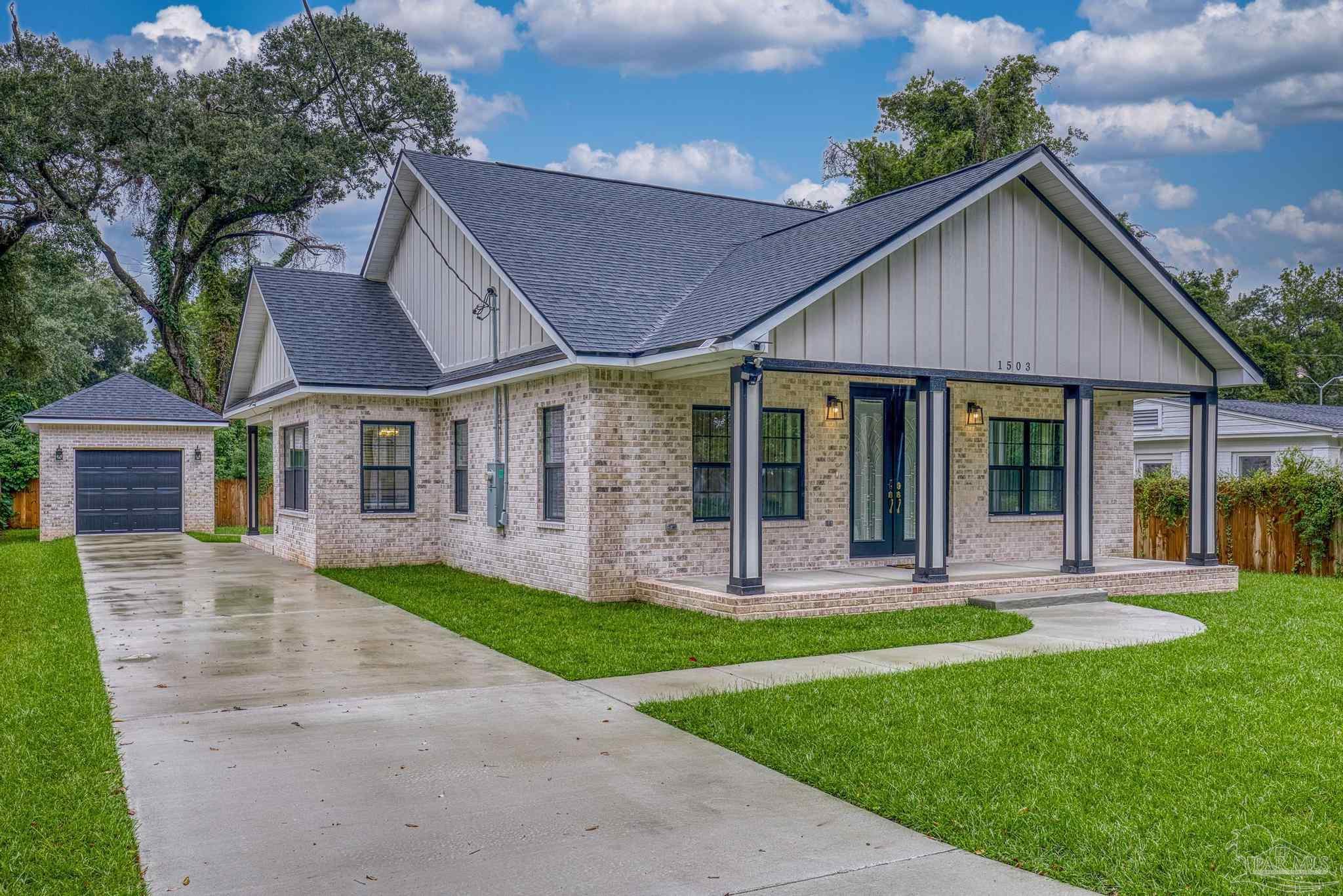 Discover this stunning 2024-built brick Craftsman home, featuring 3 bedrooms, 2.5 bathrooms, and a detached 1-car garage on a .21-acre lot with no HOA—perfect for homeowners or investors. Just minutes from downtown Pensacola, enjoy easy access to restaurants, shopping, and local attractions. This home is being sold turn-key and fully furnished, making it a perfect move-in ready opportunity or investment rental. Step onto the large covered front porch and admire the well-manicured lawn. Inside, wide-plank LVP flooring, bright neutral paint, and abundant natural light create a welcoming and modern atmosphere. The living room boasts a tray ceiling, enhancing the open and airy feel. The open-concept kitchen features stainless steel appliances, modern fixtures, a large island with sink and breakfast bar, and an eat-in dining area—ideal for everyday meals or entertaining. Retreat to the primary suite, complete with a tray ceiling, modern lighting, a large walk-in closet, and a luxurious primary bathroom with granite countertops, double sinks, and a glass-enclosed walk-in tile shower. Both guest bedrooms include walk-in closets for added storage. Convenient indoor laundry adds practicality. Relax in the lush backyard with a covered patio, perfect for outdoor living or entertaining. Additional features include a transferrable roof warranty, making this move-in ready home both stylish and low-maintenance. This brick Craftsman home near downtown Pensacola offers modern living, charm, and strong investment potential—all in one beautifully furnished, turnkey package.