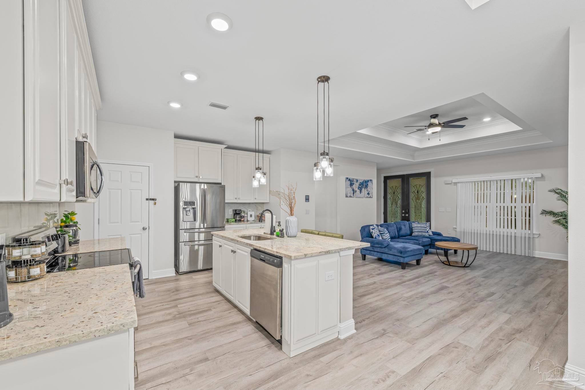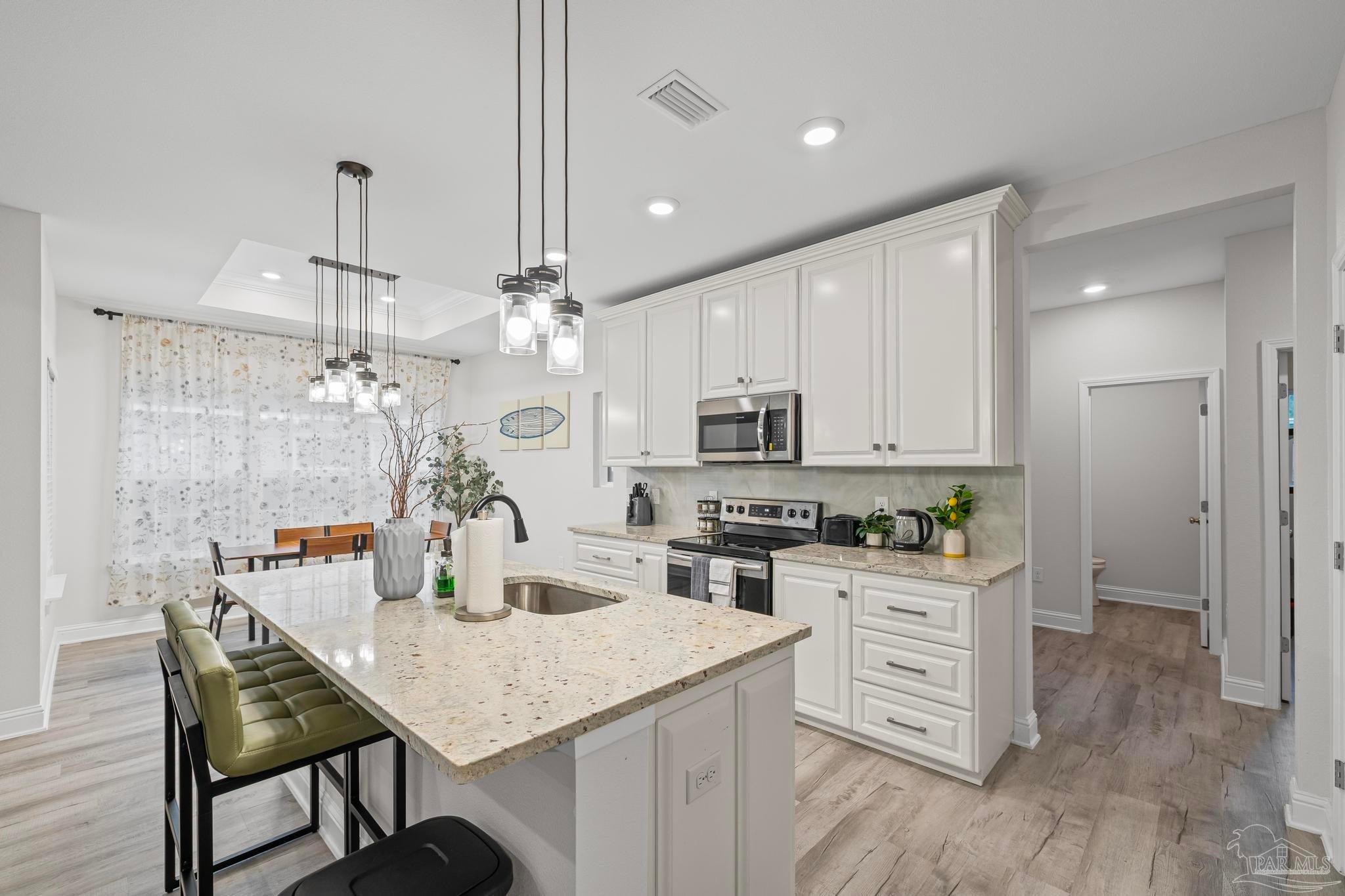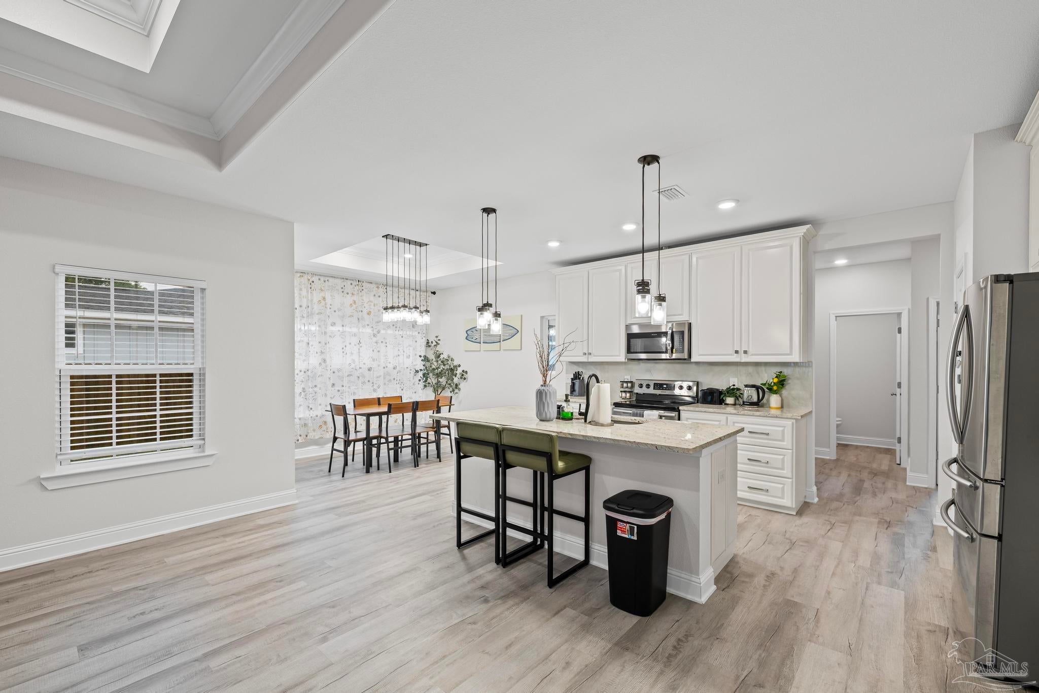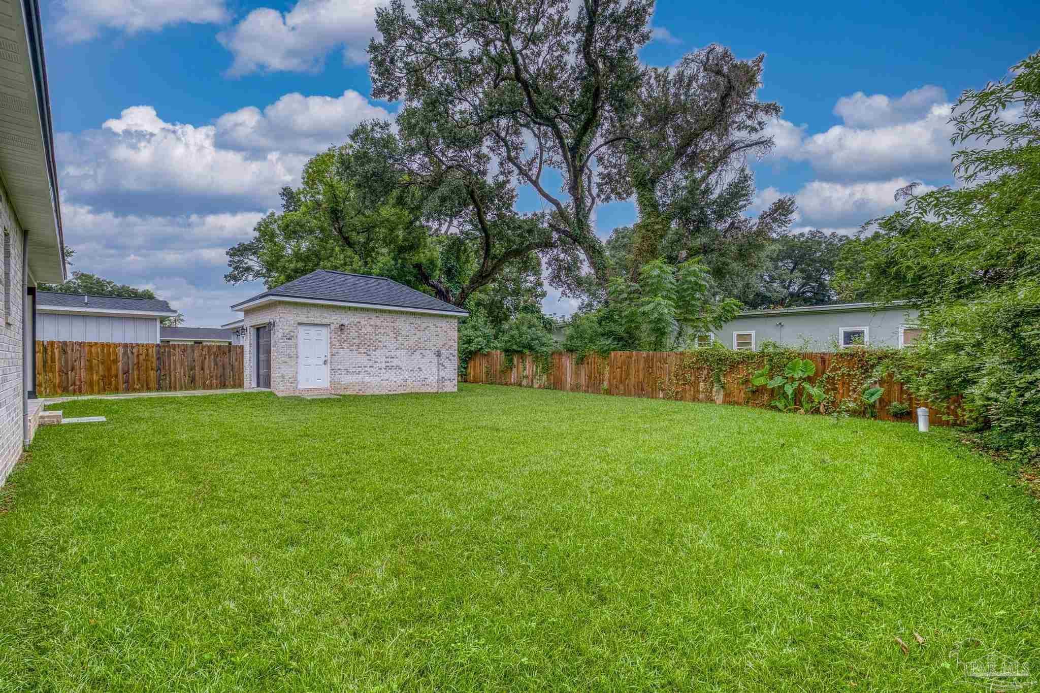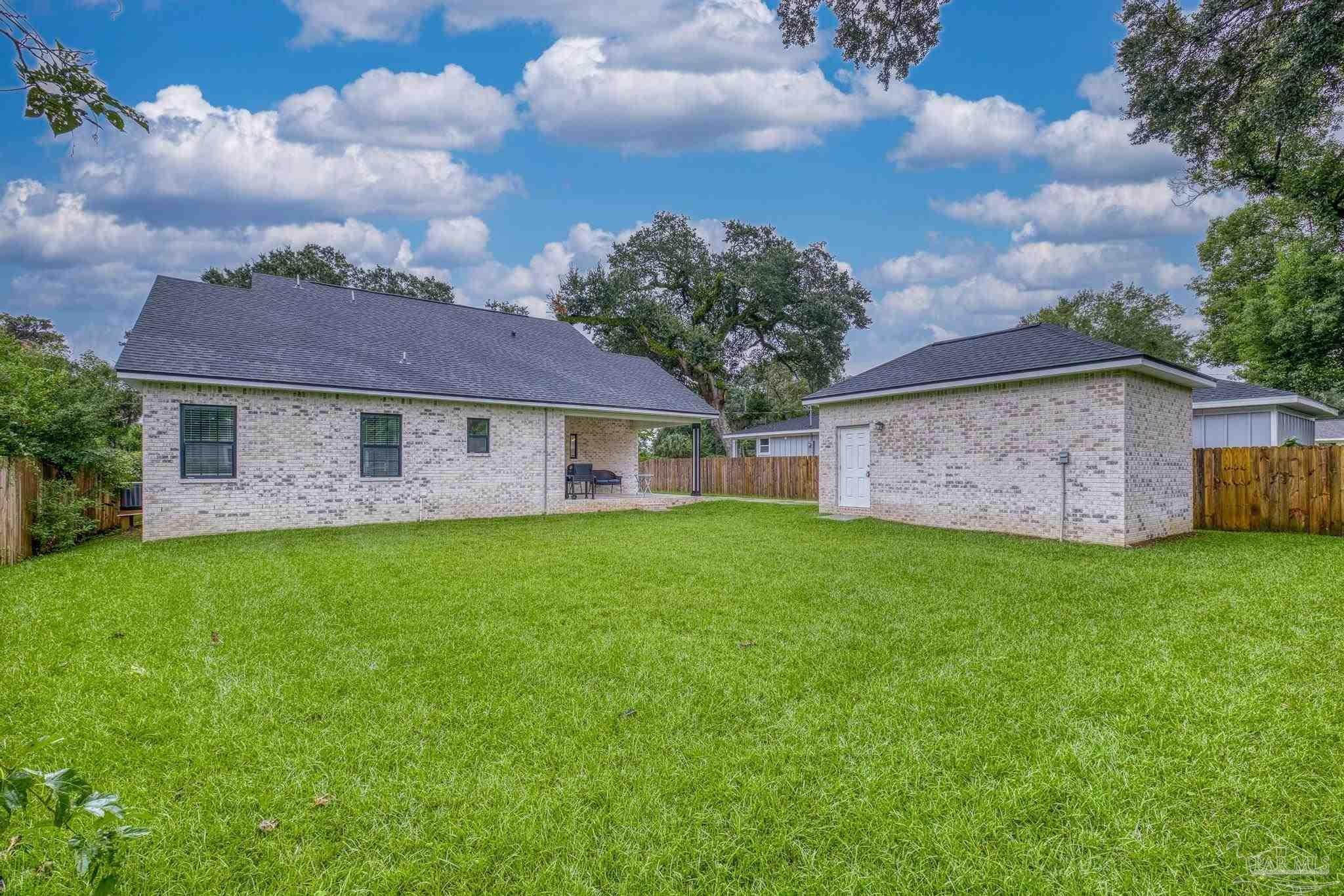 Discover this stunning 2024-built brick Craftsman home, featuring 3 bedrooms, 2.5 bathrooms, and a detached 1-car garage on a .21-acre lot with no HOA—perfect for homeowners or investors. Just minutes from downtown Pensacola, enjoy easy access to restaurants, shopping, and local attractions. This home is being sold turn-key and fully furnished, making it a perfect move-in ready opportunity or investment rental. Step onto the large covered front porch and admire the well-manicured lawn. Inside, wide-plank LVP flooring, bright neutral paint, and abundant natural light create a welcoming and modern atmosphere. The living room boasts a tray ceiling, enhancing the open and airy feel. The open-concept kitchen features stainless steel appliances, modern fixtures, a large island with sink and breakfast bar, and an eat-in dining area—ideal for everyday meals or entertaining. Retreat to the primary suite, complete with a tray ceiling, modern lighting, a large walk-in closet, and a luxurious primary bathroom with granite countertops, double sinks, and a glass-enclosed walk-in tile shower. Both guest bedrooms include walk-in closets for added storage. Convenient indoor laundry adds practicality. Relax in the lush backyard with a covered patio, perfect for outdoor living or entertaining. Additional features include a transferrable roof warranty, making this move-in ready home both stylish and low-maintenance. This brick Craftsman home near downtown Pensacola offers modern living, charm, and strong investment potential—all in one beautifully furnished, turnkey package.