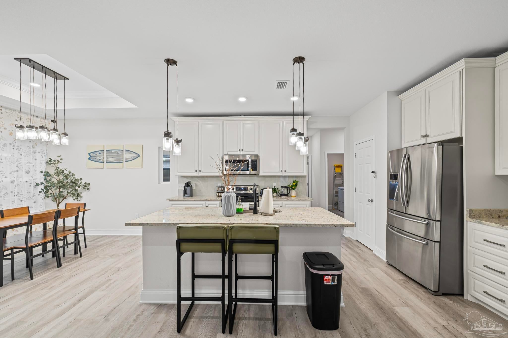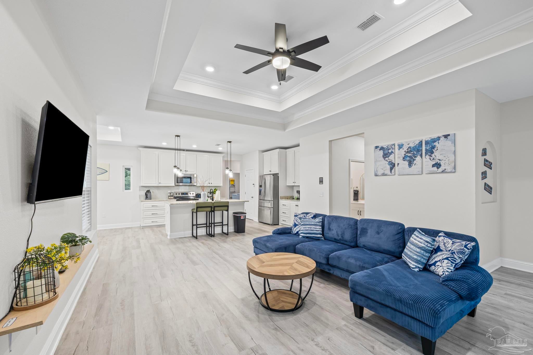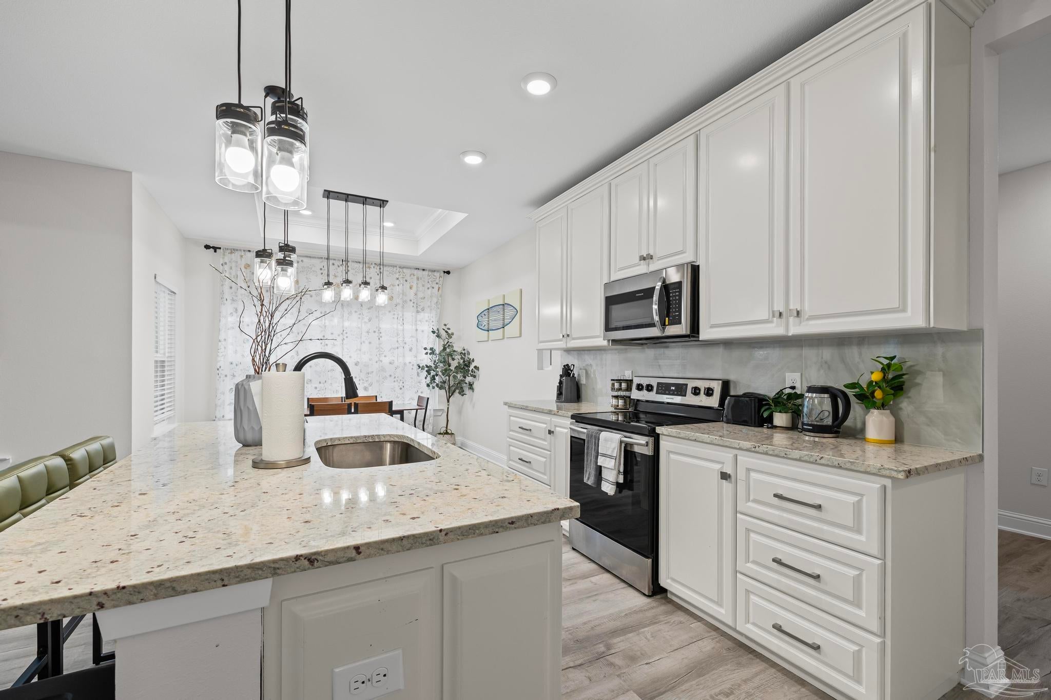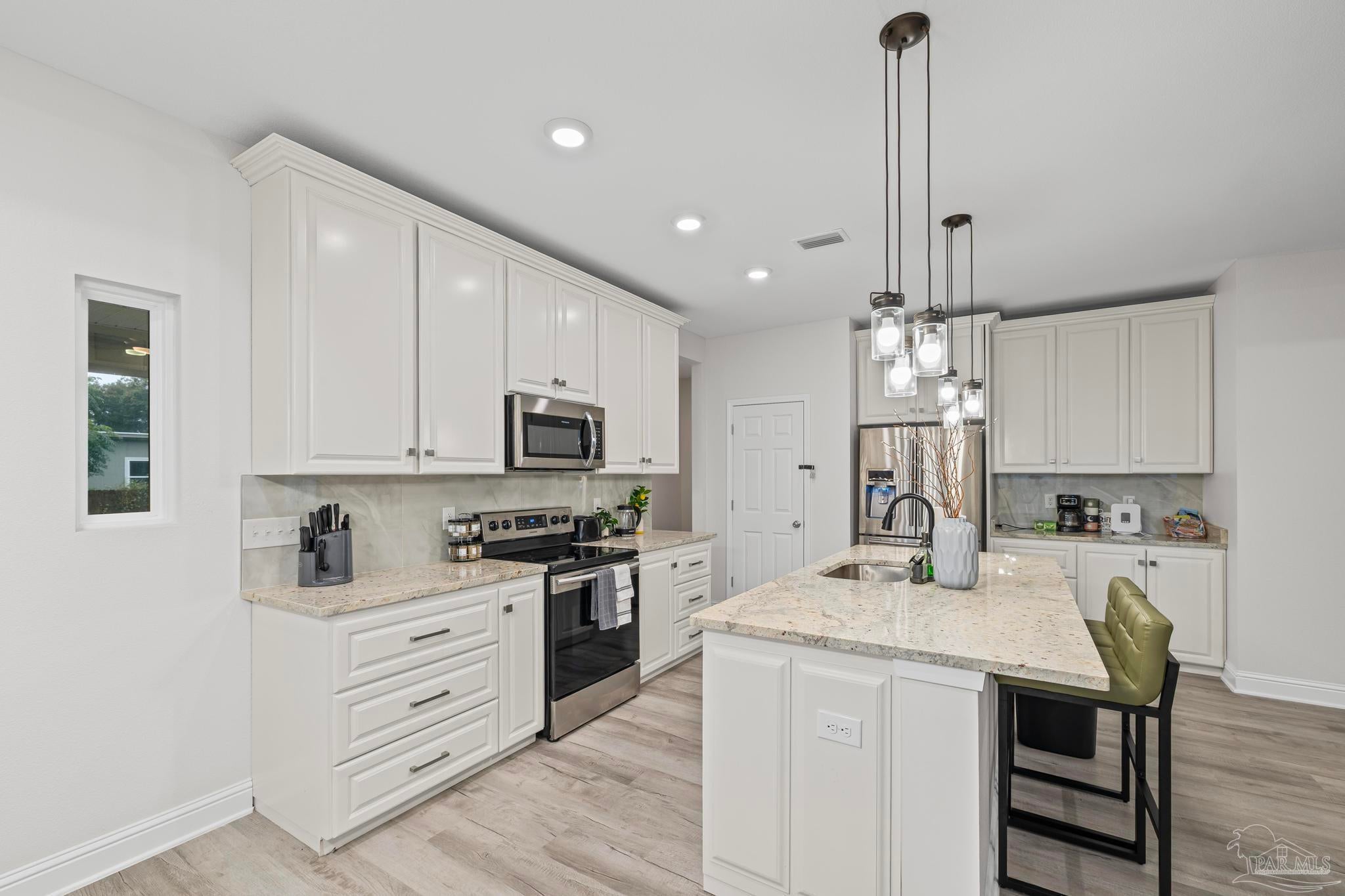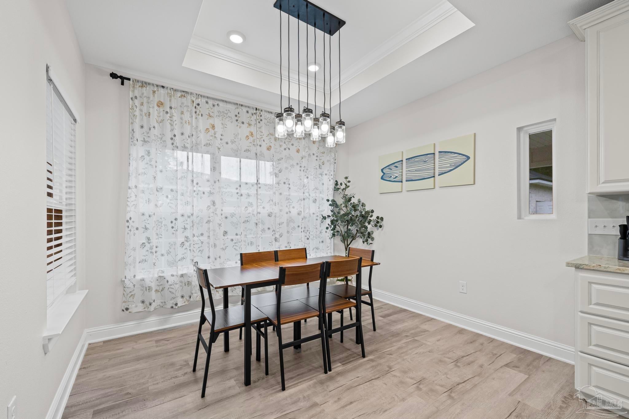 Discover this stunning 2024-built brick Craftsman home, featuring 3 bedrooms, 2.5 bathrooms, and a detached 1-car garage on a .21-acre lot with no HOA—perfect for homeowners or investors. Just minutes from downtown Pensacola, enjoy easy access to restaurants, shopping, and local attractions. This home is being sold turn-key and fully furnished, making it a perfect move-in ready opportunity or investment rental. Step onto the large covered front porch and admire the well-manicured lawn. Inside, wide-plank LVP flooring, bright neutral paint, and abundant natural light create a welcoming and modern atmosphere. The living room boasts a tray ceiling, enhancing the open and airy feel. The open-concept kitchen features stainless steel appliances, modern fixtures, a large island with sink and breakfast bar, and an eat-in dining area—ideal for everyday meals or entertaining. Retreat to the primary suite, complete with a tray ceiling, modern lighting, a large walk-in closet, and a luxurious primary bathroom with granite countertops, double sinks, and a glass-enclosed walk-in tile shower. Both guest bedrooms include walk-in closets for added storage. Convenient indoor laundry adds practicality. Relax in the lush backyard with a covered patio, perfect for outdoor living or entertaining. Additional features include a transferrable roof warranty, making this move-in ready home both stylish and low-maintenance. This brick Craftsman home near downtown Pensacola offers modern living, charm, and strong investment potential—all in one beautifully furnished, turnkey package.