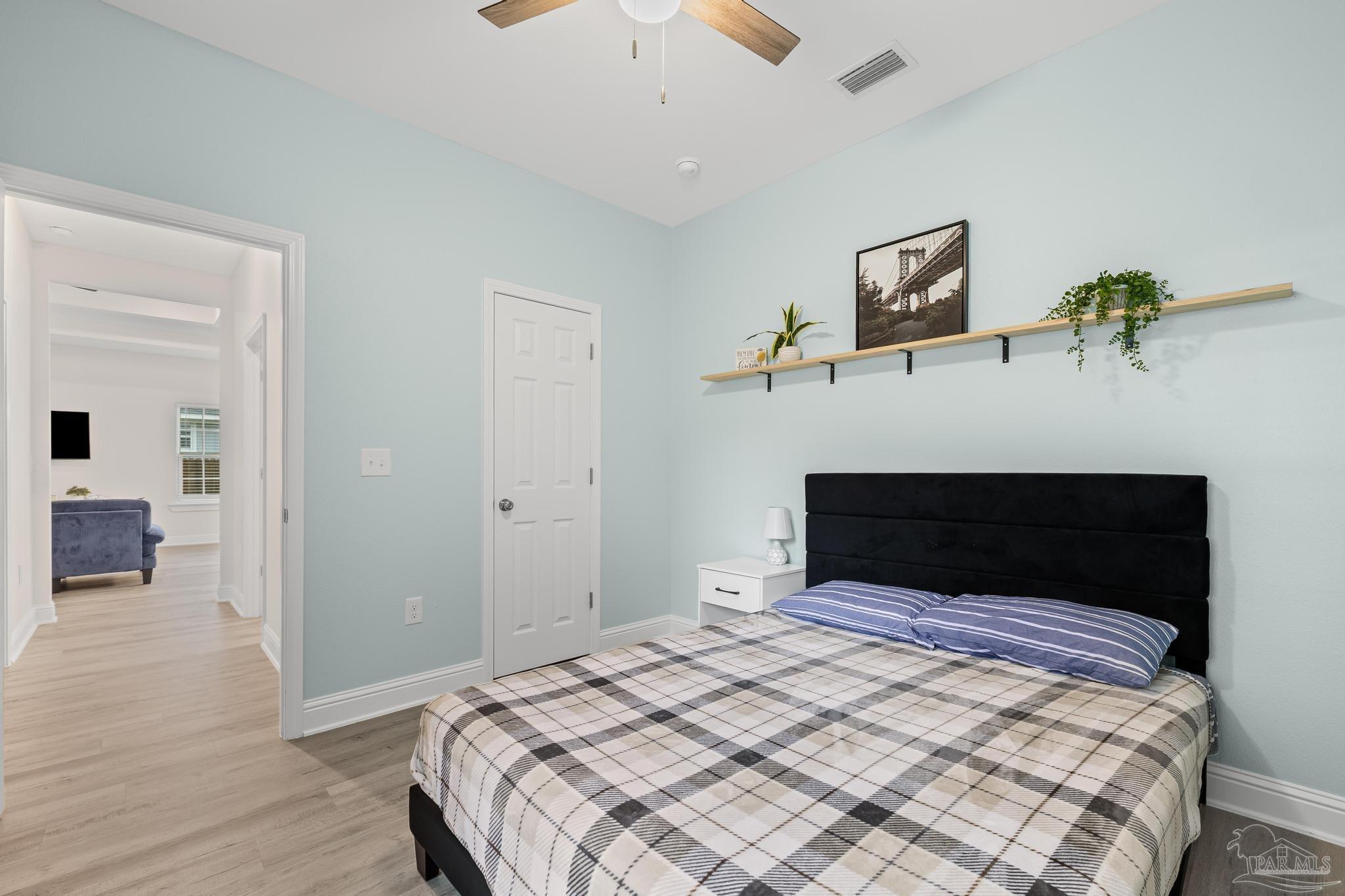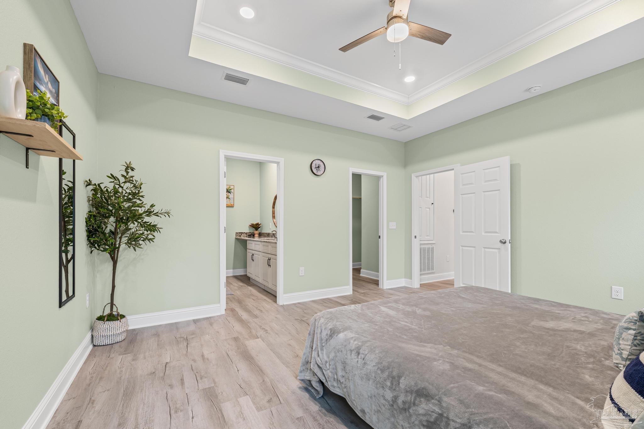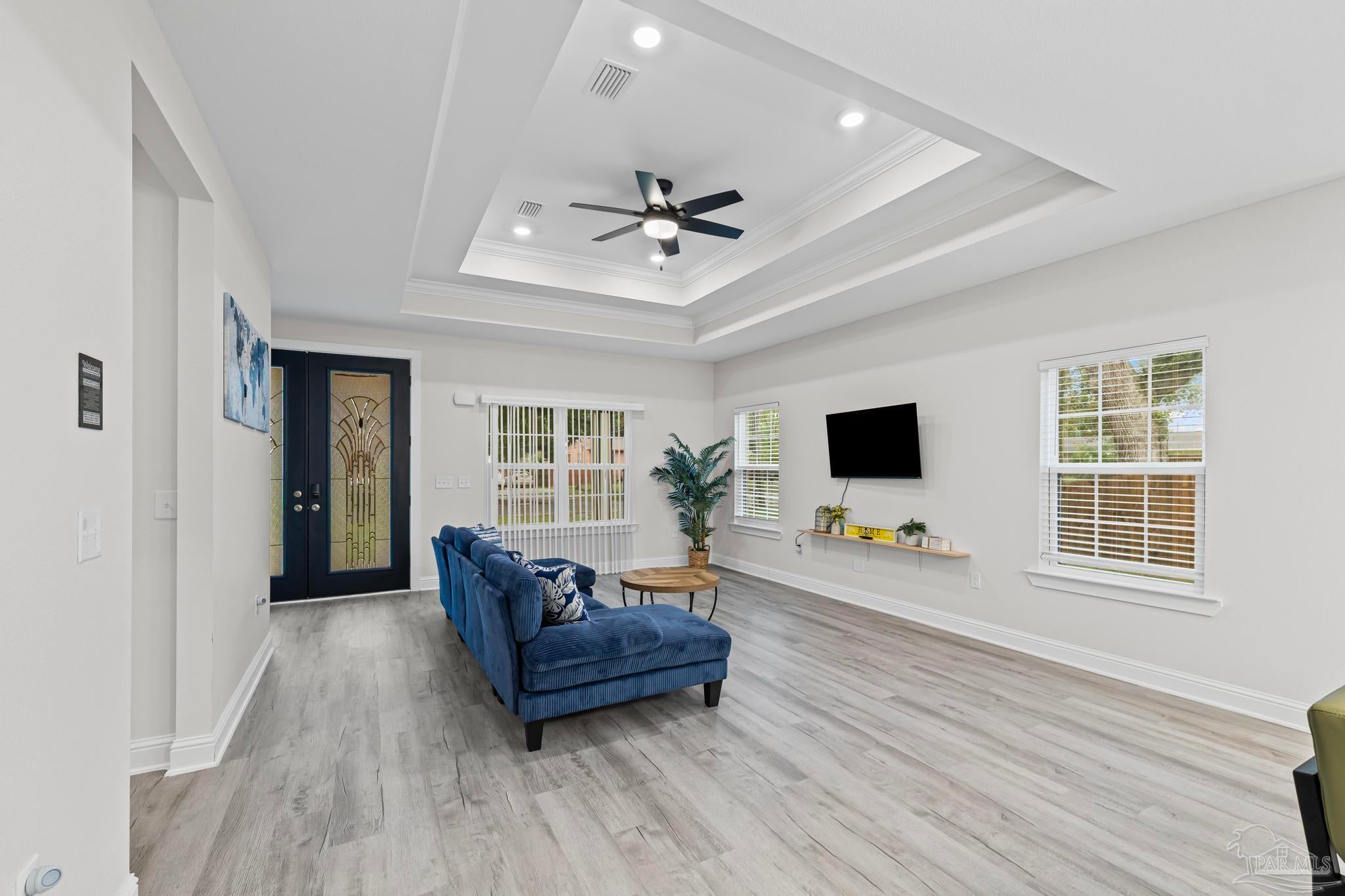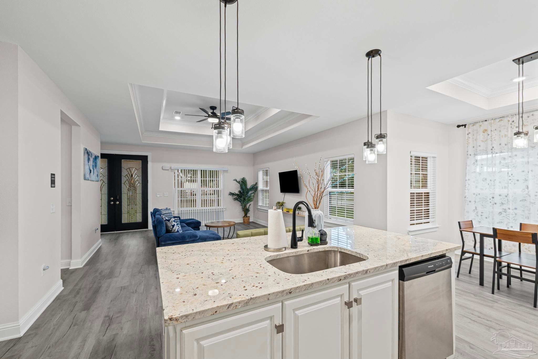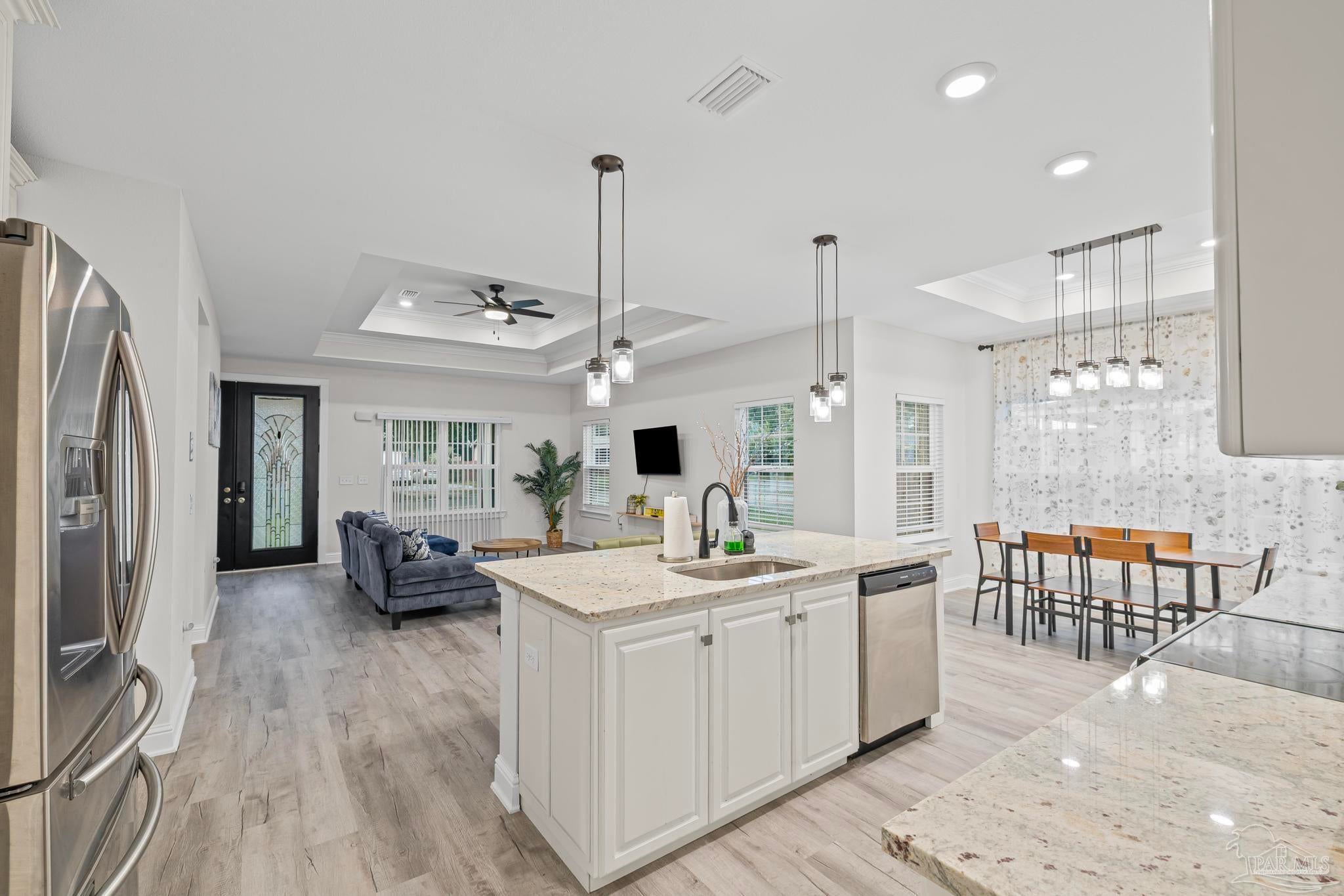 Discover this stunning 2024-built brick Craftsman home, featuring 3 bedrooms, 2.5 bathrooms, and a detached 1-car garage on a .21-acre lot with no HOA—perfect for homeowners or investors. Just minutes from downtown Pensacola, enjoy easy access to restaurants, shopping, and local attractions. This home is being sold turn-key and fully furnished, making it a perfect move-in ready opportunity or investment rental. Step onto the large covered front porch and admire the well-manicured lawn. Inside, wide-plank LVP flooring, bright neutral paint, and abundant natural light create a welcoming and modern atmosphere. The living room boasts a tray ceiling, enhancing the open and airy feel. The open-concept kitchen features stainless steel appliances, modern fixtures, a large island with sink and breakfast bar, and an eat-in dining area—ideal for everyday meals or entertaining. Retreat to the primary suite, complete with a tray ceiling, modern lighting, a large walk-in closet, and a luxurious primary bathroom with granite countertops, double sinks, and a glass-enclosed walk-in tile shower. Both guest bedrooms include walk-in closets for added storage. Convenient indoor laundry adds practicality. Relax in the lush backyard with a covered patio, perfect for outdoor living or entertaining. Additional features include a transferrable roof warranty, making this move-in ready home both stylish and low-maintenance. This brick Craftsman home near downtown Pensacola offers modern living, charm, and strong investment potential—all in one beautifully furnished, turnkey package.