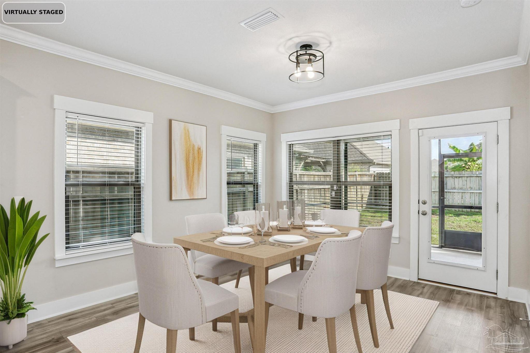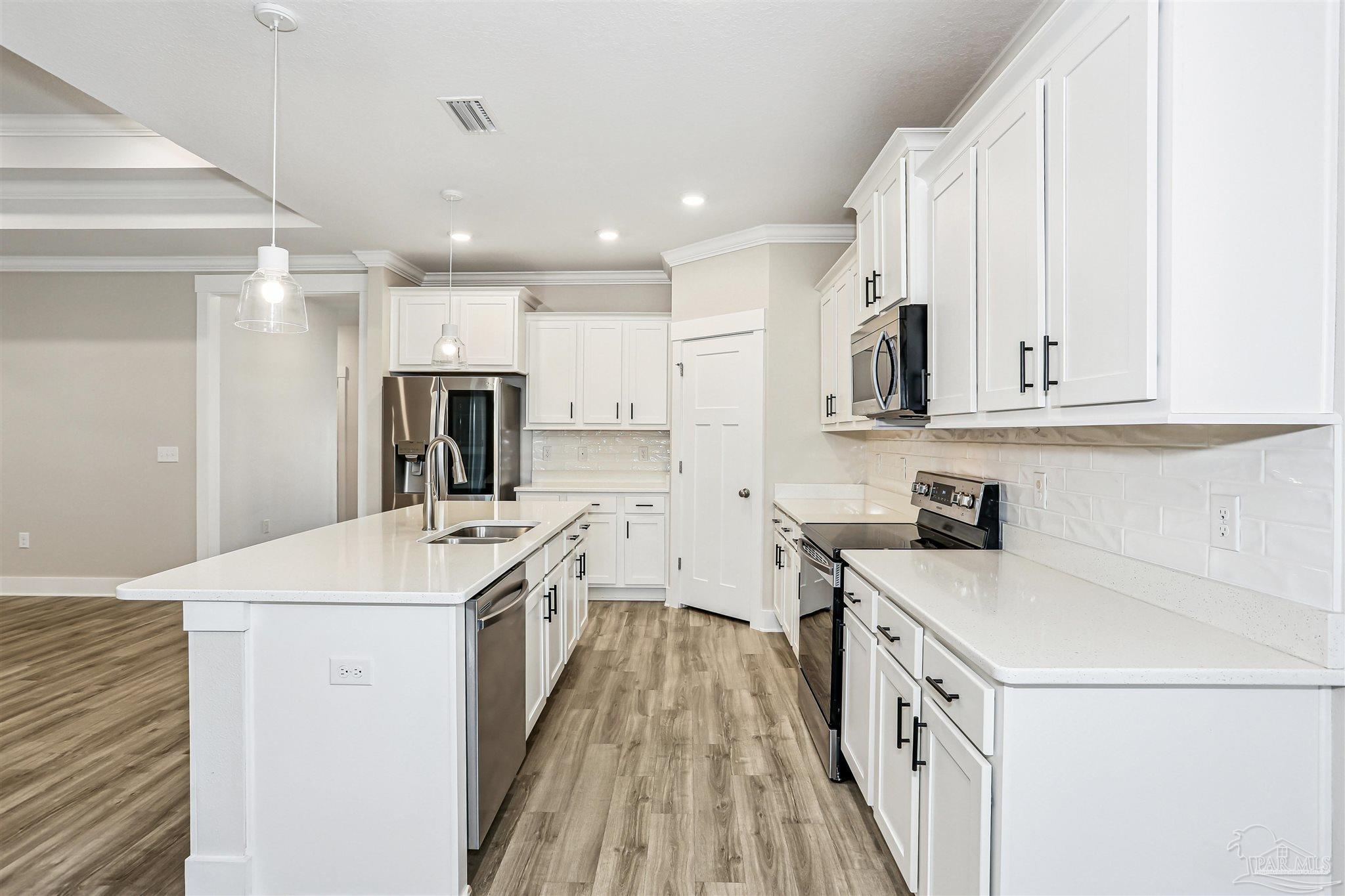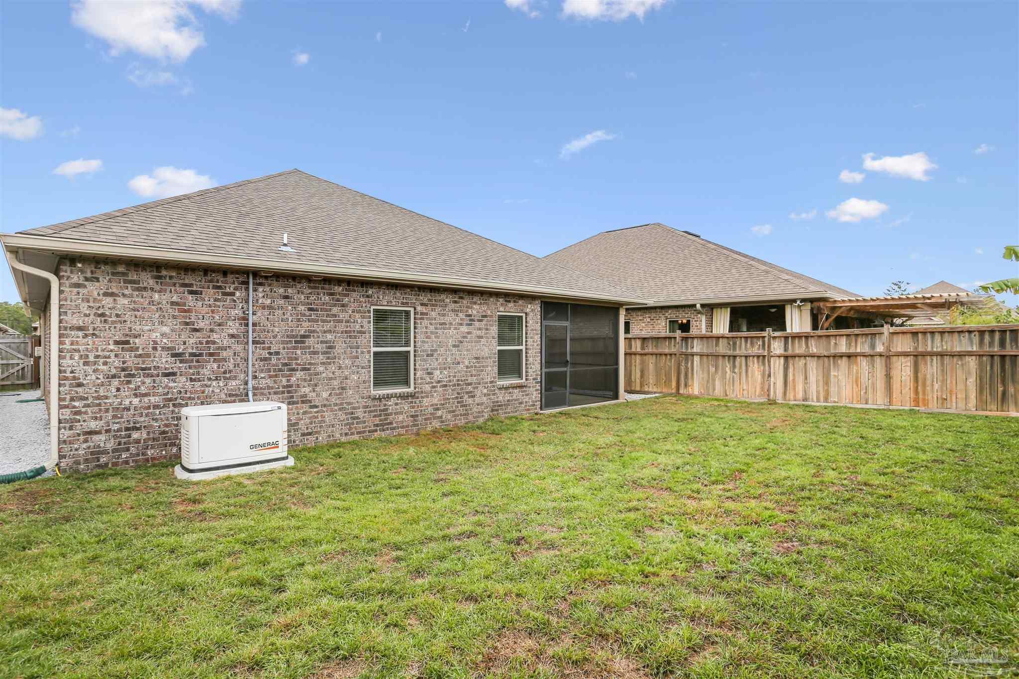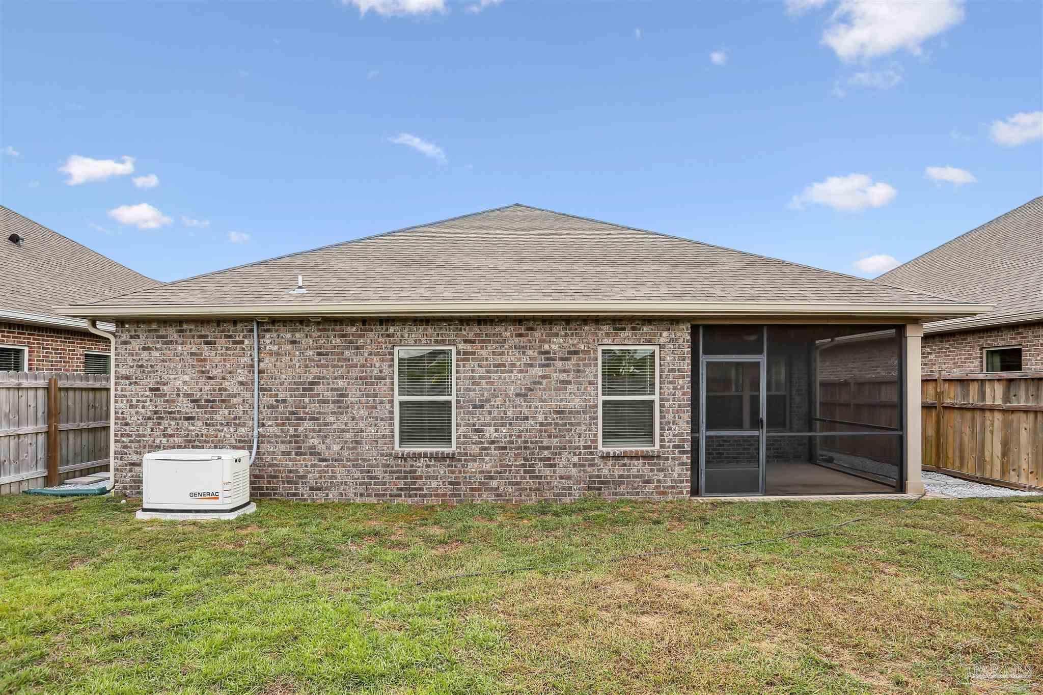 Welcome to your dream home in the highly sought-after Cambridge Park neighborhood! This stunning 4-bed, 3-full-bath home is nestled on a peaceful cul-de-sac, and has a BRAND NEW Generac whole house generator (Sept 2025). Step inside through a foyer which leads to the open-concept layout. The kitchen is a standout with its oversized island, quartz countertops, abundant cabinetry, generous counter space, a spacious walk-in pantry, and premium stainless-steel appliances, complete with a brand-new refrigerator. Enjoy the ease of luxury vinyl flooring throughout the entire home. The primary suite is privately positioned at the back of the house for ultimate privacy and is complete with a lavish 5-piece en-suite bathroom that features a double-sink vanity, quartz counters, a garden tub, a separate glass-enclosed shower, and an oversized walk-in closet. Up front, the second bedroom offers its own ensuite bath and walk-in closet for added privacy. The remaining two bedrooms, conveniently located off the living room, share a full third bathroom—ensuring comfort for family, guests, or a home office setup. Outside you'll find a covered and screened back patio, gutters, a storm door, and a fully fenced backyard! Enjoy the neighborhood conveniences of underground utilities, sidewalks, streetlights and the close proximity to Hurlburt Field, Eglin AFB, NAS Pensacola, shopping & restaurants, Pensacola International Airport, and the beautiful beaches of the Gulf!