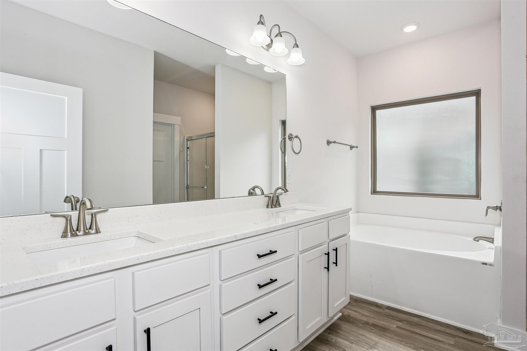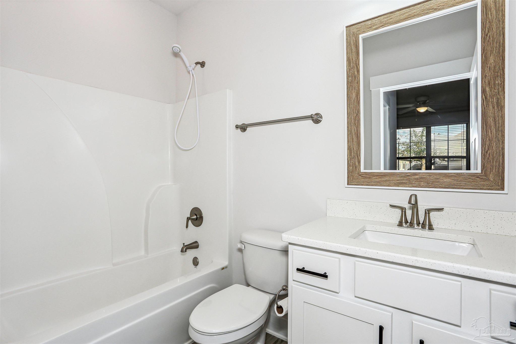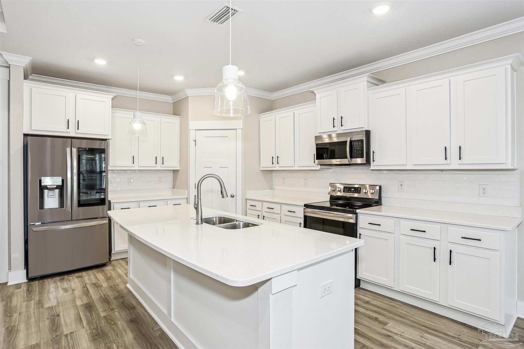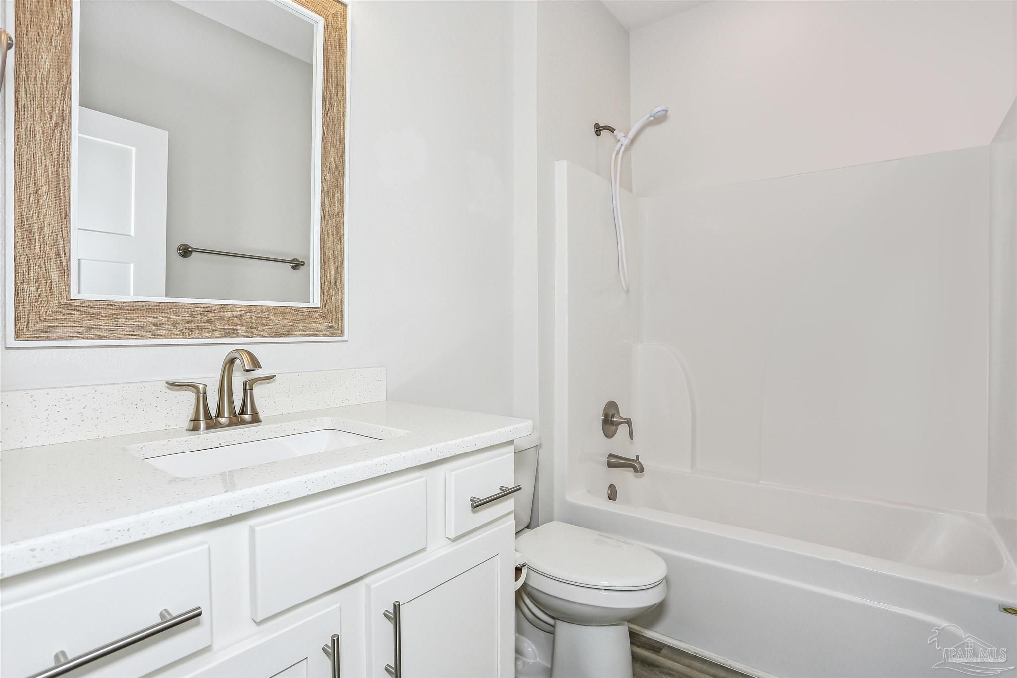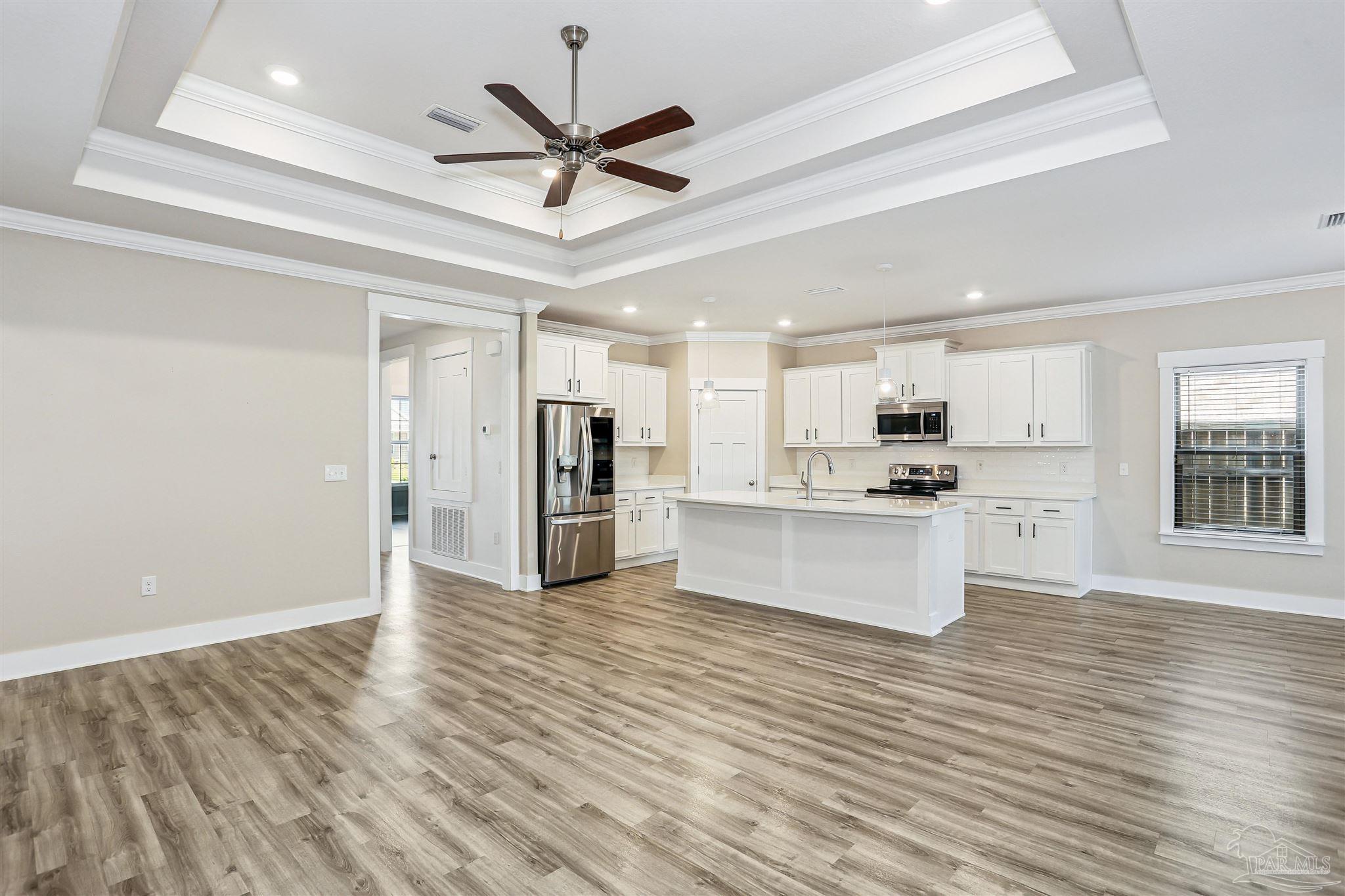 Welcome to your dream home in the highly sought-after Cambridge Park neighborhood! This stunning 4-bed, 3-full-bath home is nestled on a peaceful cul-de-sac, and has a BRAND NEW Generac whole house generator (Sept 2025). Step inside through a foyer which leads to the open-concept layout. The kitchen is a standout with its oversized island, quartz countertops, abundant cabinetry, generous counter space, a spacious walk-in pantry, and premium stainless-steel appliances, complete with a brand-new refrigerator. Enjoy the ease of luxury vinyl flooring throughout the entire home. The primary suite is privately positioned at the back of the house for ultimate privacy and is complete with a lavish 5-piece en-suite bathroom that features a double-sink vanity, quartz counters, a garden tub, a separate glass-enclosed shower, and an oversized walk-in closet. Up front, the second bedroom offers its own ensuite bath and walk-in closet for added privacy. The remaining two bedrooms, conveniently located off the living room, share a full third bathroom—ensuring comfort for family, guests, or a home office setup. Outside you'll find a covered and screened back patio, gutters, a storm door, and a fully fenced backyard! Enjoy the neighborhood conveniences of underground utilities, sidewalks, streetlights and the close proximity to Hurlburt Field, Eglin AFB, NAS Pensacola, shopping & restaurants, Pensacola International Airport, and the beautiful beaches of the Gulf!
