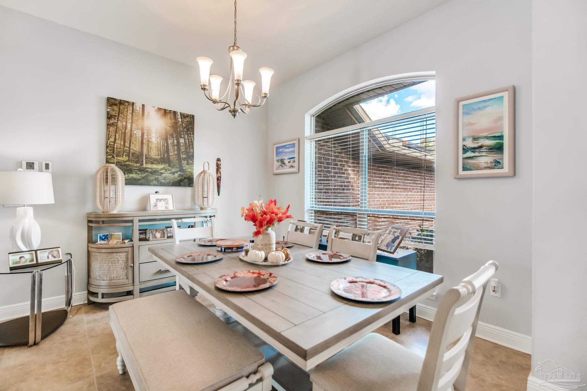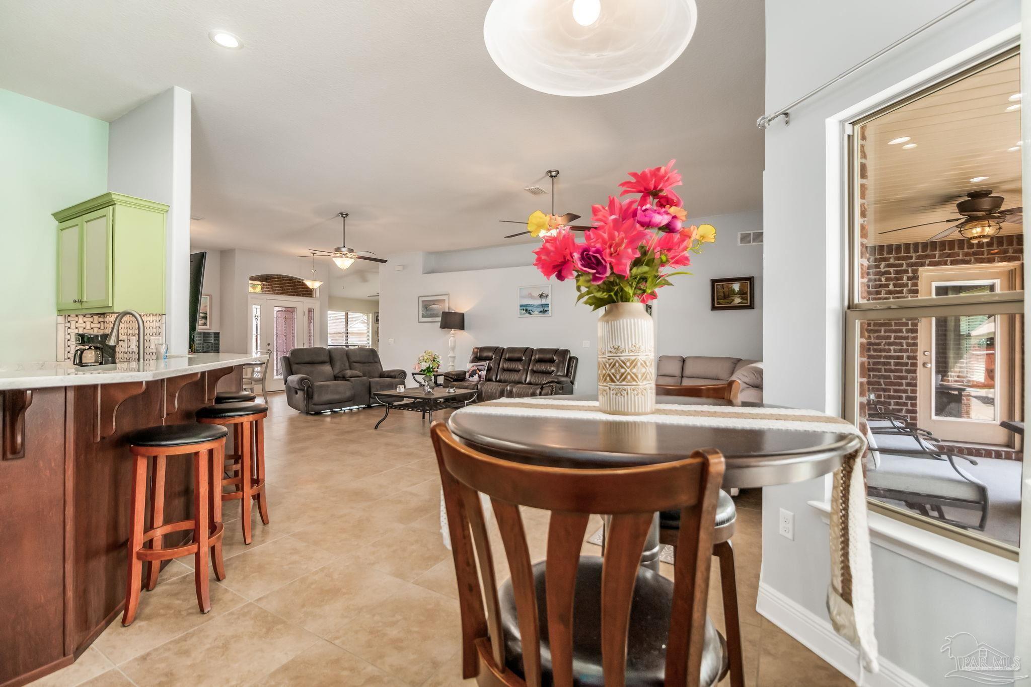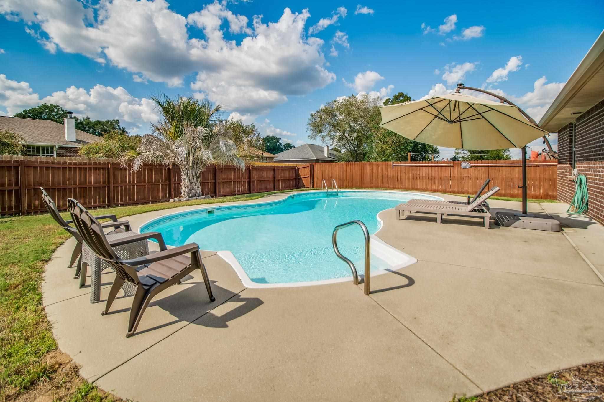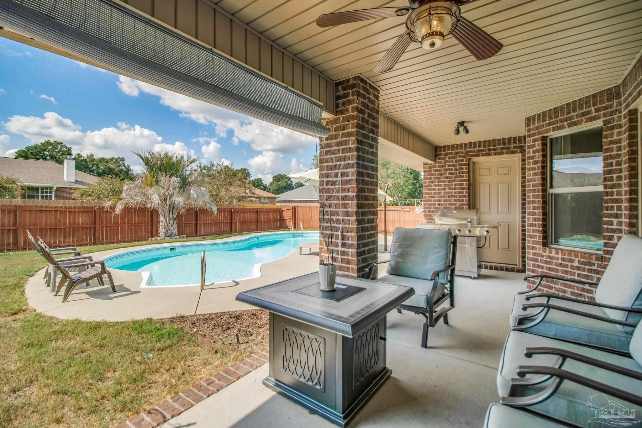 HEATED POOL • 3-CAR GARAGE • UPDATED THROUGHOUT • DUAL PRIMARY SUITES This beautifully updated four-sided brick ranch in the heart of Pace is the one you’ve been waiting for. Featuring 4 bedrooms, 3 full baths, a heated pool, and a 3-car garage, this home blends comfort, style, and function in one perfect package. Step inside to an open floor plan filled with natural light. To your left, a versatile flex space offers the ideal spot for a home office, playroom, or library—showcasing rich Hickory engineered hardwood flooring. The kitchen is a showstopper with light quartz countertops, an updated tile backsplash, gas range with double oven, and a spacious island perfect for meal prep or casual dining. Enjoy stainless-steel appliances, including a newer dishwasher. The guest bedrooms feature upgraded bamboo flooring, and one includes a private en-suite bath—perfect for extended family or growing teens. The primary suite impresses with tray ceilings and two oversized walk-in closets, providing abundant storage for both wardrobes. Step outside from the living room, primary suite, or guest bath onto the covered lanai overlooking the manicured, fenced backyard and sparkling heated pool. Swim nearly year-round with a pool heater that maintains water temperatures up to 10 degrees above ambient weather. Both front and back yards include an irrigation system for easy maintenance, and even the freshly painted fence adds a touch of curb appeal. Best of all, this home is energy-efficient—the paid-off solar panels keep power bills exceptionally low. Meticulously maintained and move-in ready, this home truly has it all. Schedule your private showing today!