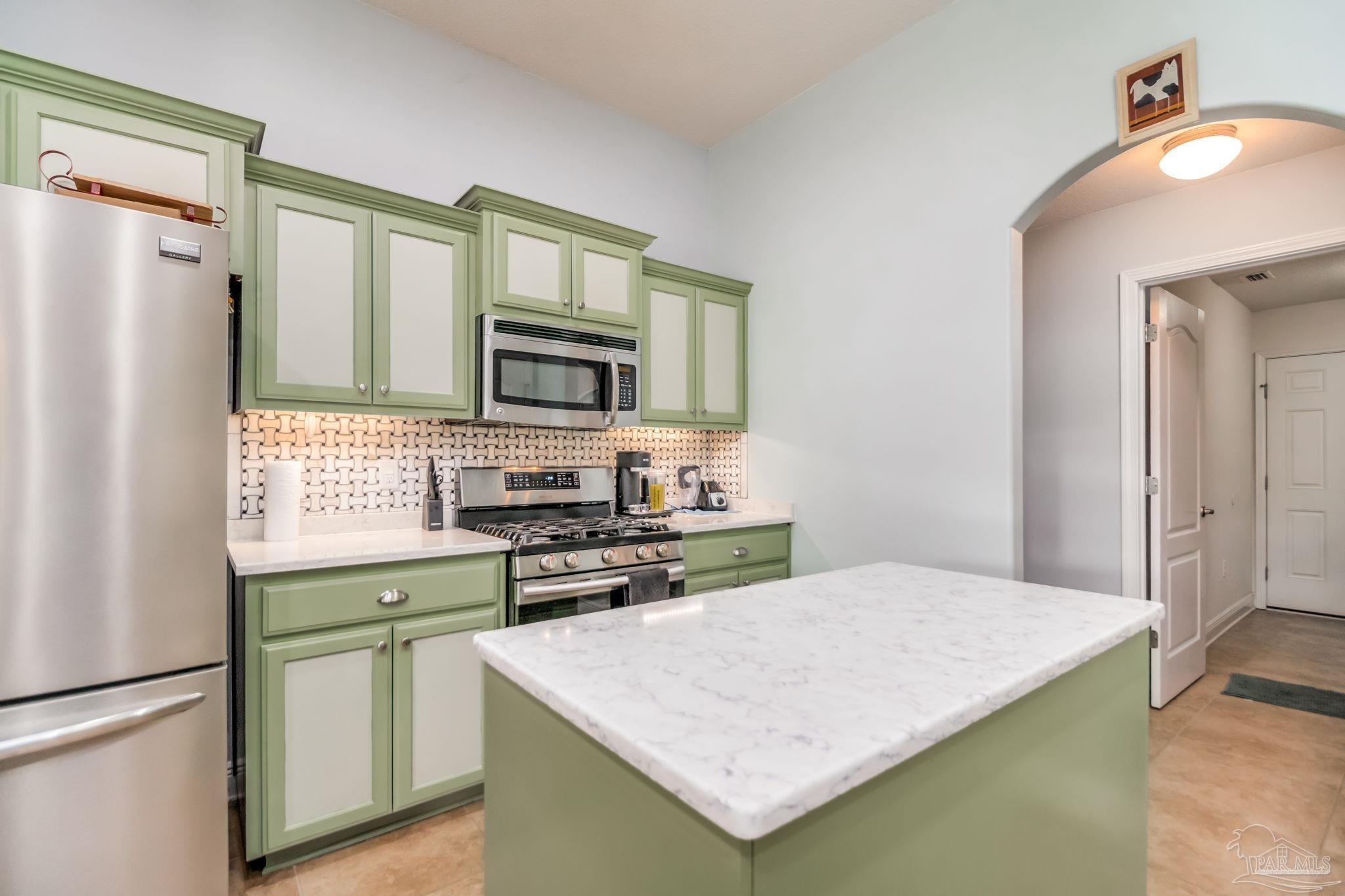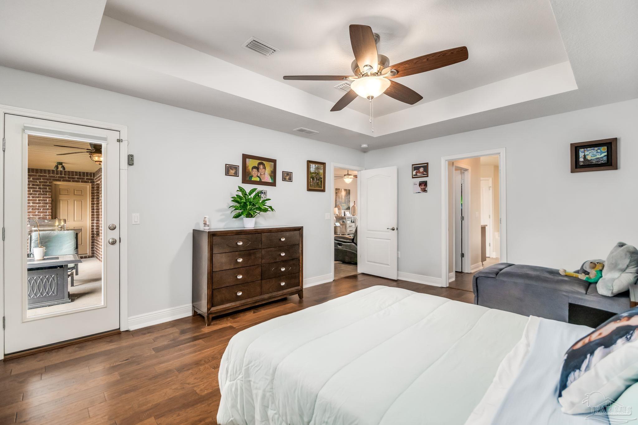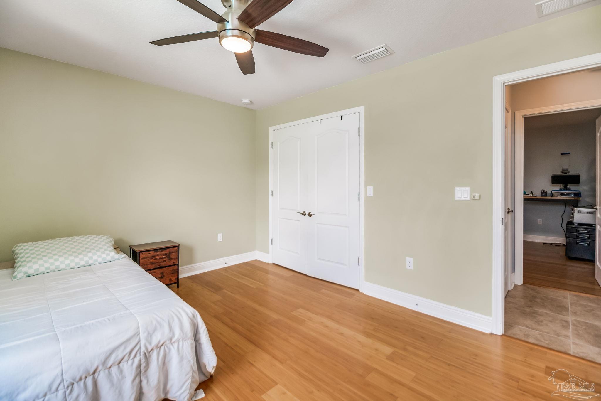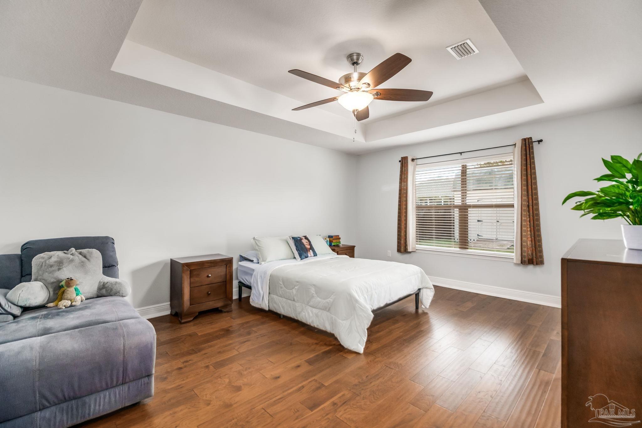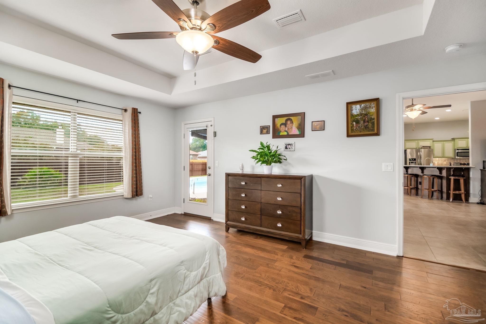 HEATED POOL • 3-CAR GARAGE • UPDATED THROUGHOUT • DUAL PRIMARY SUITES This beautifully updated four-sided brick ranch in the heart of Pace is the one you’ve been waiting for. Featuring 4 bedrooms, 3 full baths, a heated pool, and a 3-car garage, this home blends comfort, style, and function in one perfect package. Step inside to an open floor plan filled with natural light. To your left, a versatile flex space offers the ideal spot for a home office, playroom, or library—showcasing rich Hickory engineered hardwood flooring. The kitchen is a showstopper with light quartz countertops, an updated tile backsplash, gas range with double oven, and a spacious island perfect for meal prep or casual dining. Enjoy stainless-steel appliances, including a newer dishwasher. The guest bedrooms feature upgraded bamboo flooring, and one includes a private en-suite bath—perfect for extended family or growing teens. The primary suite impresses with tray ceilings and two oversized walk-in closets, providing abundant storage for both wardrobes. Step outside from the living room, primary suite, or guest bath onto the covered lanai overlooking the manicured, fenced backyard and sparkling heated pool. Swim nearly year-round with a pool heater that maintains water temperatures up to 10 degrees above ambient weather. Both front and back yards include an irrigation system for easy maintenance, and even the freshly painted fence adds a touch of curb appeal. Best of all, this home is energy-efficient—the paid-off solar panels keep power bills exceptionally low. Meticulously maintained and move-in ready, this home truly has it all. Schedule your private showing today!