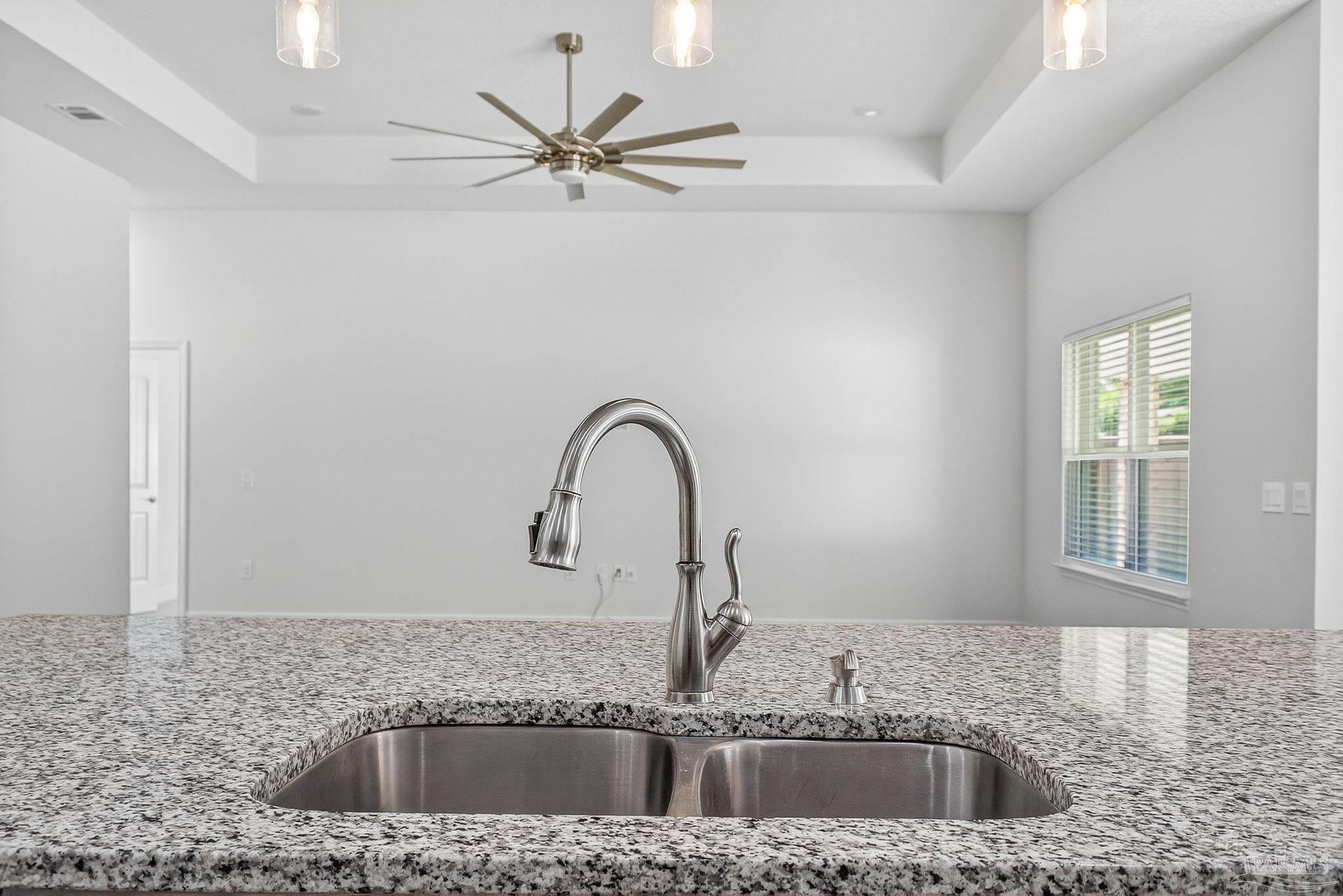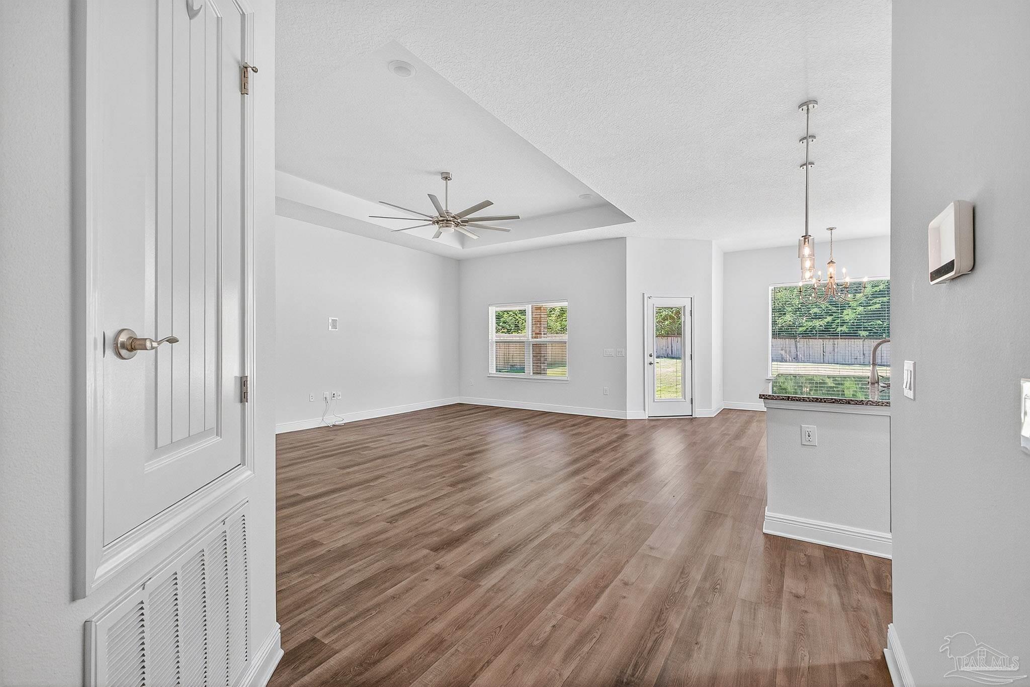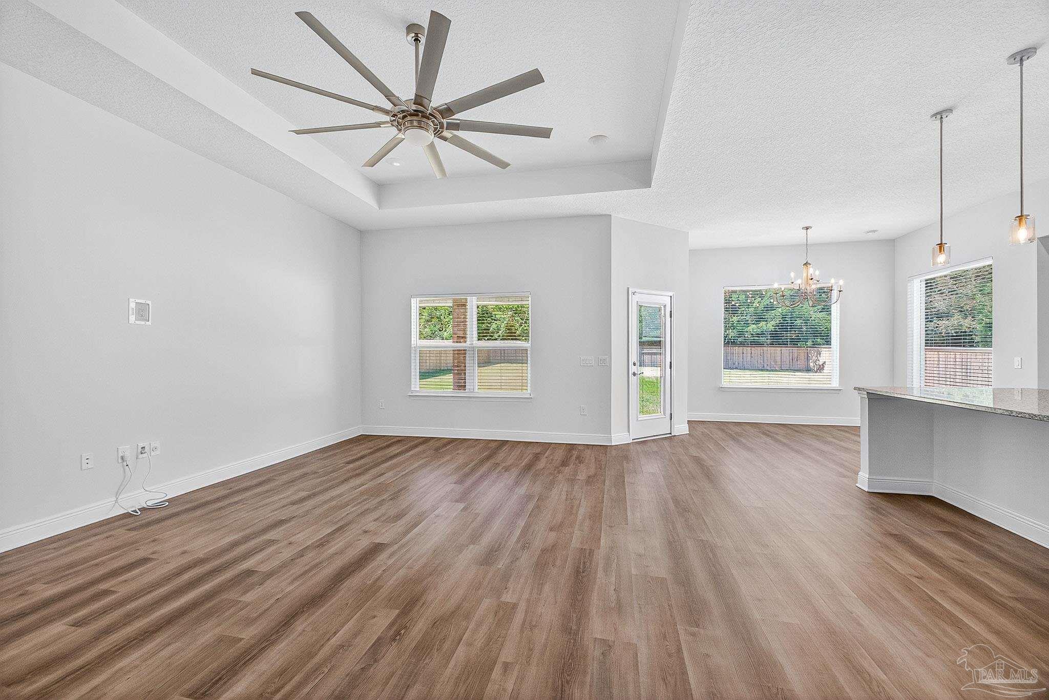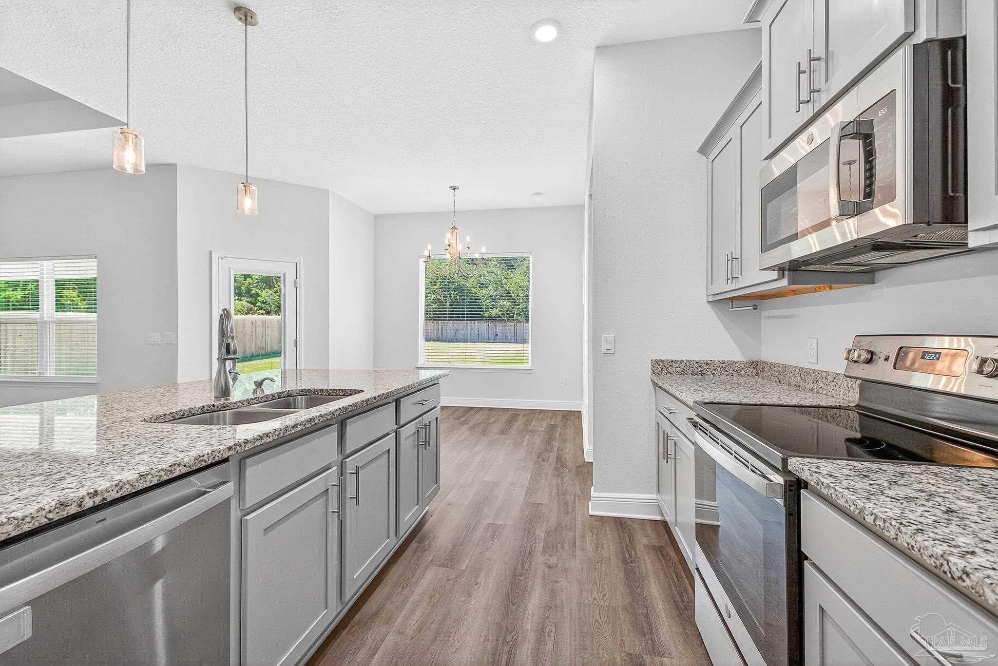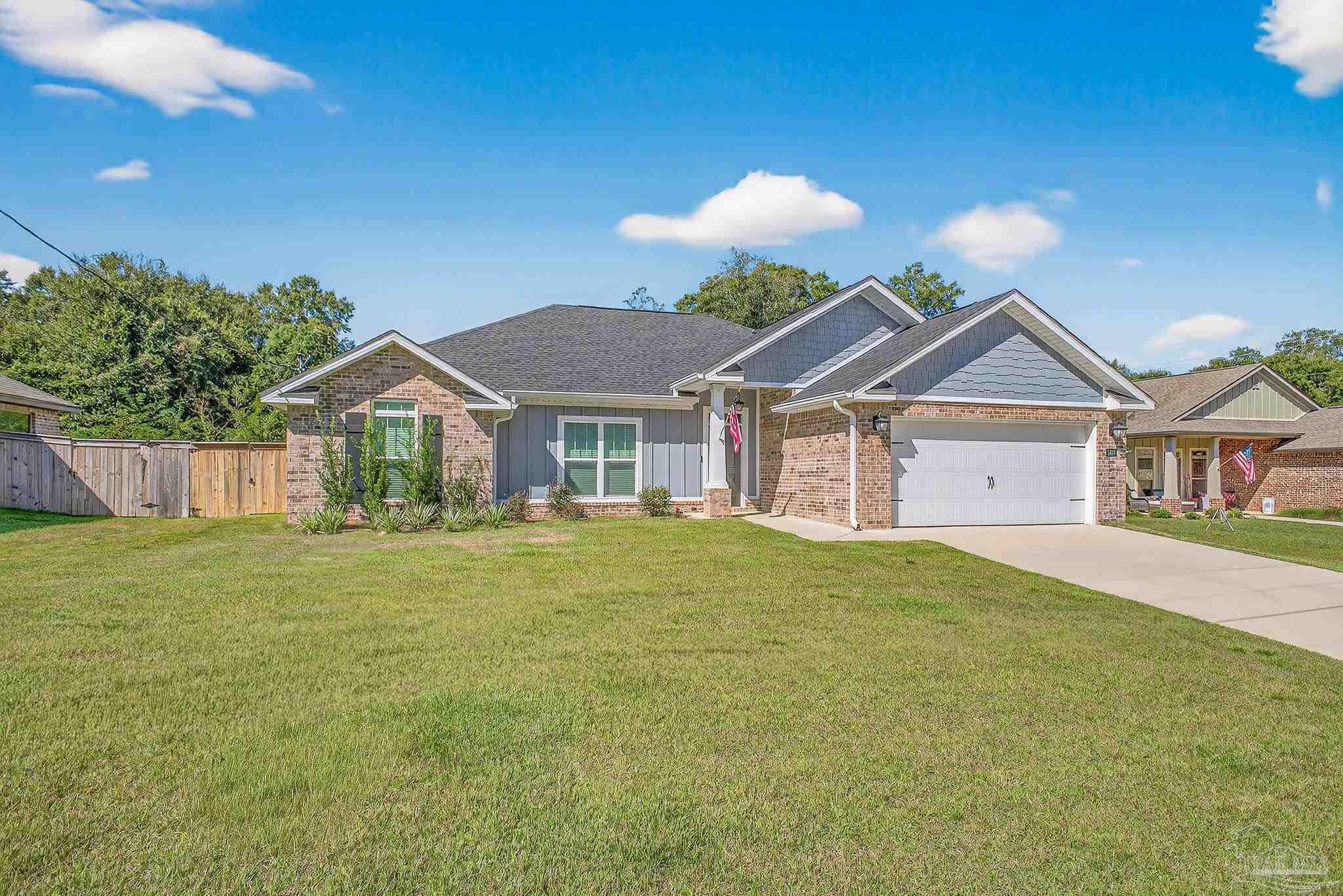 Welcome home! Step inside to discover an inviting open-concept living area featuring a stunning trey ceiling that flows effortlessly into the kitchen and cozy breakfast nook, beautifully lit by two large picture windows. The kitchen boasts elegant granite countertops, shaker-style soft-close cabinetry, a spacious walk-in pantry, and premium stainless steel appliances. Unwind on the covered wrap-around porch—perfect for relaxing or entertaining. The serene master suite offers a trey ceiling, ceiling fan, and double windows that fill the space with natural light, while the luxurious ensuite includes a double vanity, soaking garden tub, tiled walk-in shower with a rain head, and a walk-in closet connected to the laundry room for added convenience. Additional highlights include a finished two-car garage, NEST thermostat, hybrid water heater, LED lighting, irrigation system, Taexx pest control, Vivint security and doorbell system, underground backyard electrical, and hurricane fabric shield window protection—combining comfort, elegance, and peace of mind.