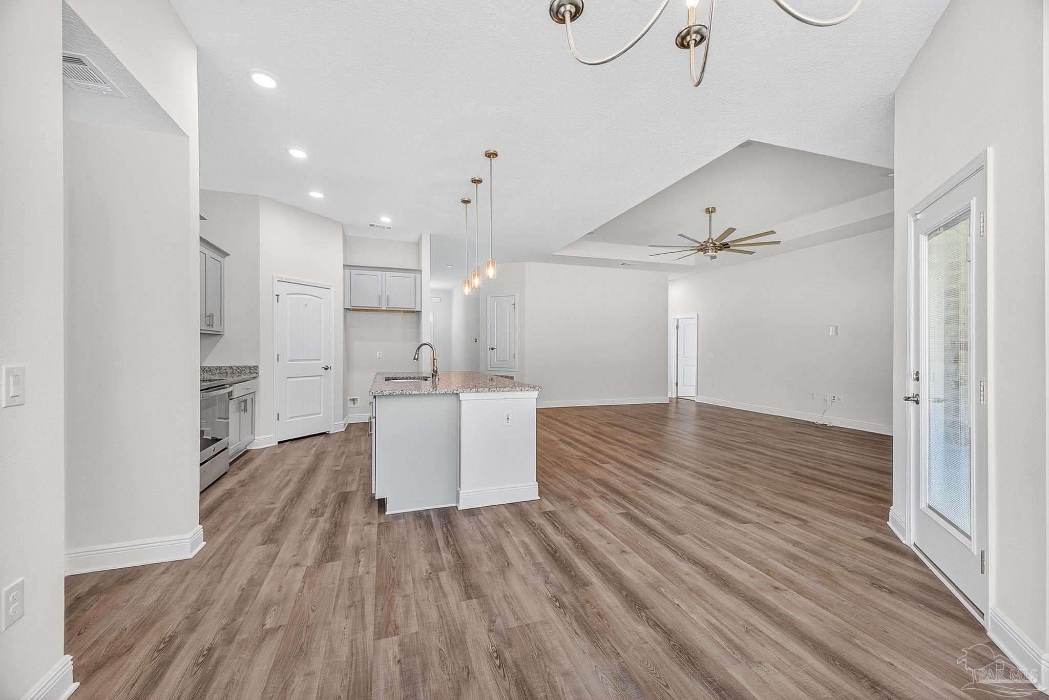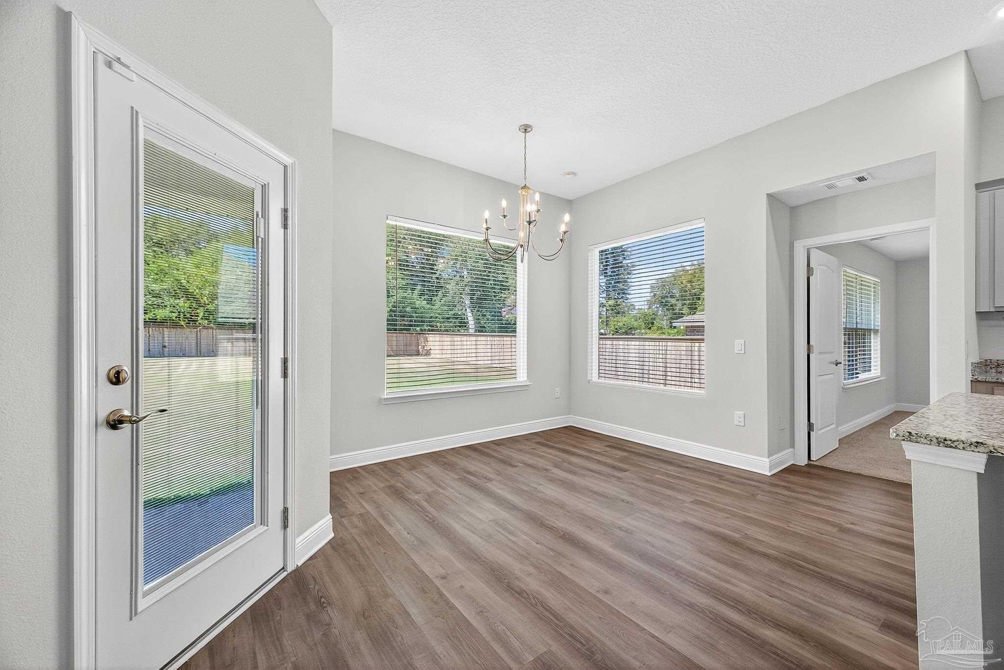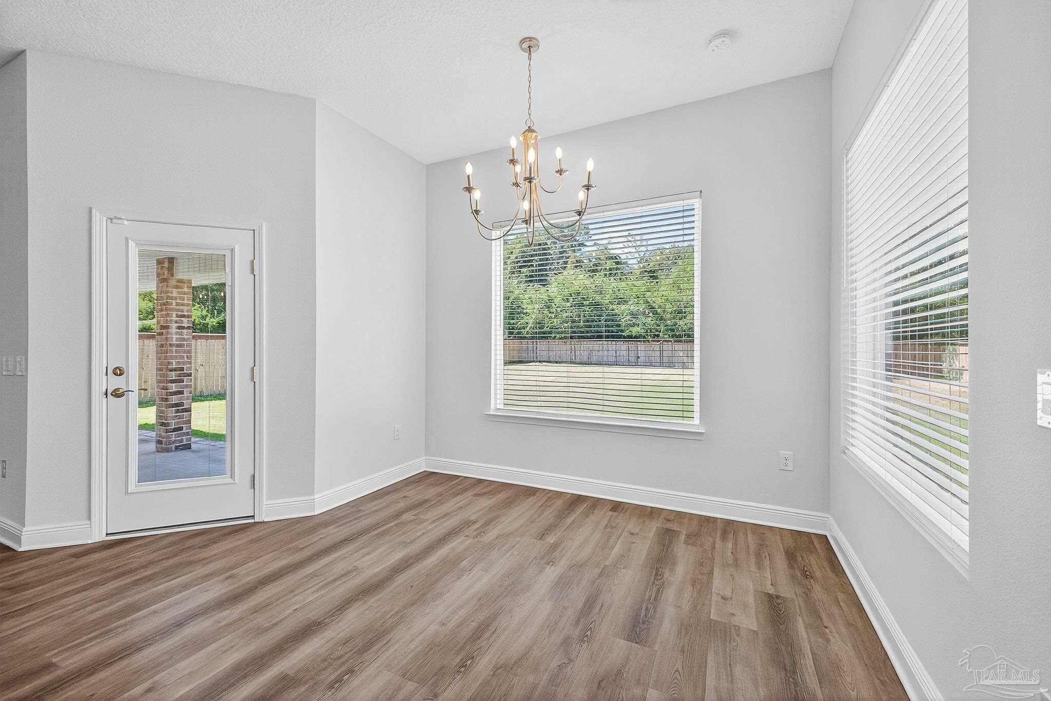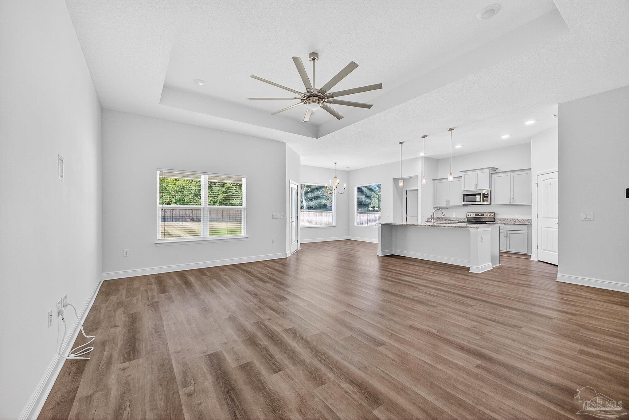 Welcome home! Step inside to discover an inviting open-concept living area featuring a stunning trey ceiling that flows effortlessly into the kitchen and cozy breakfast nook, beautifully lit by two large picture windows. The kitchen boasts elegant granite countertops, shaker-style soft-close cabinetry, a spacious walk-in pantry, and premium stainless steel appliances. Unwind on the covered wrap-around porch—perfect for relaxing or entertaining. The serene master suite offers a trey ceiling, ceiling fan, and double windows that fill the space with natural light, while the luxurious ensuite includes a double vanity, soaking garden tub, tiled walk-in shower with a rain head, and a walk-in closet connected to the laundry room for added convenience. Additional highlights include a finished two-car garage, NEST thermostat, hybrid water heater, LED lighting, irrigation system, Taexx pest control, Vivint security and doorbell system, underground backyard electrical, and hurricane fabric shield window protection—combining comfort, elegance, and peace of mind.