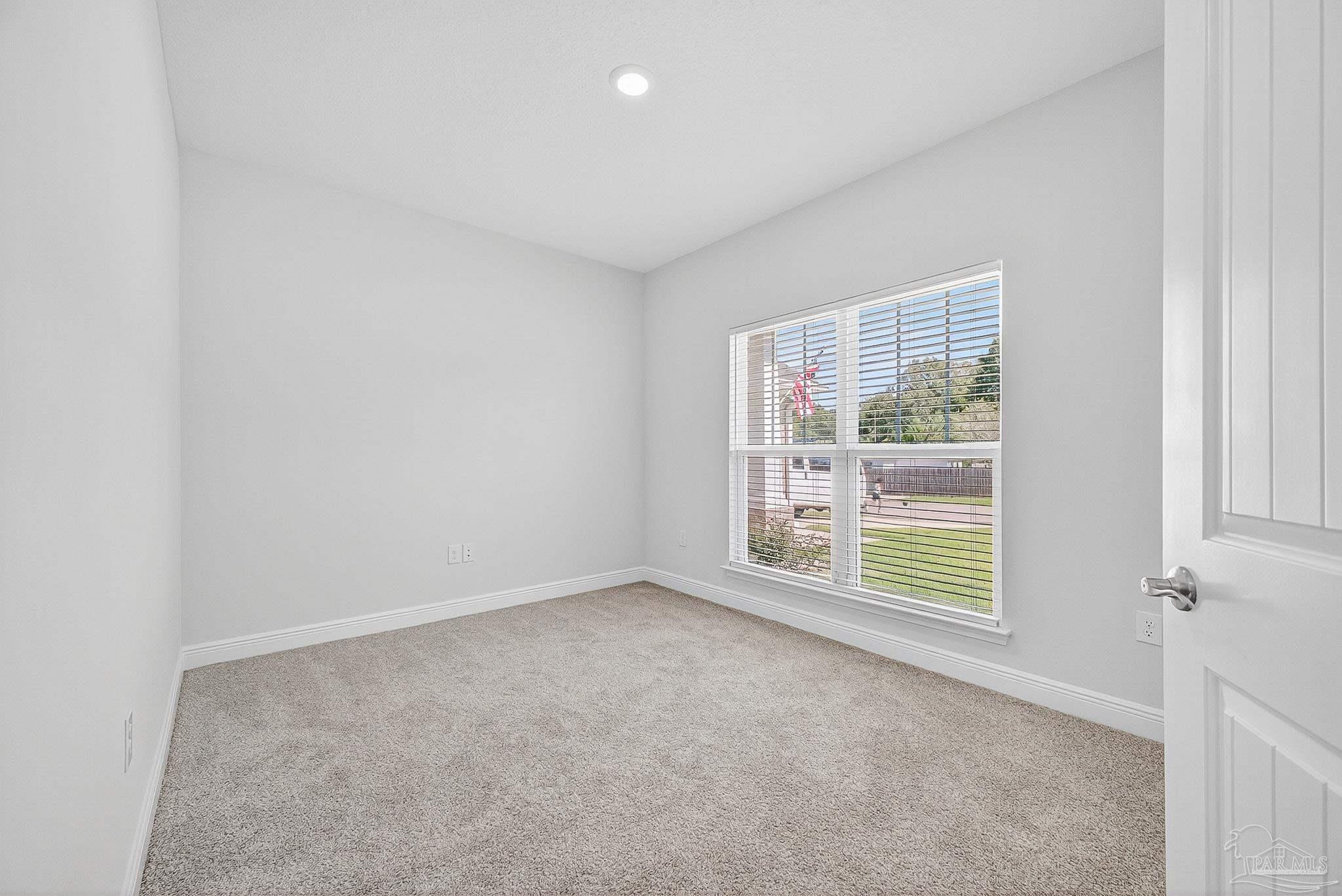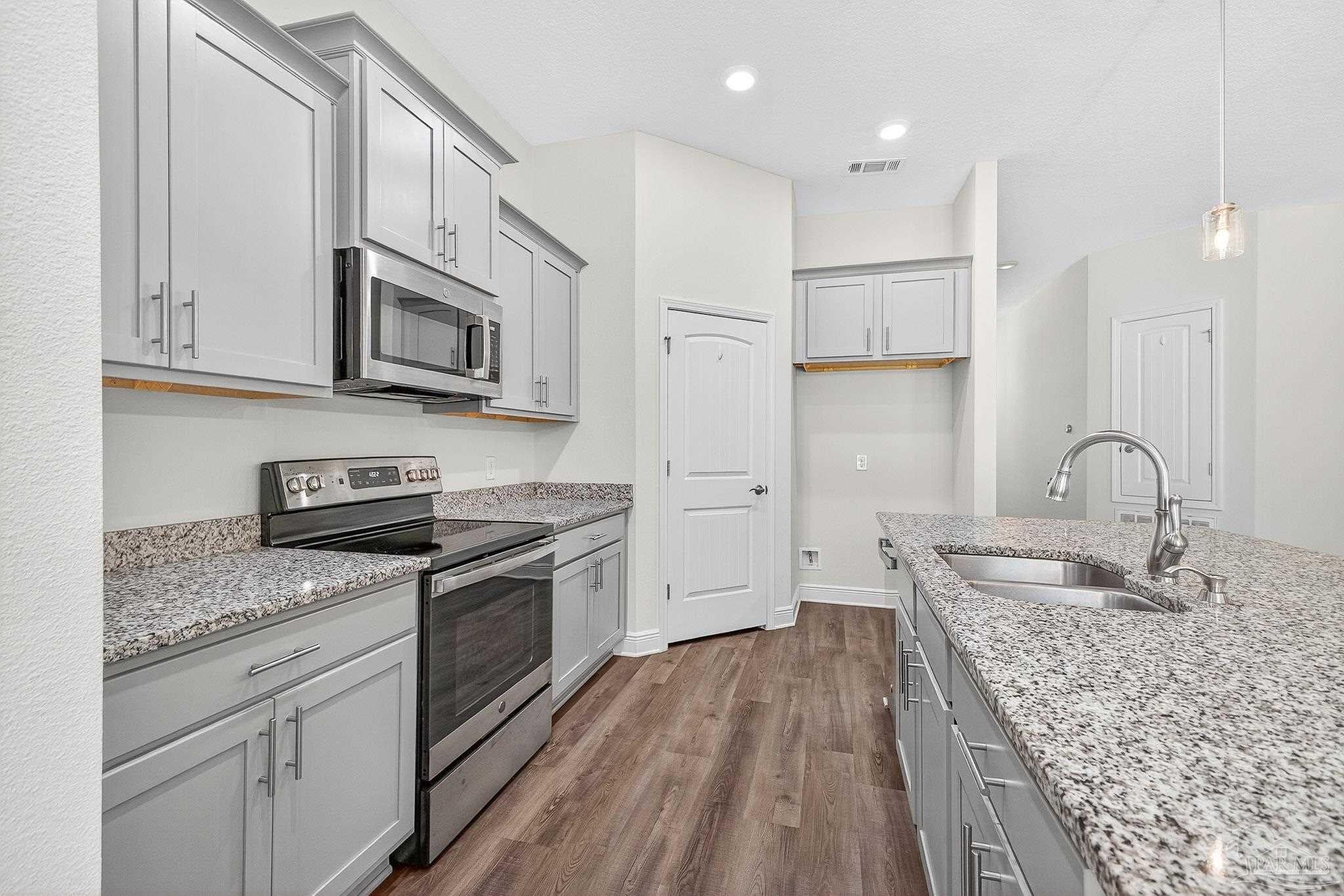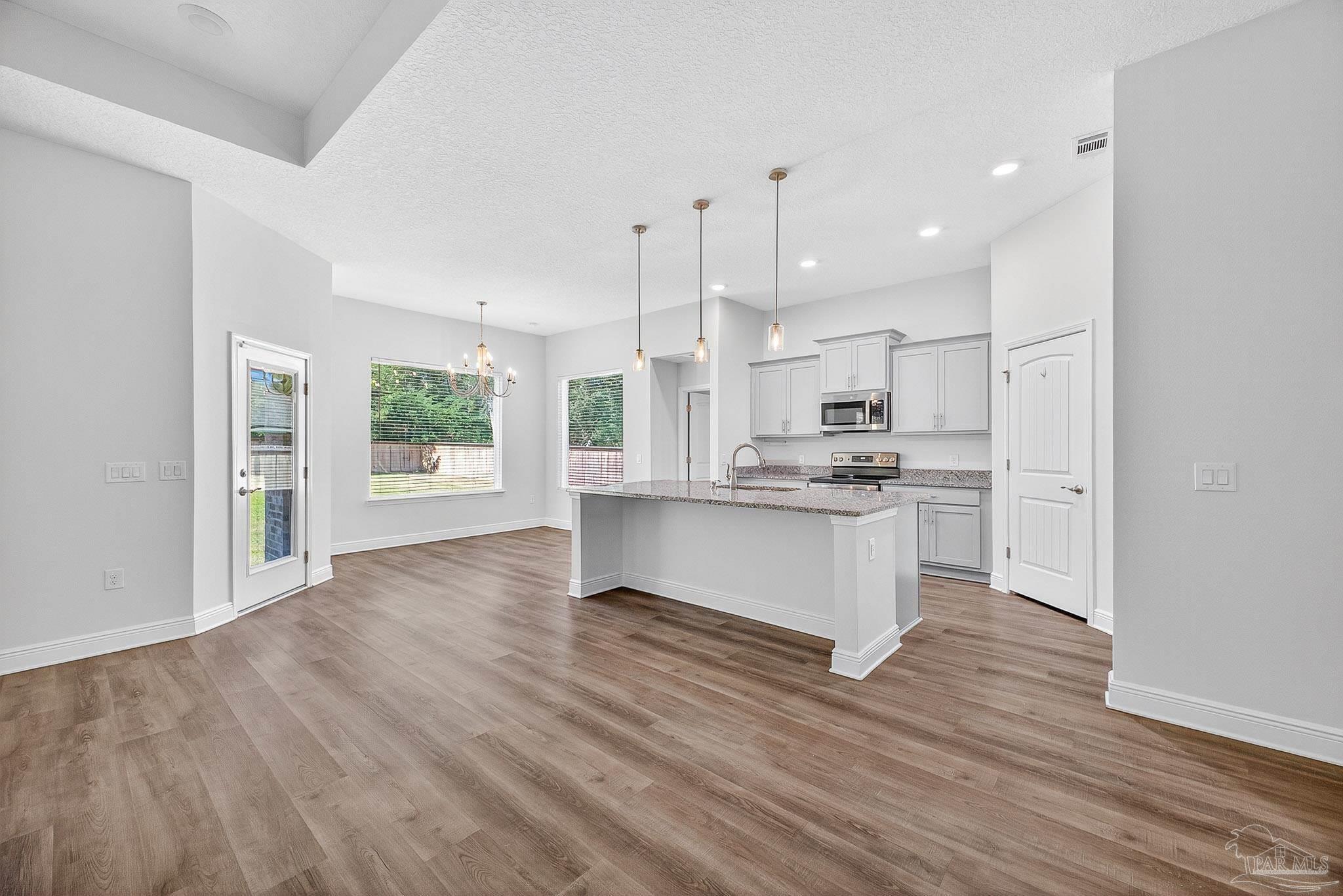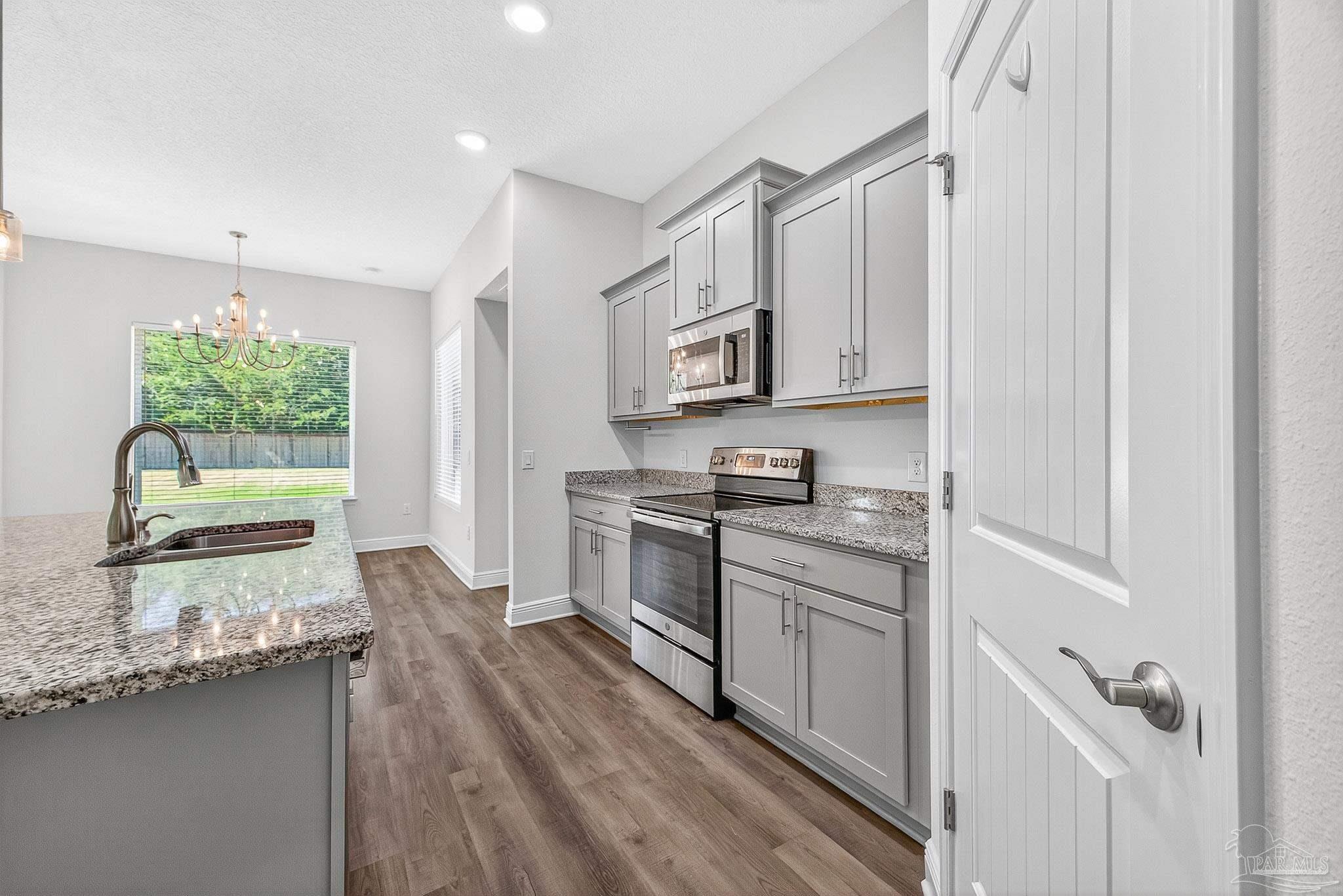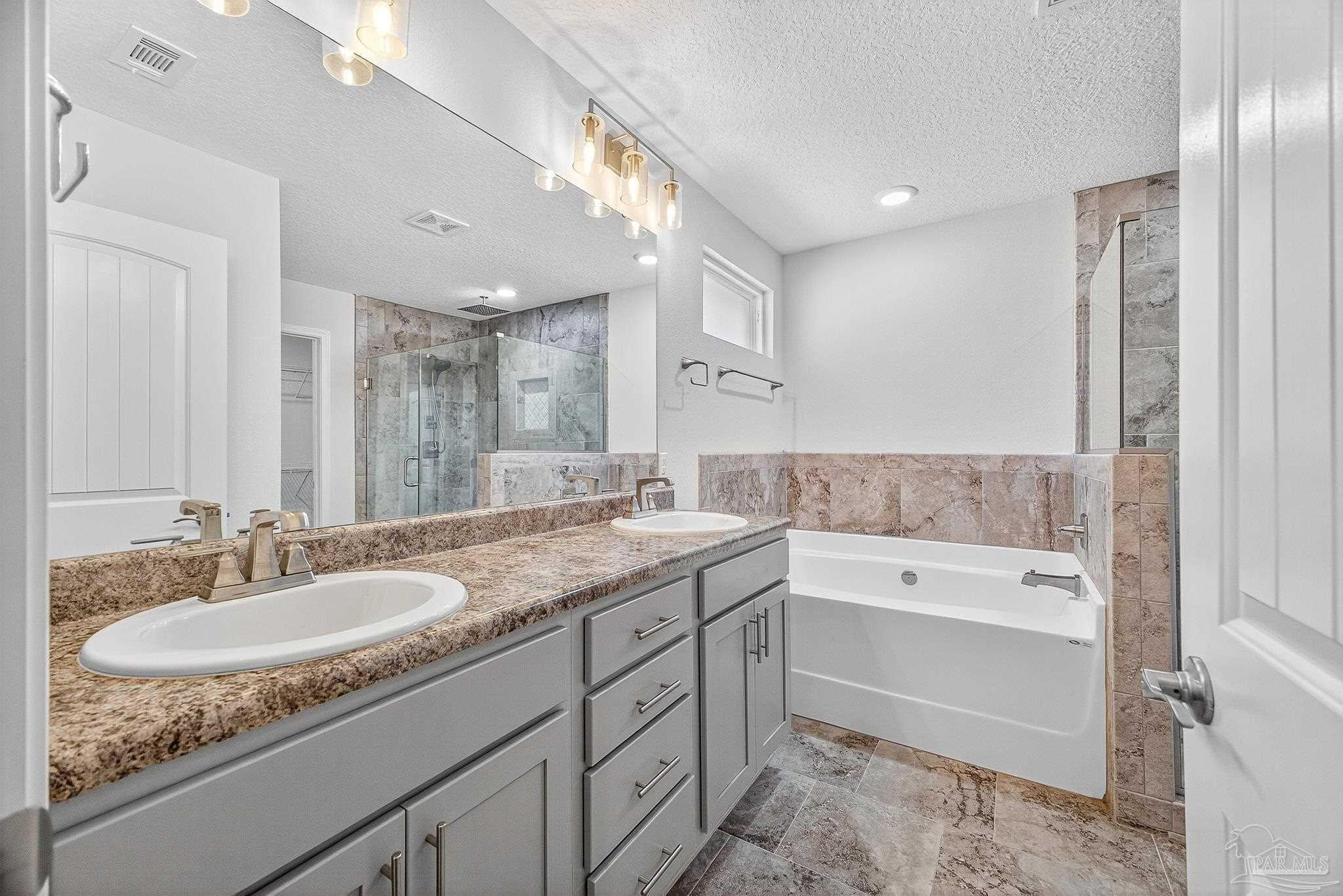 Welcome home! Step inside to discover an inviting open-concept living area featuring a stunning trey ceiling that flows effortlessly into the kitchen and cozy breakfast nook, beautifully lit by two large picture windows. The kitchen boasts elegant granite countertops, shaker-style soft-close cabinetry, a spacious walk-in pantry, and premium stainless steel appliances. Unwind on the covered wrap-around porch—perfect for relaxing or entertaining. The serene master suite offers a trey ceiling, ceiling fan, and double windows that fill the space with natural light, while the luxurious ensuite includes a double vanity, soaking garden tub, tiled walk-in shower with a rain head, and a walk-in closet connected to the laundry room for added convenience. Additional highlights include a finished two-car garage, NEST thermostat, hybrid water heater, LED lighting, irrigation system, Taexx pest control, Vivint security and doorbell system, underground backyard electrical, and hurricane fabric shield window protection—combining comfort, elegance, and peace of mind.