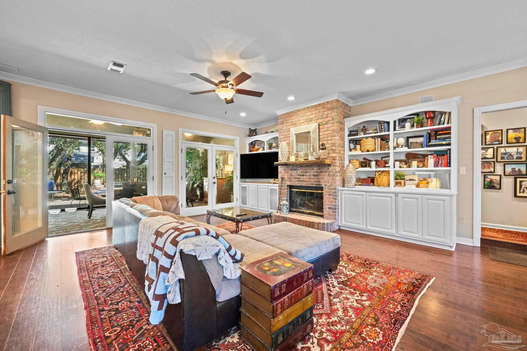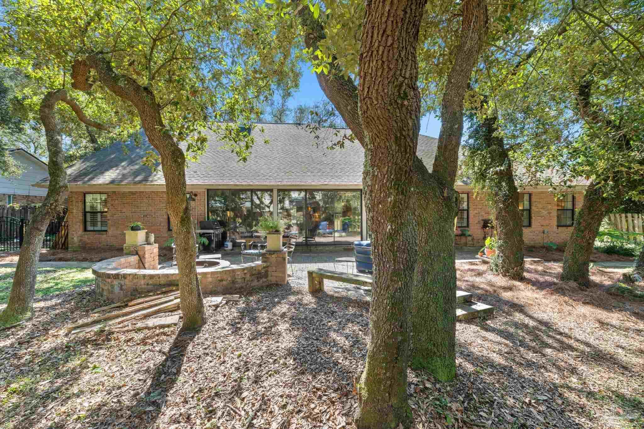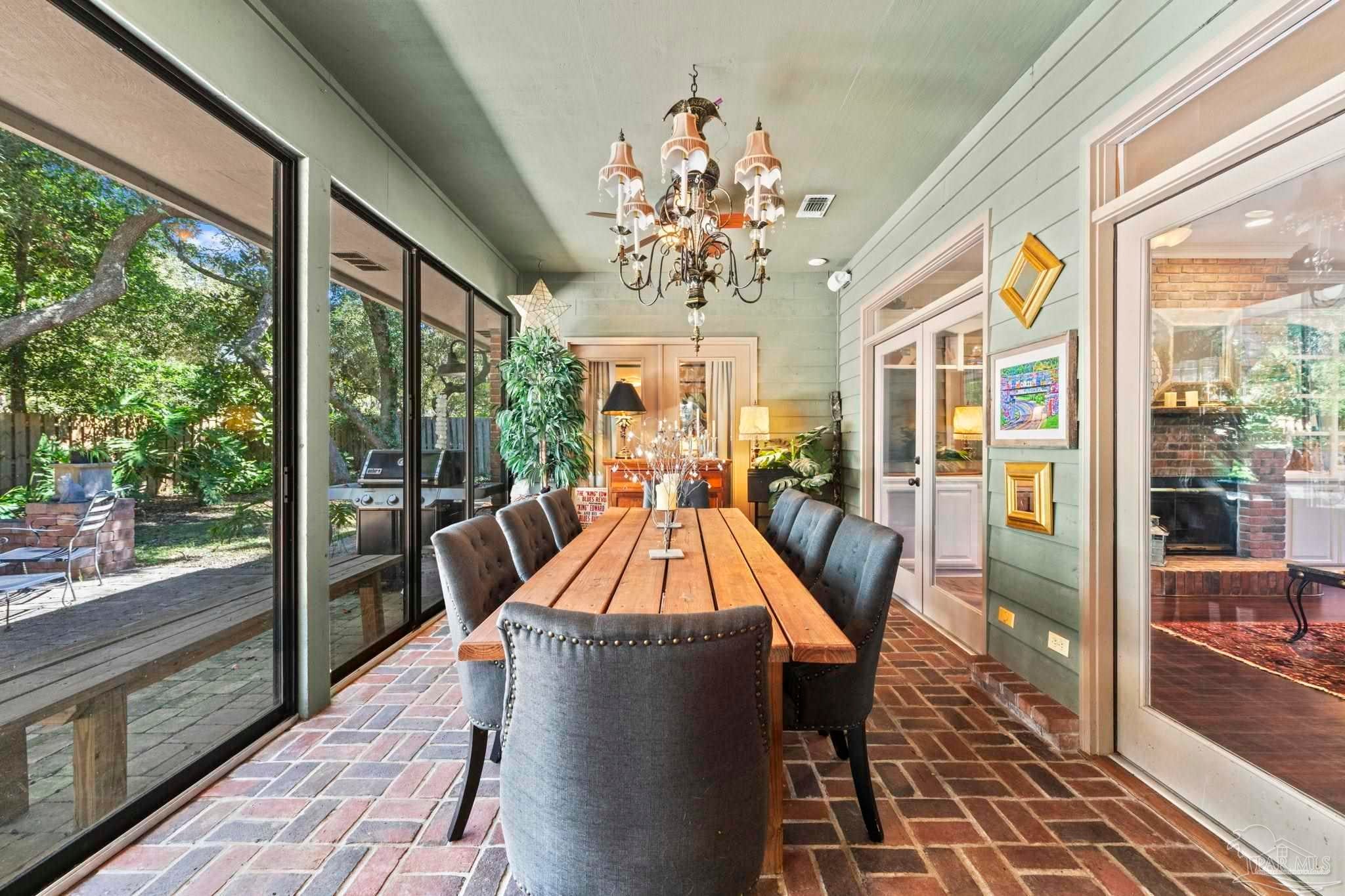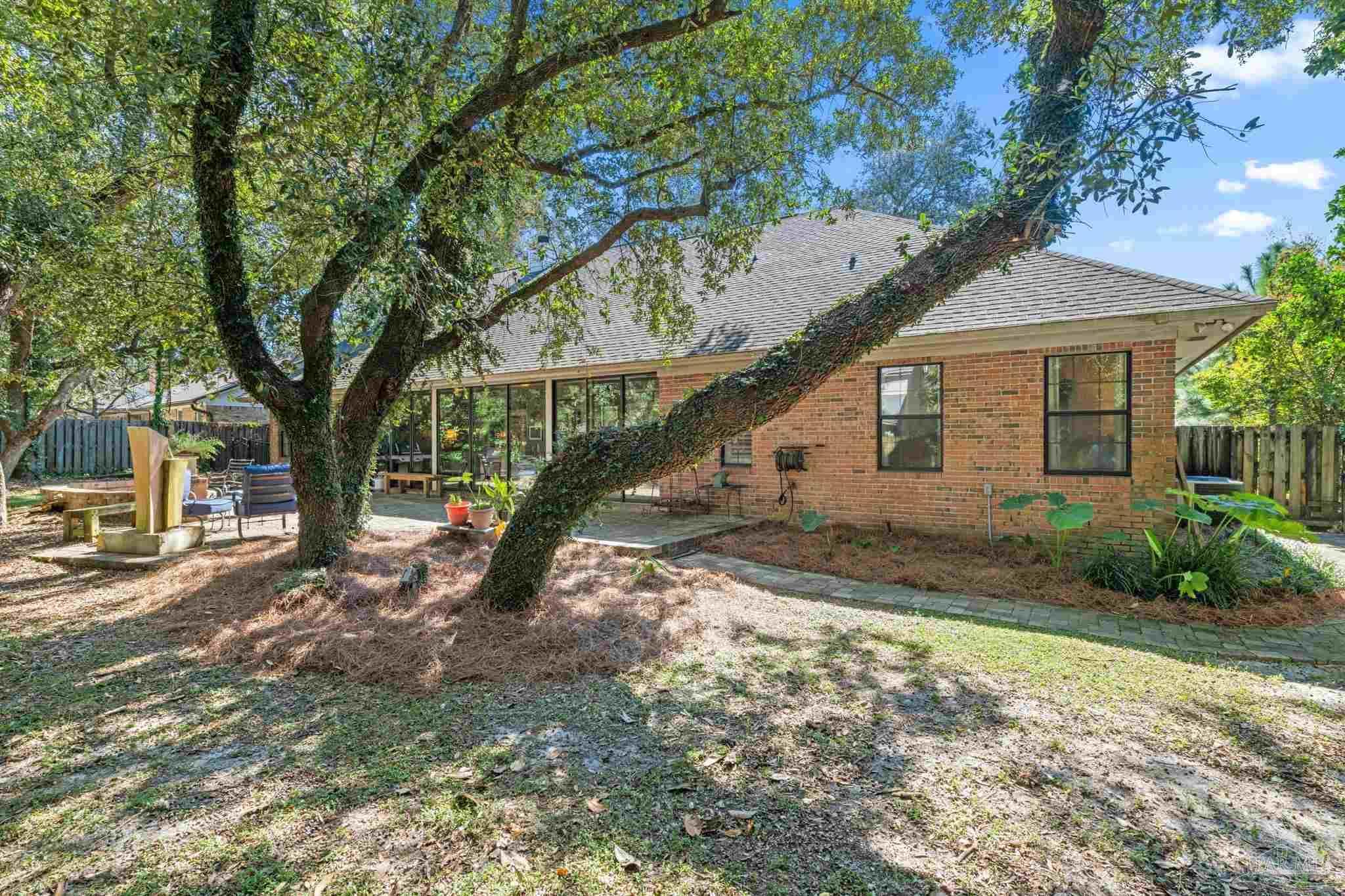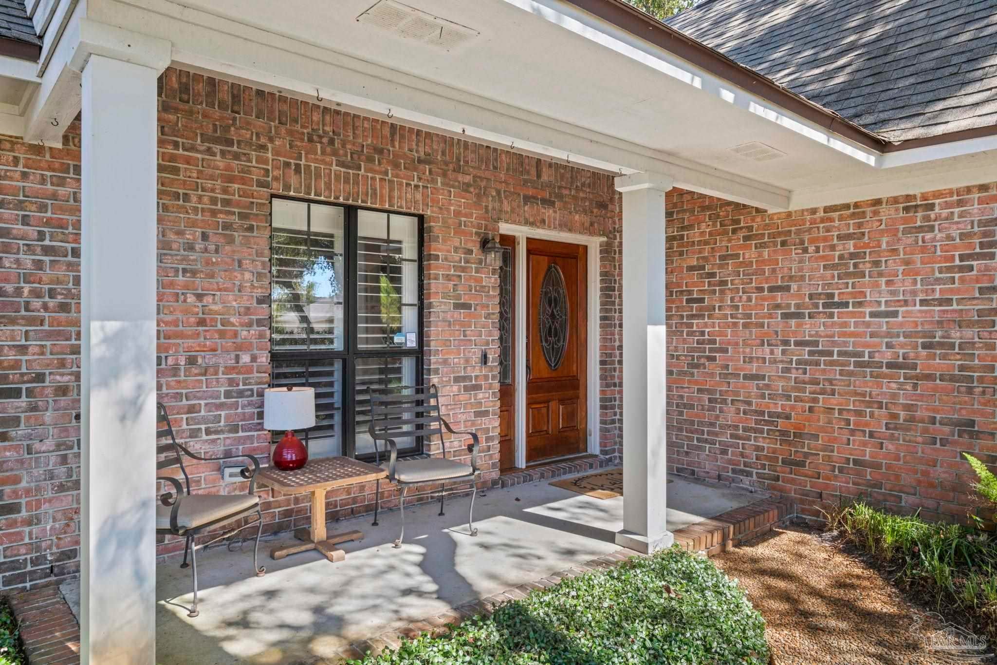 Welcome to this beautiful brick home in highly sought-after Gulf Breeze Proper, offering strong curb appeal with its prominent roof pitch, classic brick siding, and inviting architectural lines. Step inside to an impressive great room highlighted by high ceilings, a cozy wood-burning fireplace, built-in bookshelves, and French doors that open to a lovely sunroom—creating the perfect blend of warmth and elegance. This thoughtfully designed split floor plan features a spacious primary suite, a guest suite with private access, and two additional bedrooms that share a full bath—ideal for family and guests alike. Multiple living areas and 9-foot ceilings throughout enhance the home’s open, comfortable feel. The sunroom with charming brick flooring overlooks a beautiful backyard entertaining area with a fire pit, perfect for gatherings or quiet evenings outdoors. Interior highlights include plantation shutters on select windows and engineered wood-look flooring that flows through most of the home, offering both style and easy maintenance. The centrally located kitchen boasts abundant cabinetry, stainless-steel front appliances that include a wall-mounted oven and microwave with convection option, and versatile dining spaces including a breakfast bar, breakfast nook, and formal dining room. Located within walking distance of Gulf Breeze’s top-rated schools and nearby parks with water access, this home also offers quick access to world-class beaches, Historic Downtown Pensacola, premier shopping, dining, and Pensacola International Airport—making it one of the most desirable addresses on the Gulf Coast. Additional features include a two-car garage with floored storage space above, providing ample room for organization and convenience. Classic curb appeal, timeless design, and an unbeatable location—this Gulf Breeze Proper home offers the ideal blend of comfort, style, and coastal convenience.