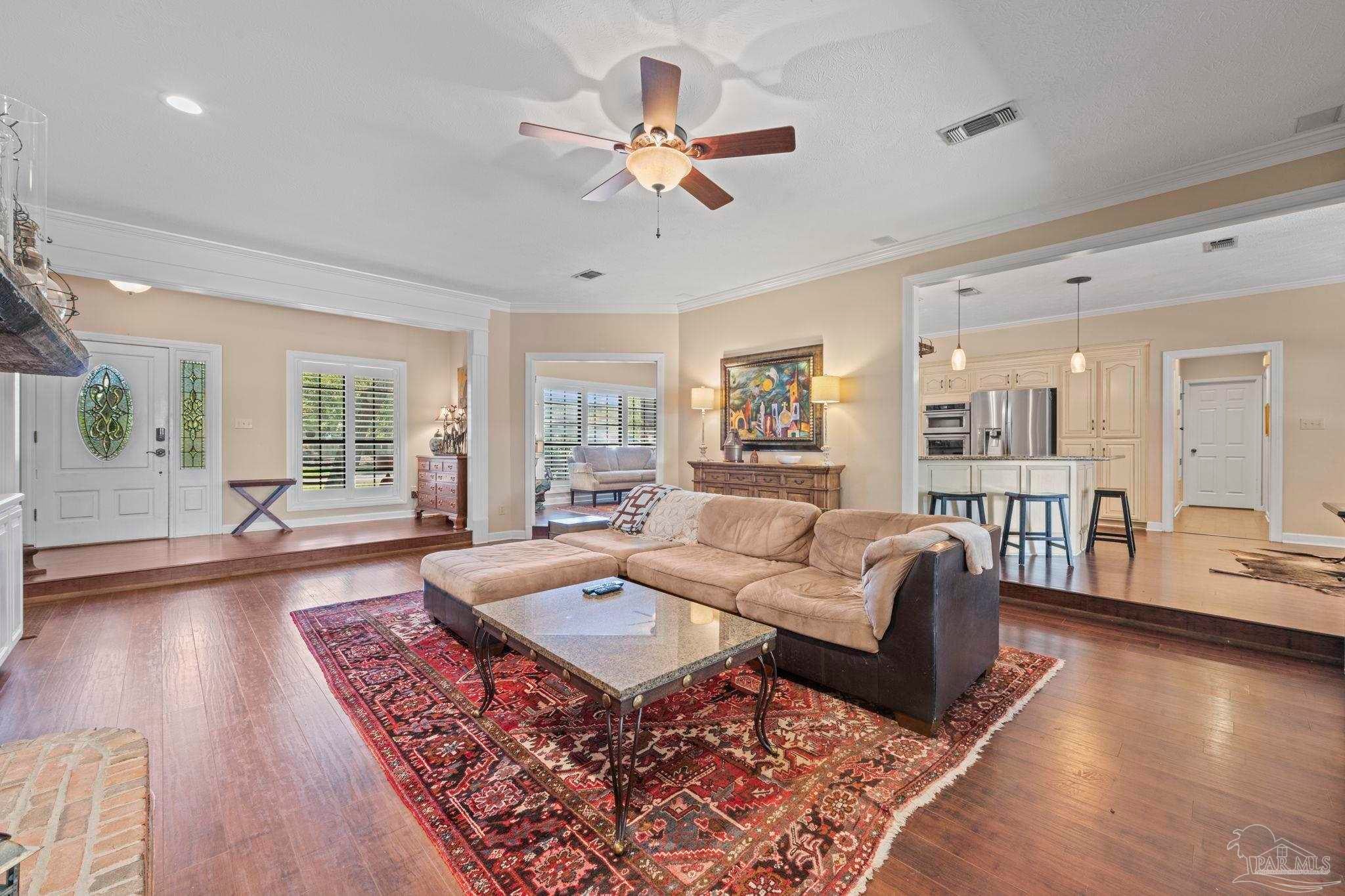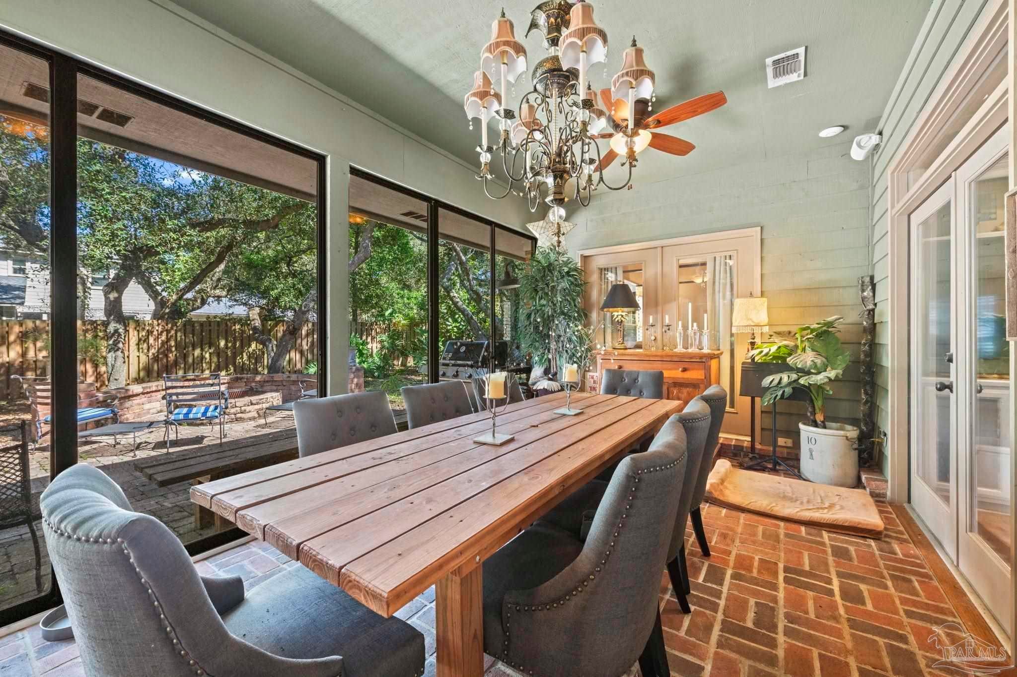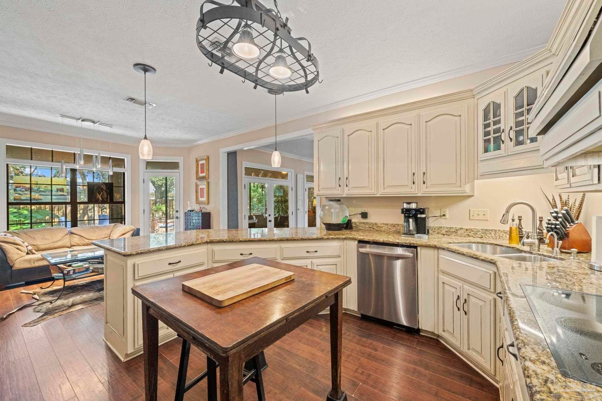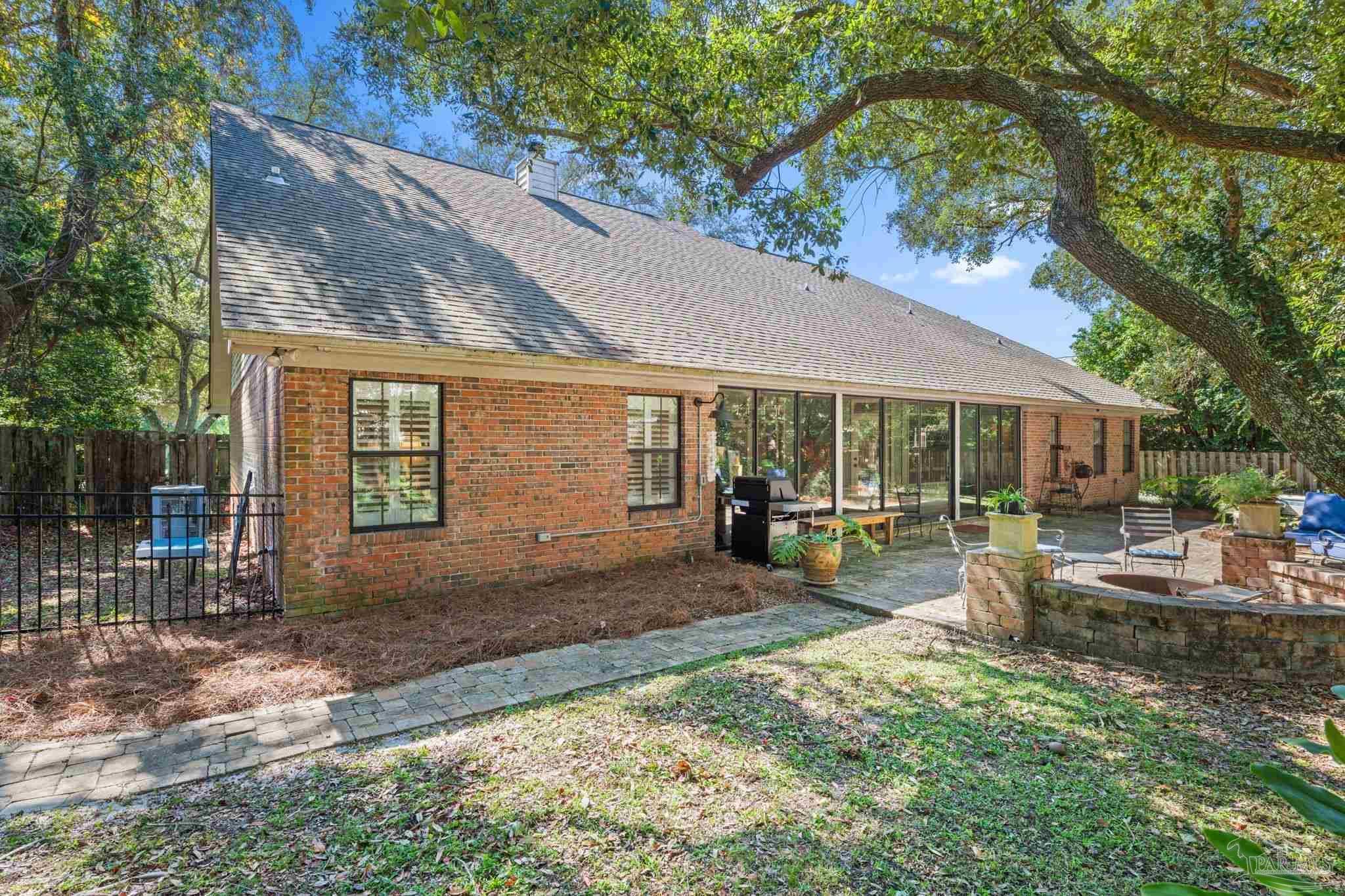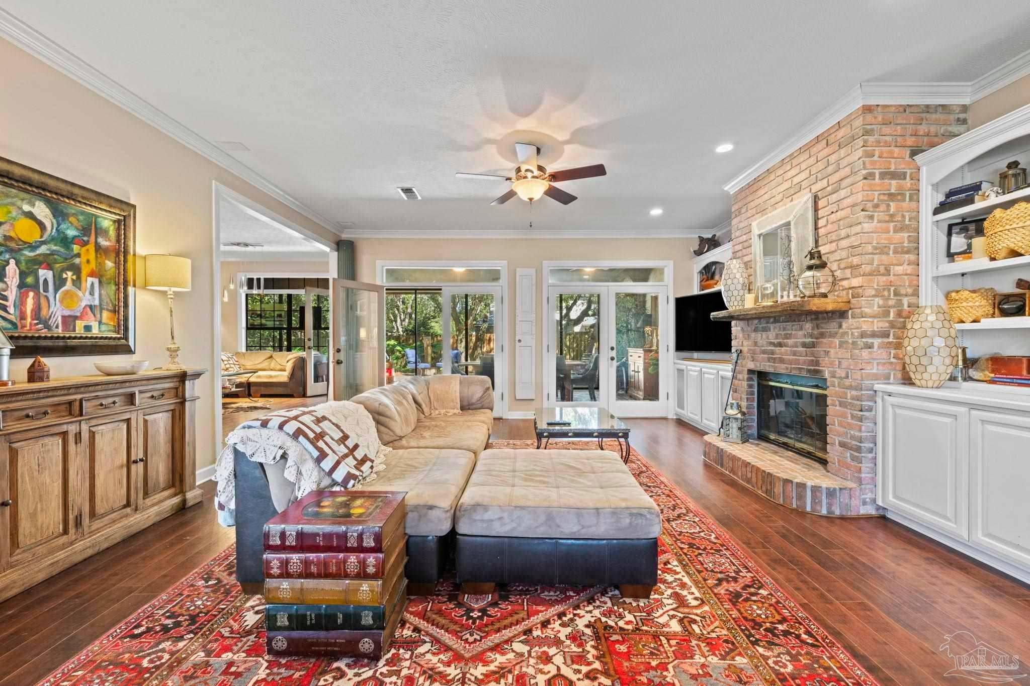Welcome to this beautiful brick home in highly sought-after Gulf Breeze Proper, offering strong curb appeal with its prominent roof pitch, classic brick siding, and inviting architectural lines. Step inside to an impressive great room highlighted by high ceilings, a cozy wood-burning fireplace, built-in bookshelves, and French doors that open to a lovely sunroom—creating the perfect blend of warmth and elegance. This thoughtfully designed split floor plan features a spacious primary suite, a guest suite with private access, and two additional bedrooms that share a full bath—ideal for family and guests alike. Multiple living areas and 9-foot ceilings throughout enhance the home’s open, comfortable feel. The sunroom with charming brick flooring overlooks a beautiful backyard entertaining area with a fire pit, perfect for gatherings or quiet evenings outdoors. Interior highlights include plantation shutters on select windows and engineered wood-look flooring that flows through most of the home, offering both style and easy maintenance. The centrally located kitchen boasts abundant cabinetry, stainless-steel front appliances that include a wall-mounted oven and microwave with convection option, and versatile dining spaces including a breakfast bar, breakfast nook, and formal dining room. Located within walking distance of Gulf Breeze’s top-rated schools and nearby parks with water access, this home also offers quick access to world-class beaches, Historic Downtown Pensacola, premier shopping, dining, and Pensacola International Airport—making it one of the most desirable addresses on the Gulf Coast. Additional features include a two-car garage with floored storage space above, providing ample room for organization and convenience. Classic curb appeal, timeless design, and an unbeatable location—this Gulf Breeze Proper home offers the ideal blend of comfort, style, and coastal convenience.
