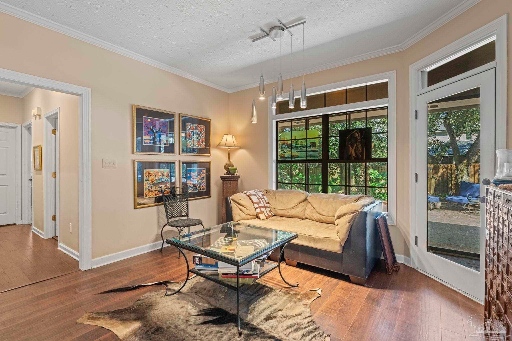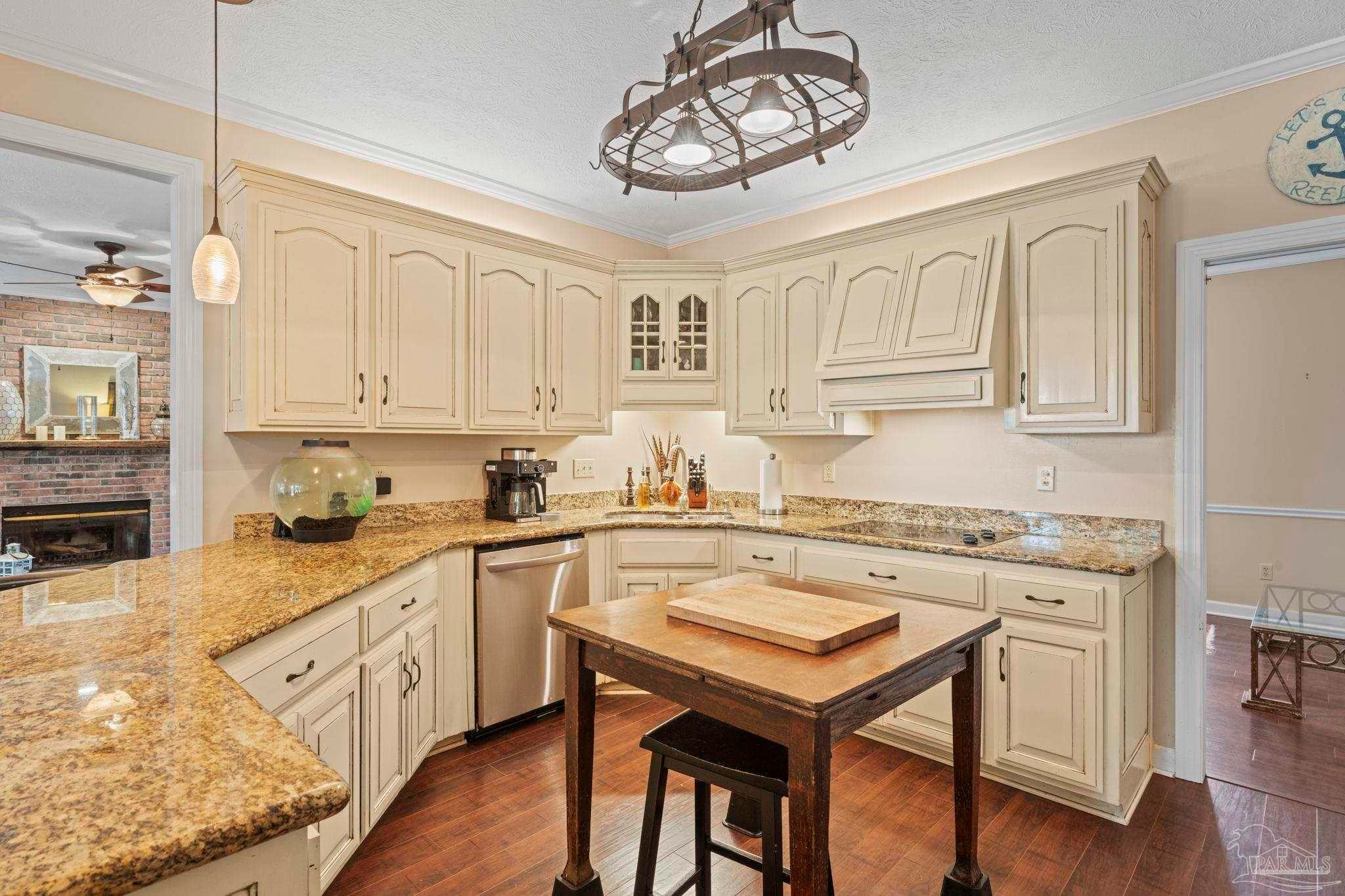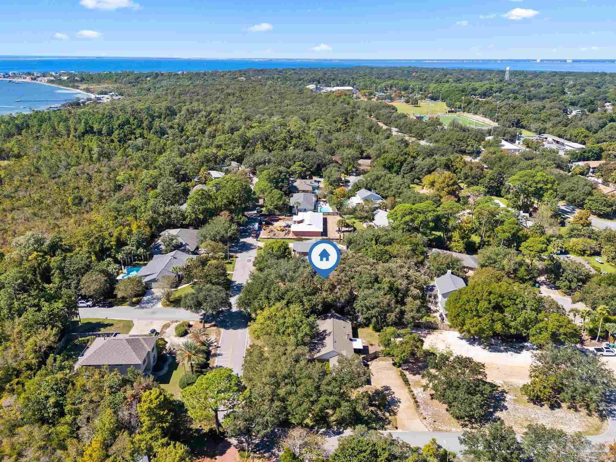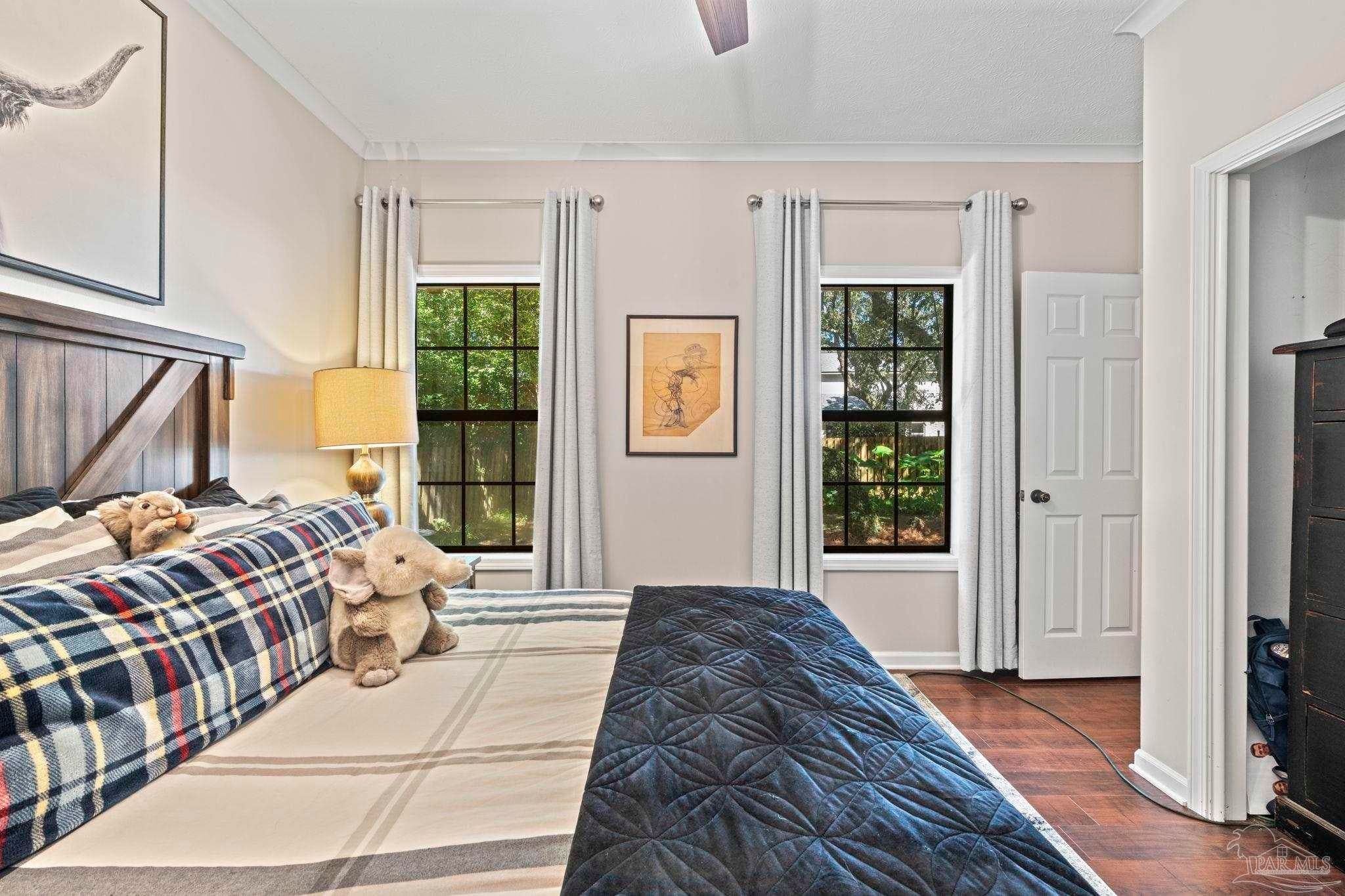 Welcome to this beautiful brick home in highly sought-after Gulf Breeze Proper, offering strong curb appeal with its prominent roof pitch, classic brick siding, and inviting architectural lines. Step inside to an impressive great room highlighted by high ceilings, a cozy wood-burning fireplace, built-in bookshelves, and French doors that open to a lovely sunroom—creating the perfect blend of warmth and elegance. This thoughtfully designed split floor plan features a spacious primary suite, a guest suite with private access, and two additional bedrooms that share a full bath—ideal for family and guests alike. Multiple living areas and 9-foot ceilings throughout enhance the home’s open, comfortable feel. The sunroom with charming brick flooring overlooks a beautiful backyard entertaining area with a fire pit, perfect for gatherings or quiet evenings outdoors. Interior highlights include plantation shutters on select windows and engineered wood-look flooring that flows through most of the home, offering both style and easy maintenance. The centrally located kitchen boasts abundant cabinetry, stainless-steel front appliances that include a wall-mounted oven and microwave with convection option, and versatile dining spaces including a breakfast bar, breakfast nook, and formal dining room. Located within walking distance of Gulf Breeze’s top-rated schools and nearby parks with water access, this home also offers quick access to world-class beaches, Historic Downtown Pensacola, premier shopping, dining, and Pensacola International Airport—making it one of the most desirable addresses on the Gulf Coast. Additional features include a two-car garage with floored storage space above, providing ample room for organization and convenience. Classic curb appeal, timeless design, and an unbeatable location—this Gulf Breeze Proper home offers the ideal blend of comfort, style, and coastal convenience.