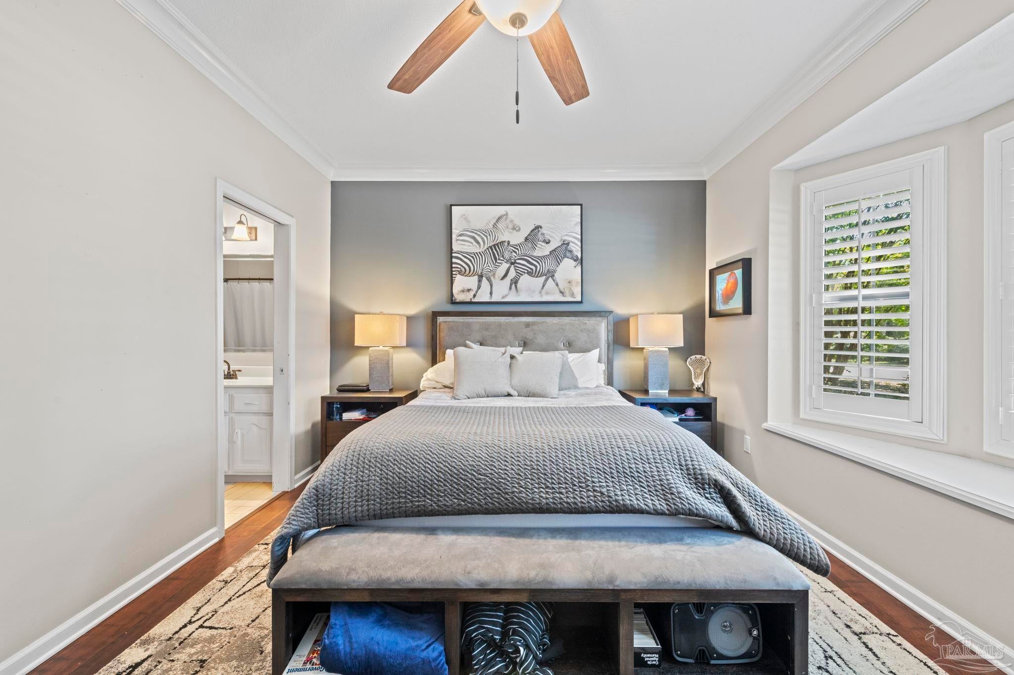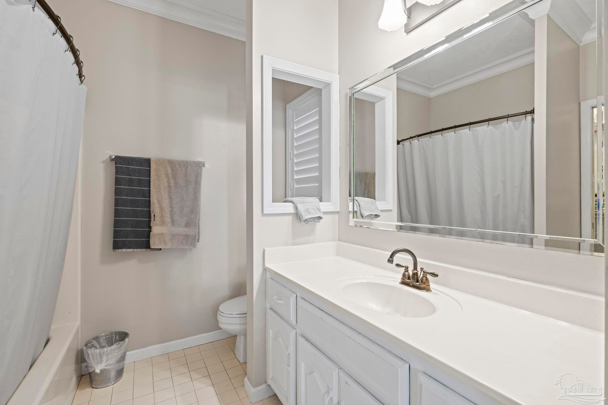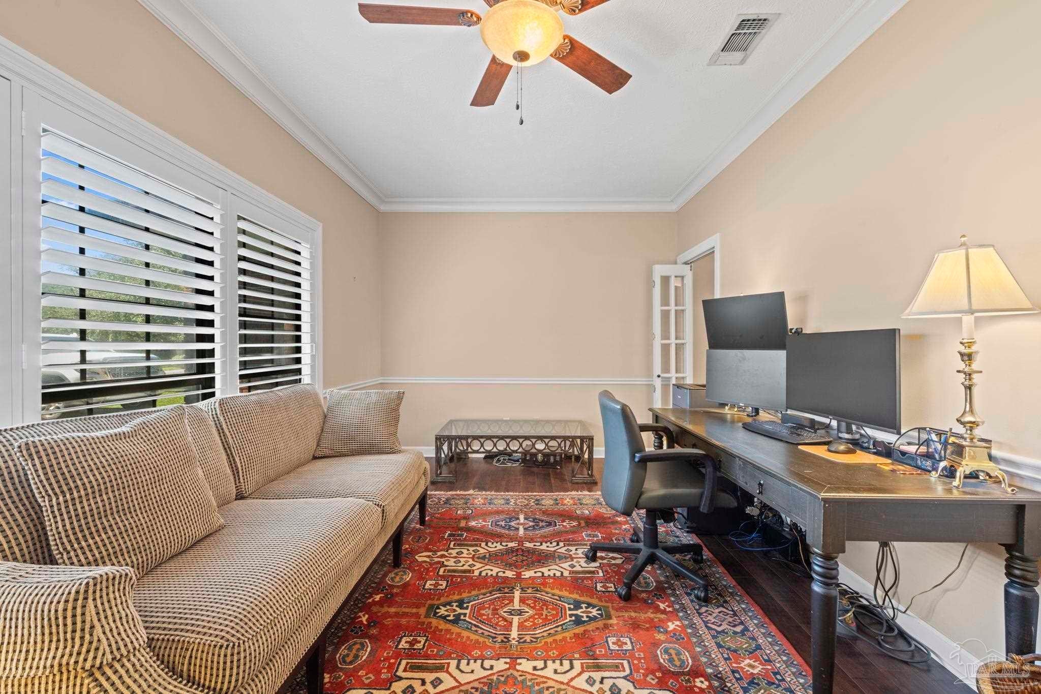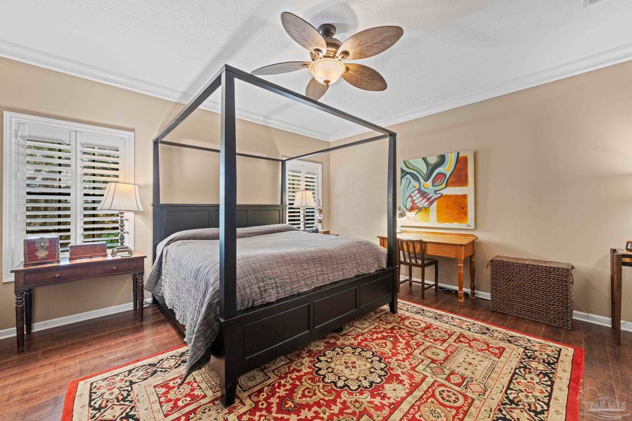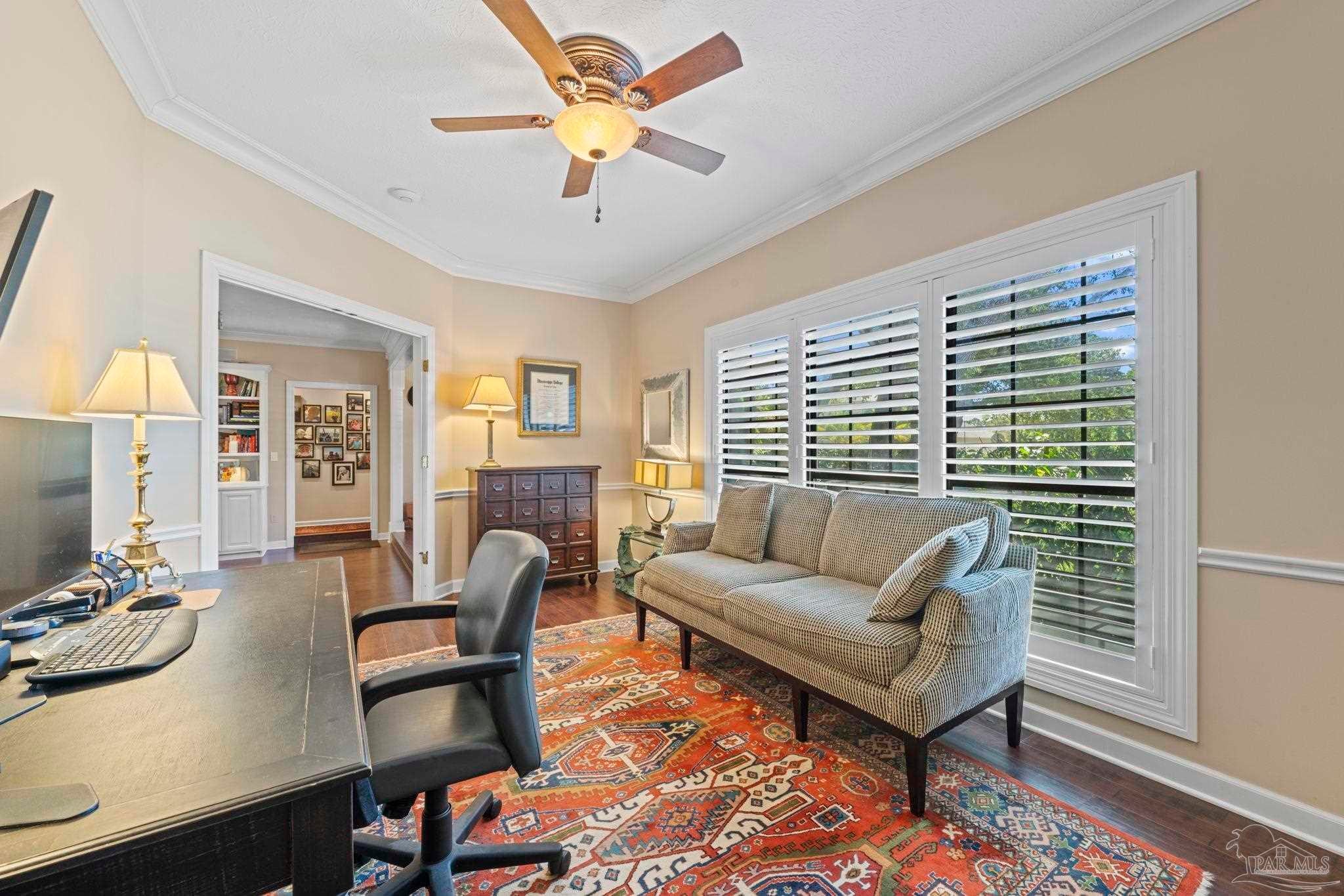 Welcome to this beautiful brick home in highly sought-after Gulf Breeze Proper, offering strong curb appeal with its prominent roof pitch, classic brick siding, and inviting architectural lines. Step inside to an impressive great room highlighted by high ceilings, a cozy wood-burning fireplace, built-in bookshelves, and French doors that open to a lovely sunroom—creating the perfect blend of warmth and elegance. This thoughtfully designed split floor plan features a spacious primary suite, a guest suite with private access, and two additional bedrooms that share a full bath—ideal for family and guests alike. Multiple living areas and 9-foot ceilings throughout enhance the home’s open, comfortable feel. The sunroom with charming brick flooring overlooks a beautiful backyard entertaining area with a fire pit, perfect for gatherings or quiet evenings outdoors. Interior highlights include plantation shutters on select windows and engineered wood-look flooring that flows through most of the home, offering both style and easy maintenance. The centrally located kitchen boasts abundant cabinetry, stainless-steel front appliances that include a wall-mounted oven and microwave with convection option, and versatile dining spaces including a breakfast bar, breakfast nook, and formal dining room. Located within walking distance of Gulf Breeze’s top-rated schools and nearby parks with water access, this home also offers quick access to world-class beaches, Historic Downtown Pensacola, premier shopping, dining, and Pensacola International Airport—making it one of the most desirable addresses on the Gulf Coast. Additional features include a two-car garage with floored storage space above, providing ample room for organization and convenience. Classic curb appeal, timeless design, and an unbeatable location—this Gulf Breeze Proper home offers the ideal blend of comfort, style, and coastal convenience.