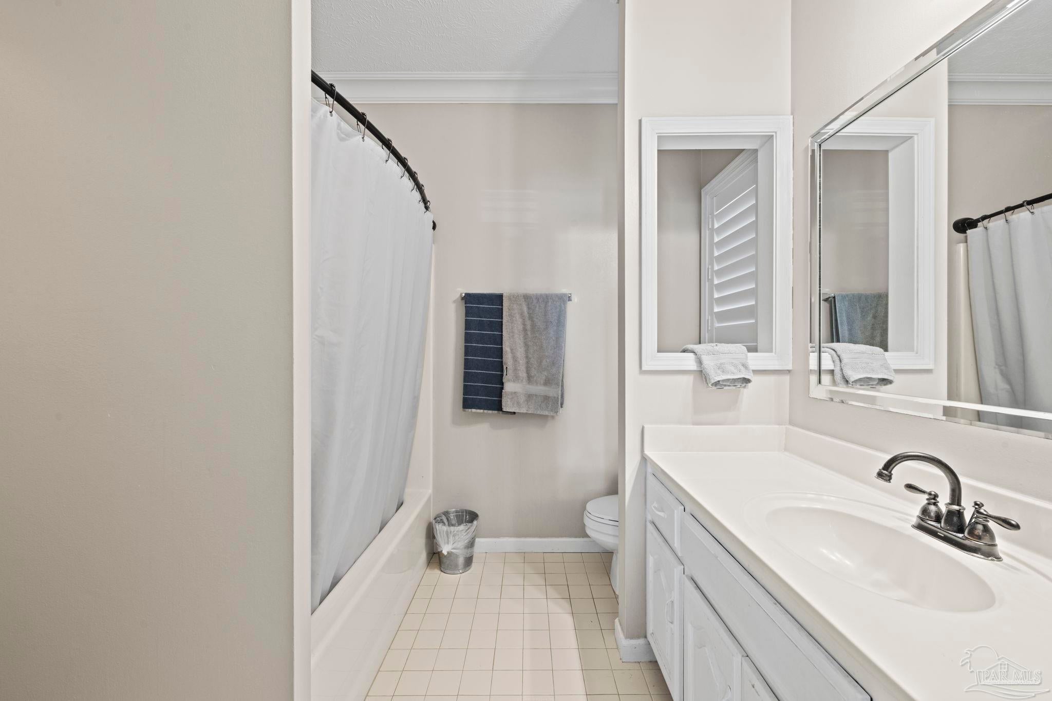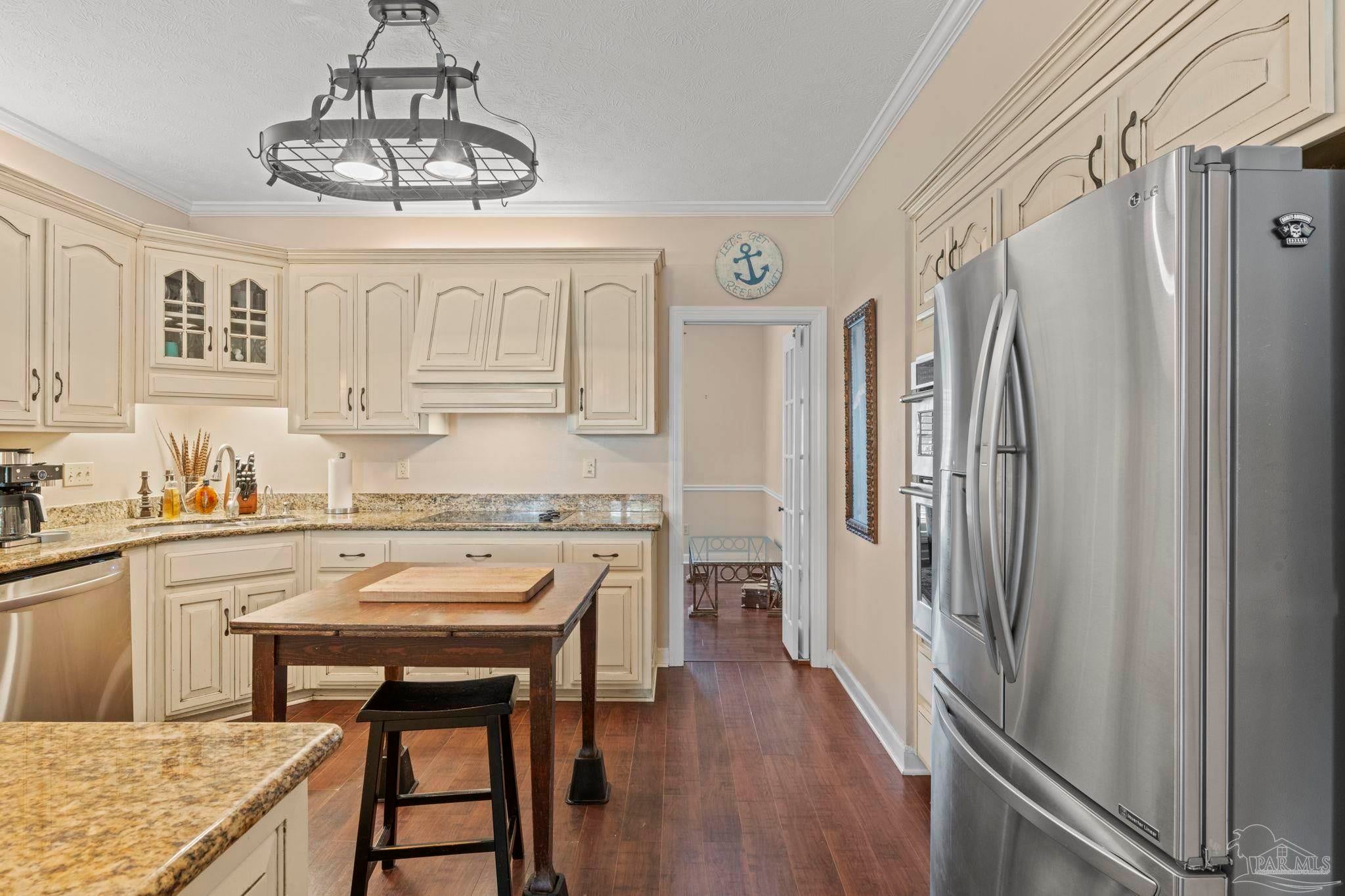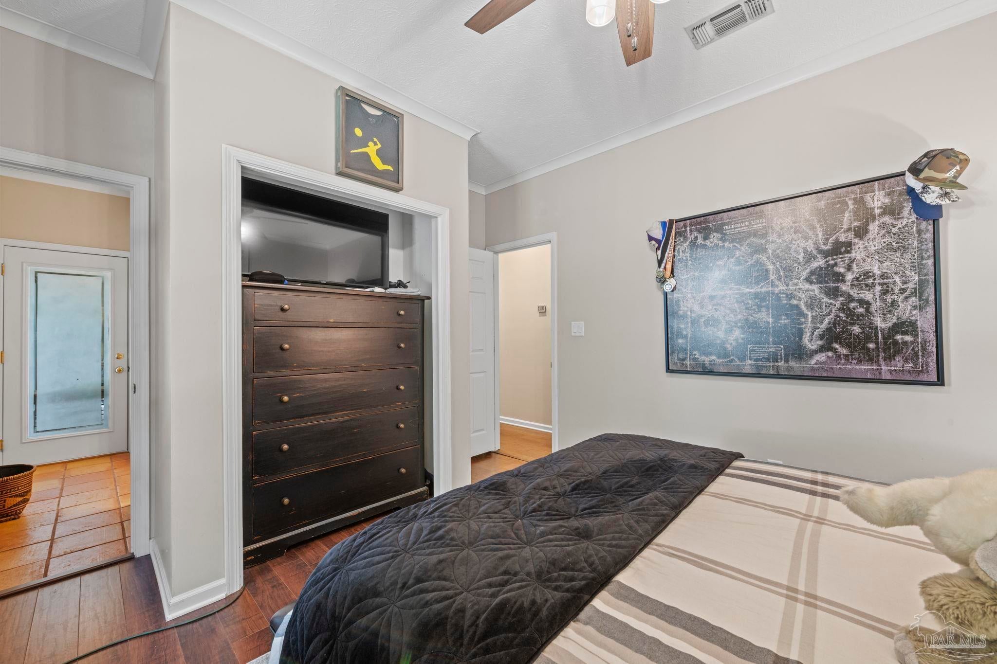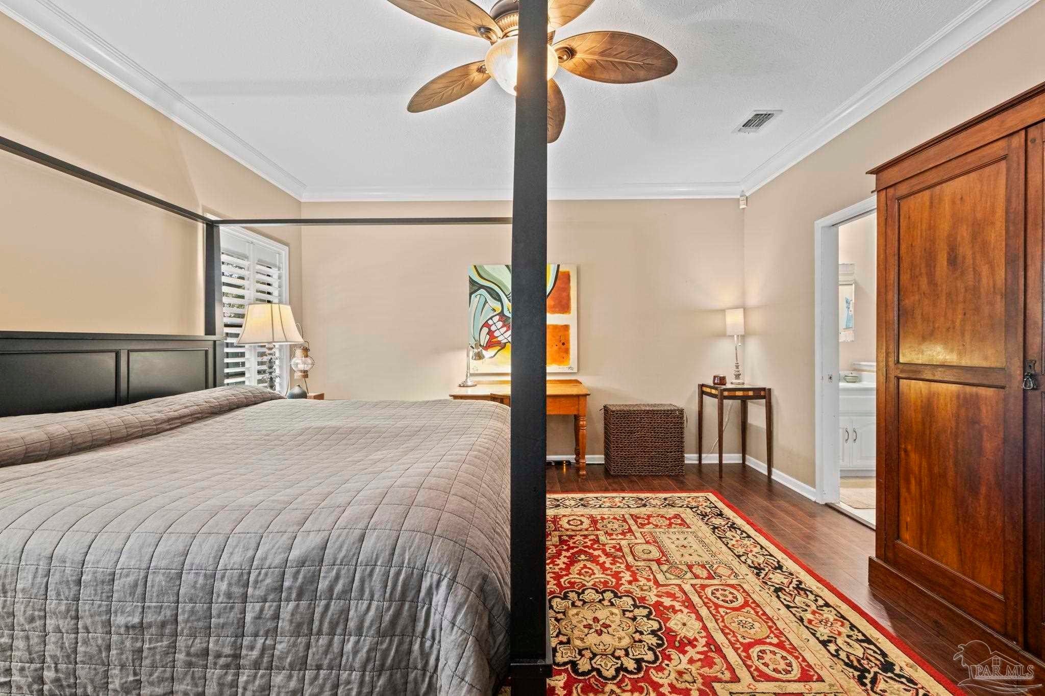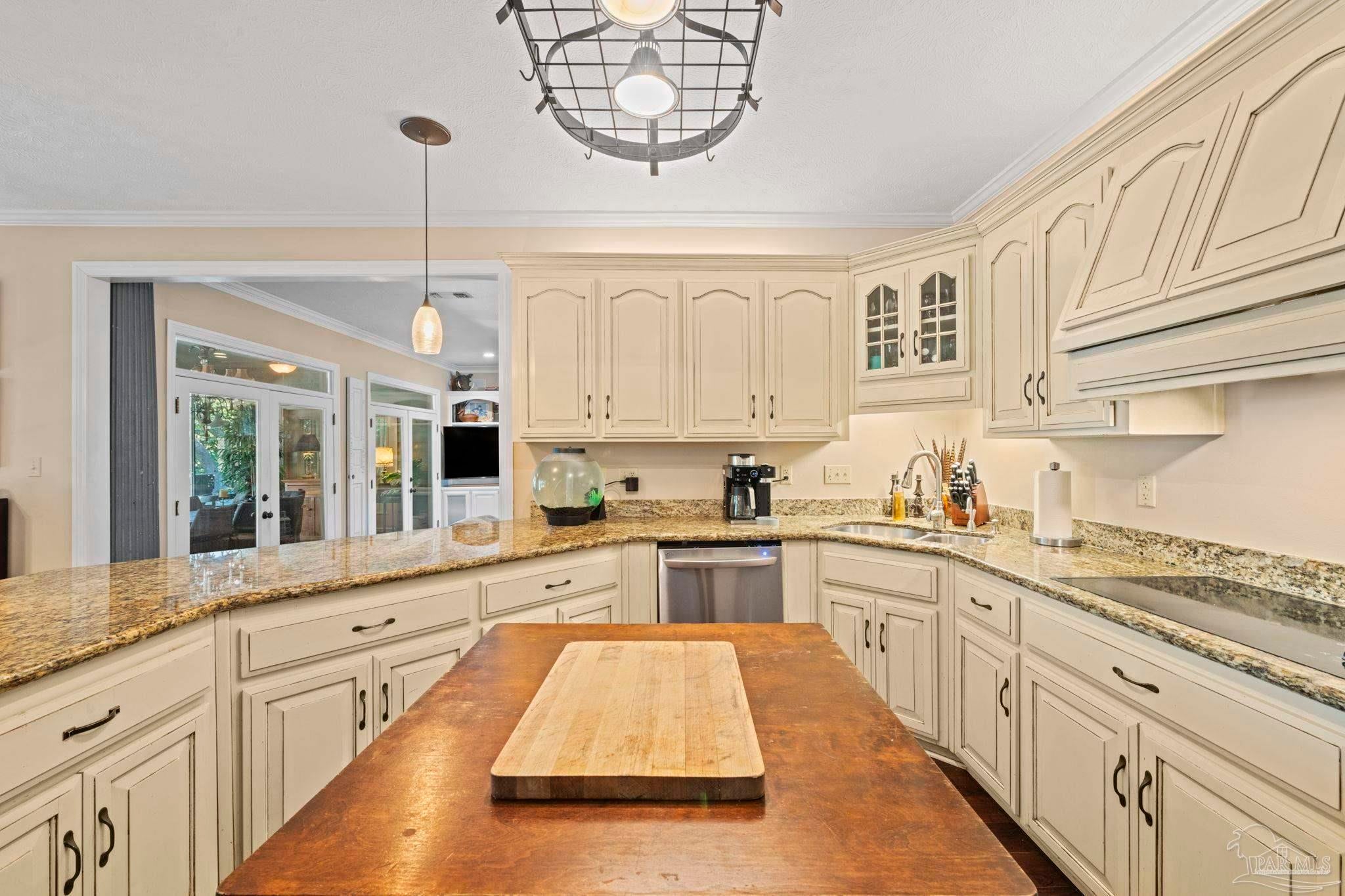 Welcome to this beautiful brick home in highly sought-after Gulf Breeze Proper, offering strong curb appeal with its prominent roof pitch, classic brick siding, and inviting architectural lines. Step inside to an impressive great room highlighted by high ceilings, a cozy wood-burning fireplace, built-in bookshelves, and French doors that open to a lovely sunroom—creating the perfect blend of warmth and elegance. This thoughtfully designed split floor plan features a spacious primary suite, a guest suite with private access, and two additional bedrooms that share a full bath—ideal for family and guests alike. Multiple living areas and 9-foot ceilings throughout enhance the home’s open, comfortable feel. The sunroom with charming brick flooring overlooks a beautiful backyard entertaining area with a fire pit, perfect for gatherings or quiet evenings outdoors. Interior highlights include plantation shutters on select windows and engineered wood-look flooring that flows through most of the home, offering both style and easy maintenance. The centrally located kitchen boasts abundant cabinetry, stainless-steel front appliances that include a wall-mounted oven and microwave with convection option, and versatile dining spaces including a breakfast bar, breakfast nook, and formal dining room. Located within walking distance of Gulf Breeze’s top-rated schools and nearby parks with water access, this home also offers quick access to world-class beaches, Historic Downtown Pensacola, premier shopping, dining, and Pensacola International Airport—making it one of the most desirable addresses on the Gulf Coast. Additional features include a two-car garage with floored storage space above, providing ample room for organization and convenience. Classic curb appeal, timeless design, and an unbeatable location—this Gulf Breeze Proper home offers the ideal blend of comfort, style, and coastal convenience.
