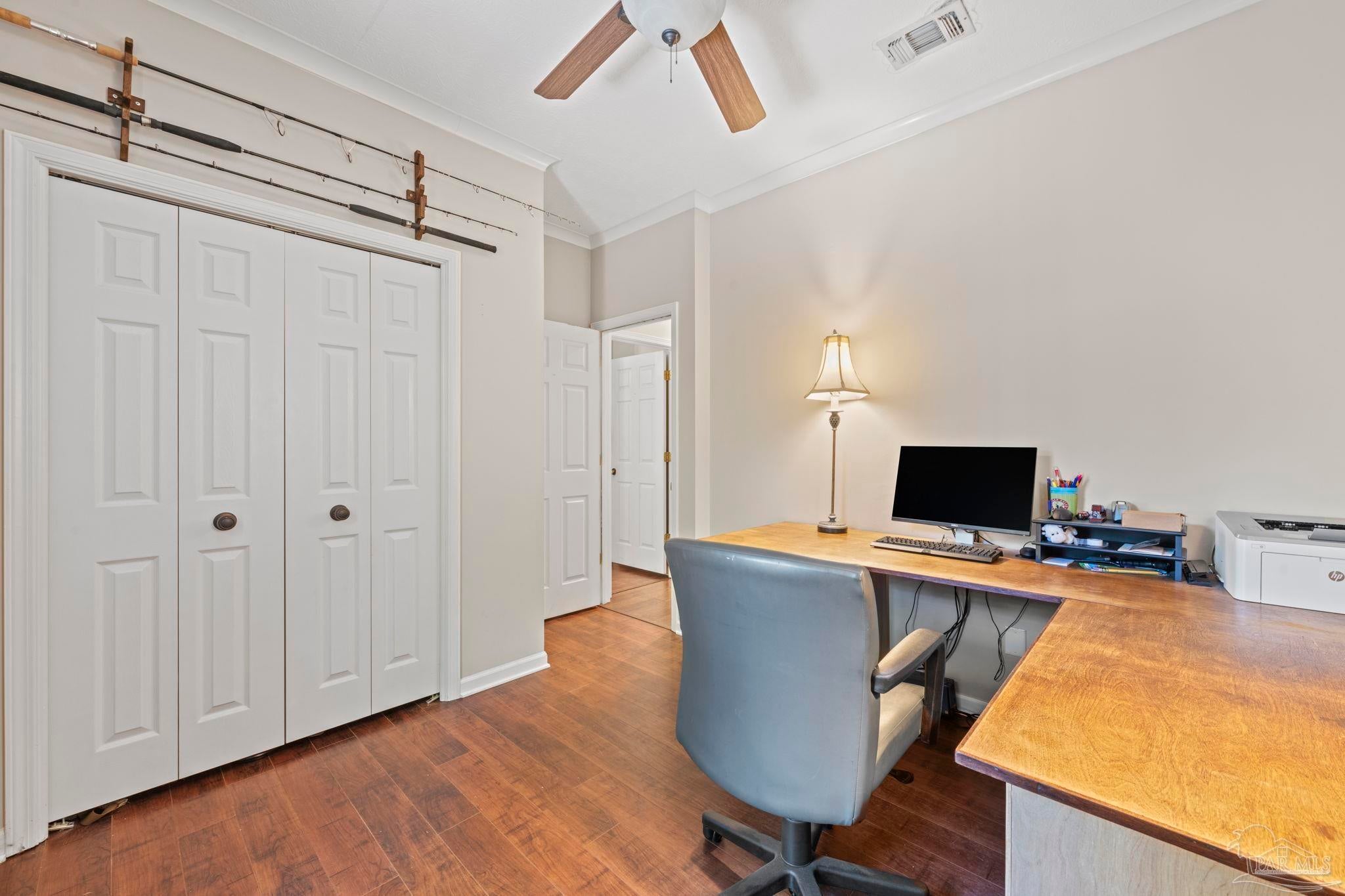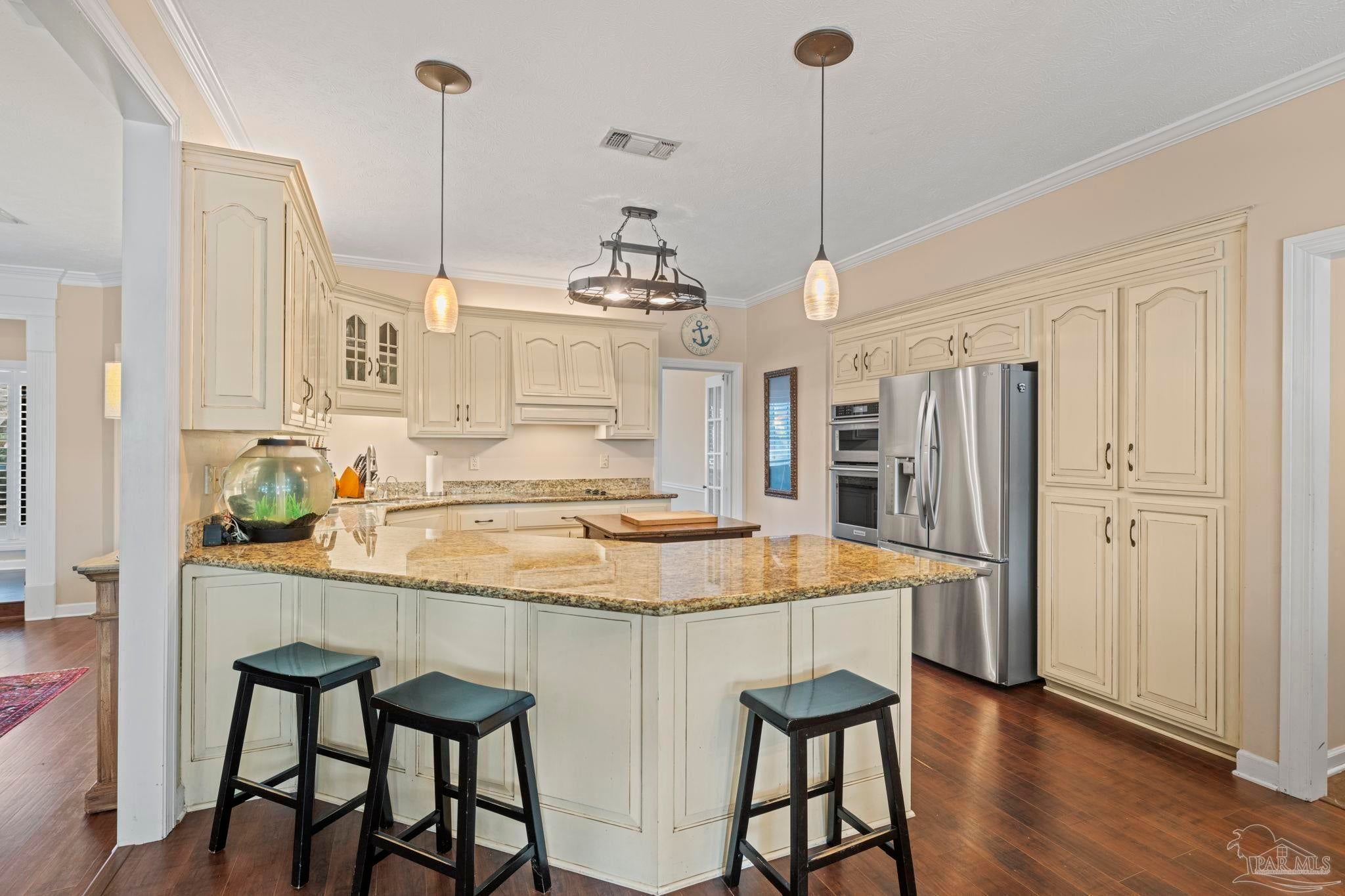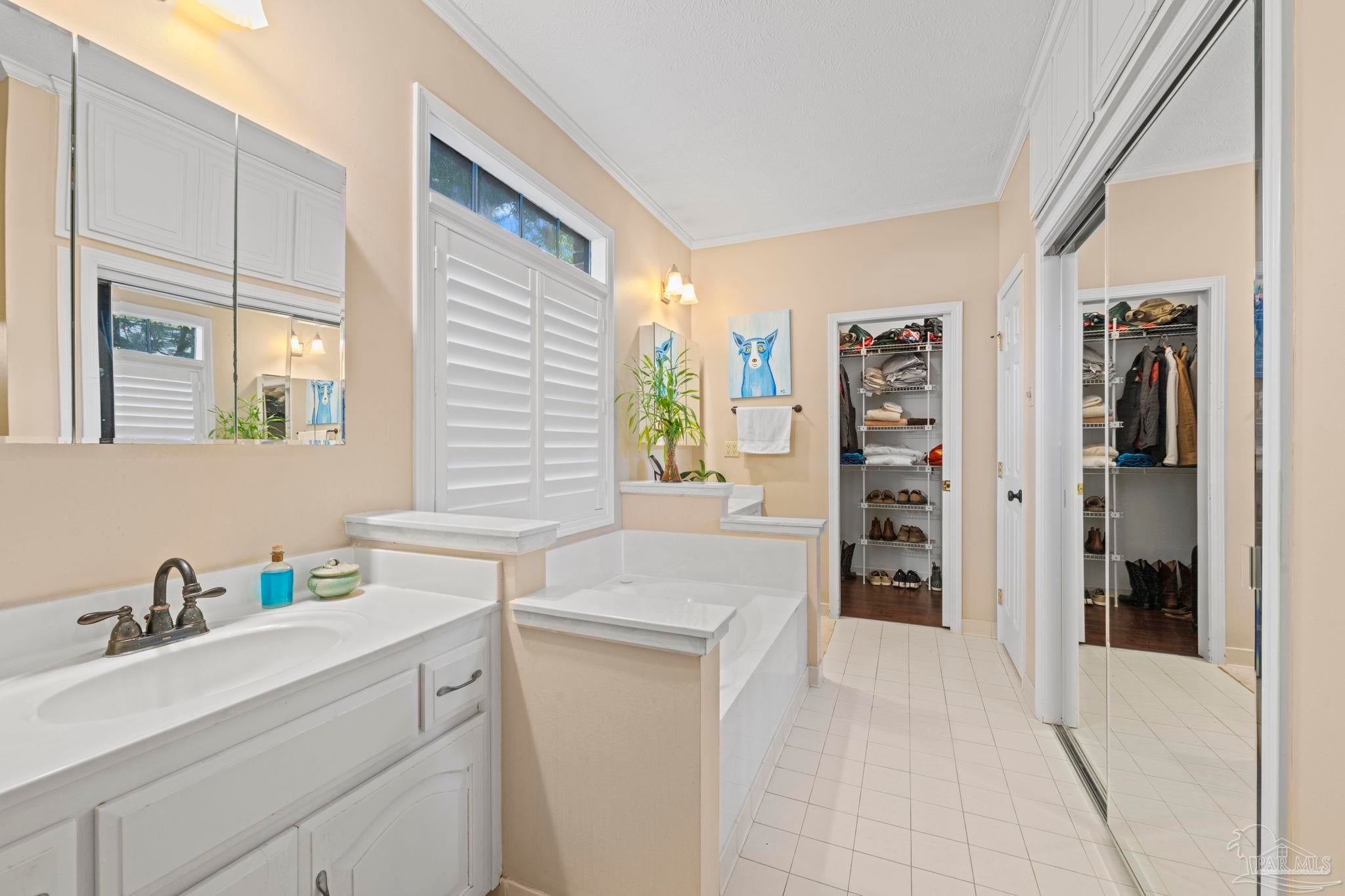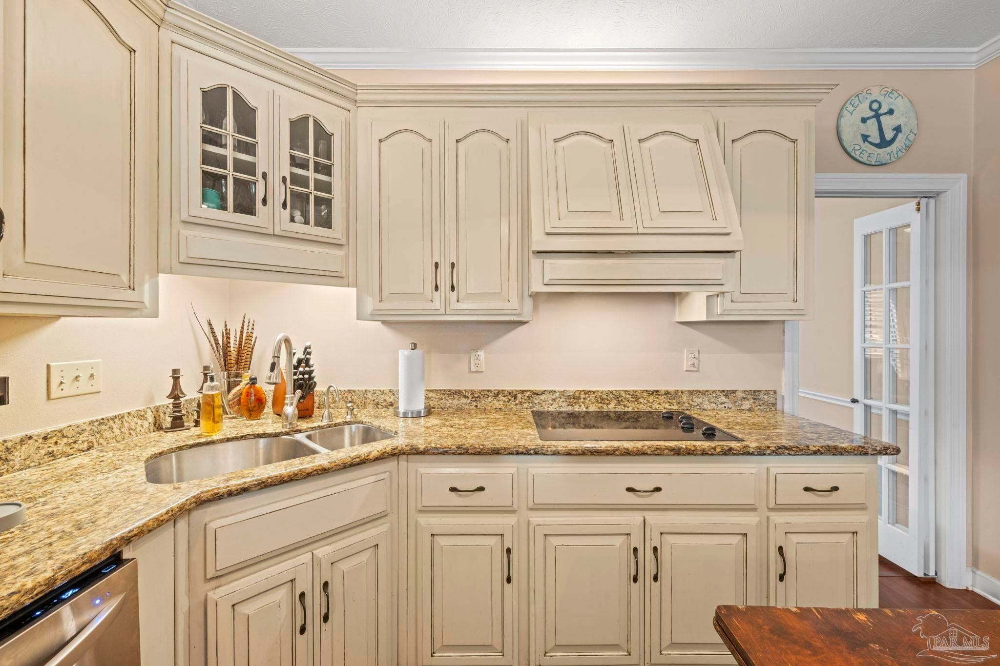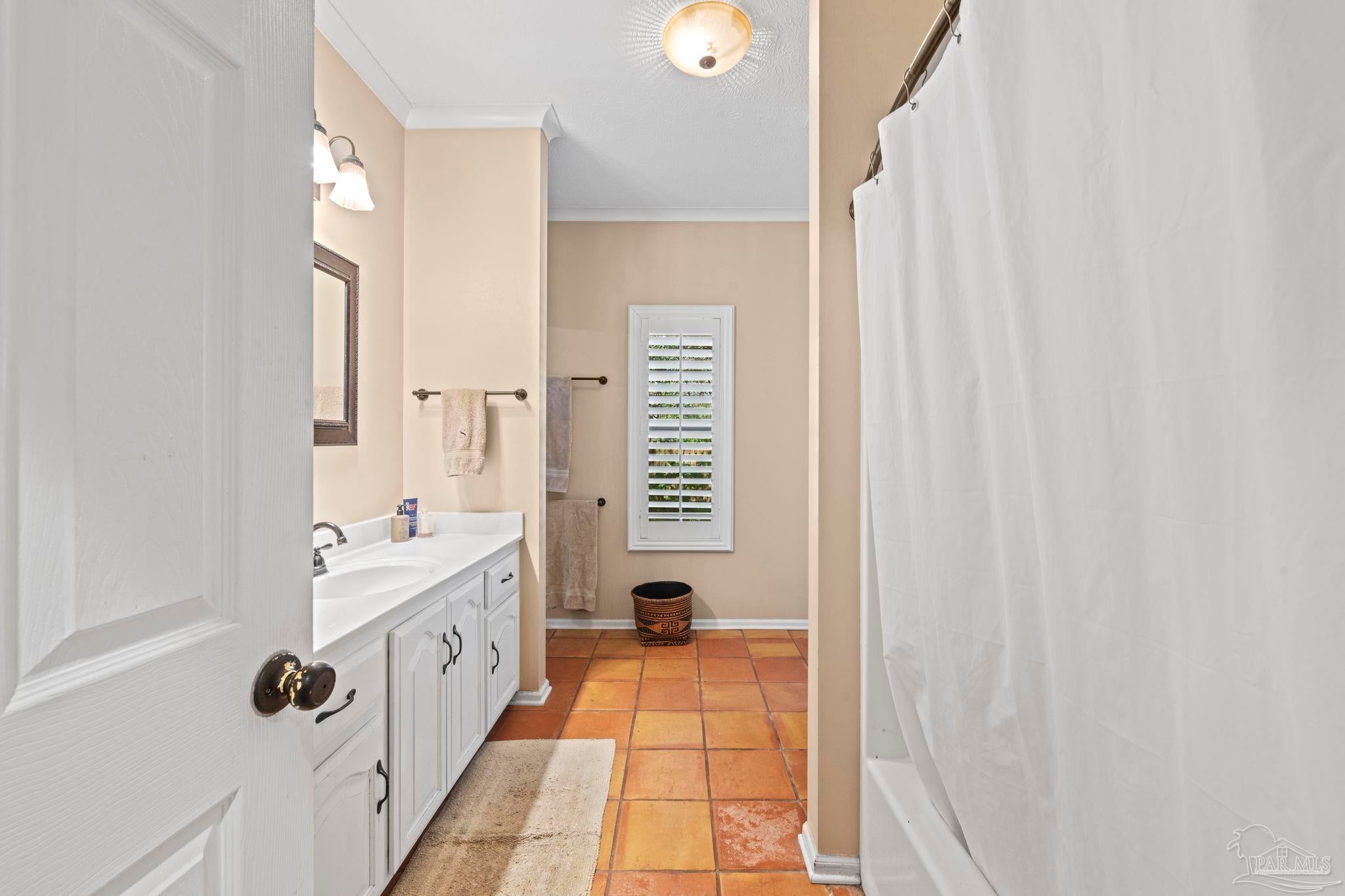 Welcome to this beautiful brick home in highly sought-after Gulf Breeze Proper, offering strong curb appeal with its prominent roof pitch, classic brick siding, and inviting architectural lines. Step inside to an impressive great room highlighted by high ceilings, a cozy wood-burning fireplace, built-in bookshelves, and French doors that open to a lovely sunroom—creating the perfect blend of warmth and elegance. This thoughtfully designed split floor plan features a spacious primary suite, a guest suite with private access, and two additional bedrooms that share a full bath—ideal for family and guests alike. Multiple living areas and 9-foot ceilings throughout enhance the home’s open, comfortable feel. The sunroom with charming brick flooring overlooks a beautiful backyard entertaining area with a fire pit, perfect for gatherings or quiet evenings outdoors. Interior highlights include plantation shutters on select windows and engineered wood-look flooring that flows through most of the home, offering both style and easy maintenance. The centrally located kitchen boasts abundant cabinetry, stainless-steel front appliances that include a wall-mounted oven and microwave with convection option, and versatile dining spaces including a breakfast bar, breakfast nook, and formal dining room. Located within walking distance of Gulf Breeze’s top-rated schools and nearby parks with water access, this home also offers quick access to world-class beaches, Historic Downtown Pensacola, premier shopping, dining, and Pensacola International Airport—making it one of the most desirable addresses on the Gulf Coast. Additional features include a two-car garage with floored storage space above, providing ample room for organization and convenience. Classic curb appeal, timeless design, and an unbeatable location—this Gulf Breeze Proper home offers the ideal blend of comfort, style, and coastal convenience.