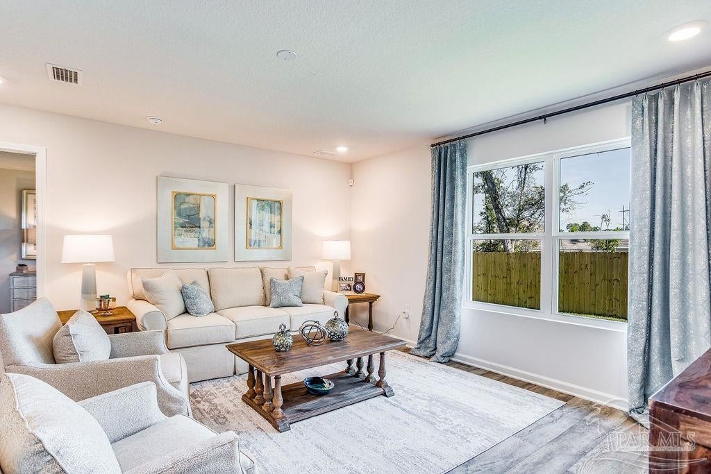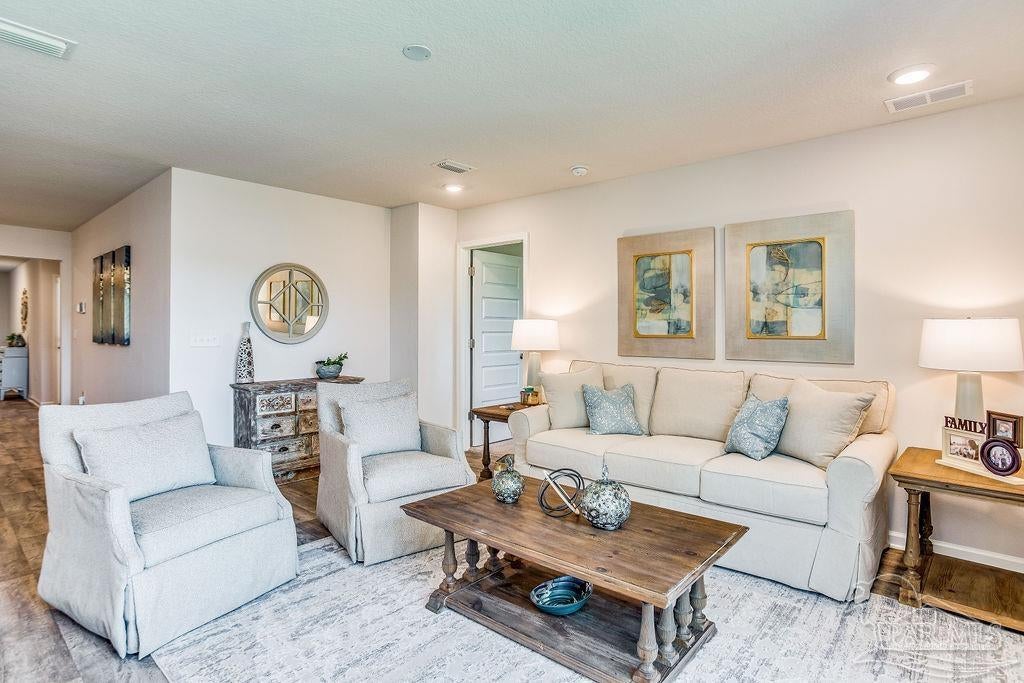 BEAUTIFUL FLORIDA COTTAGE in the new Rivers Cove Community featuring a community pool, nice community center and playground. The Cali model, one of our most sought-after designs, offers a fantastic open layout for relaxed living. Offers 4 bedrooms, 2 bathrooms, a covered back patio, 2-car garage, and the 'Smart Home Connect' System with various convenient Smart Home devices. The well-appointed kitchen includes stainless steel appliances, a smooth-top range, built-in microwave, quiet dishwasher, corner pantry, island bar, eye-catching wood-look flooring, and plush carpet in the bedrooms. Bedroom 1 and the adjoining beautiful bath boast a large walk-in closet, double vanity sinks and more. Fabric Hurricane window and door protection is also included. Enjoy the stylish curb appeal in this rapidly growing area with easy access to the interstate.